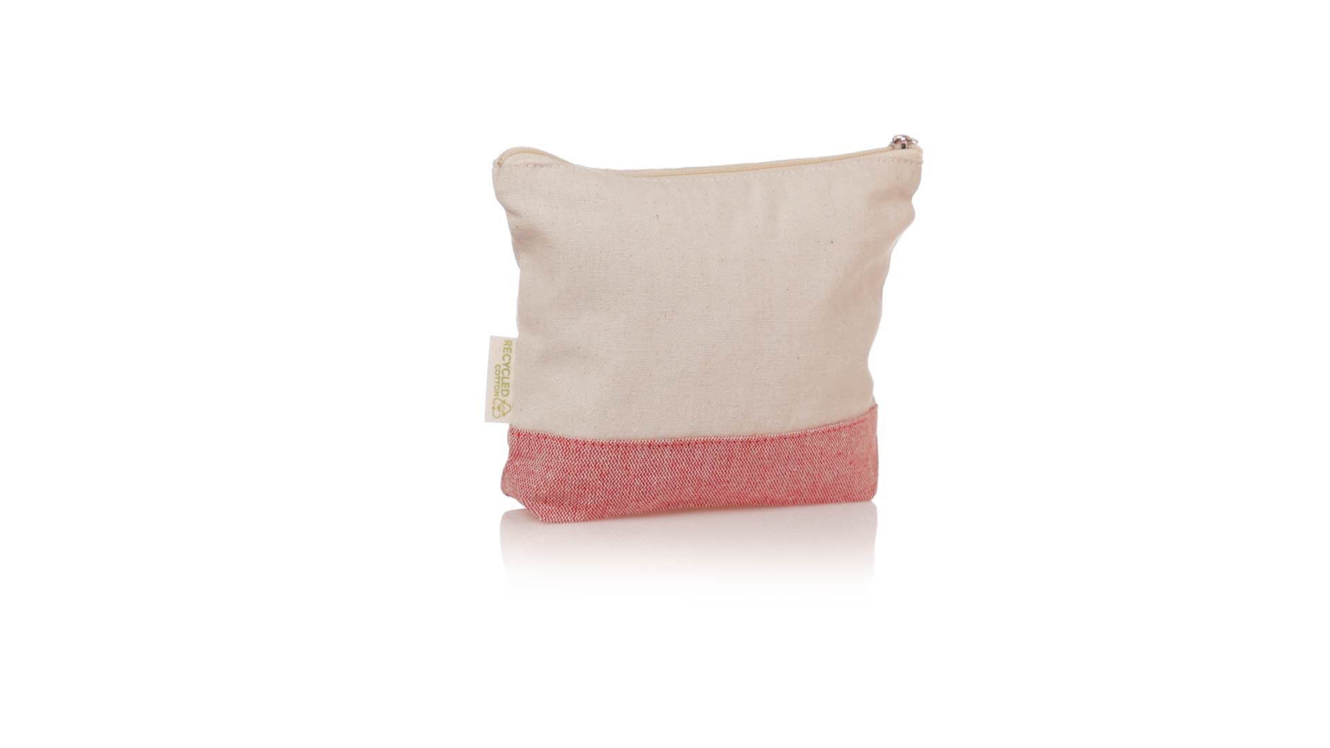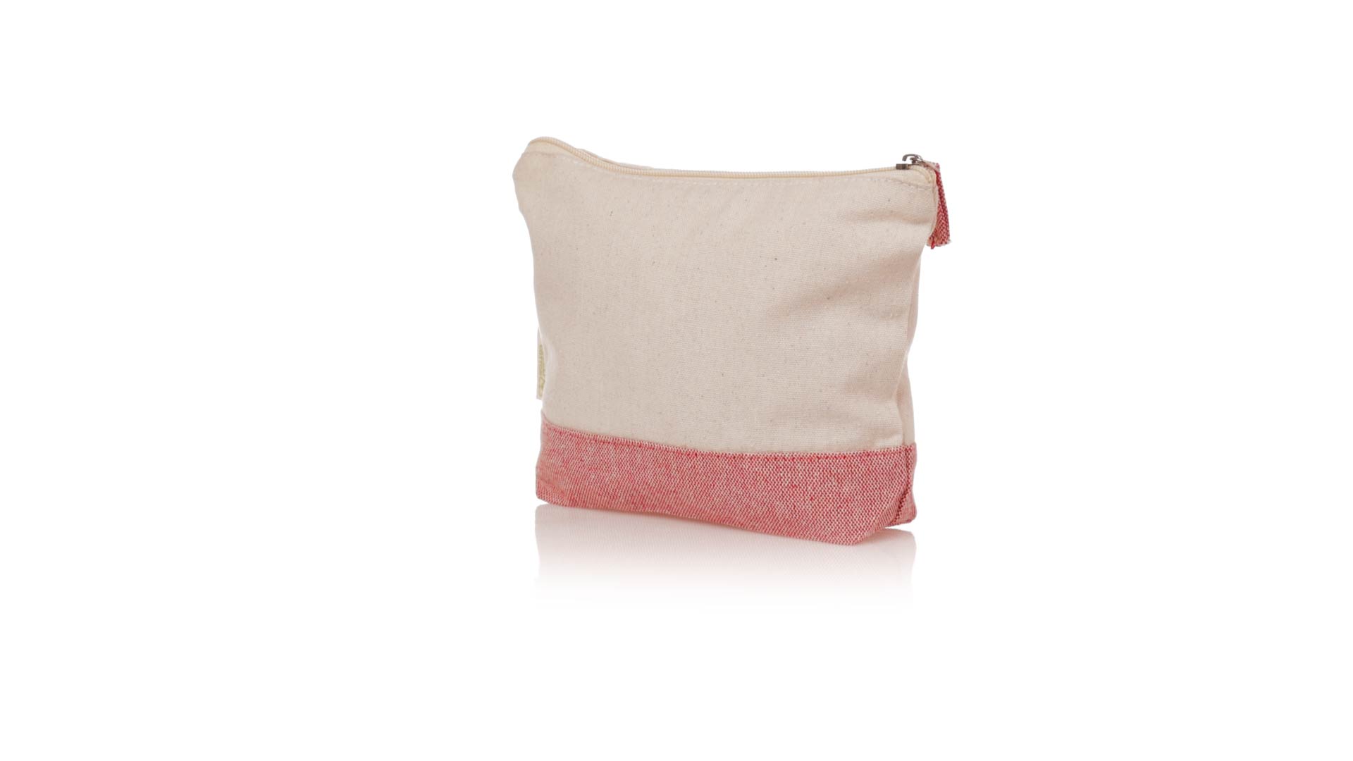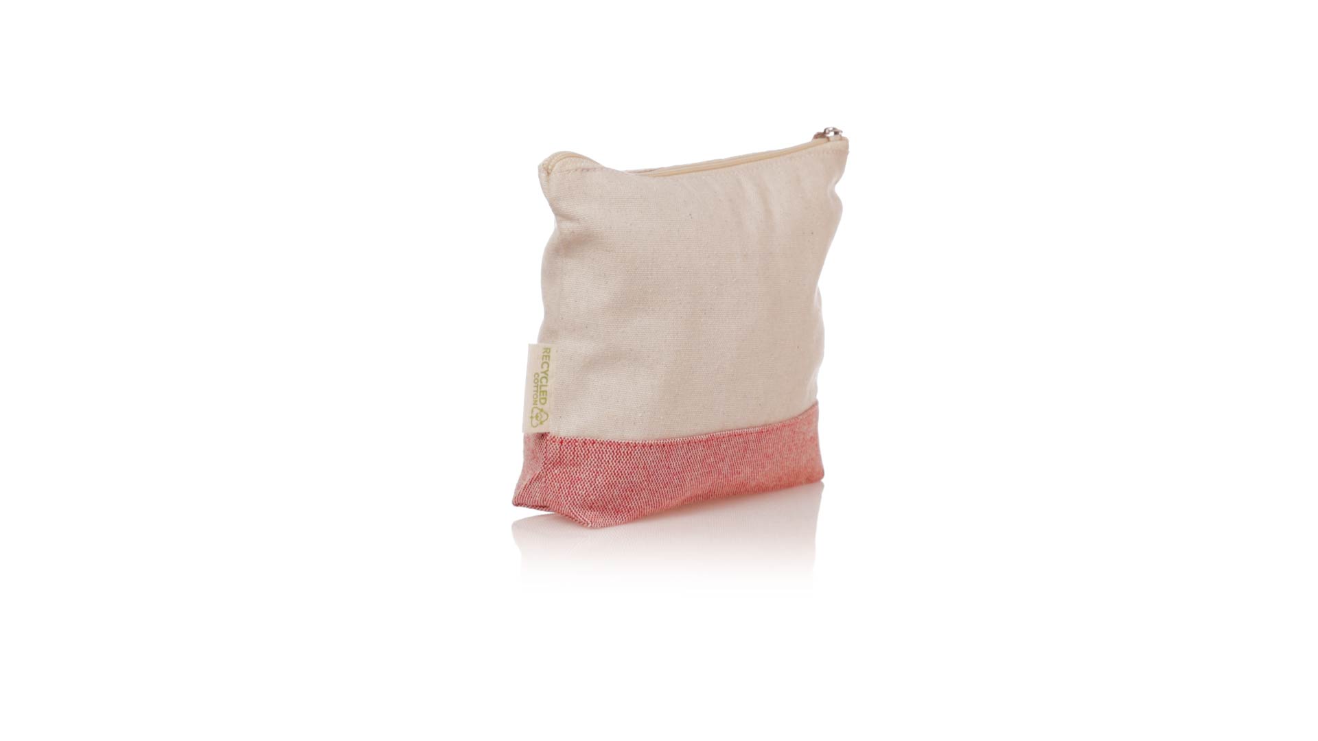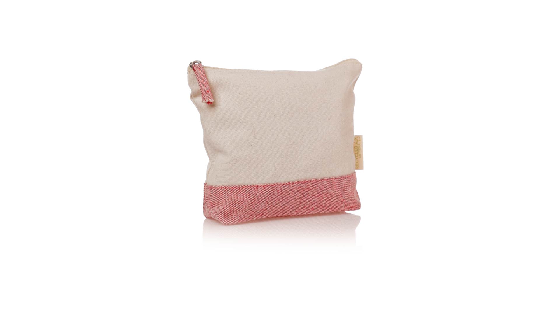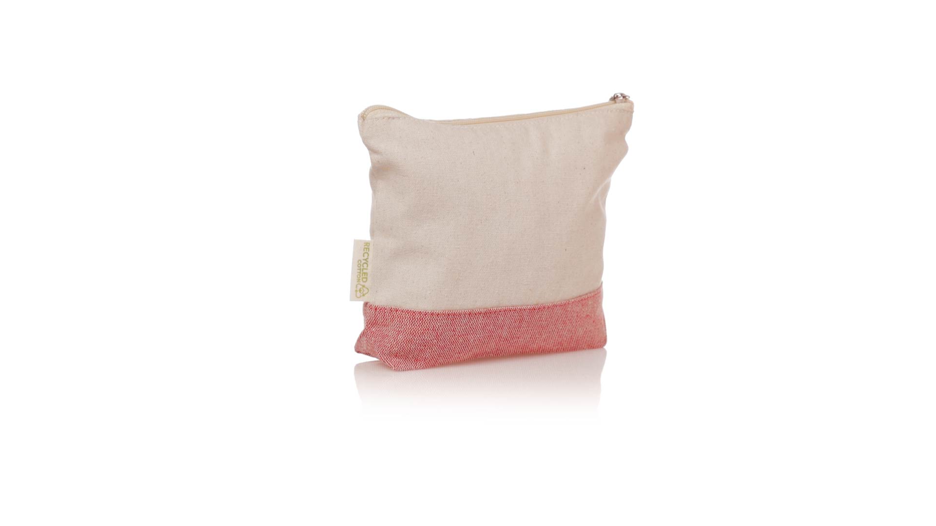Kosmetiktasche aus recycelter Baumwolle. Hauptfach mit Reissverschluss und Griff in der gleichen Farbe wie der Boden. Erhältlich in vielen leuchtenden Farben, mit Etikett für recycelte Baumwolle.