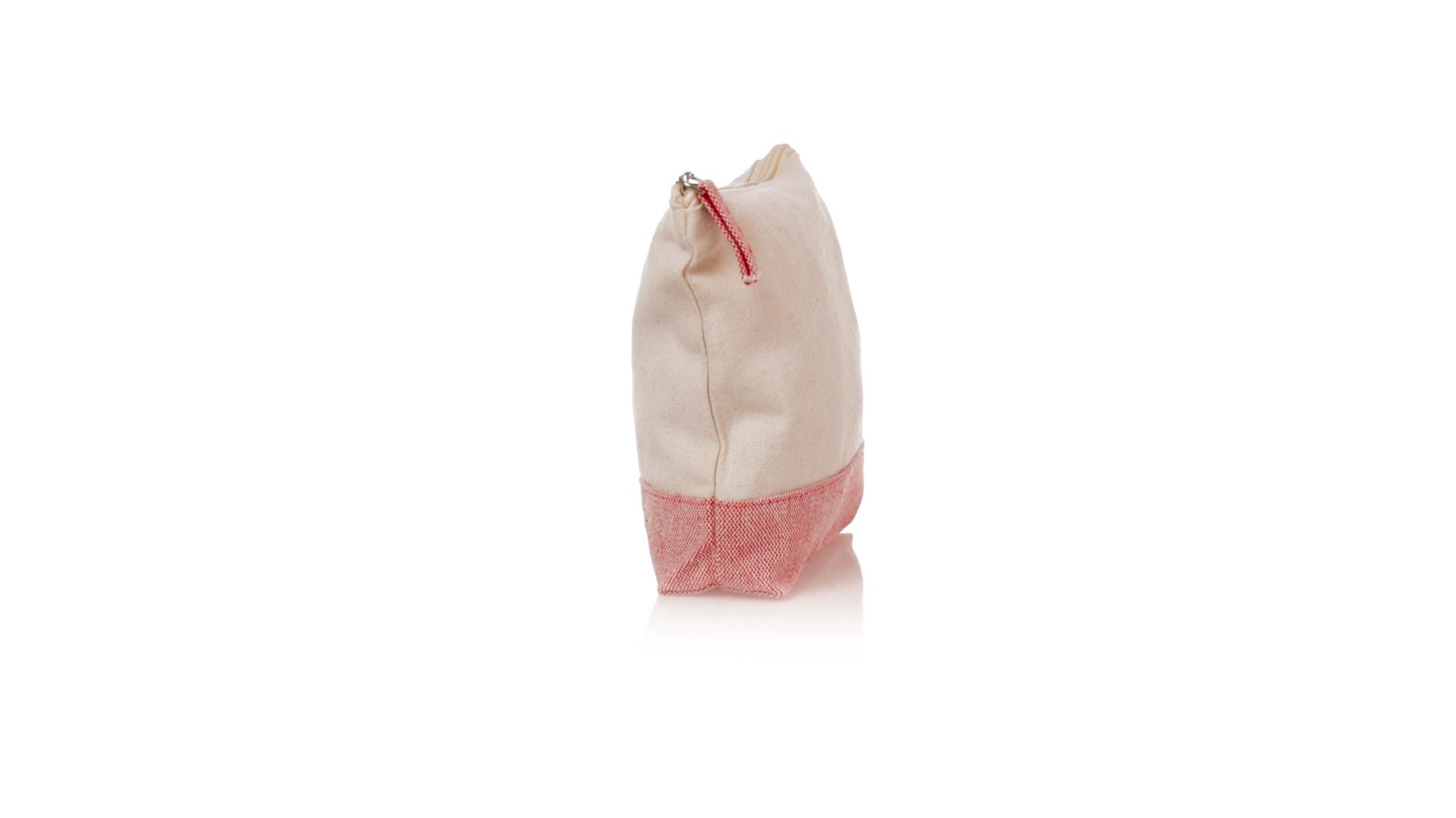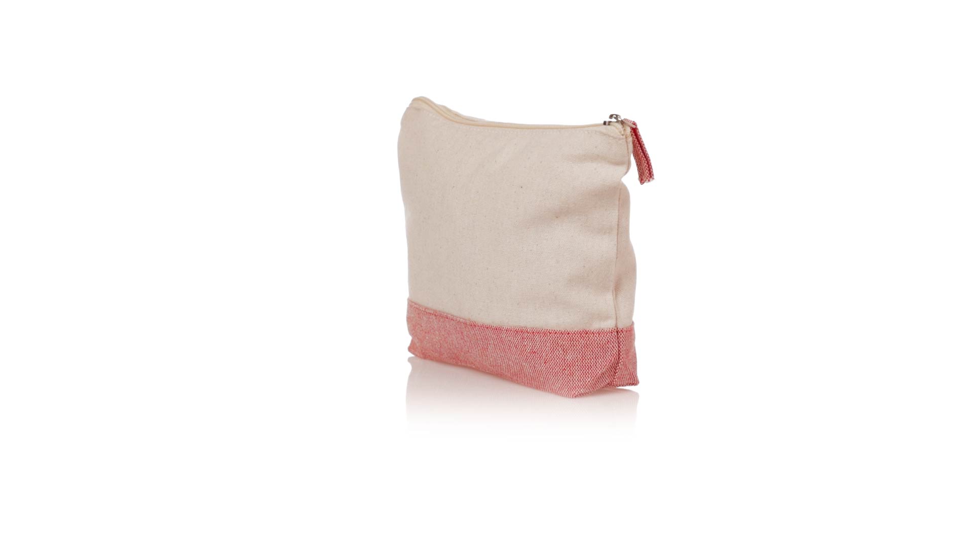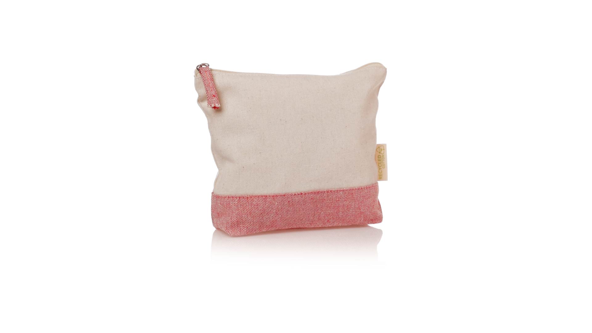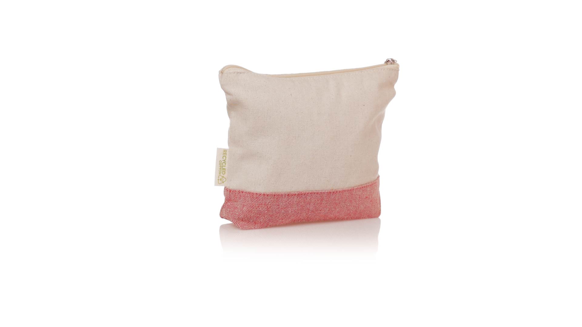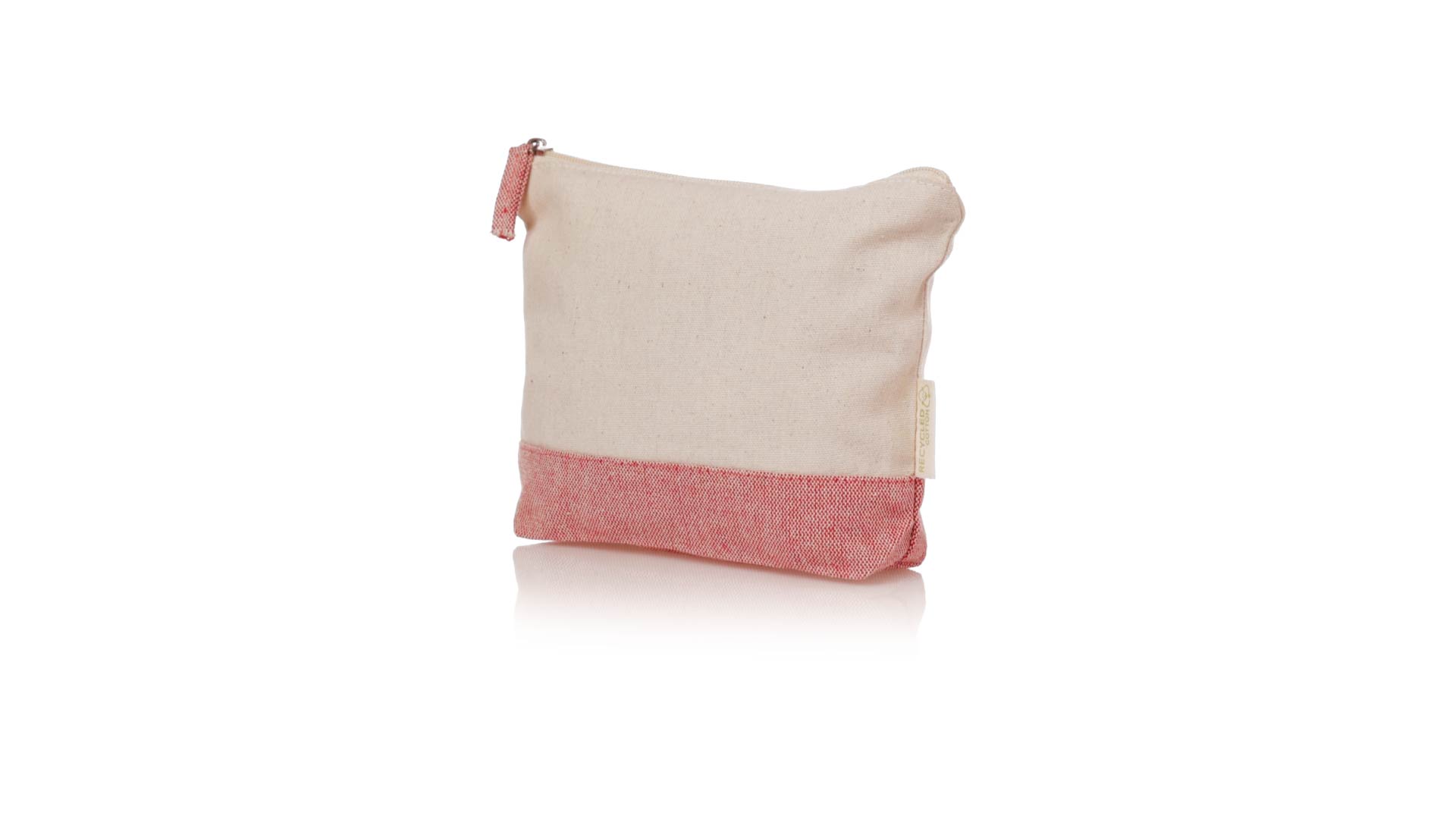 Kosmetiktasche aus recycelter Baumwolle. Hauptfach mit Reissverschluss und Griff in der gleichen Farbe wie der Boden. Erhältlich in vielen leuchtenden Farben, mit Etikett für recycelte Baumwolle.