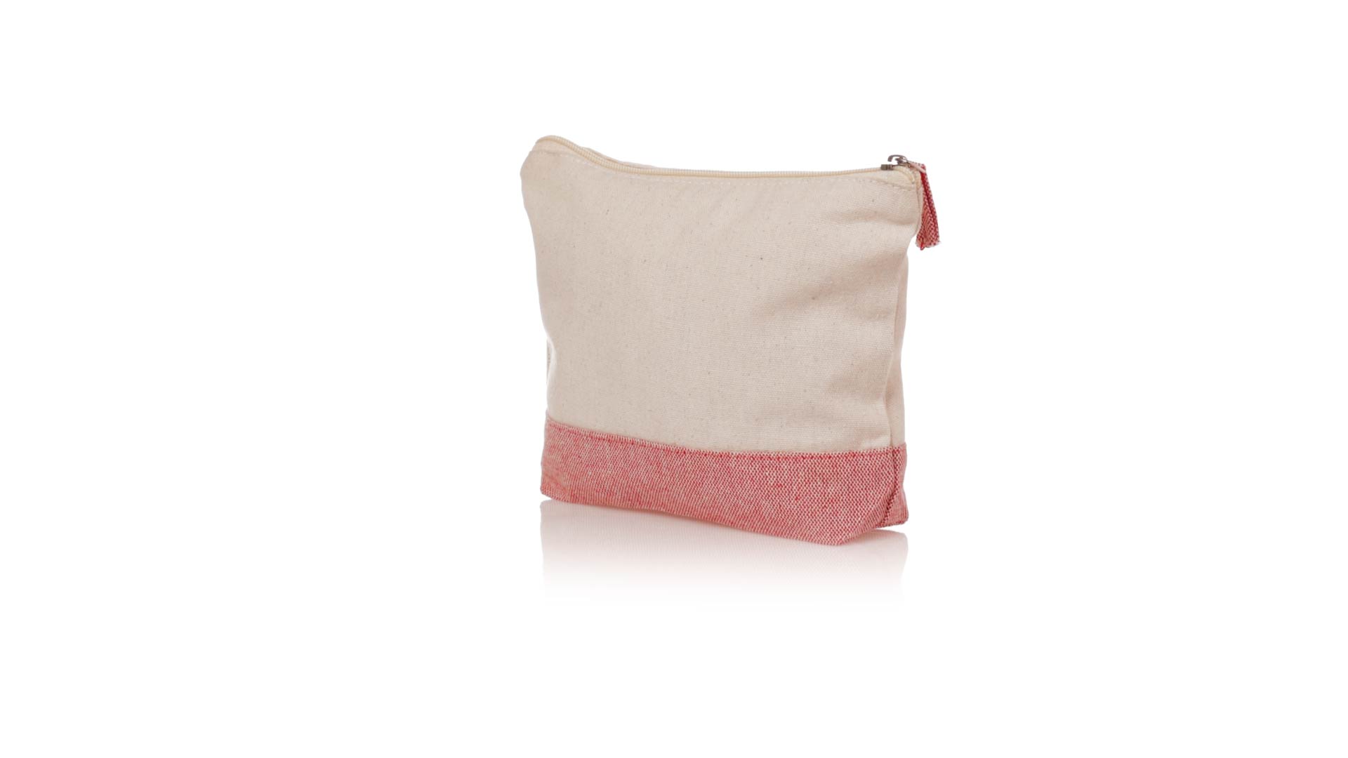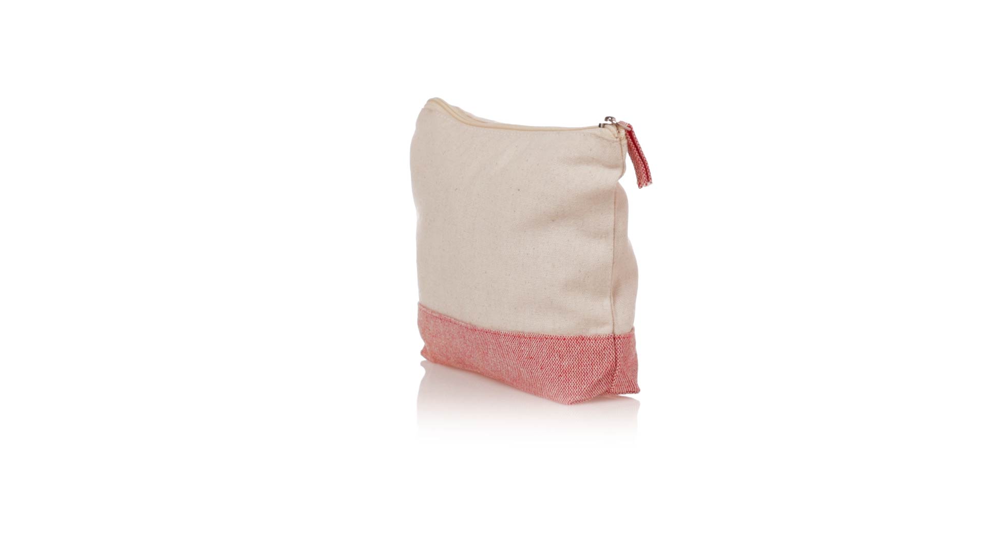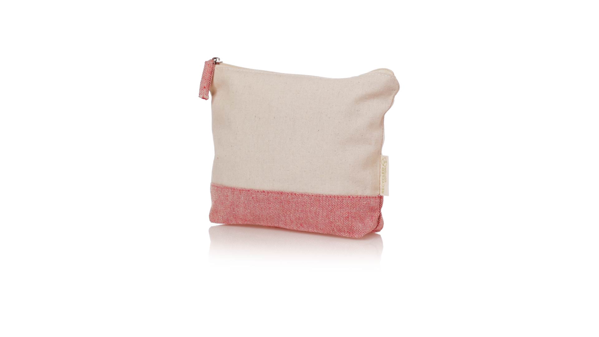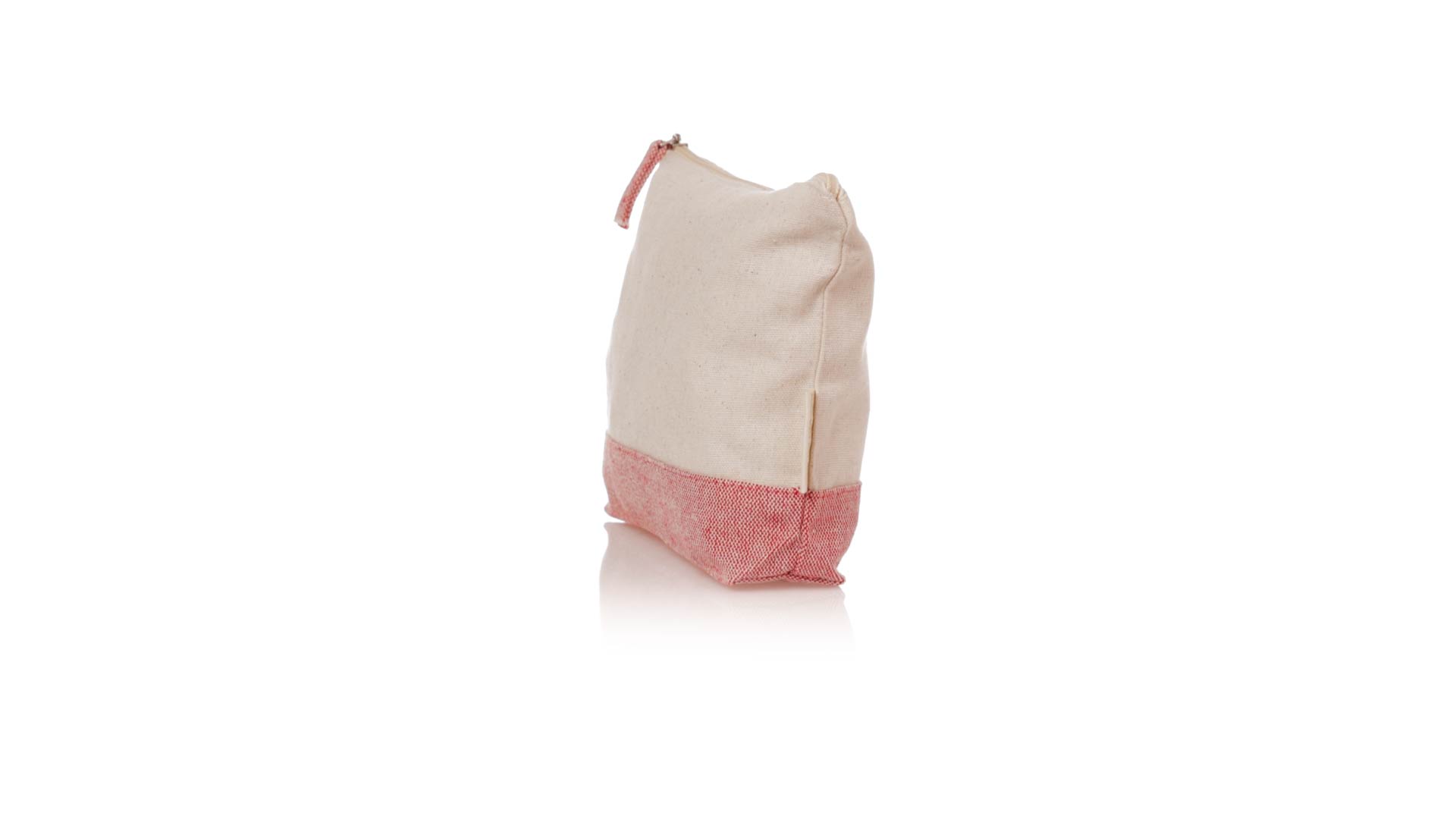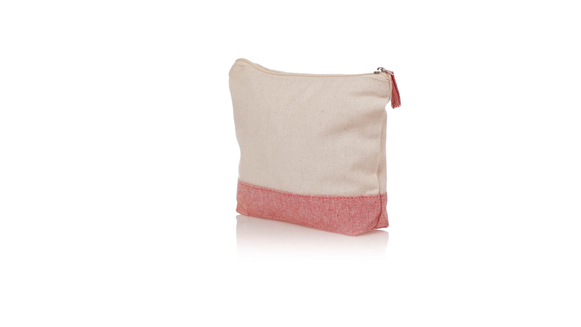 Kosmetiktasche aus recycelter Baumwolle. Hauptfach mit Reissverschluss und Griff in der gleichen Farbe wie der Boden. Erhältlich in vielen leuchtenden Farben, mit Etikett für recycelte Baumwolle.