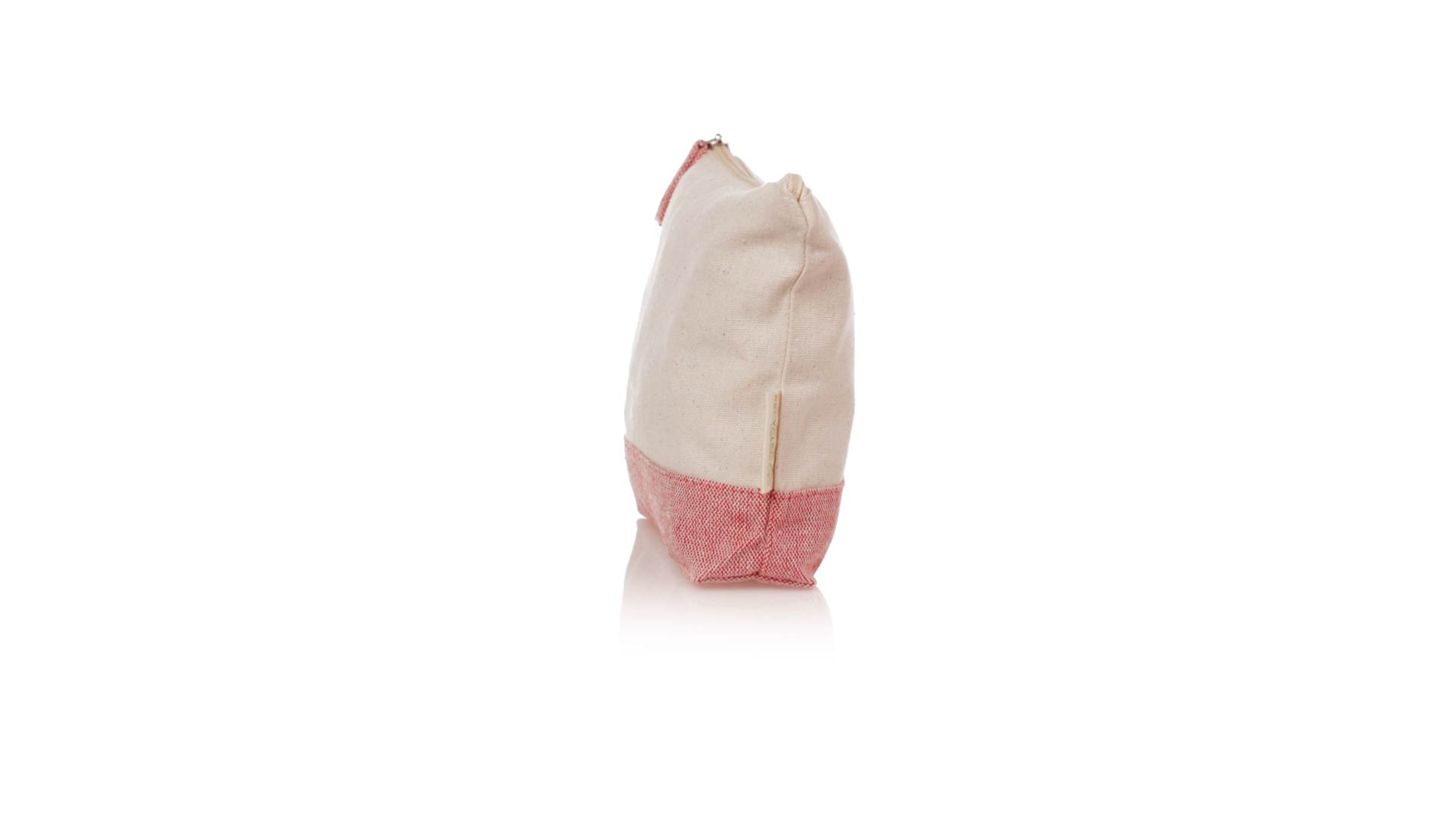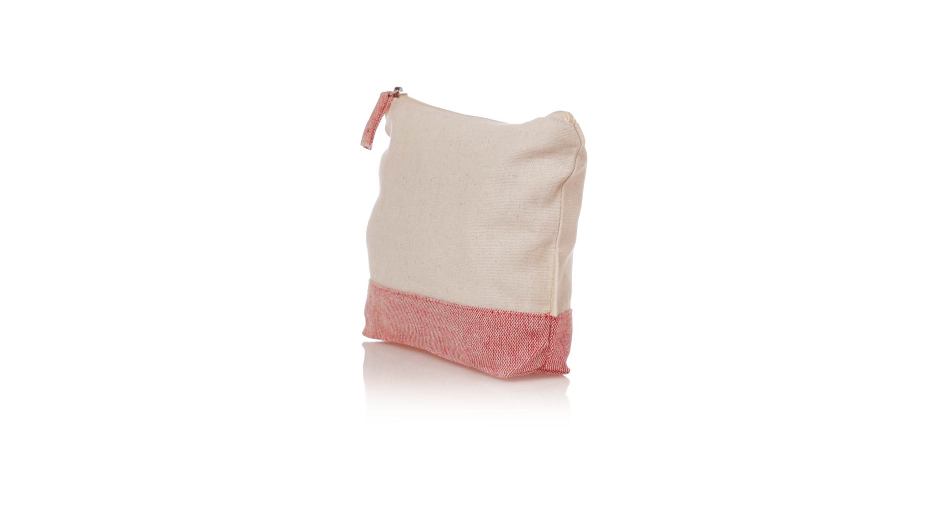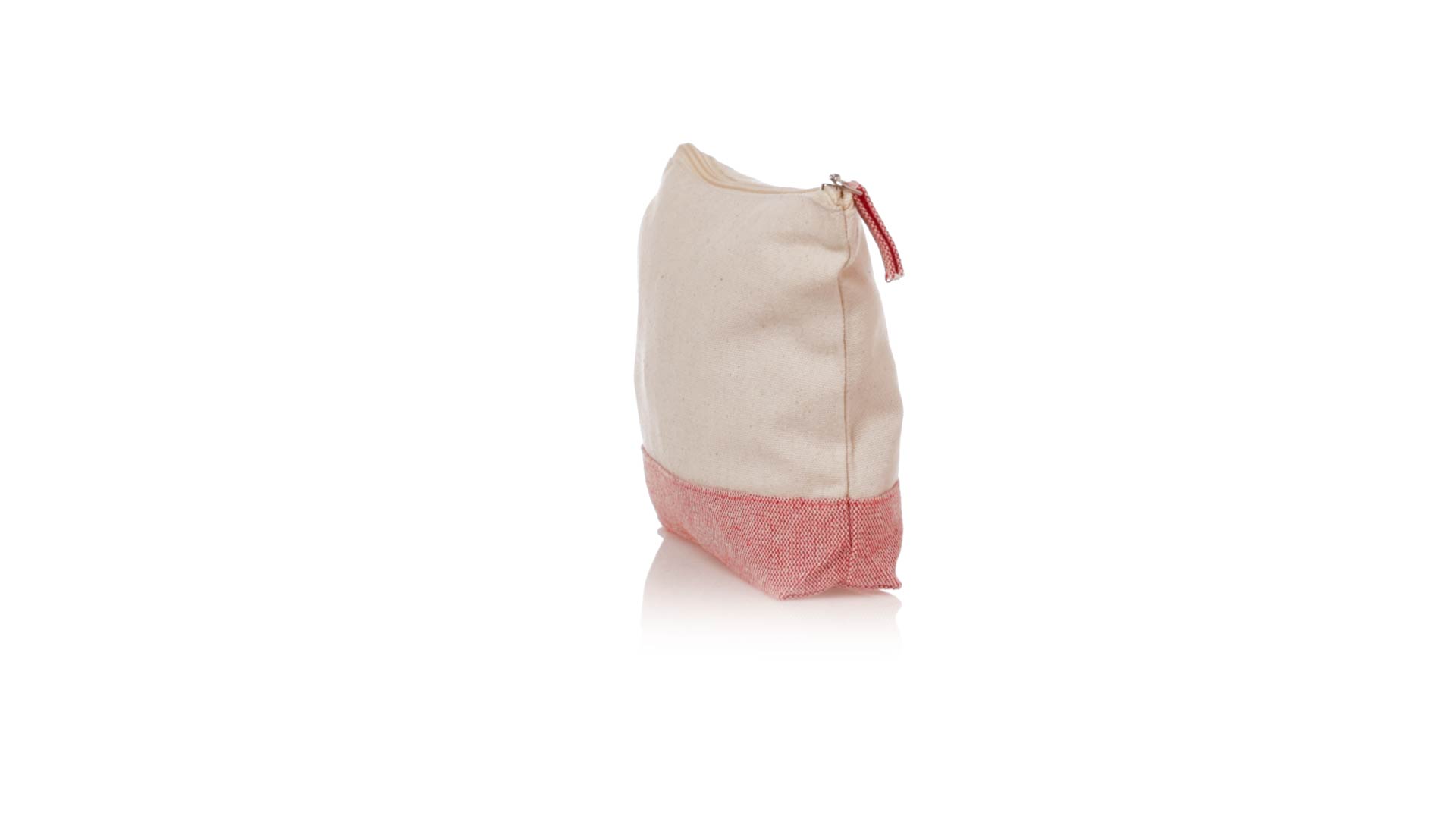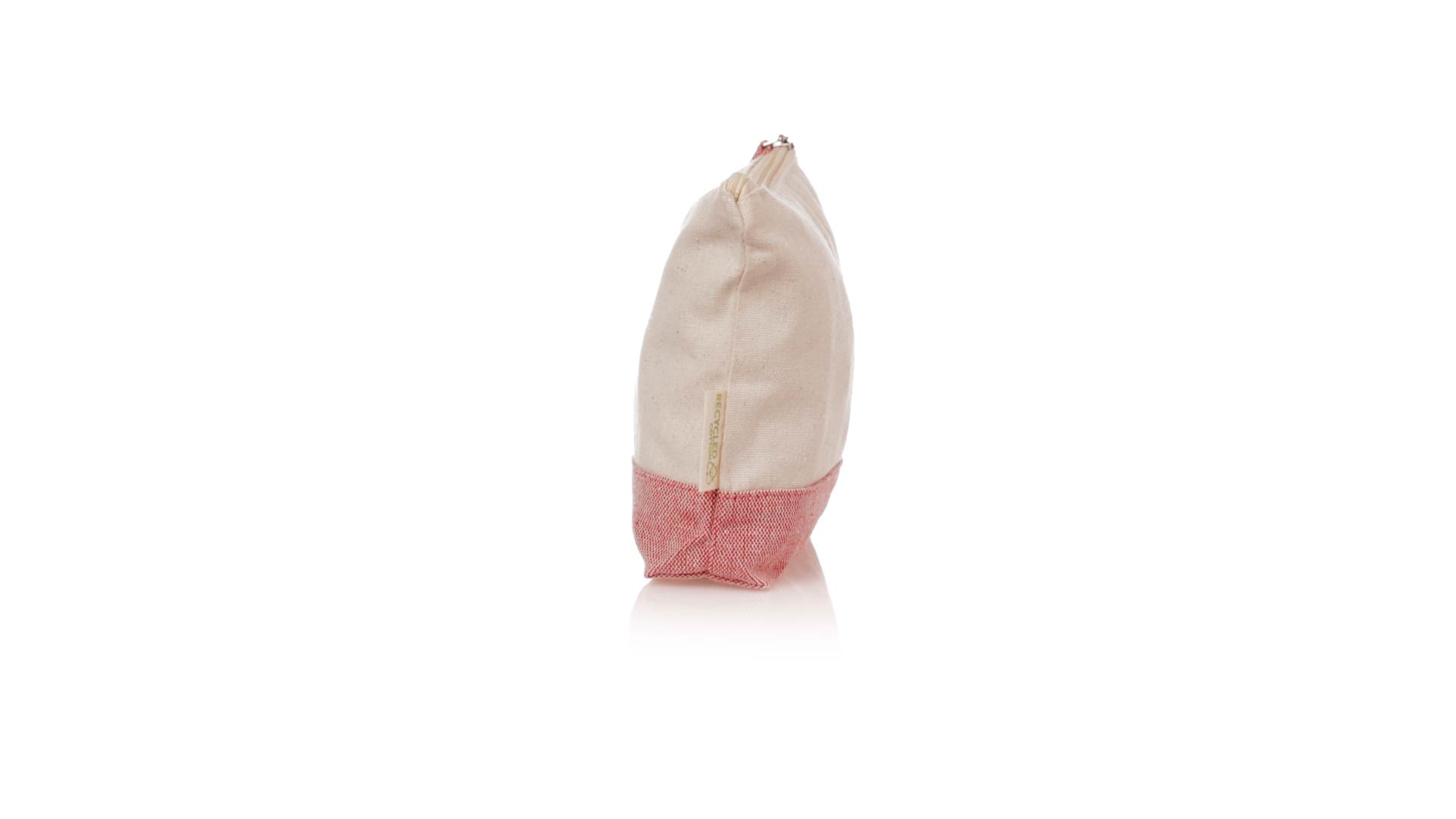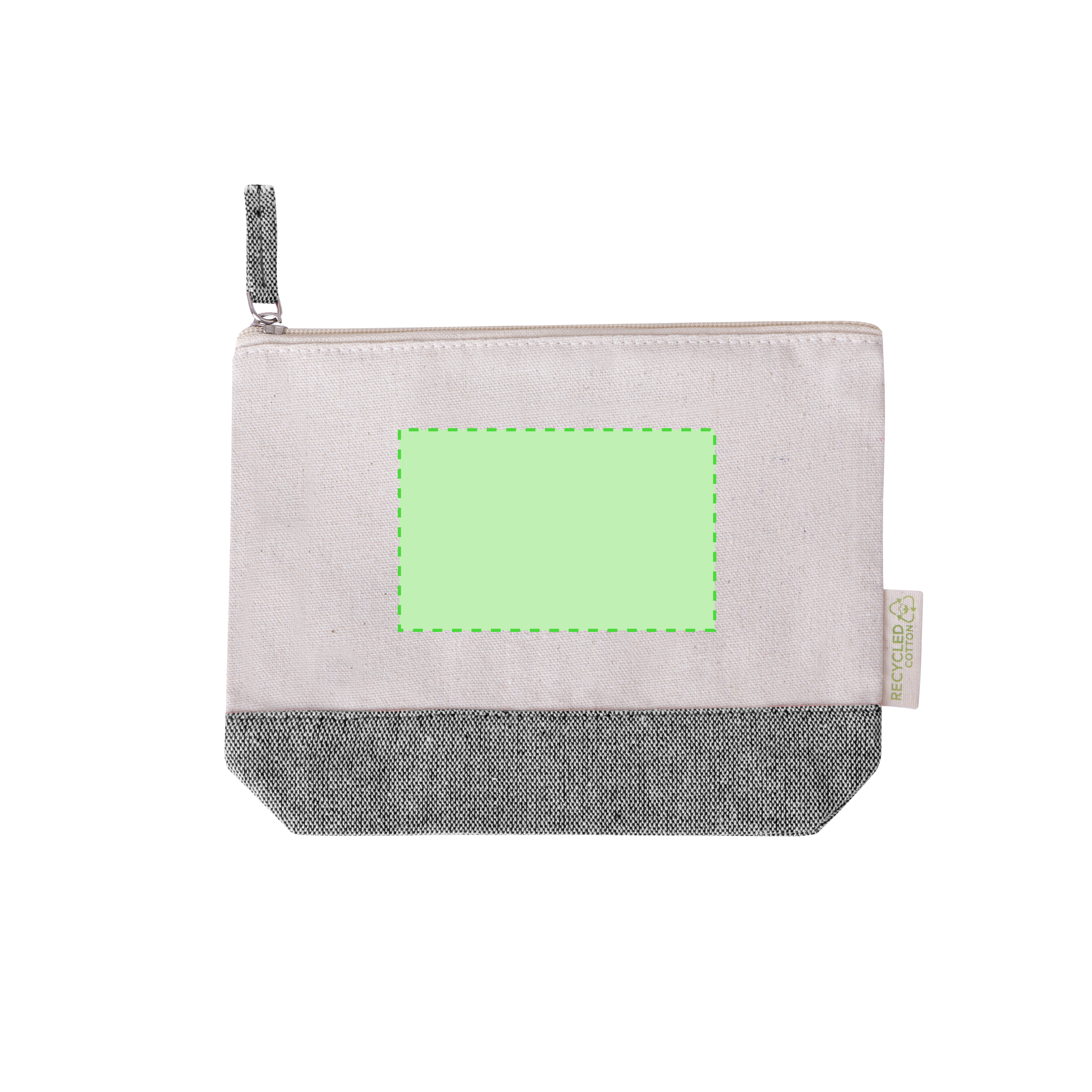 Kosmetiktasche aus recycelter Baumwolle. Hauptfach mit Reissverschluss und Griff in der gleichen Farbe wie der Boden. Erhältlich in vielen leuchtenden Farben, mit Etikett für recycelte Baumwolle.