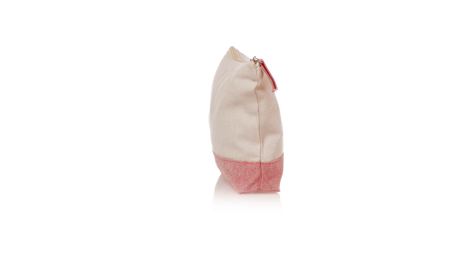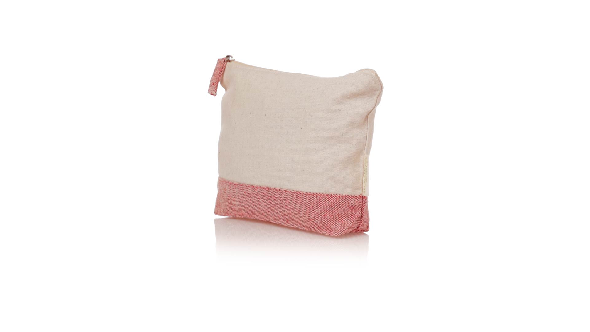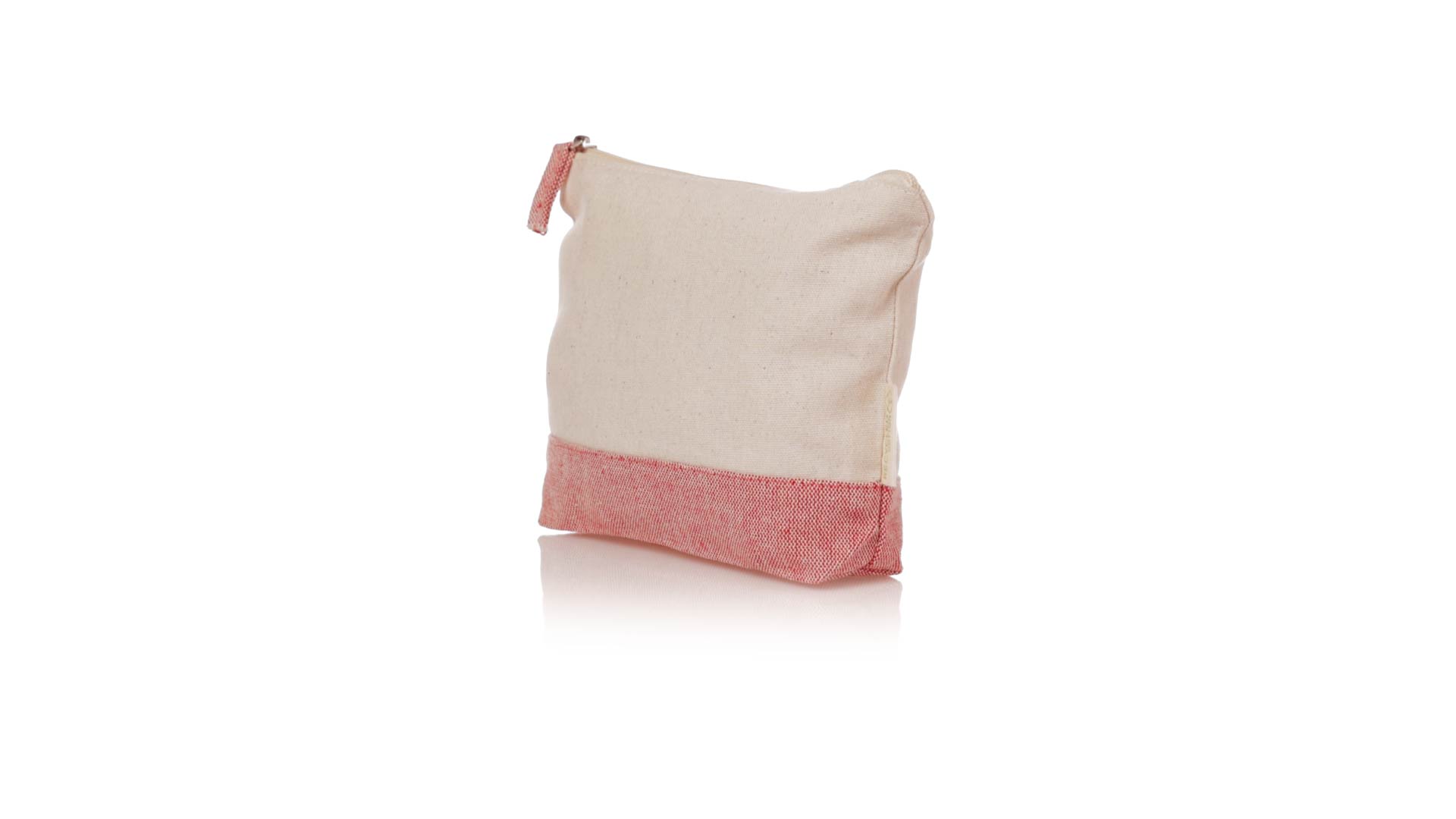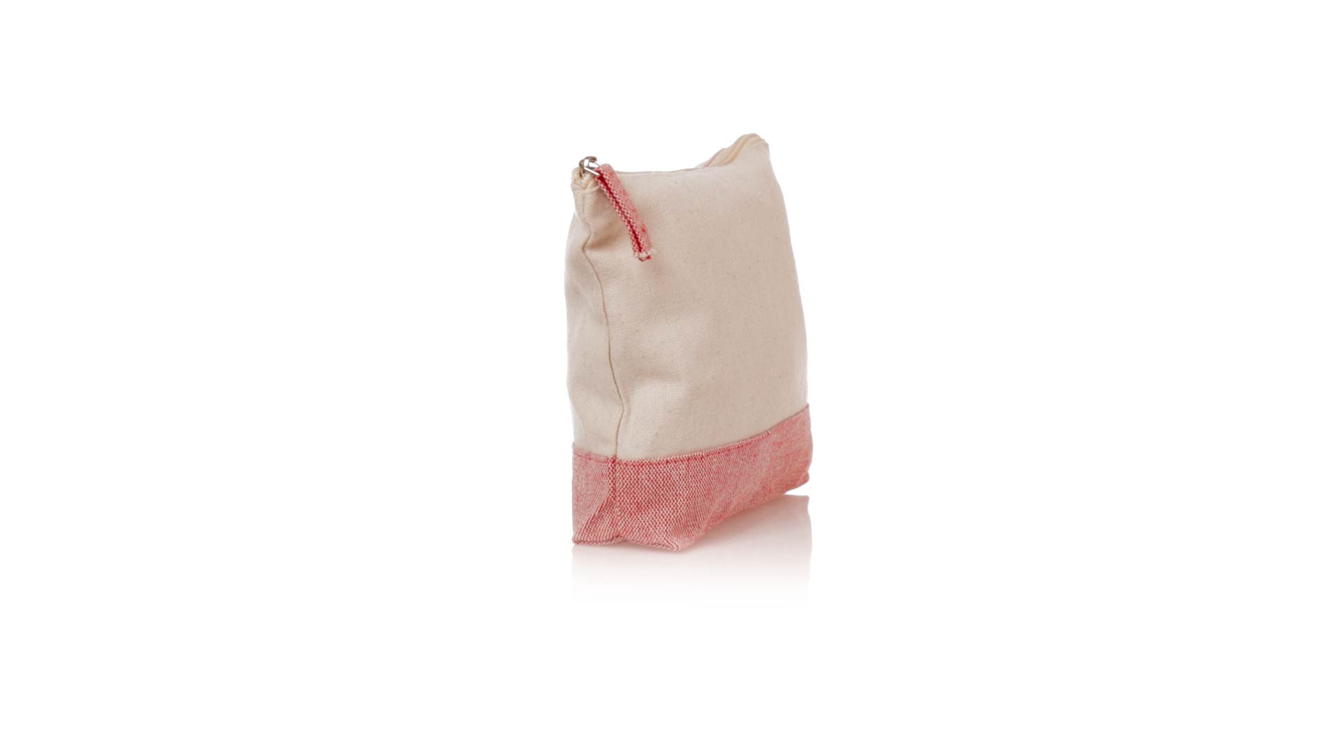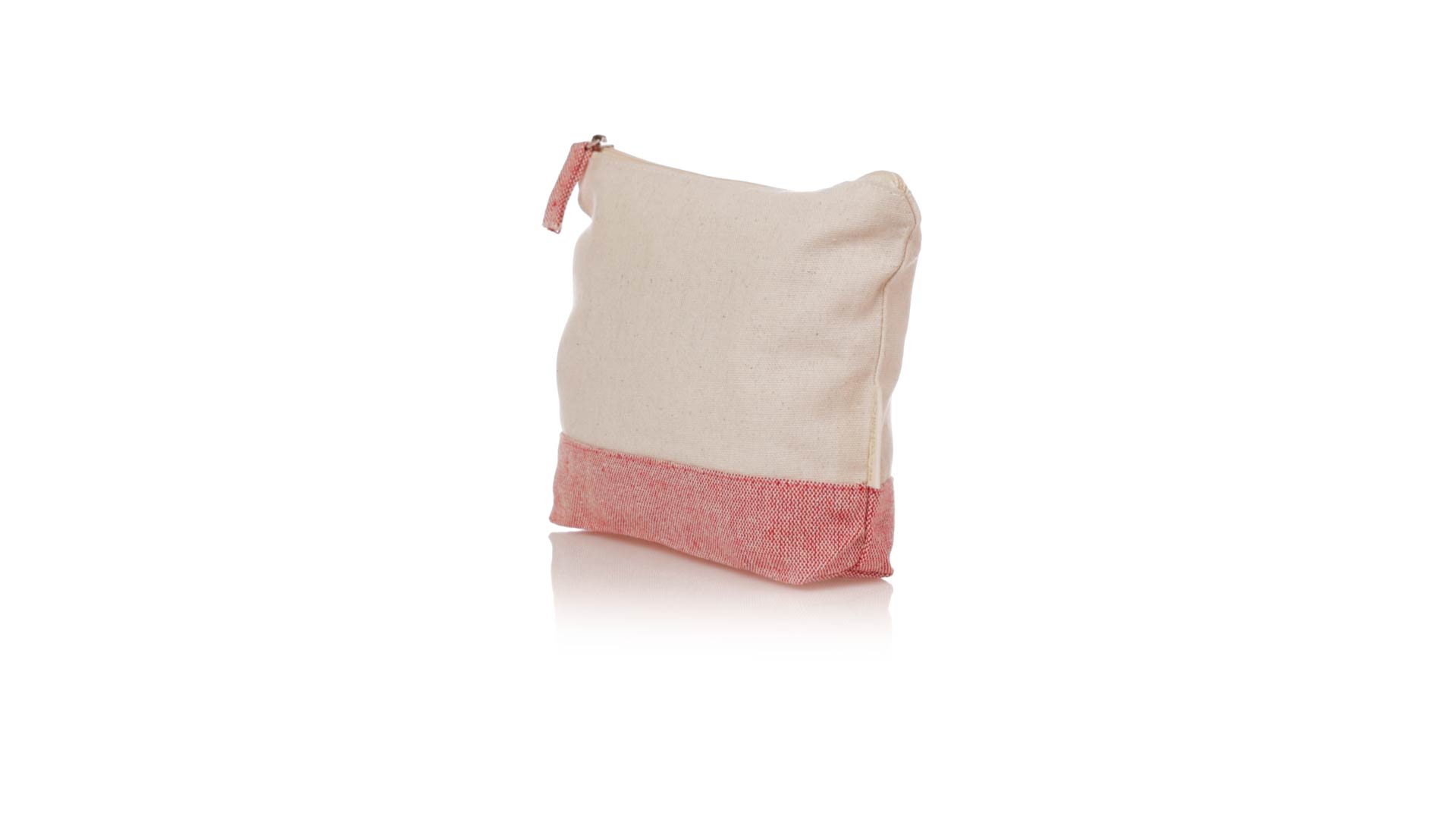 Kosmetiktasche aus recycelter Baumwolle. Hauptfach mit Reissverschluss und Griff in der gleichen Farbe wie der Boden. Erhältlich in vielen leuchtenden Farben, mit Etikett für recycelte Baumwolle.