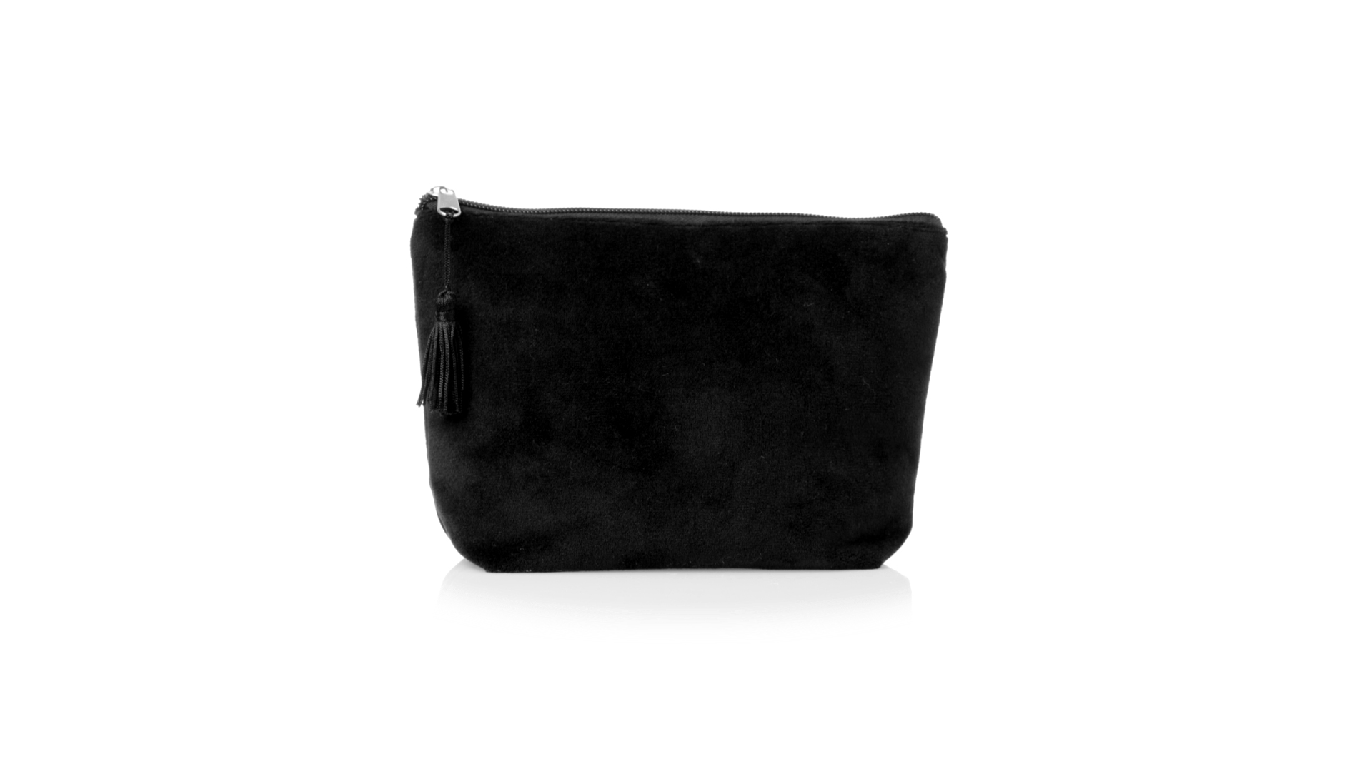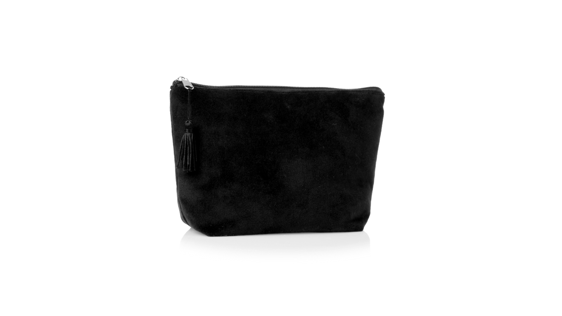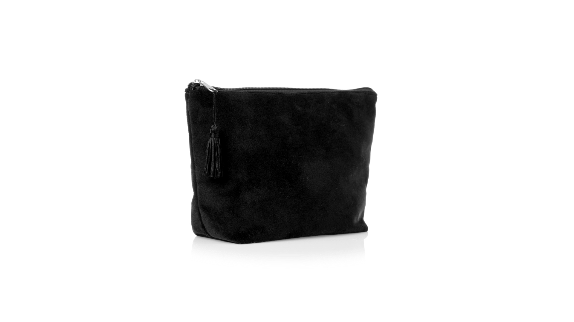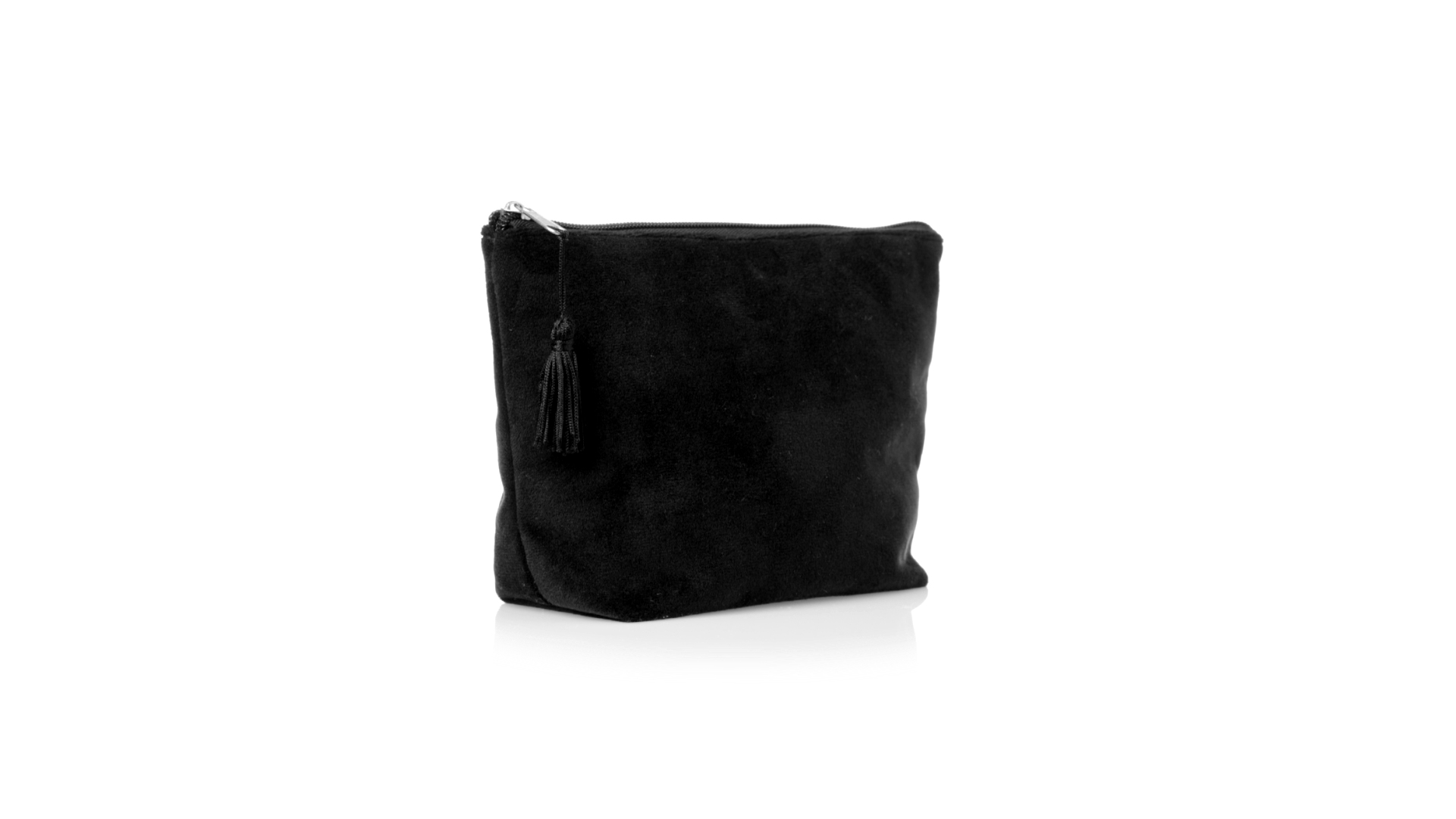 Kosmetiktasche aus Samt, mit Reissverschluss und Quaste am Griff. Hergestellt aus Rayonsamt und genäht, erhältlich in braun und schwarz.