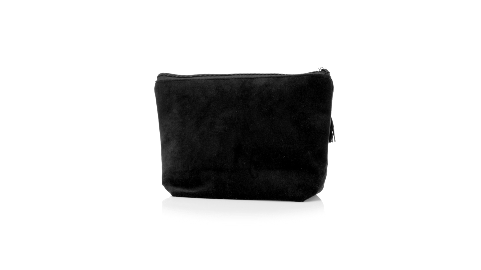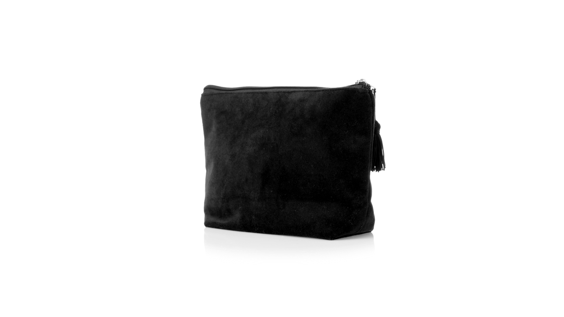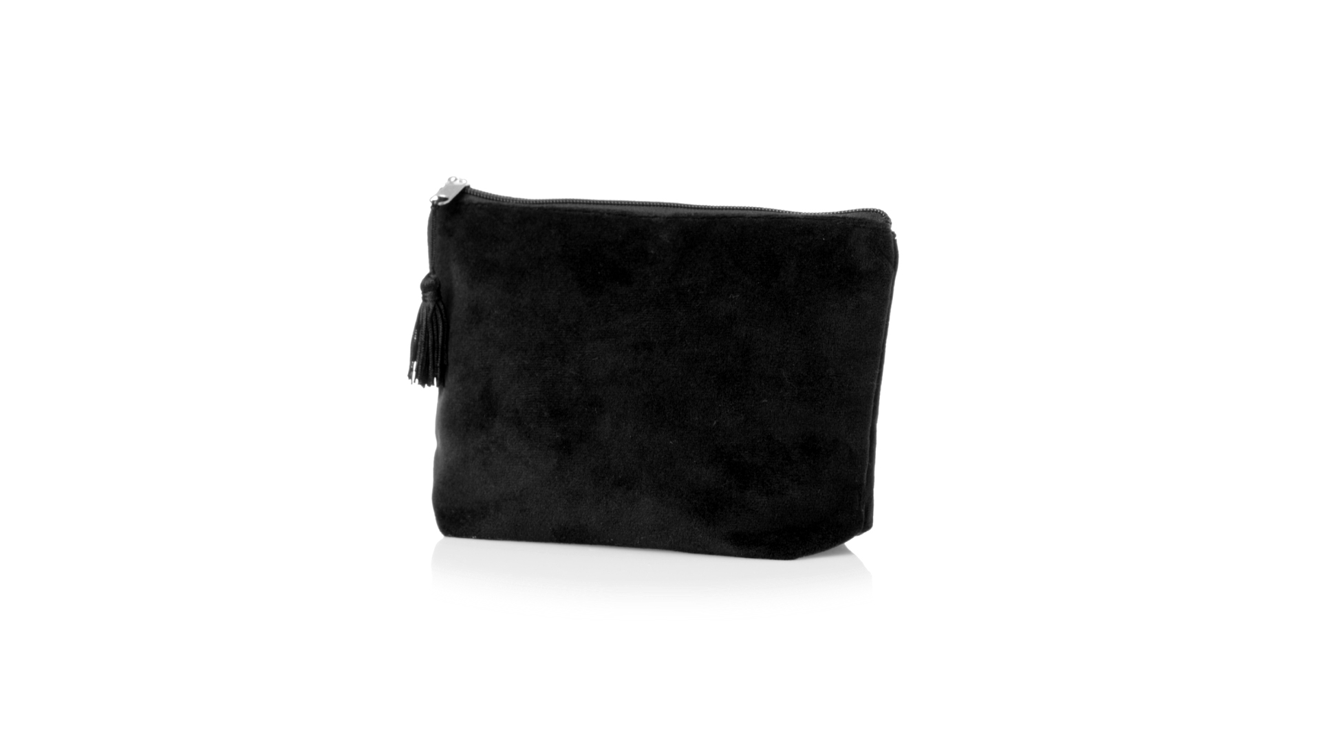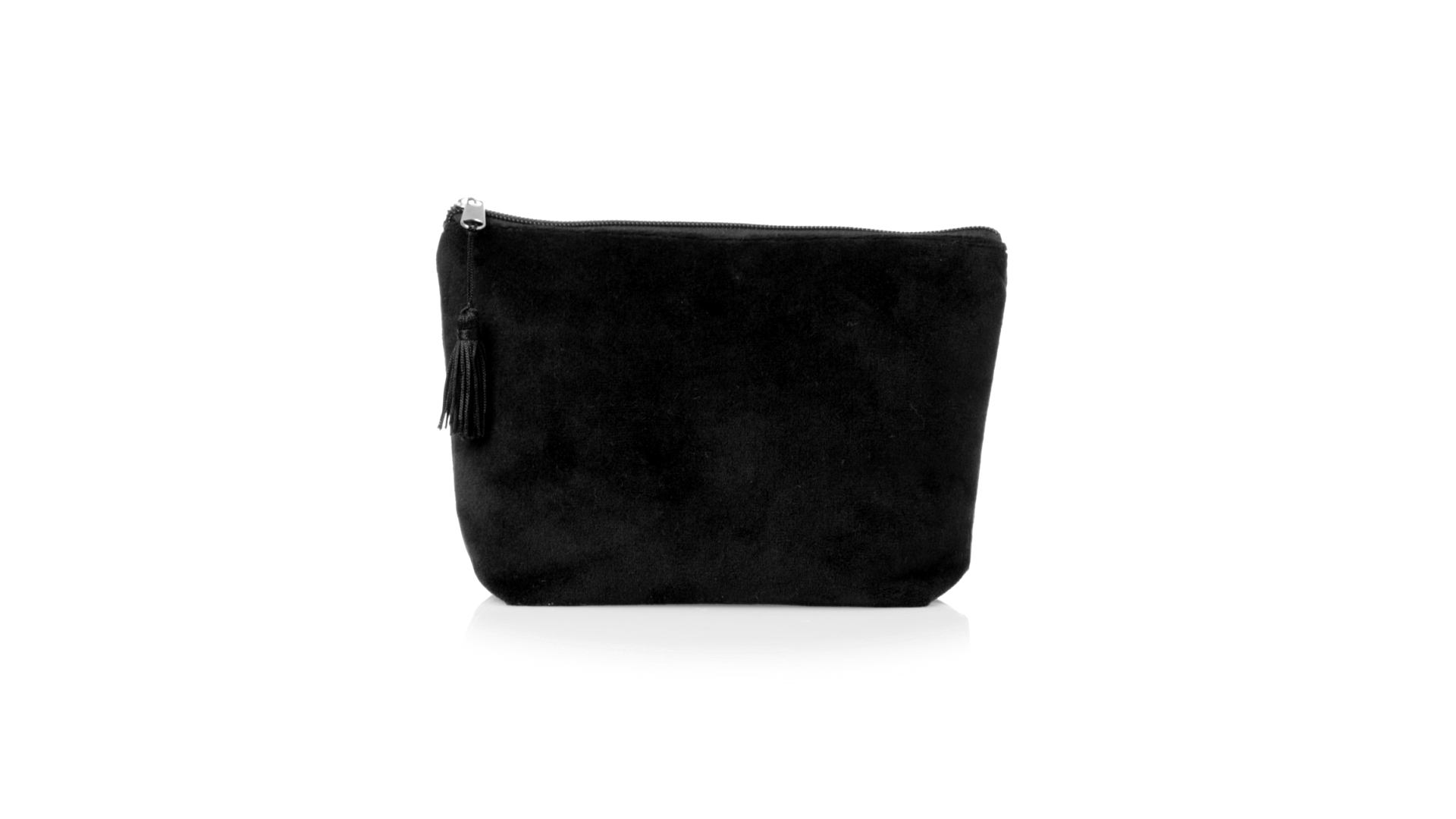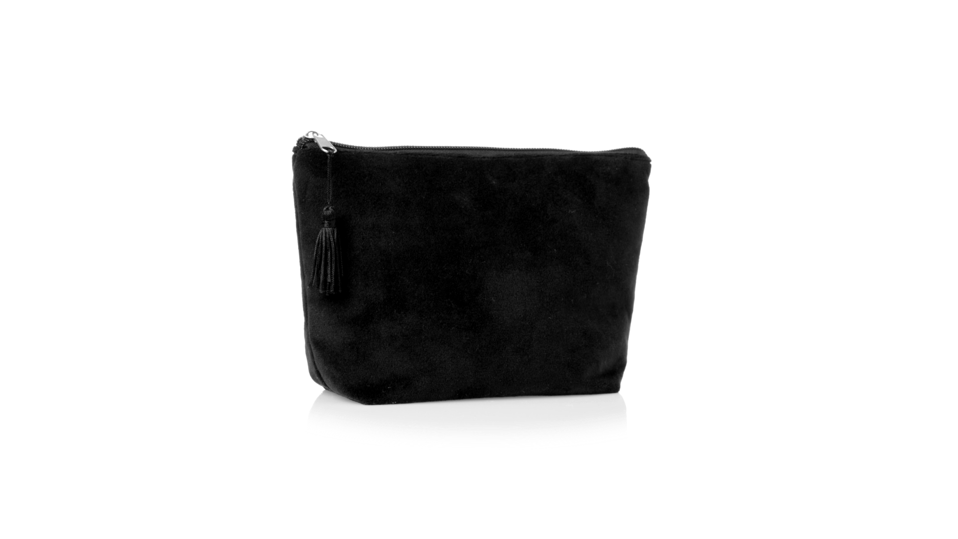 Kosmetiktasche aus Samt, mit Reissverschluss und Quaste am Griff. Hergestellt aus Rayonsamt und genäht, erhältlich in braun und schwarz.