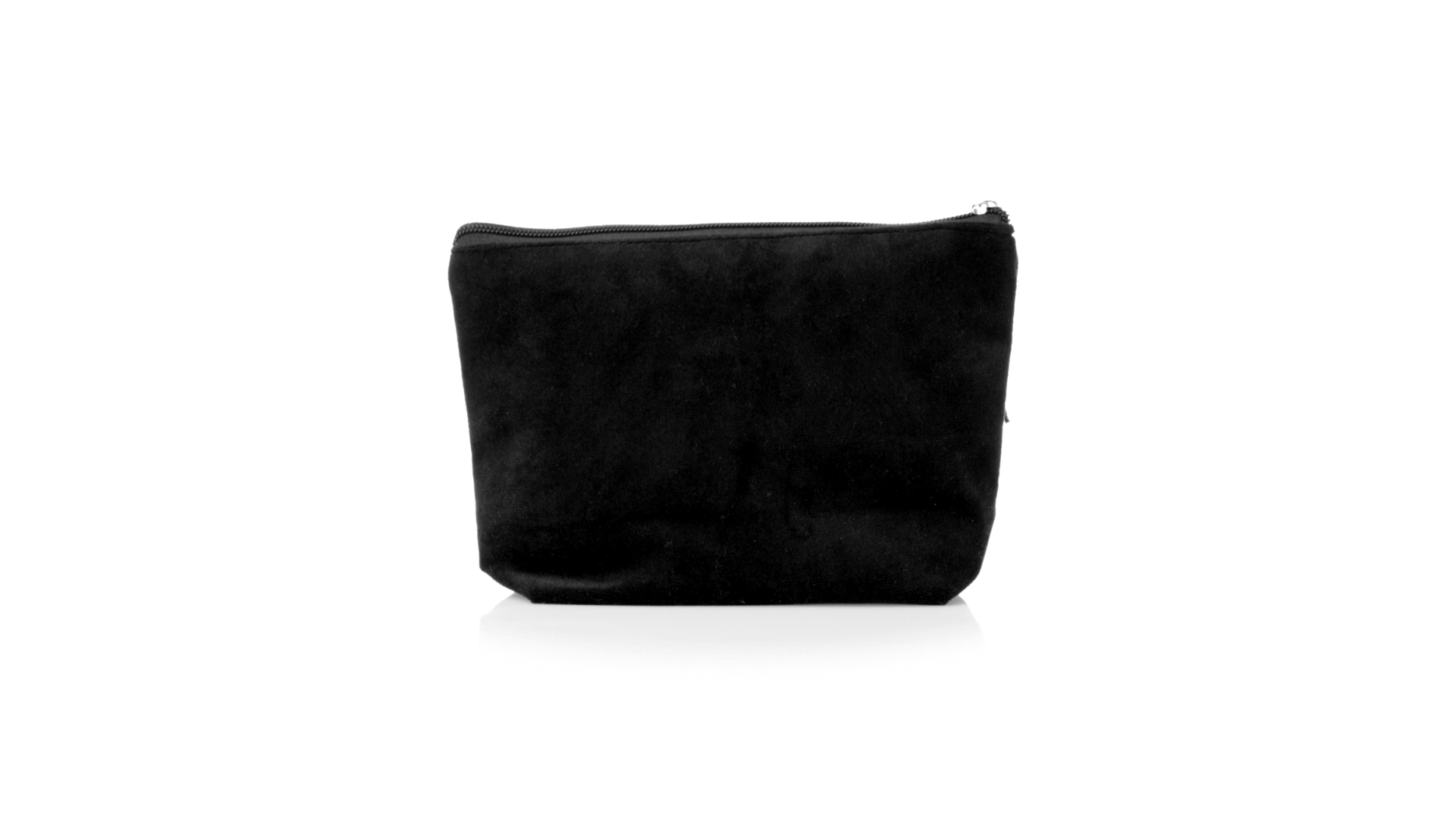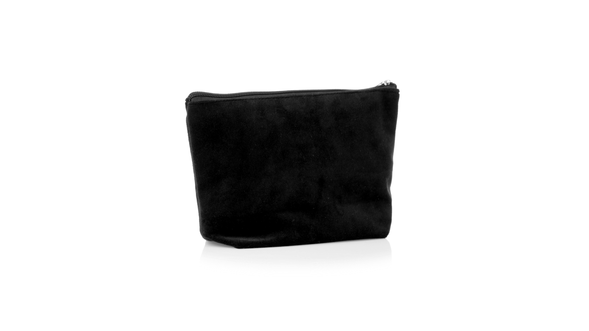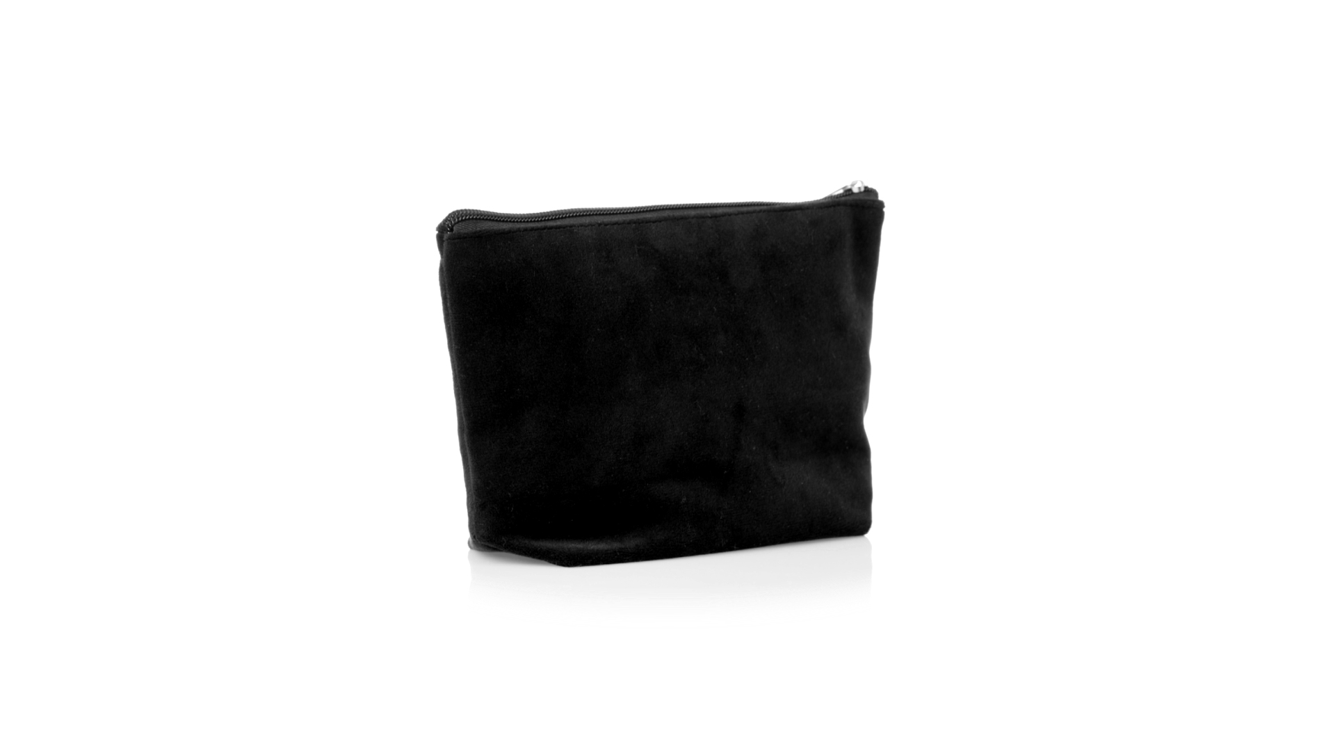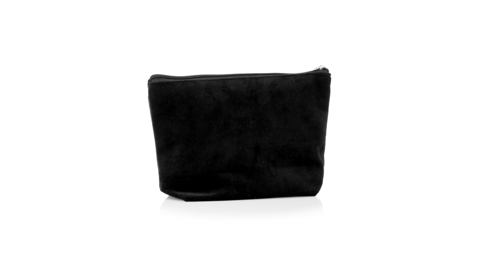Kosmetiktasche aus Samt, mit Reissverschluss und Quaste am Griff. Hergestellt aus Rayonsamt und genäht, erhältlich in braun und schwarz.