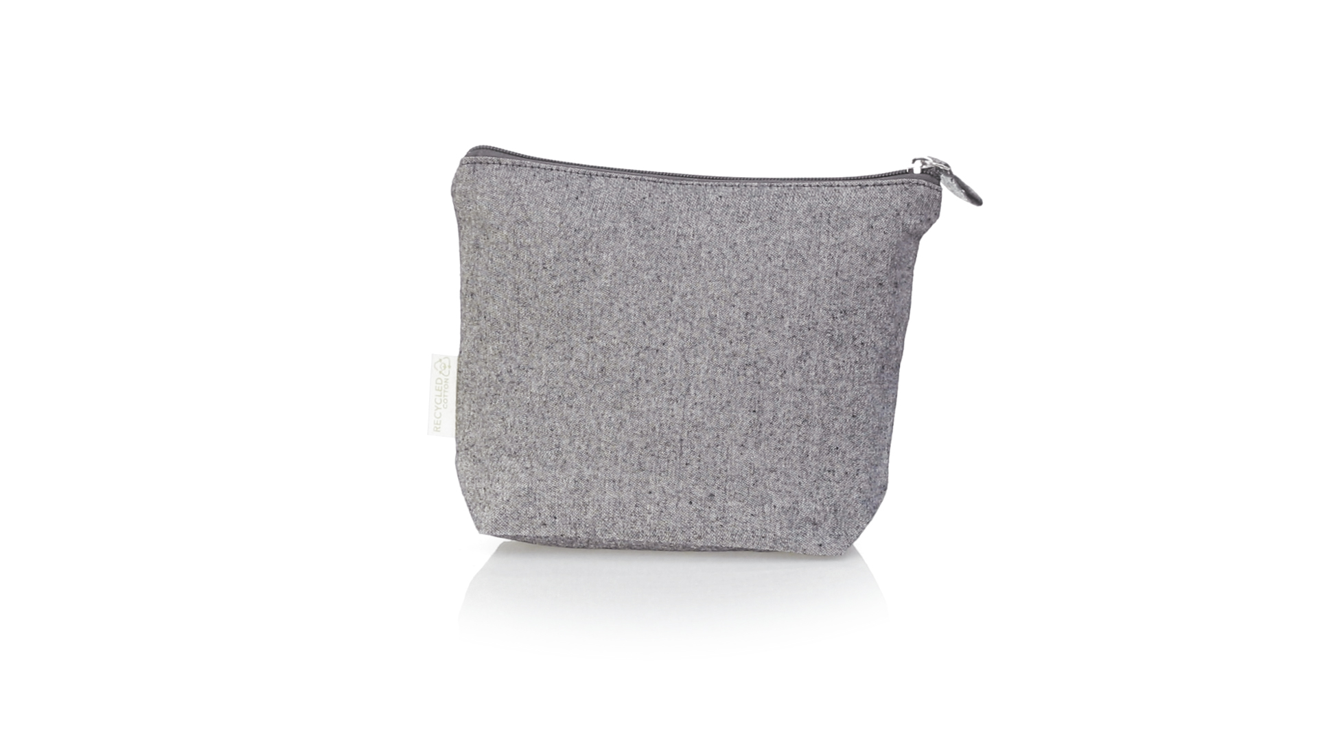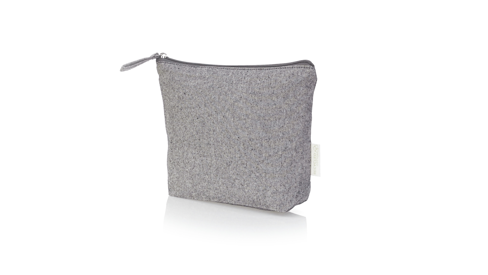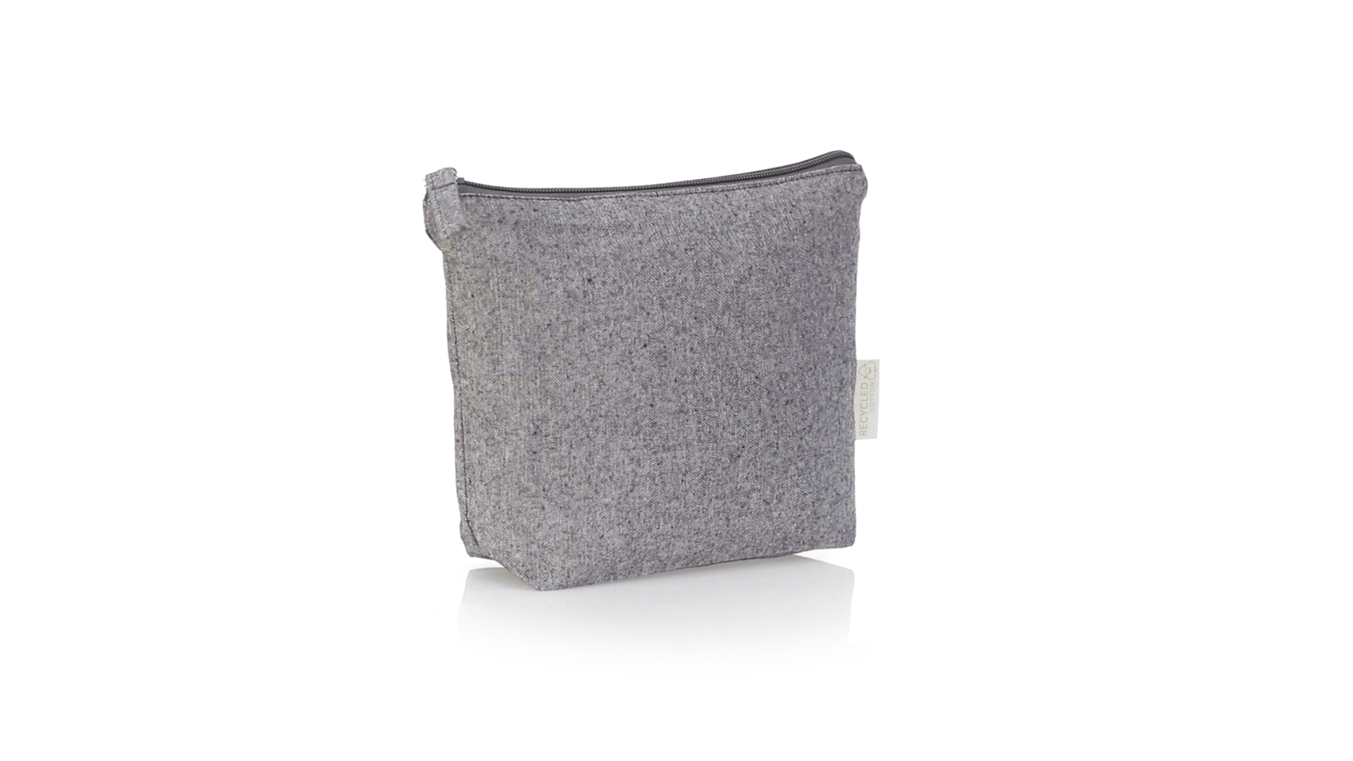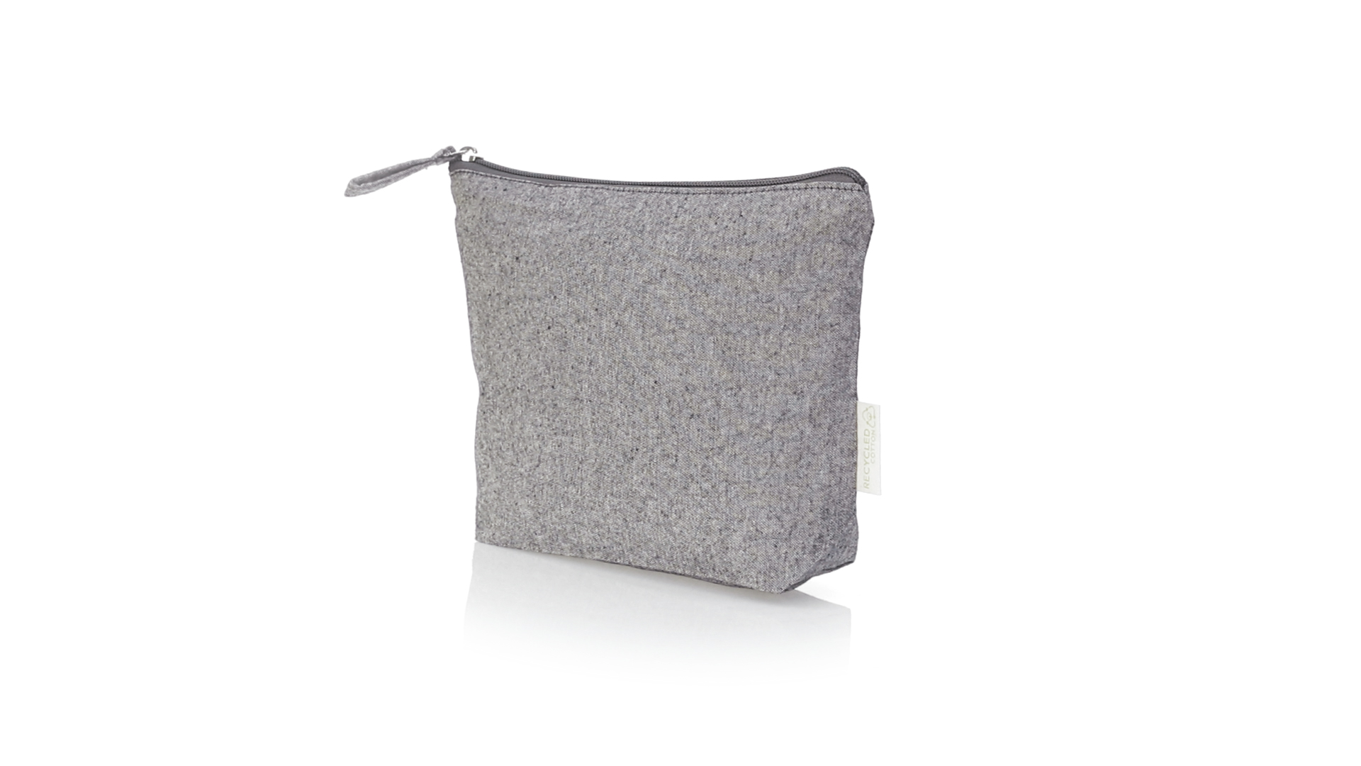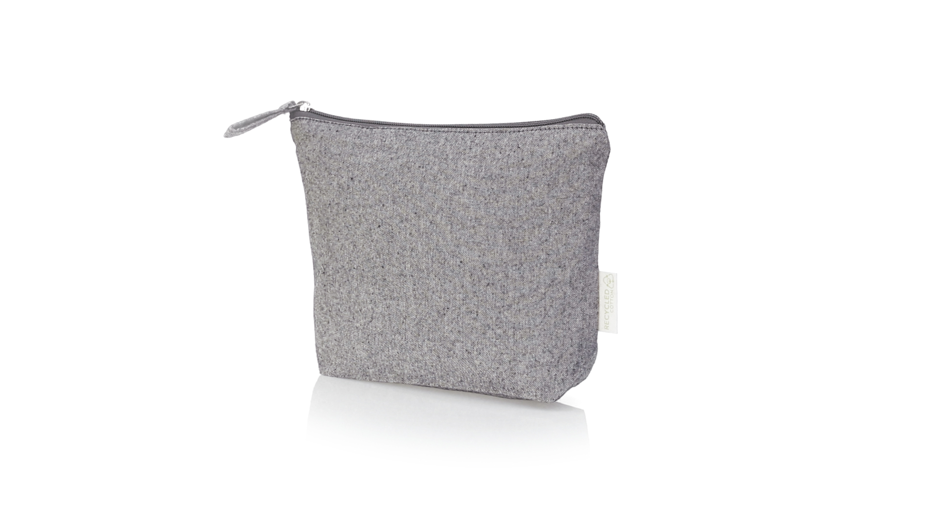 Kosmetiktasche aus kräftiger recycelter Baumwolle GRS 180g/m2. GRS-Zertifizierung (Global Recycled Standard), die die recycelte Herkunft des für die Herstellung des Produkts verwendeten Materials garantiert. Reissverschluss mit passendem Puller und Öko-Label an der Aussenseite.