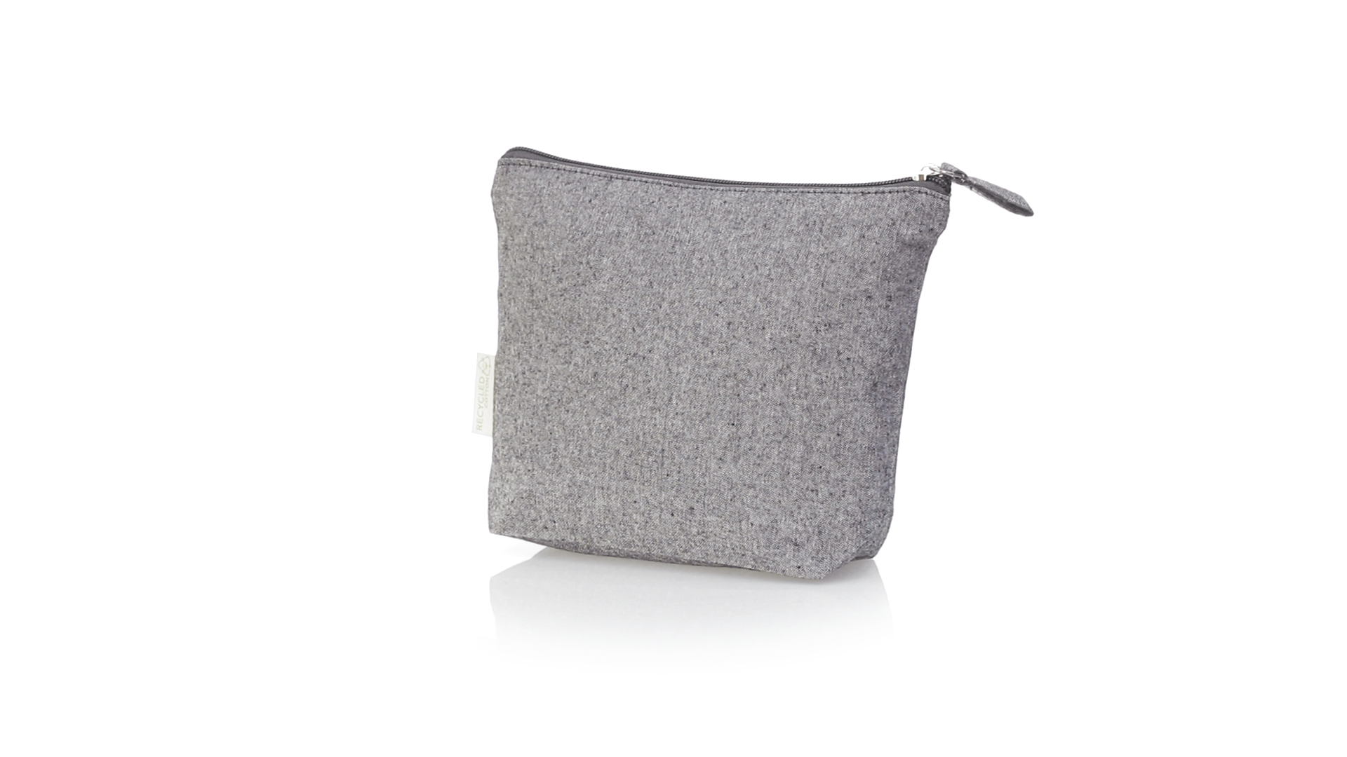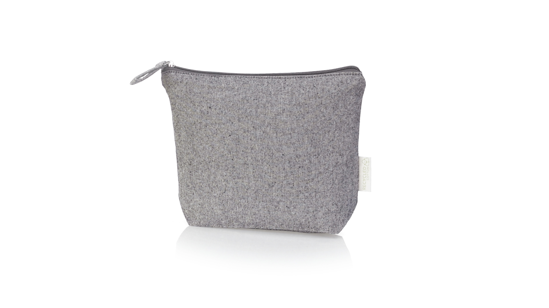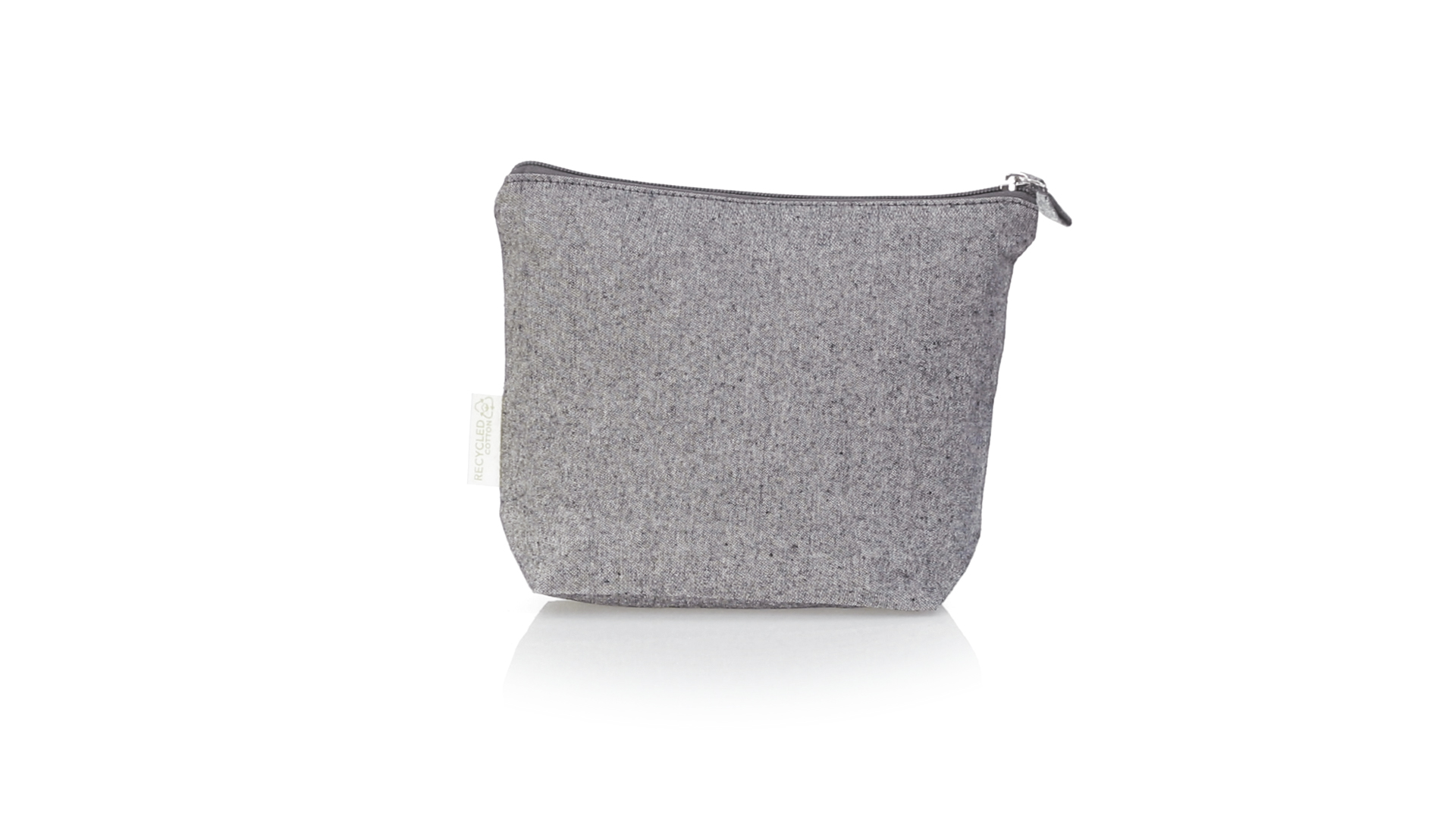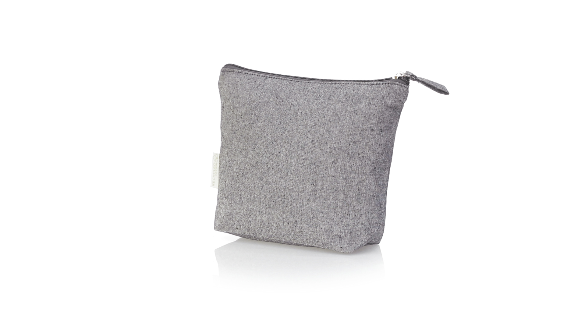Kosmetiktasche aus kräftiger recycelter Baumwolle GRS 180g/m2. GRS-Zertifizierung (Global Recycled Standard), die die recycelte Herkunft des für die Herstellung des Produkts verwendeten Materials garantiert. Reissverschluss mit passendem Puller und Öko-Label an der Aussenseite.