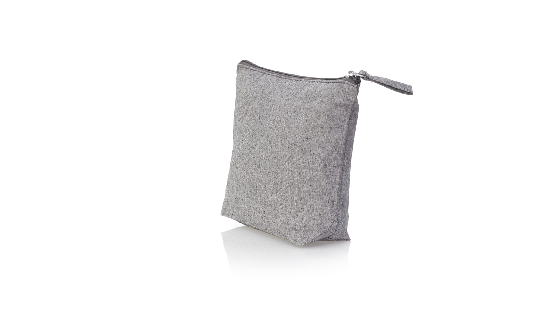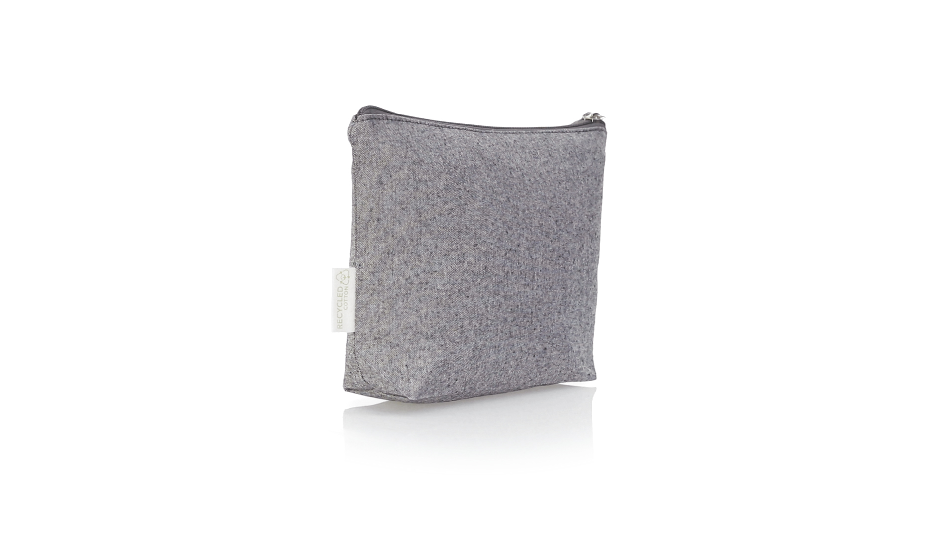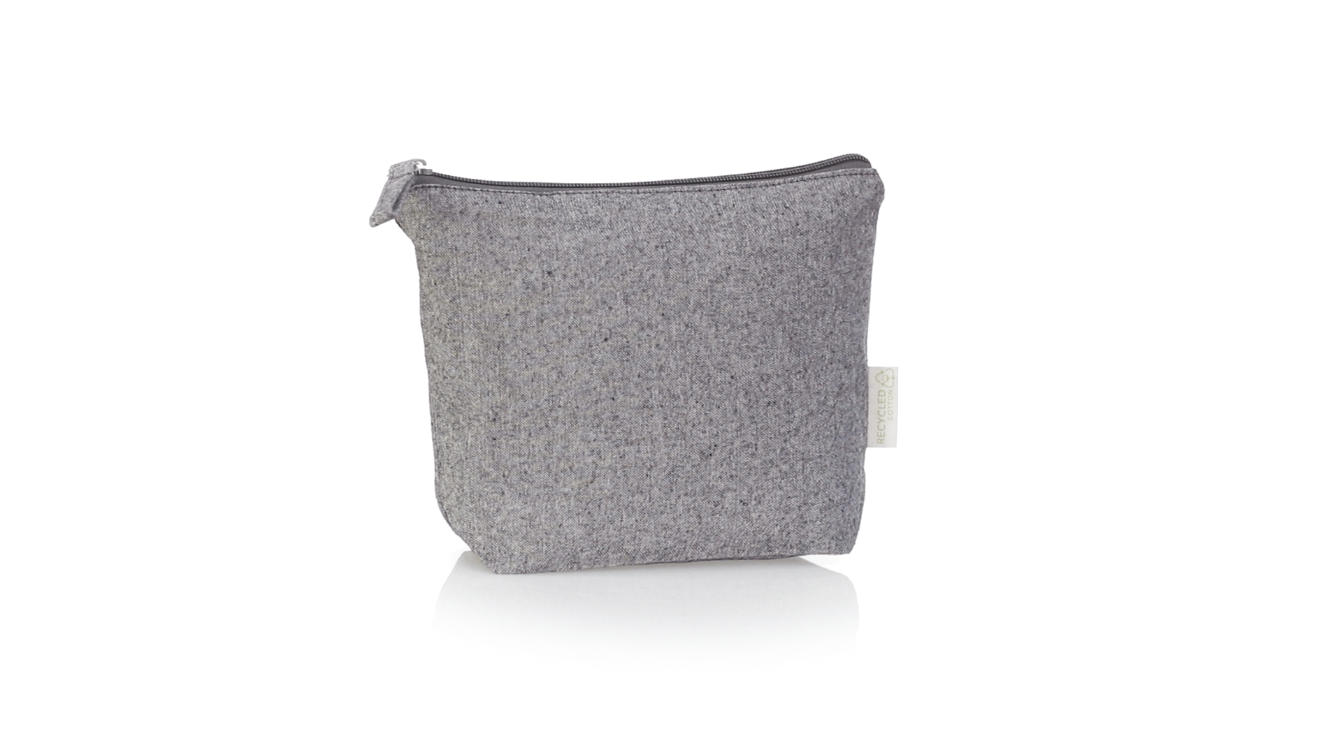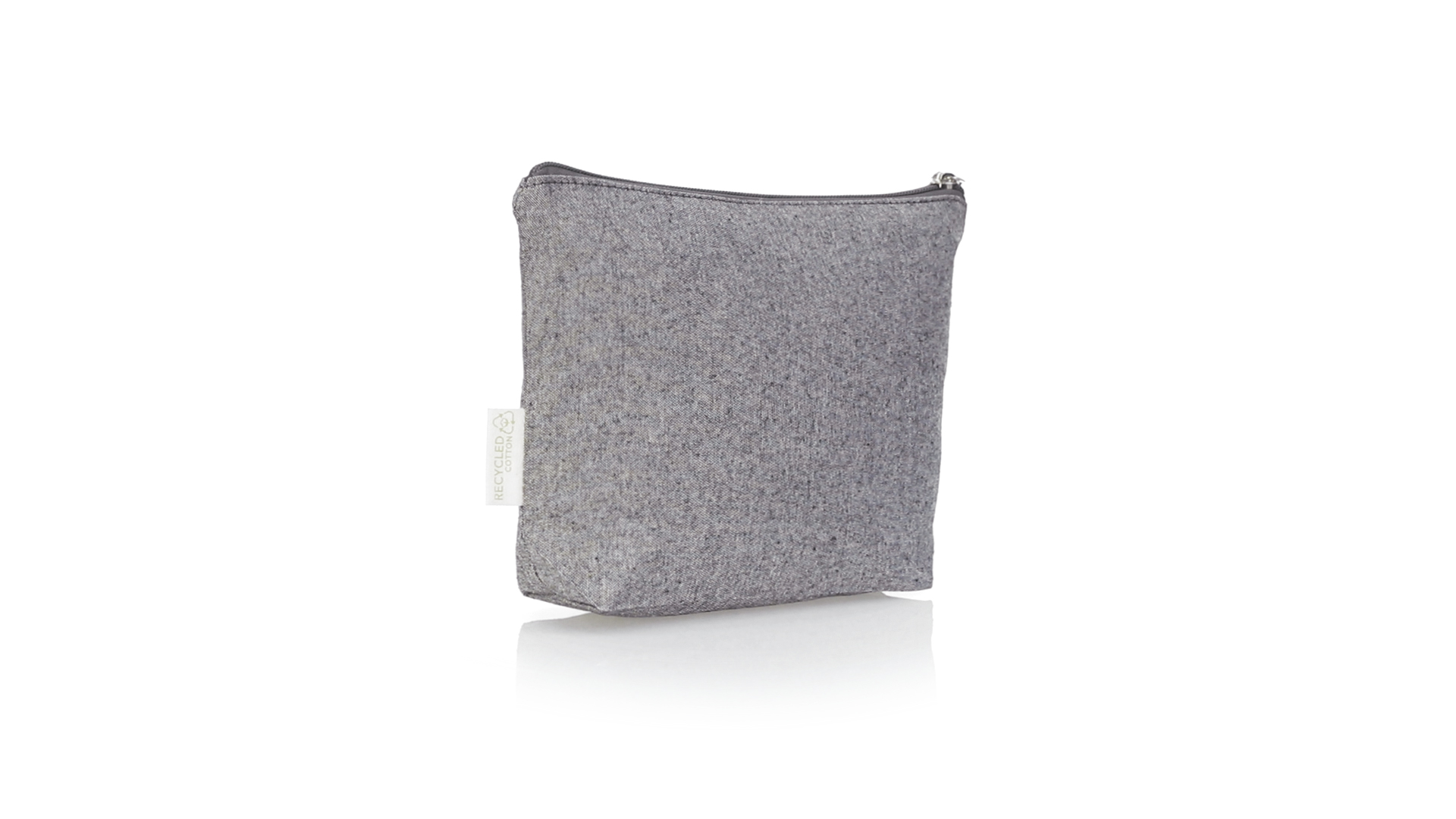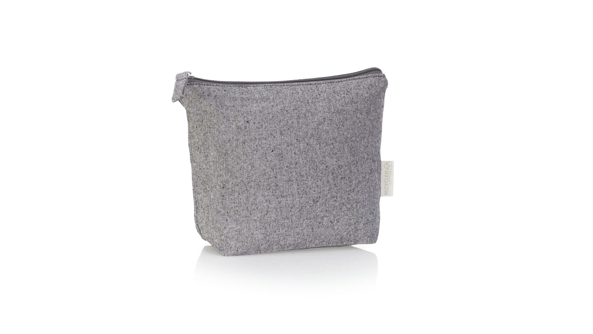 Kosmetiktasche aus kräftiger recycelter Baumwolle GRS 180g/m2. GRS-Zertifizierung (Global Recycled Standard), die die recycelte Herkunft des für die Herstellung des Produkts verwendeten Materials garantiert. Reissverschluss mit passendem Puller und Öko-Label an der Aussenseite.