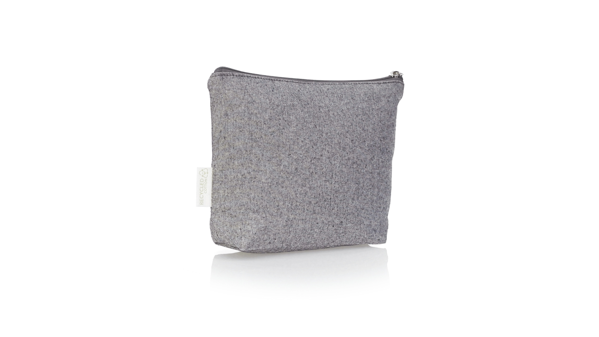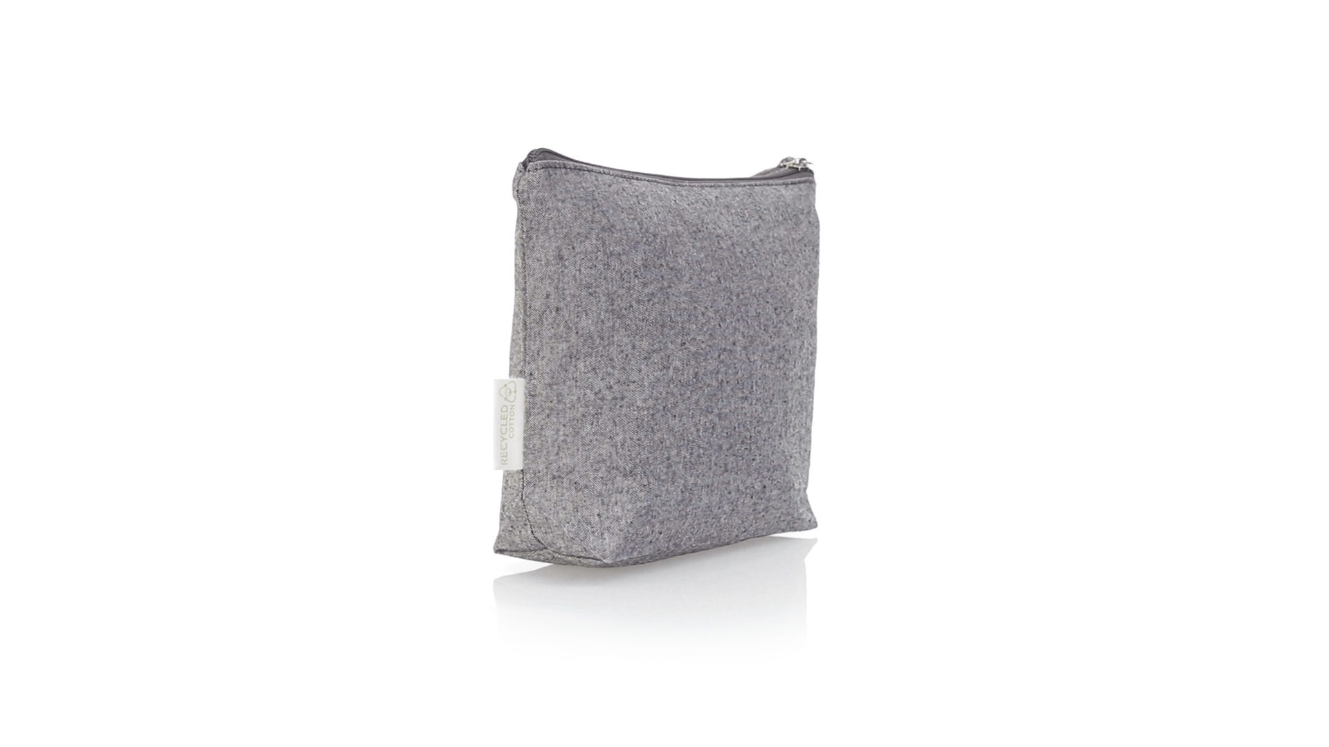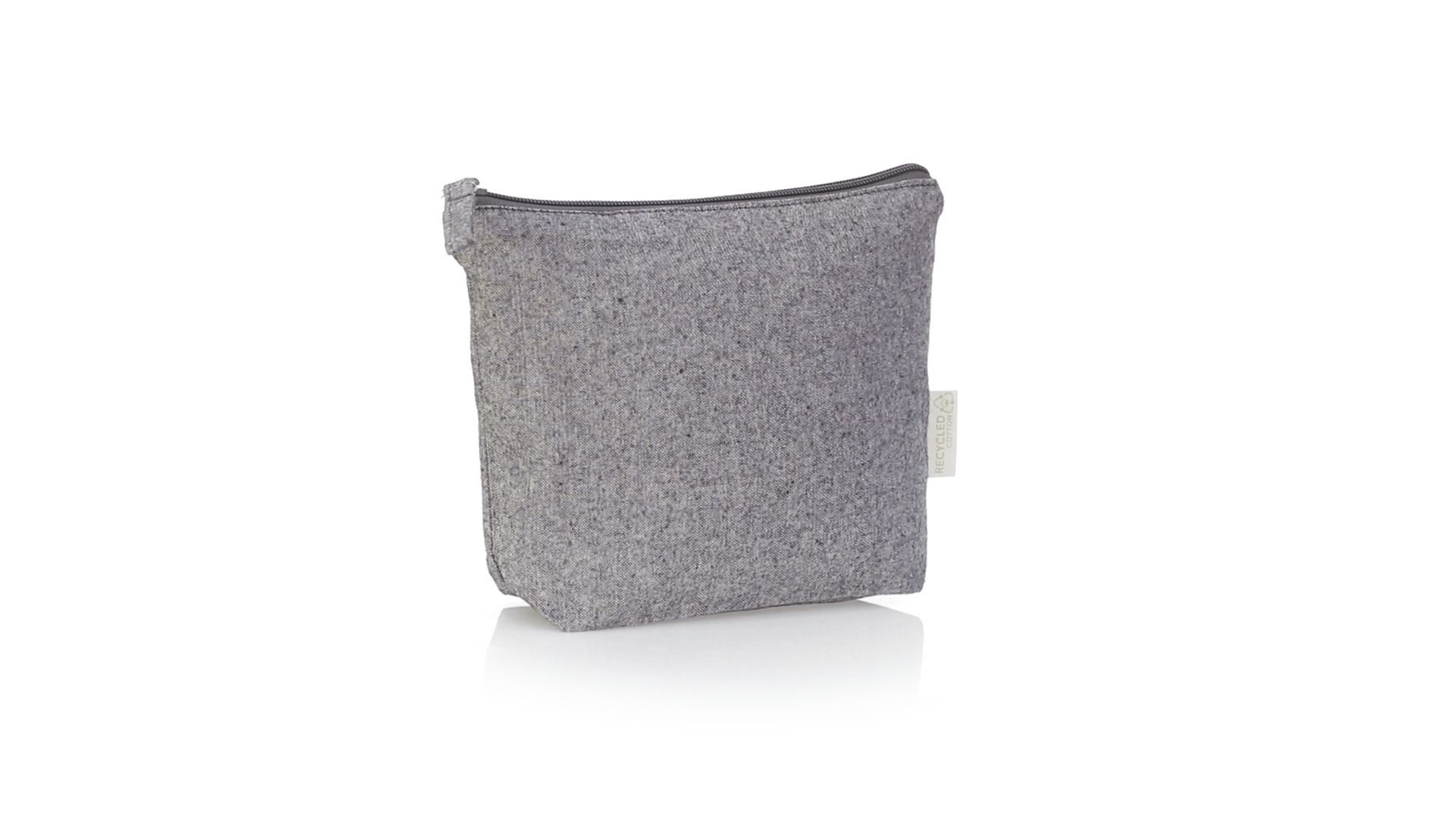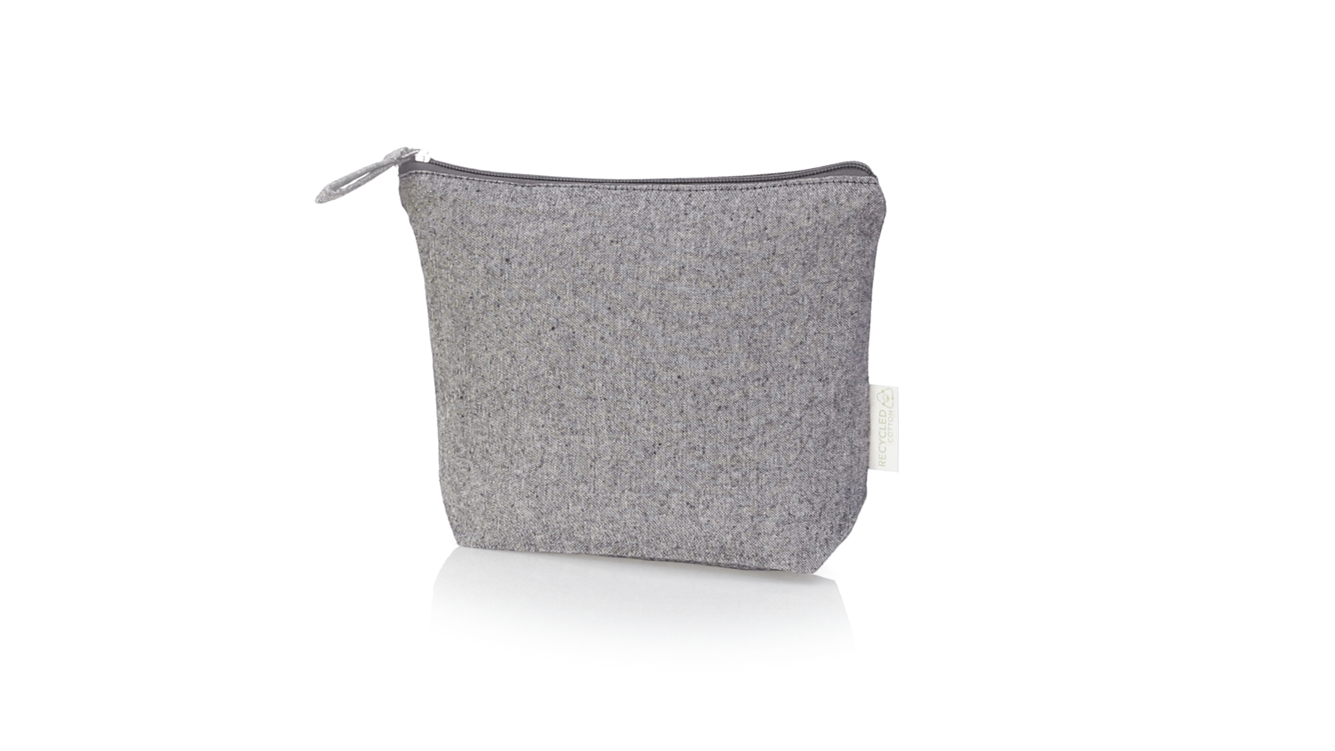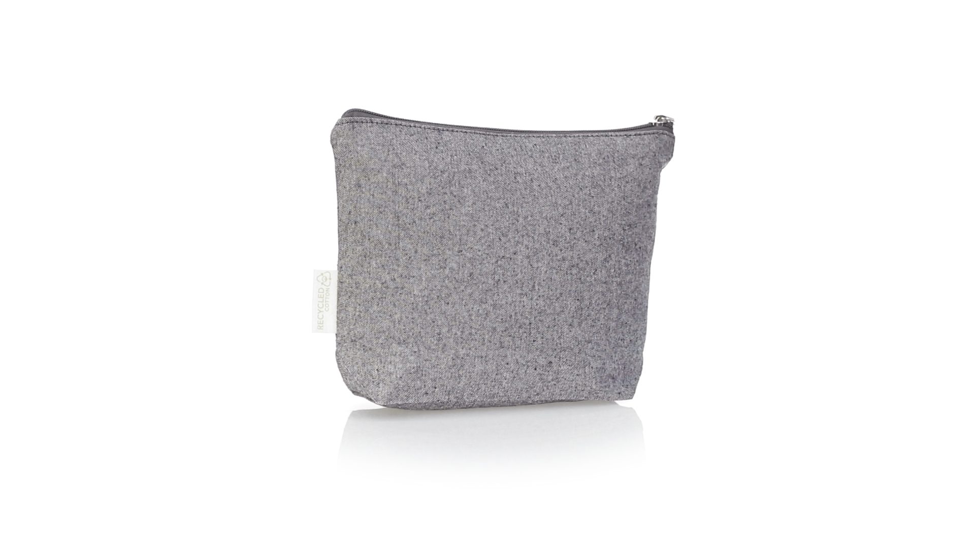 Kosmetiktasche aus kräftiger recycelter Baumwolle GRS 180g/m2. GRS-Zertifizierung (Global Recycled Standard), die die recycelte Herkunft des für die Herstellung des Produkts verwendeten Materials garantiert. Reissverschluss mit passendem Puller und Öko-Label an der Aussenseite.