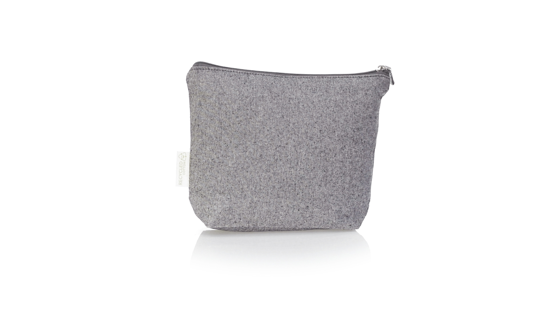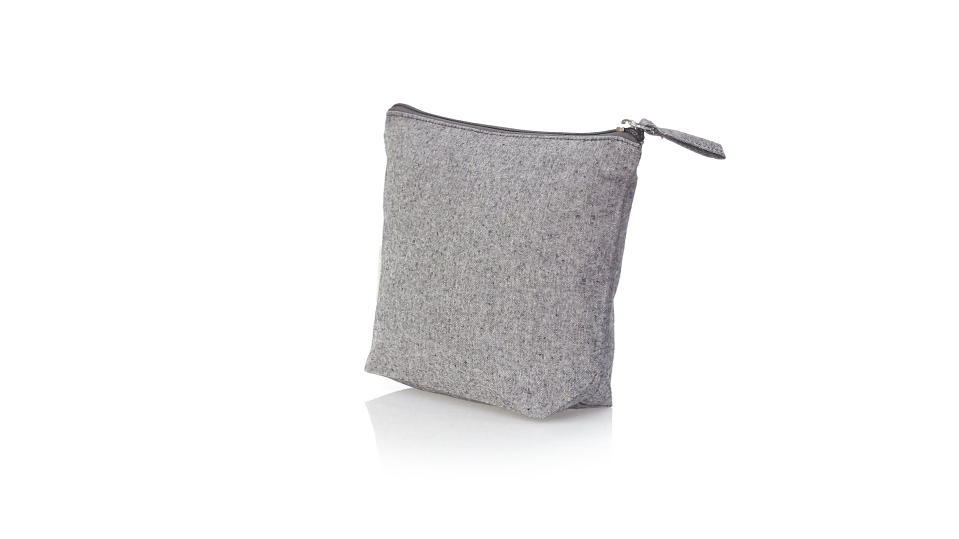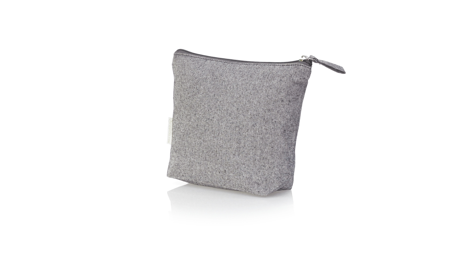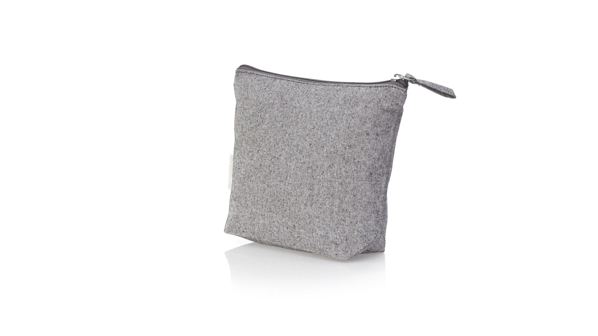 Kosmetiktasche aus kräftiger recycelter Baumwolle GRS 180g/m2. GRS-Zertifizierung (Global Recycled Standard), die die recycelte Herkunft des für die Herstellung des Produkts verwendeten Materials garantiert. Reissverschluss mit passendem Puller und Öko-Label an der Aussenseite.