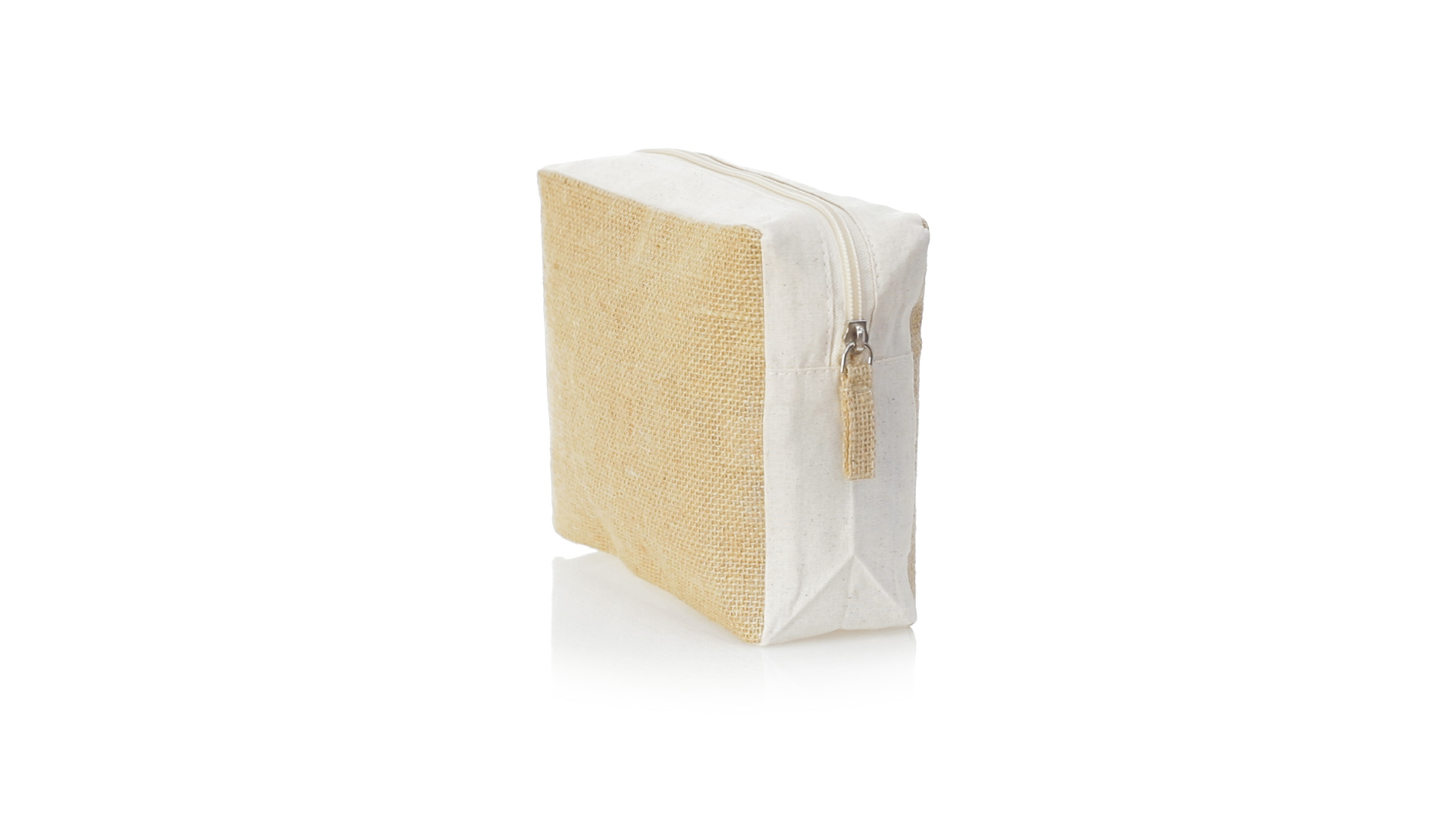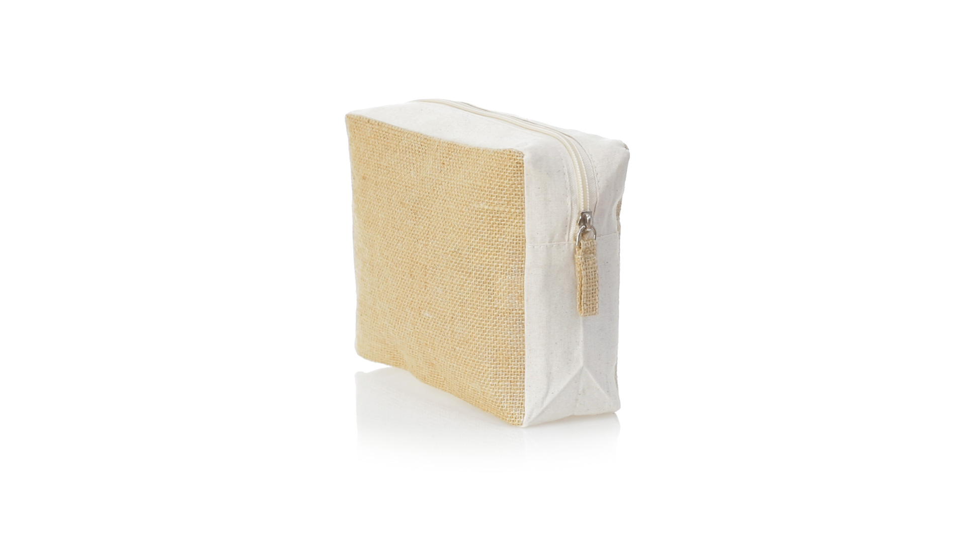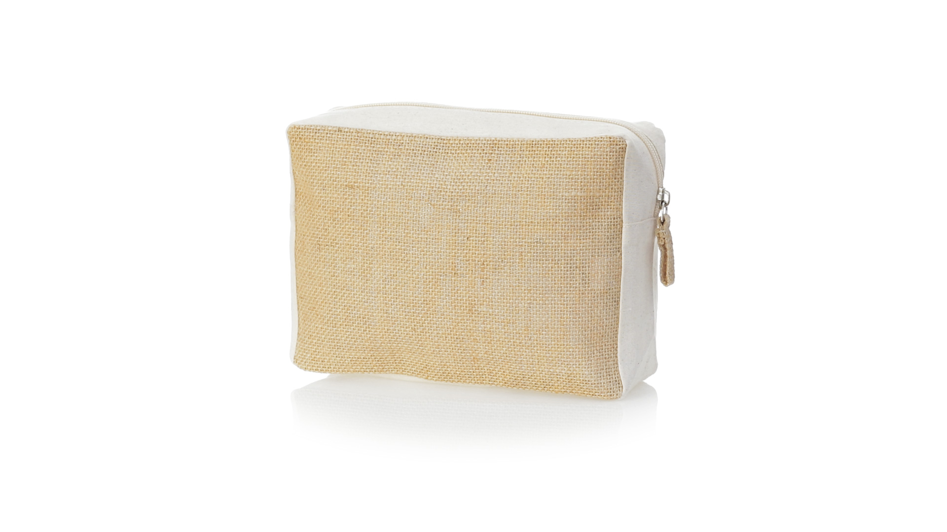 Nature Line Kosmetiktasche aus einer Kombination von laminierter Jute und natürlicher Baumwolle. Mit Reissverschluss und passendem Jutegriff.