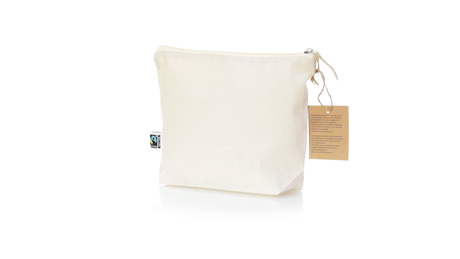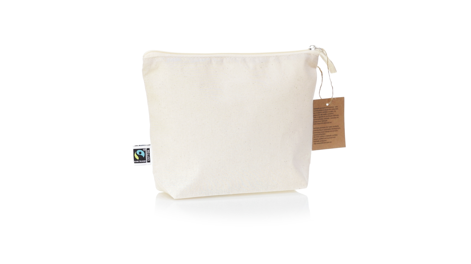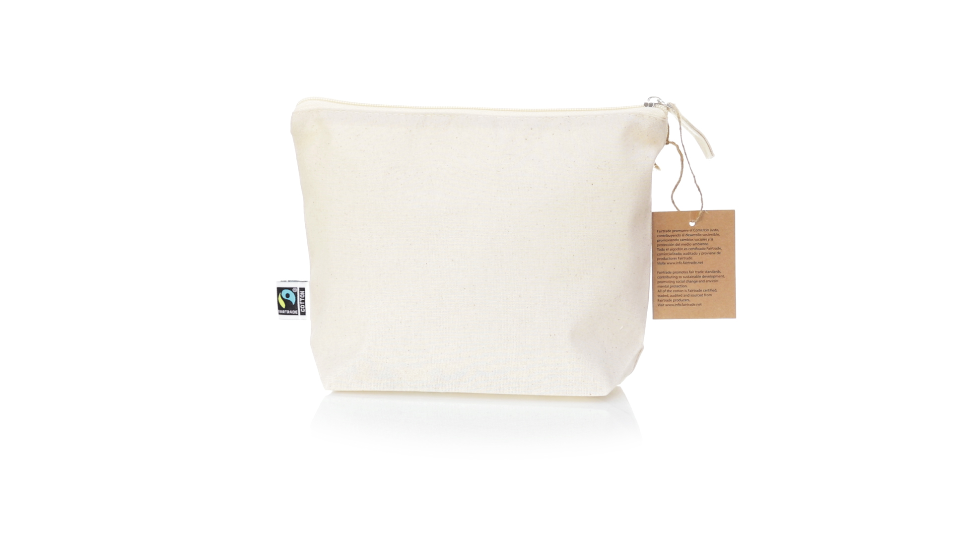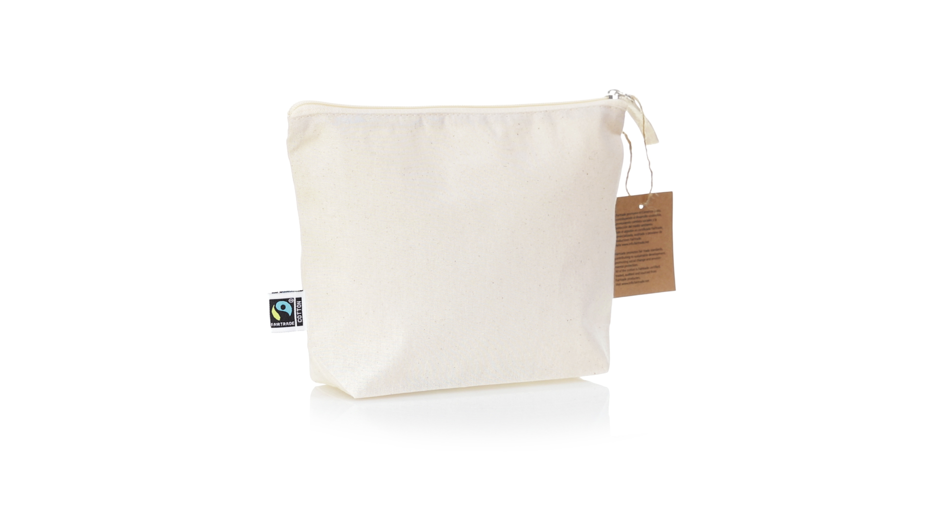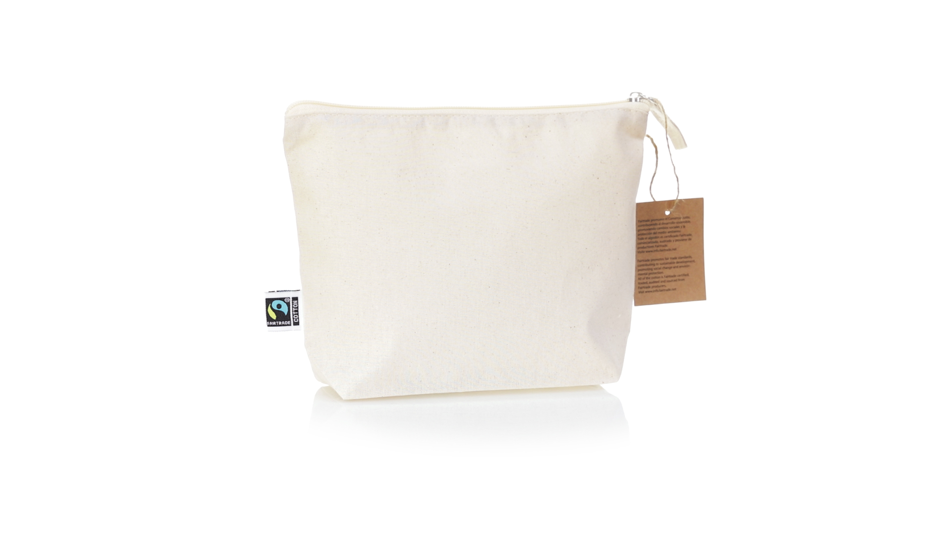 Linie "Natur" Kosmetiktasche hergestellt aus Baumwolle 180g/m2 in einem natürlichen Farbton. Mit Fairtrade-Zertifizierung, einer Alternative zum konventionellen Handelssystem, die die Entwicklung der Völker und den Kampf gegen die Armut verfolgt. Hauptfach mit Reissverschluss und passendem Abzieher, inklusive Fairtrade-Label und Anhänger aus recyceltem Karton.