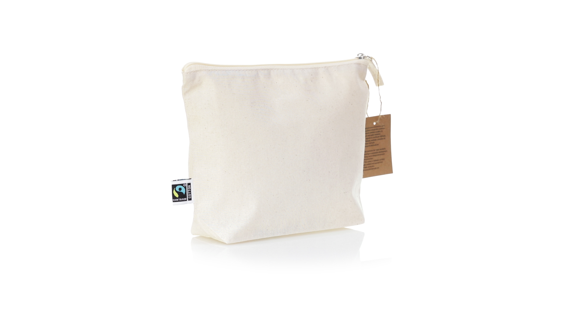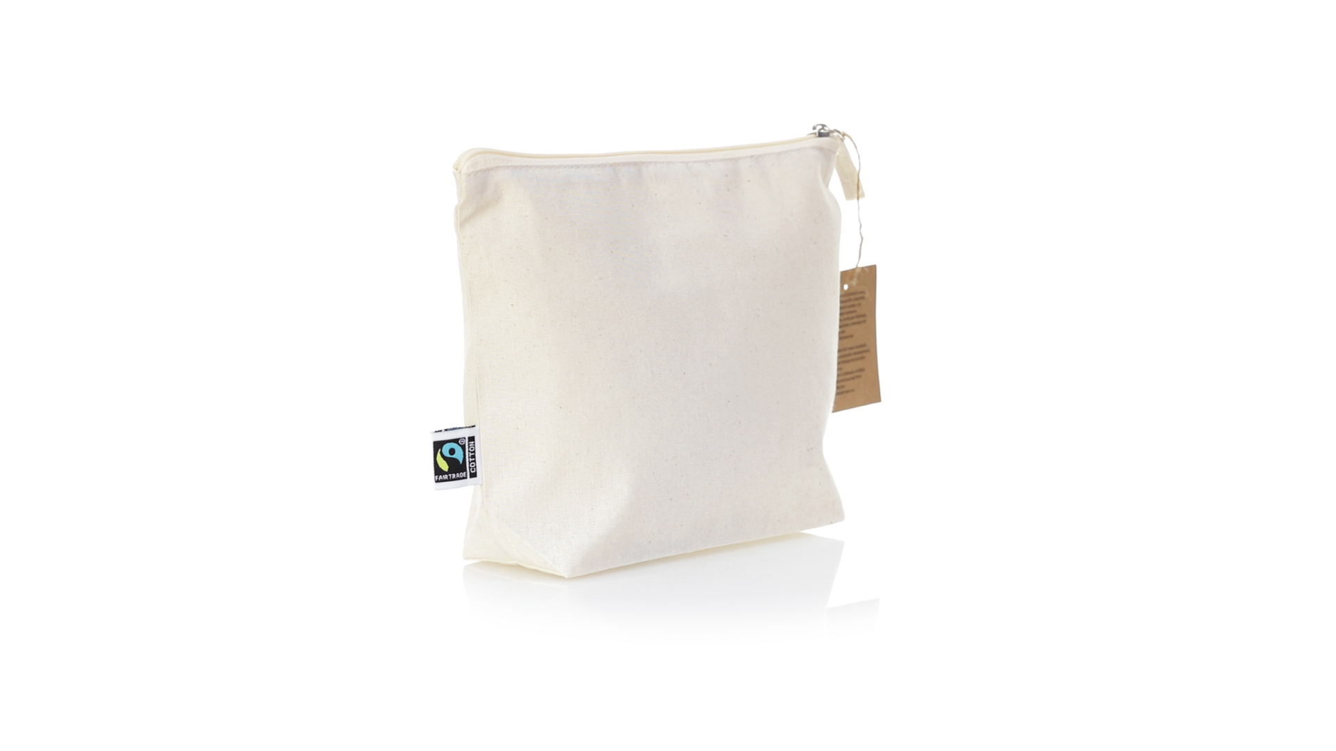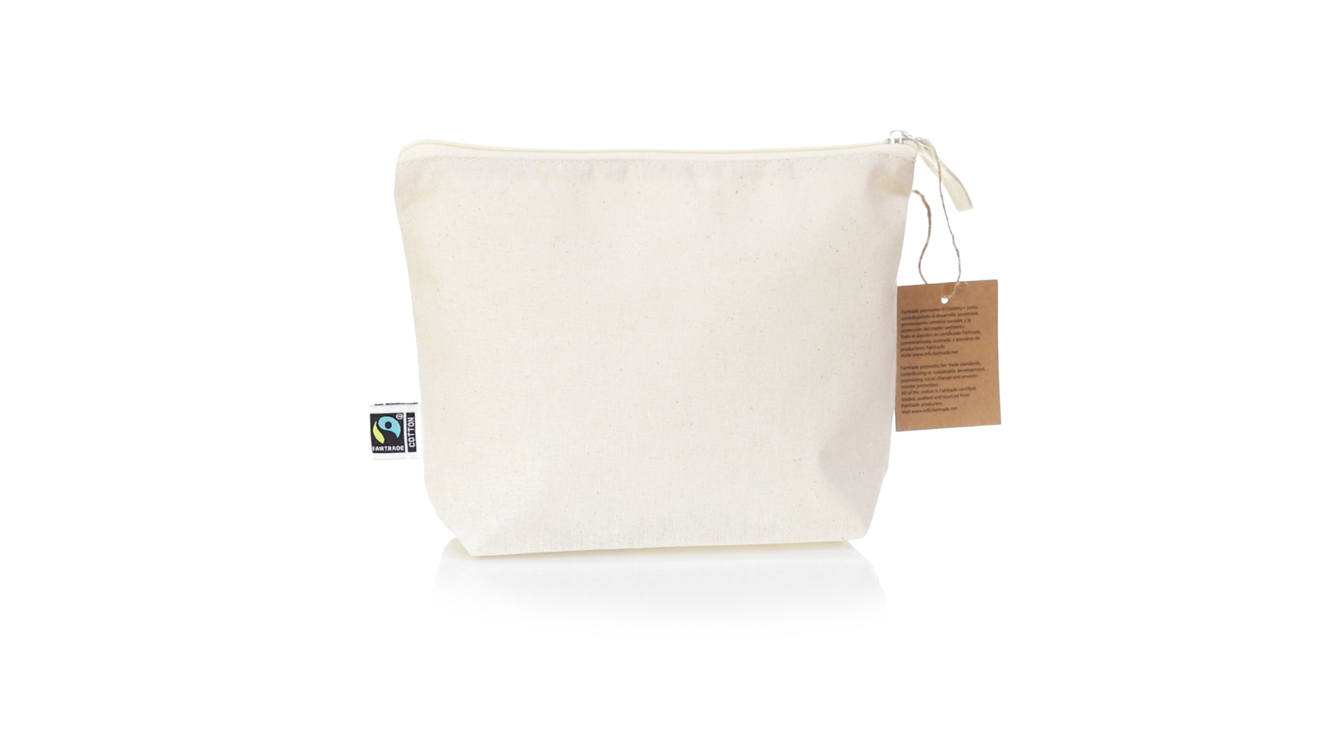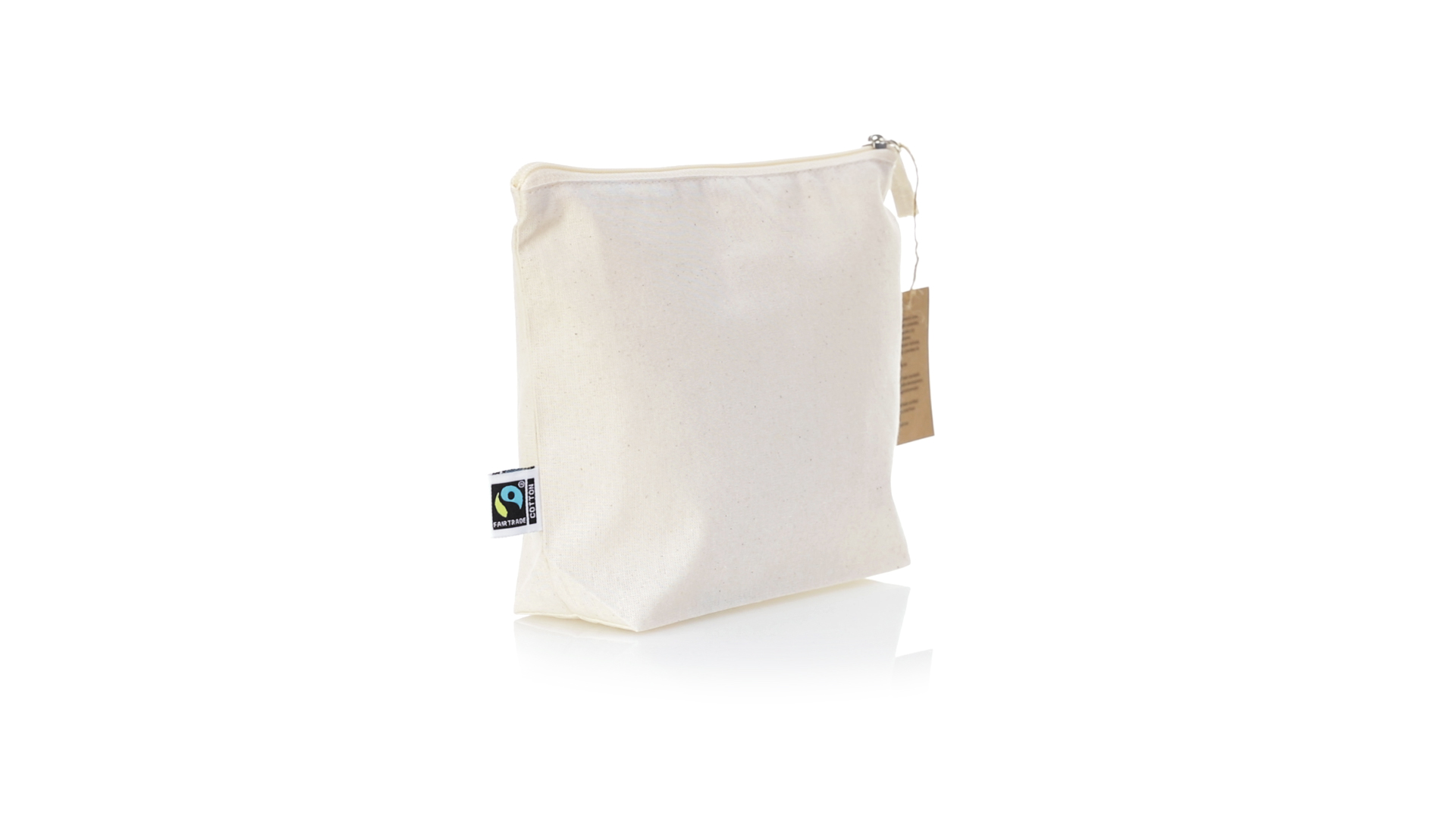 Linie "Natur" Kosmetiktasche hergestellt aus Baumwolle 180g/m2 in einem natürlichen Farbton. Mit Fairtrade-Zertifizierung, einer Alternative zum konventionellen Handelssystem, die die Entwicklung der Völker und den Kampf gegen die Armut verfolgt. Hauptfach mit Reissverschluss und passendem Abzieher, inklusive Fairtrade-Label und Anhänger aus recyceltem Karton.