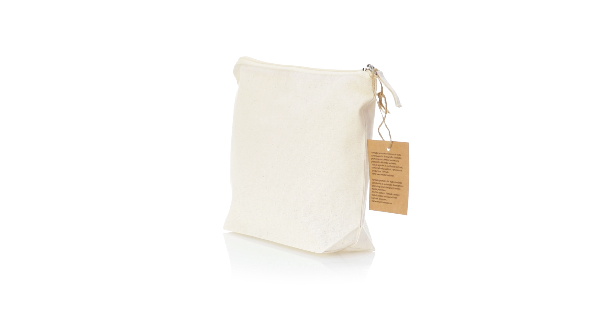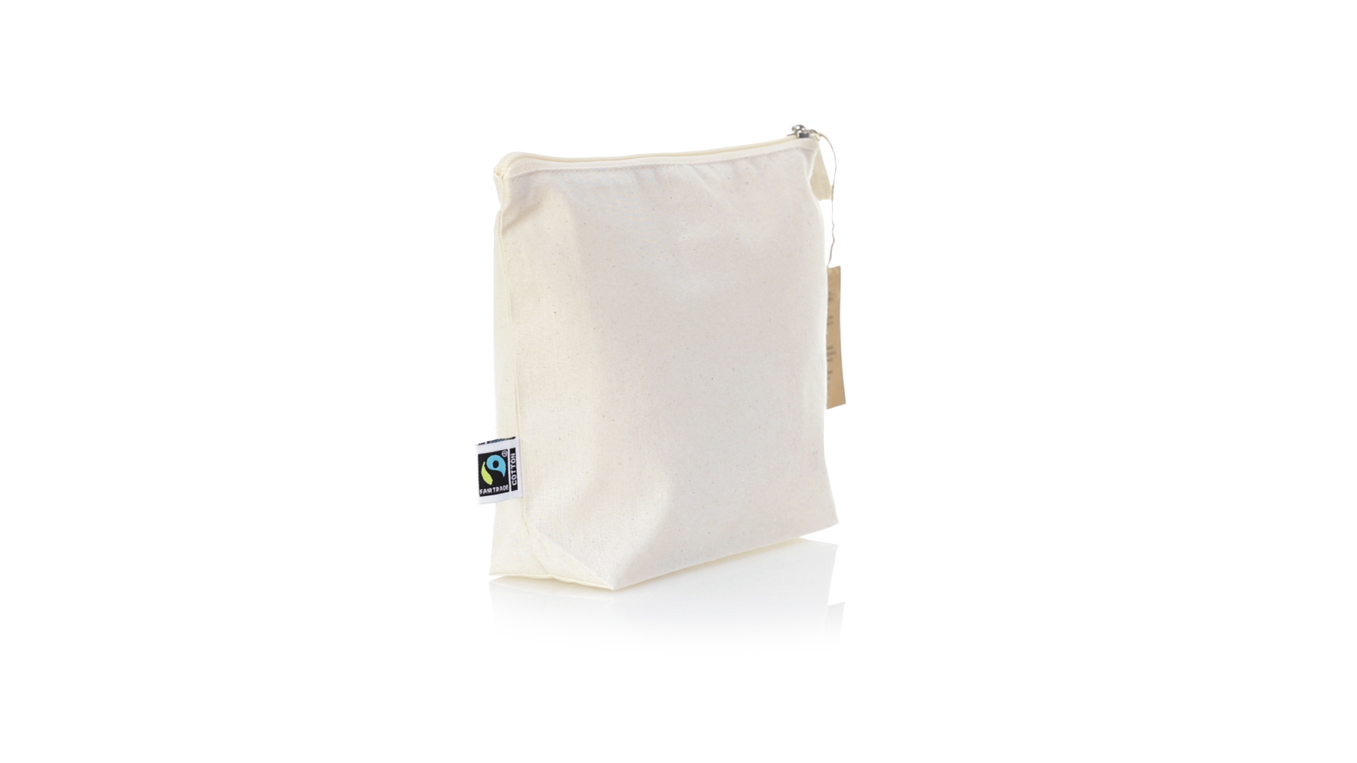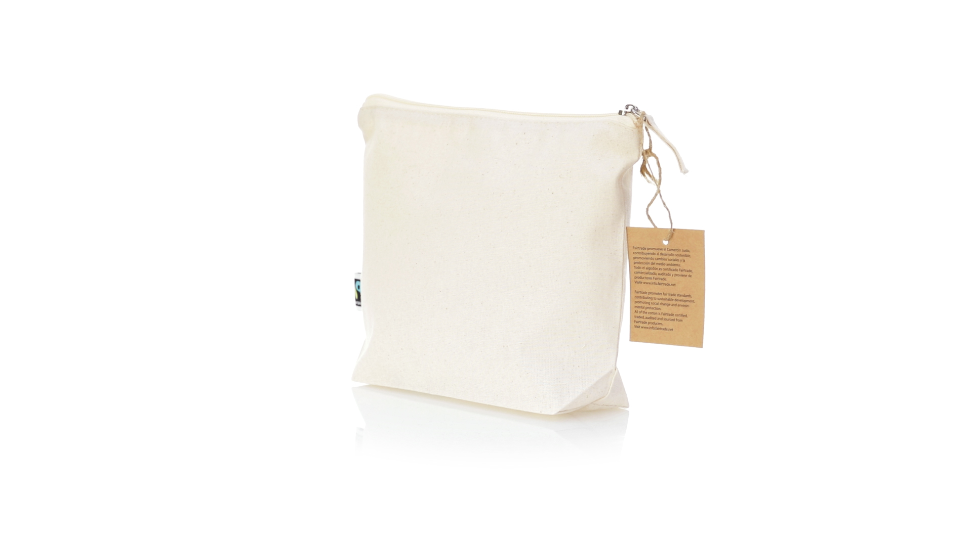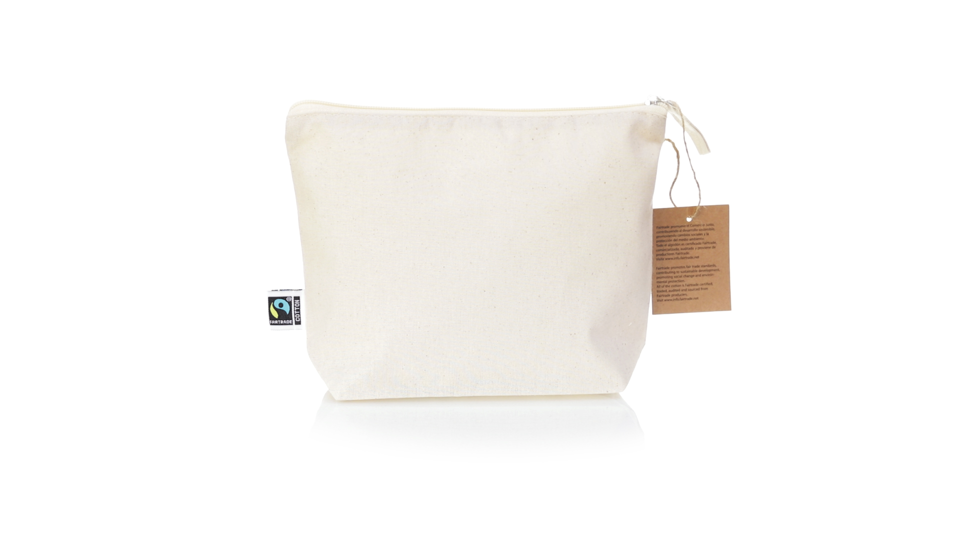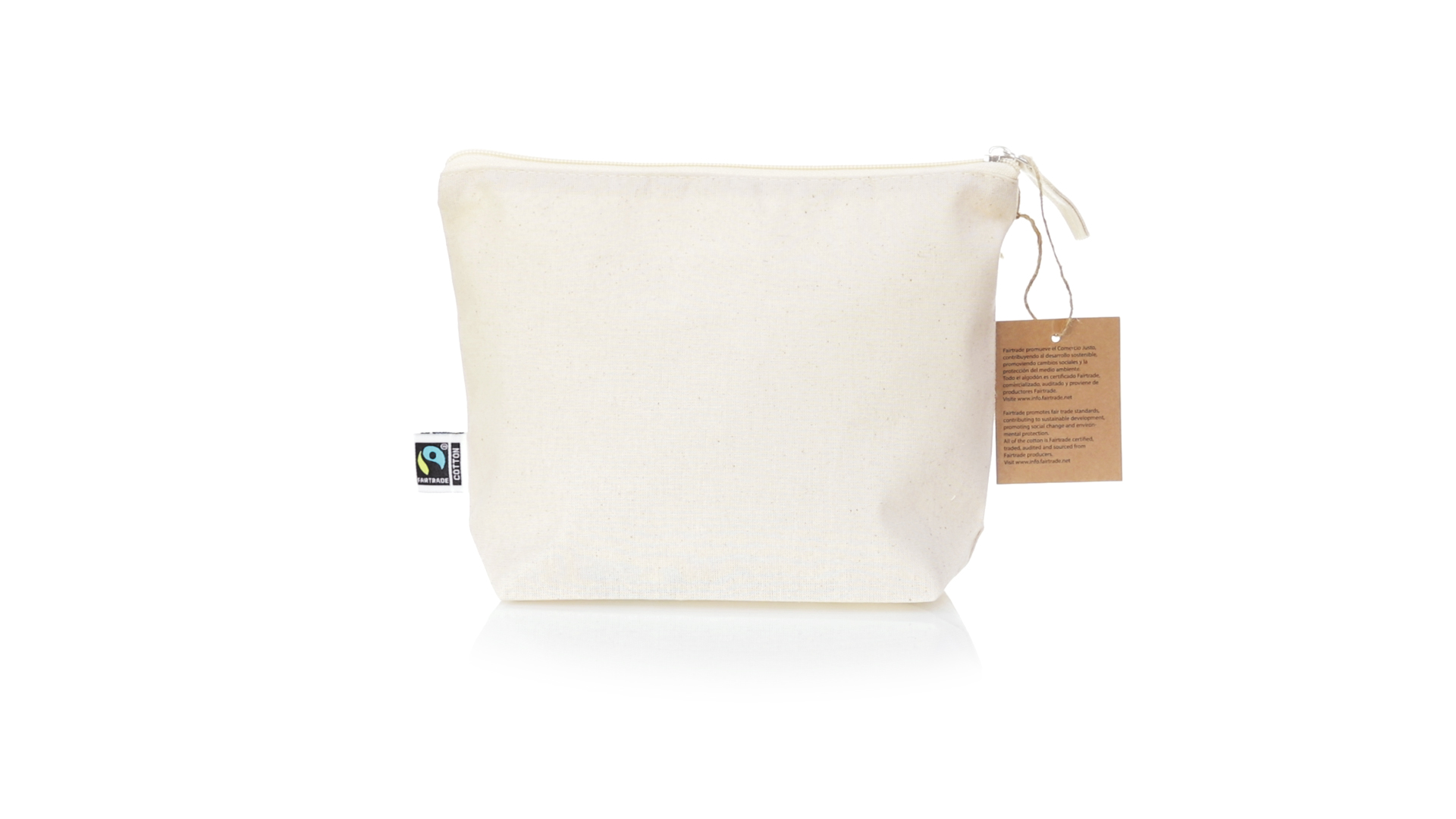Linie "Natur" Kosmetiktasche hergestellt aus Baumwolle 180g/m2 in einem natürlichen Farbton. Mit Fairtrade-Zertifizierung, einer Alternative zum konventionellen Handelssystem, die die Entwicklung der Völker und den Kampf gegen die Armut verfolgt. Hauptfach mit Reissverschluss und passendem Abzieher, inklusive Fairtrade-Label und Anhänger aus recyceltem Karton.