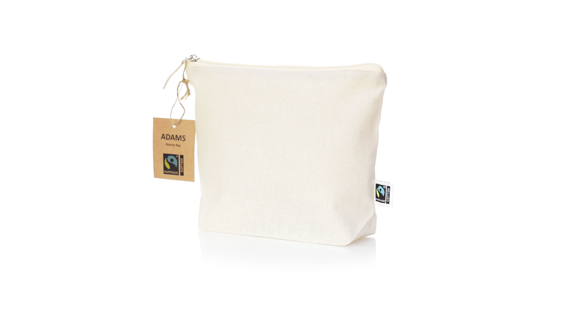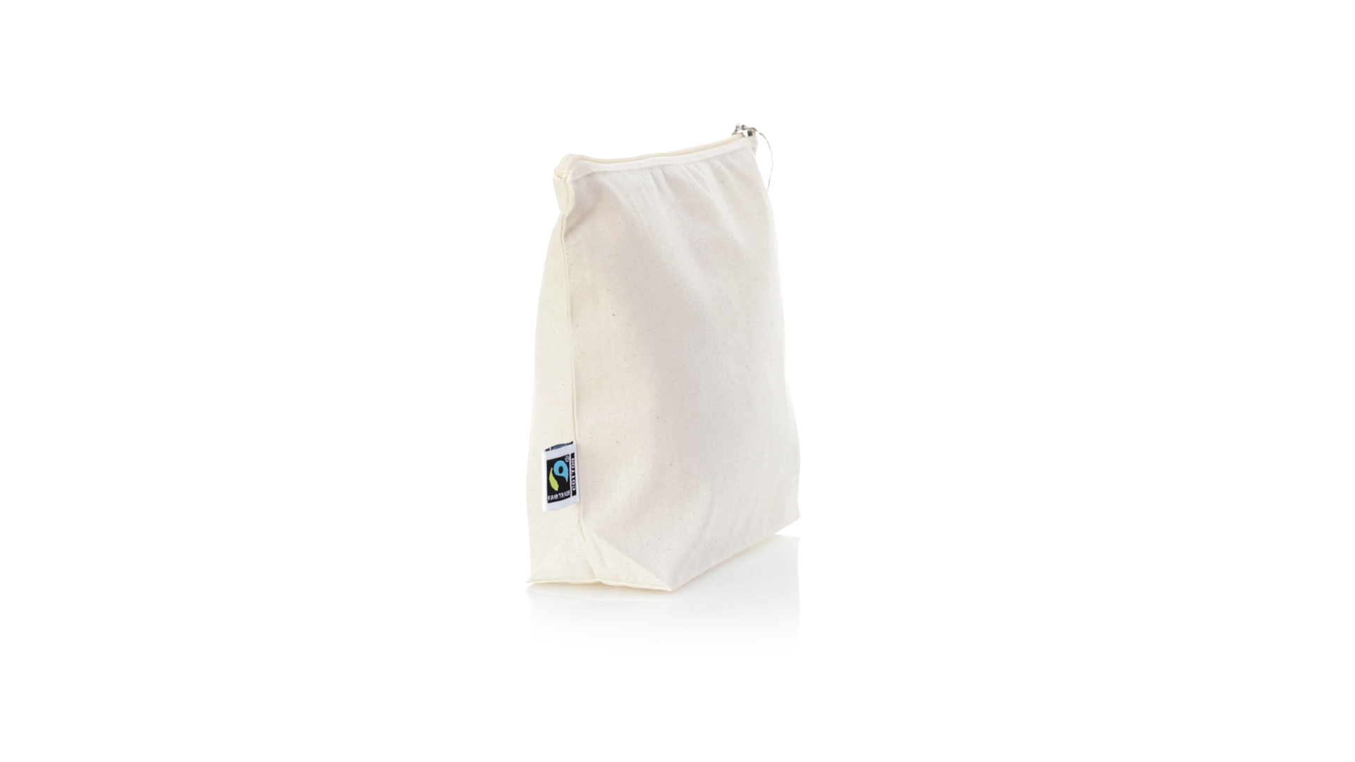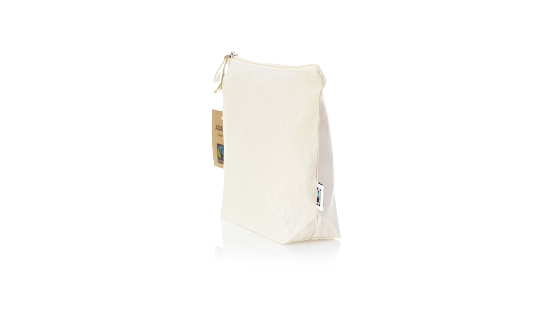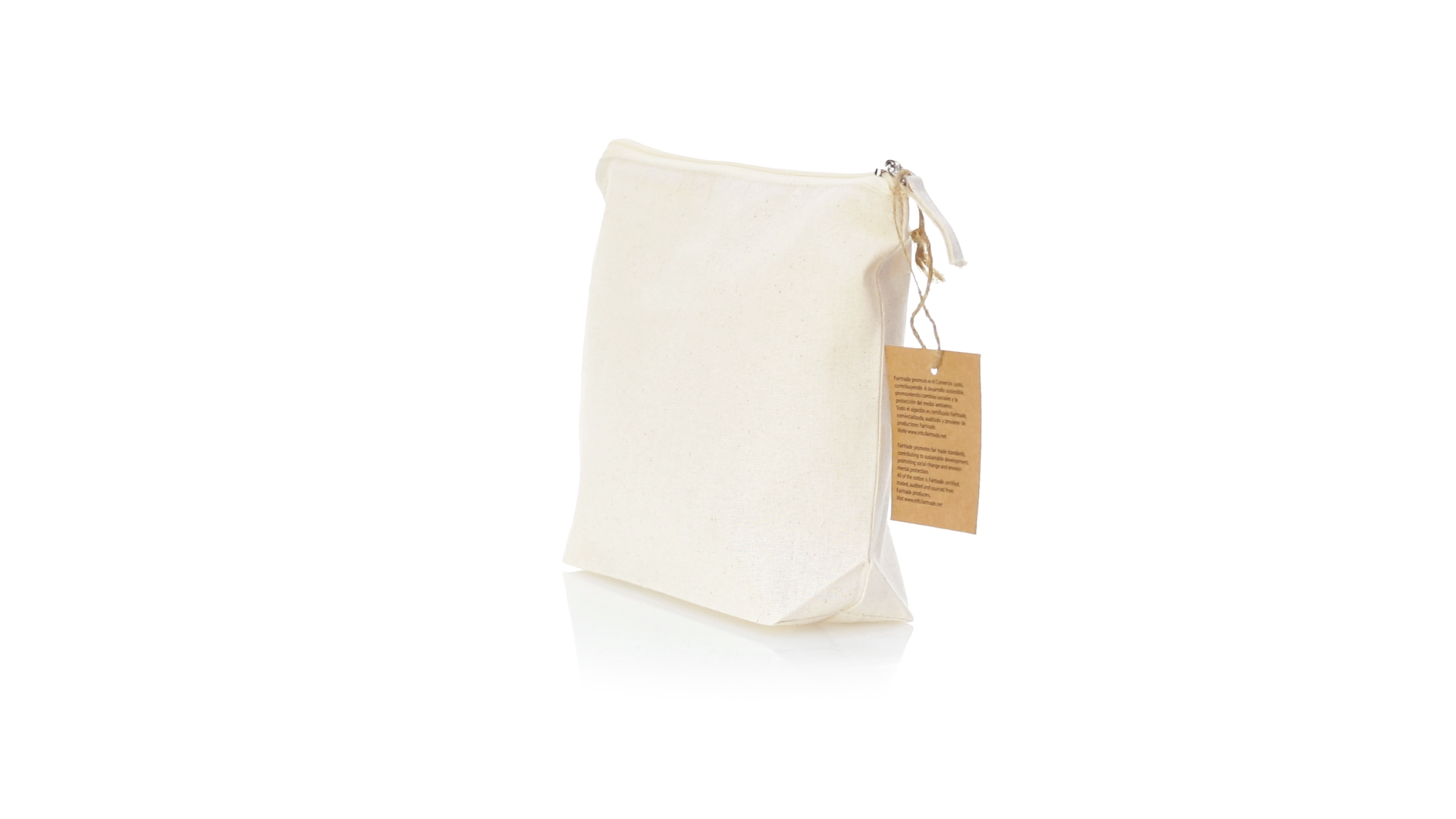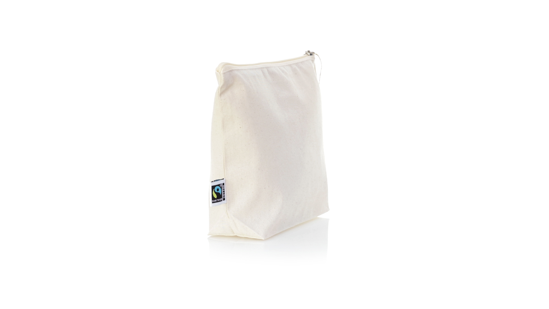 Linie "Natur" Kosmetiktasche hergestellt aus Baumwolle 180g/m2 in einem natürlichen Farbton. Mit Fairtrade-Zertifizierung, einer Alternative zum konventionellen Handelssystem, die die Entwicklung der Völker und den Kampf gegen die Armut verfolgt. Hauptfach mit Reissverschluss und passendem Abzieher, inklusive Fairtrade-Label und Anhänger aus recyceltem Karton.