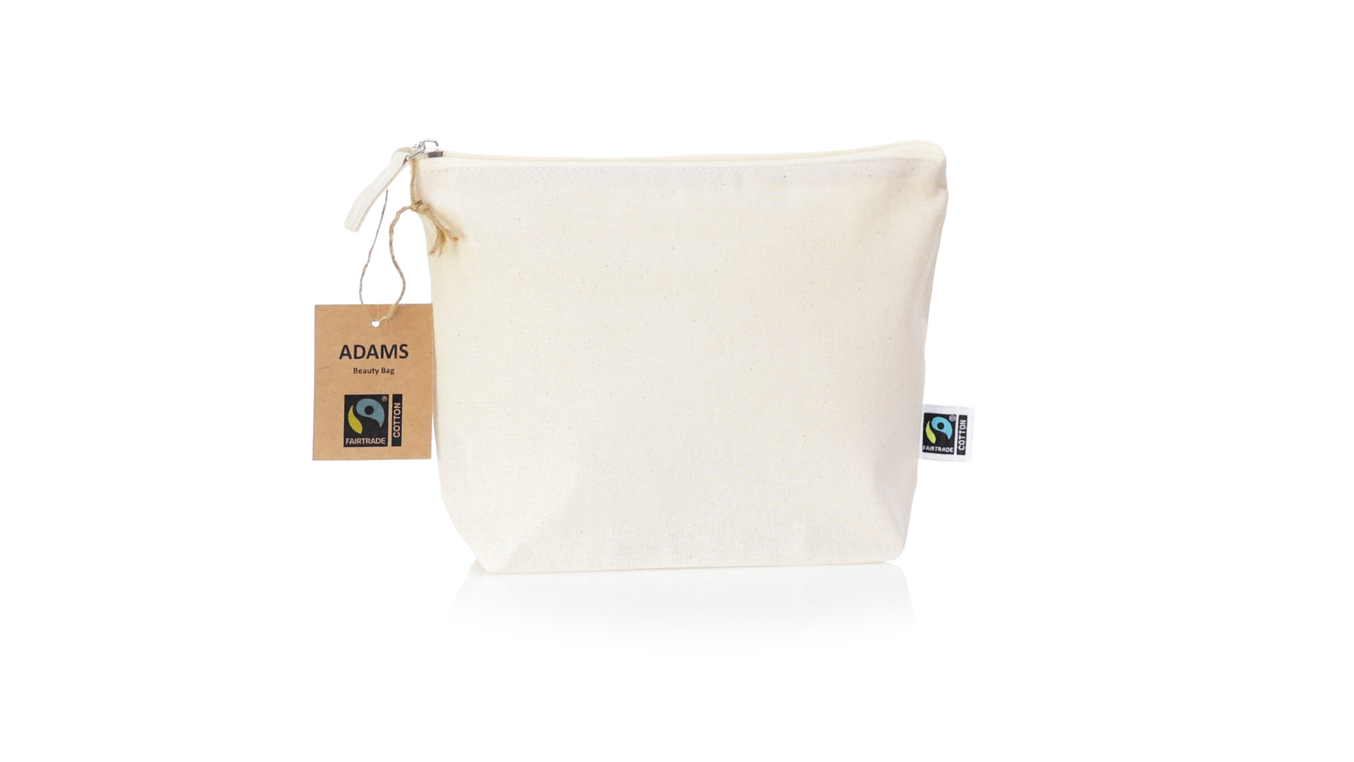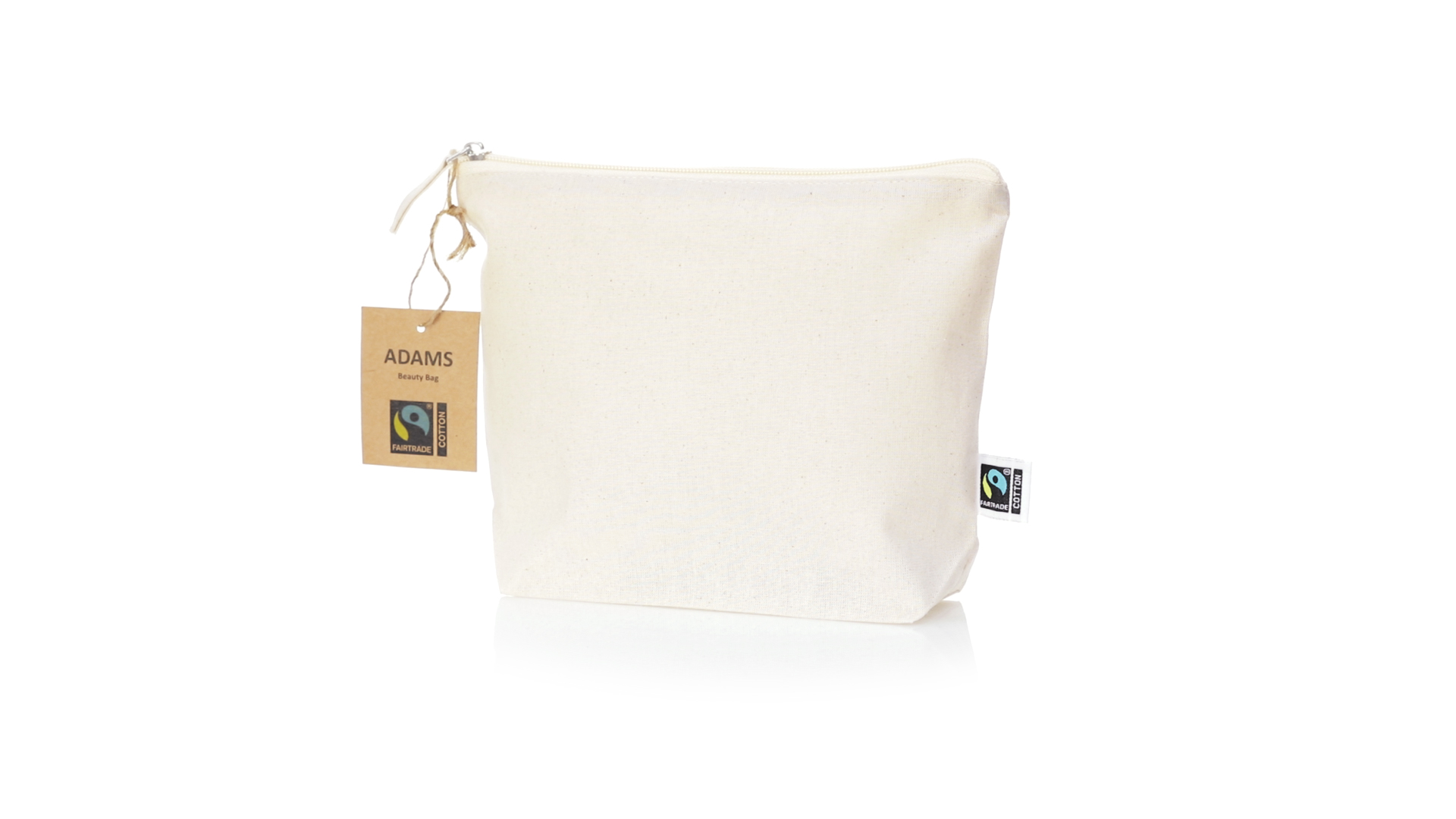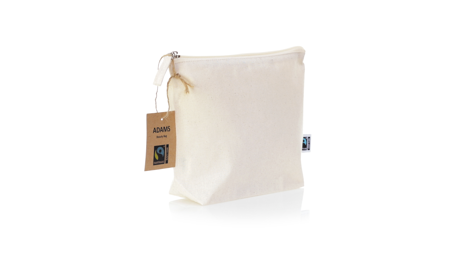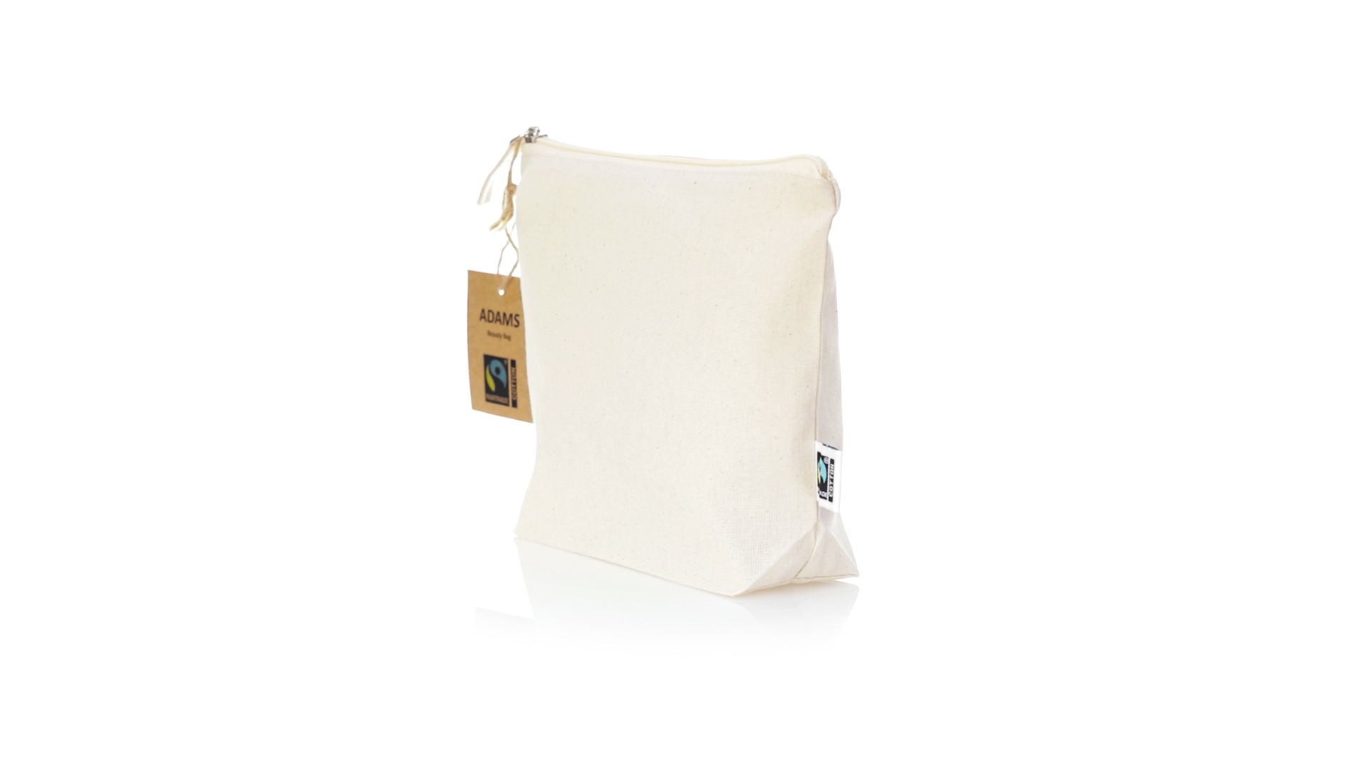 Linie "Natur" Kosmetiktasche hergestellt aus Baumwolle 180g/m2 in einem natürlichen Farbton. Mit Fairtrade-Zertifizierung, einer Alternative zum konventionellen Handelssystem, die die Entwicklung der Völker und den Kampf gegen die Armut verfolgt. Hauptfach mit Reissverschluss und passendem Abzieher, inklusive Fairtrade-Label und Anhänger aus recyceltem Karton.
