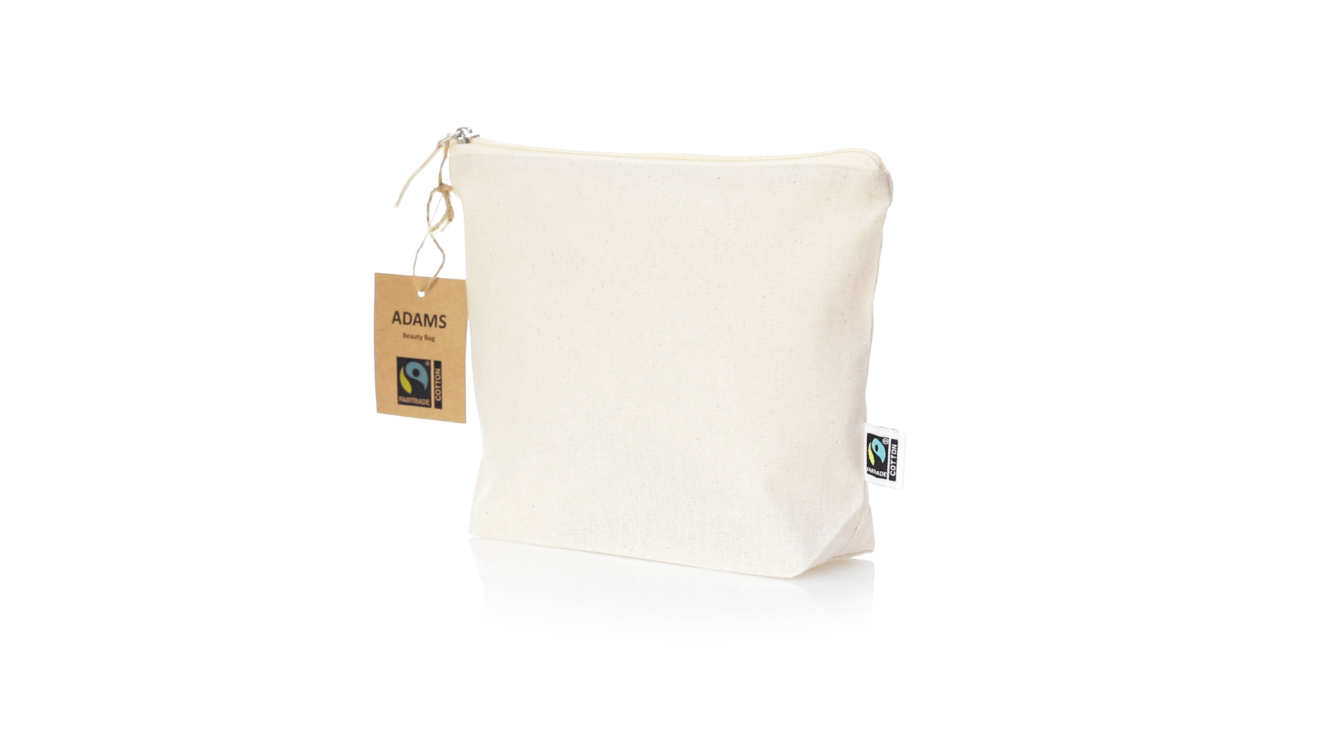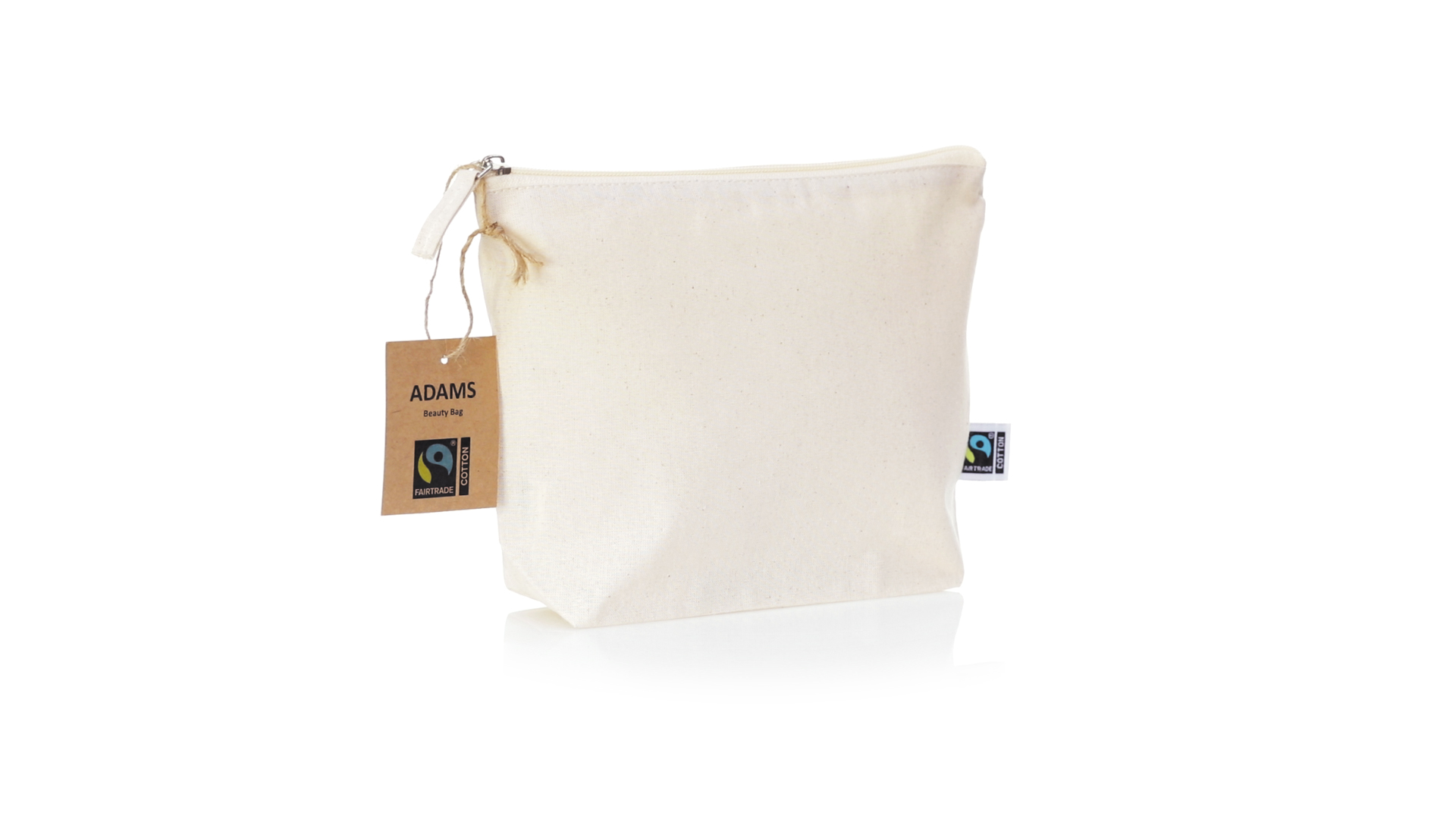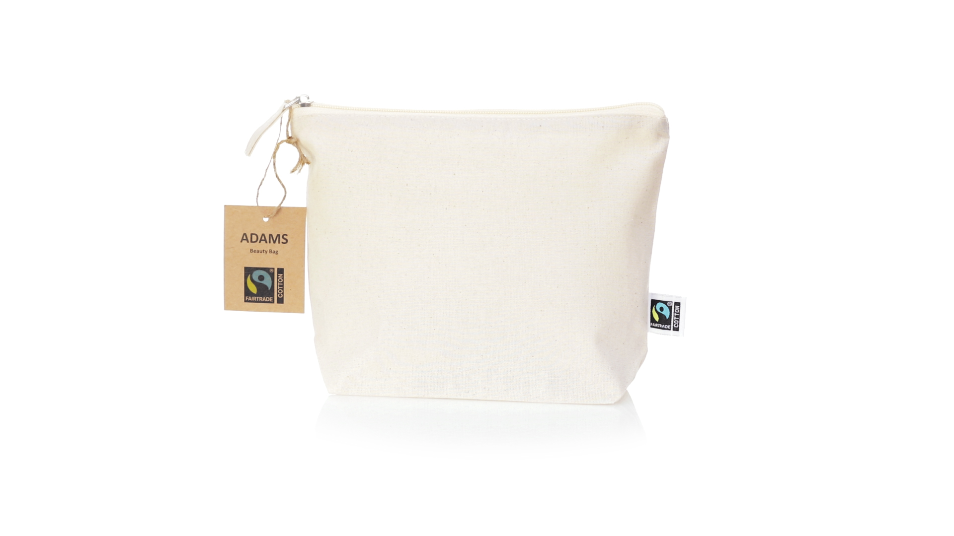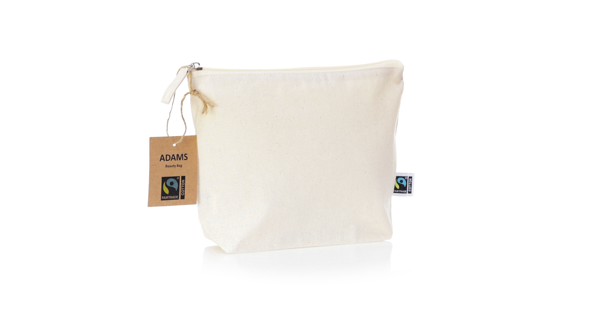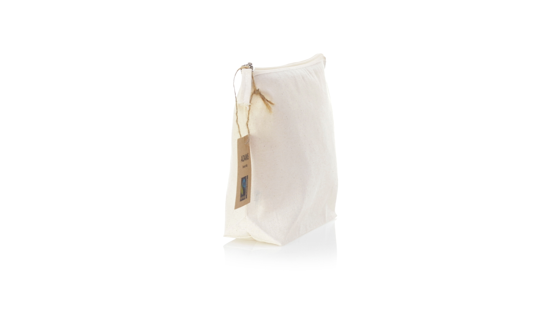Linie "Natur" Kosmetiktasche hergestellt aus Baumwolle 180g/m2 in einem natürlichen Farbton. Mit Fairtrade-Zertifizierung, einer Alternative zum konventionellen Handelssystem, die die Entwicklung der Völker und den Kampf gegen die Armut verfolgt. Hauptfach mit Reissverschluss und passendem Abzieher, inklusive Fairtrade-Label und Anhänger aus recyceltem Karton.