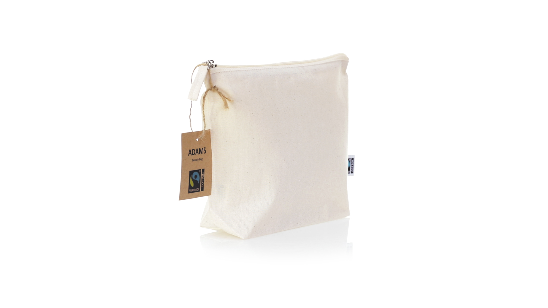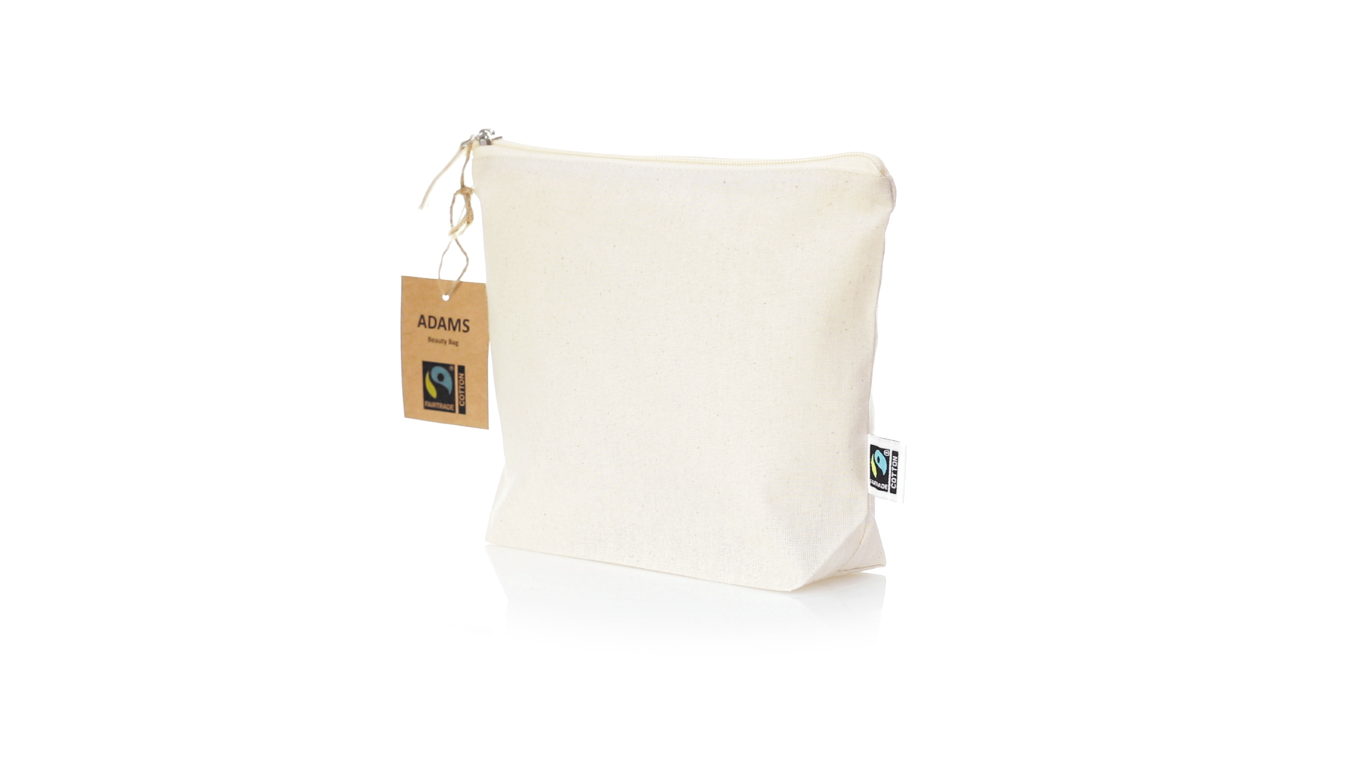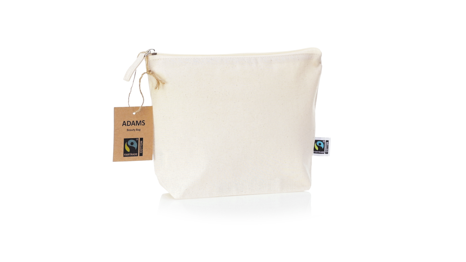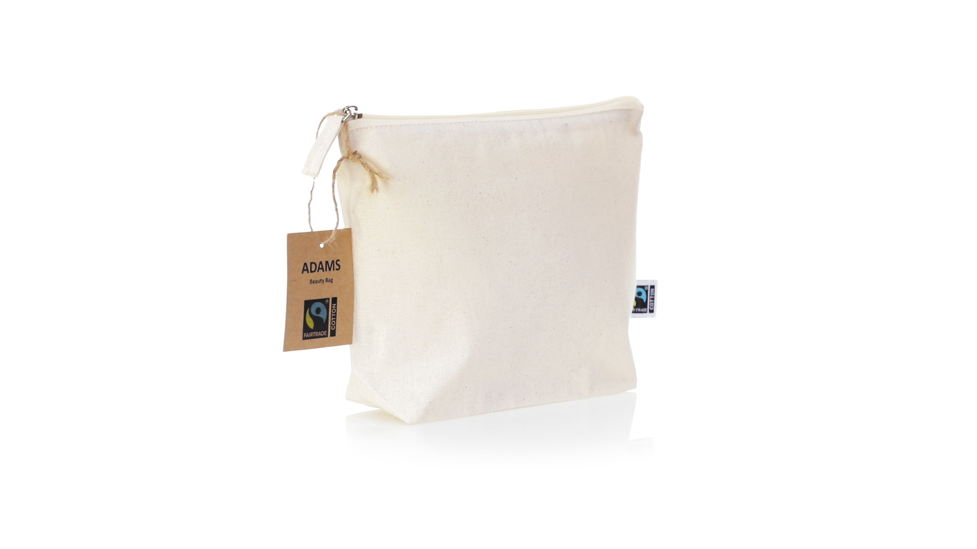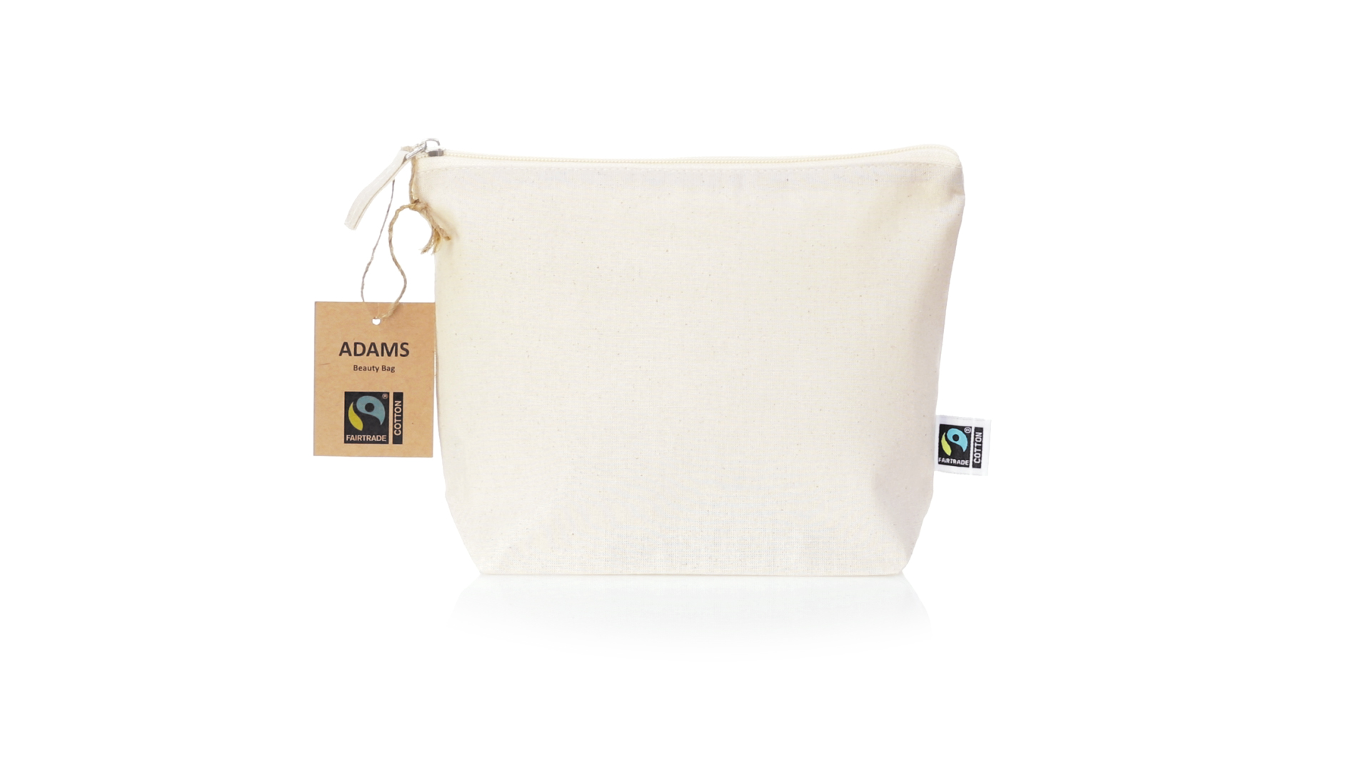 Linie "Natur" Kosmetiktasche hergestellt aus Baumwolle 180g/m2 in einem natürlichen Farbton. Mit Fairtrade-Zertifizierung, einer Alternative zum konventionellen Handelssystem, die die Entwicklung der Völker und den Kampf gegen die Armut verfolgt. Hauptfach mit Reissverschluss und passendem Abzieher, inklusive Fairtrade-Label und Anhänger aus recyceltem Karton.
