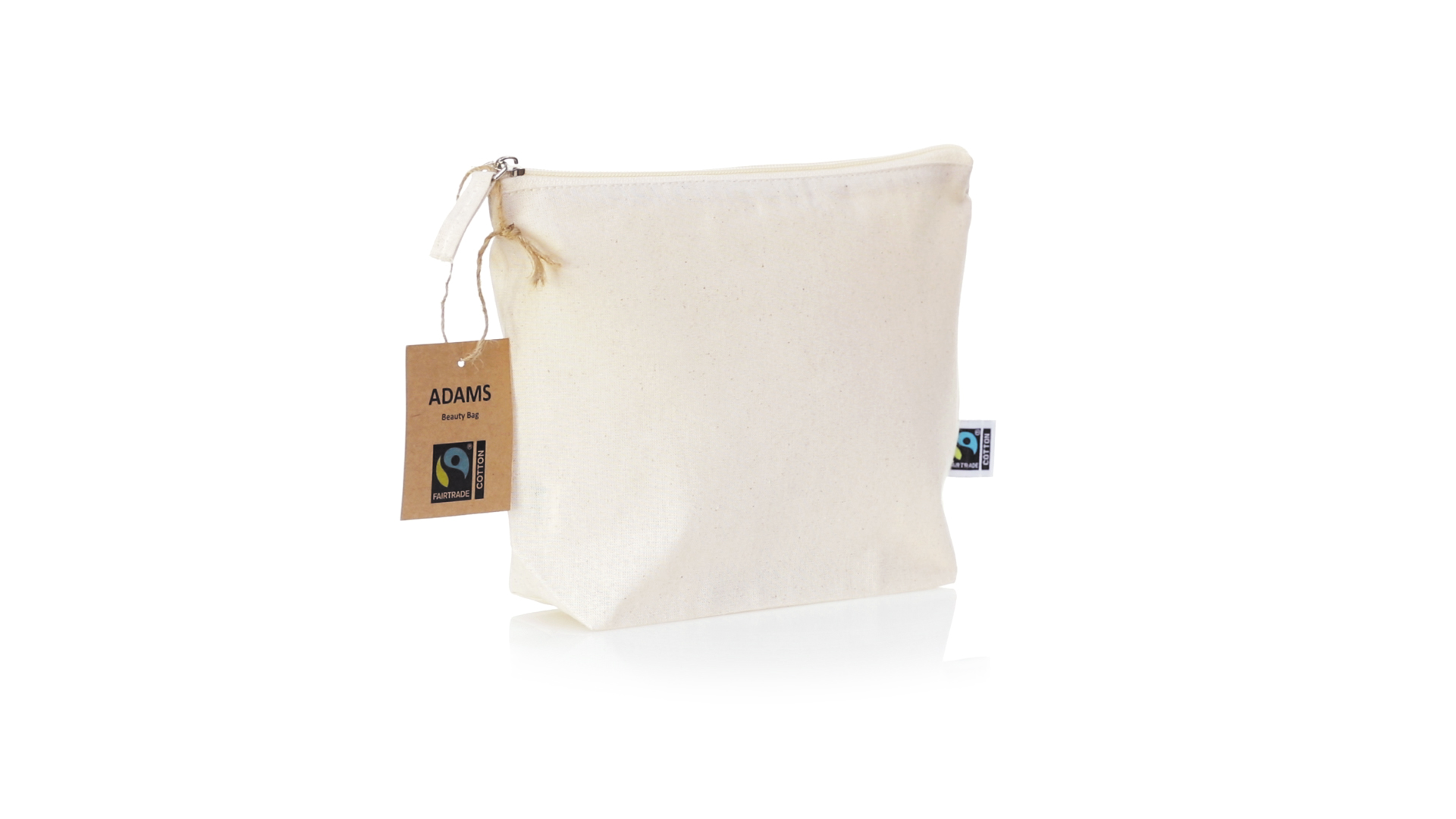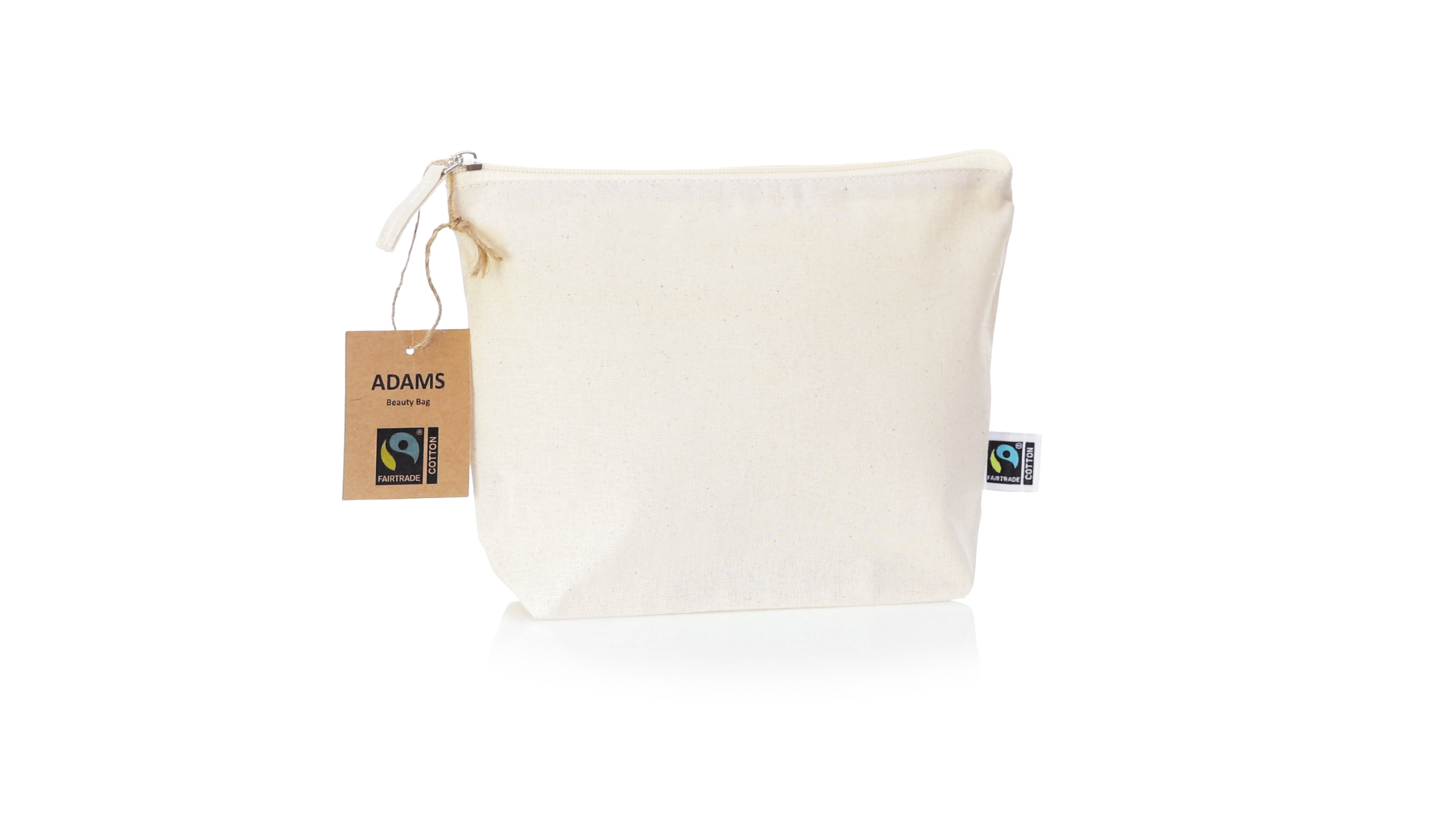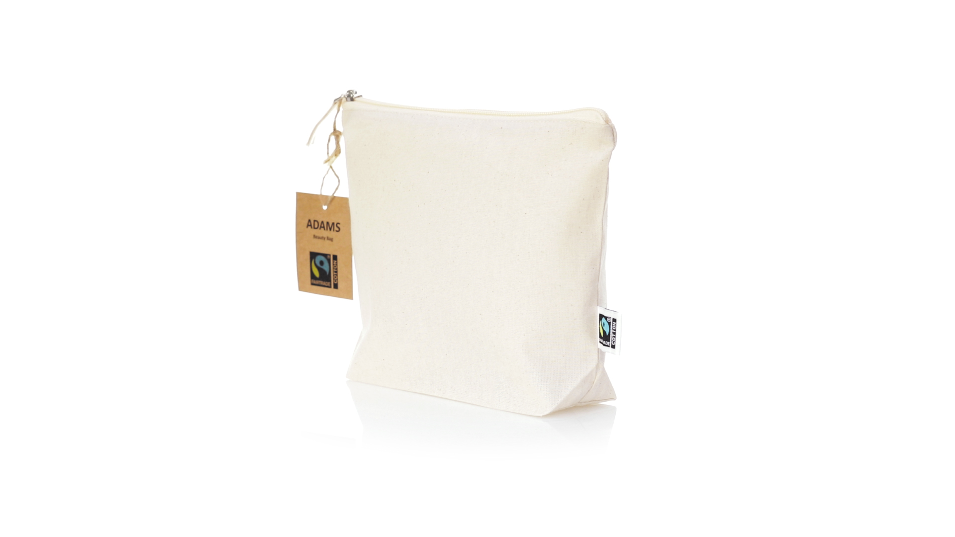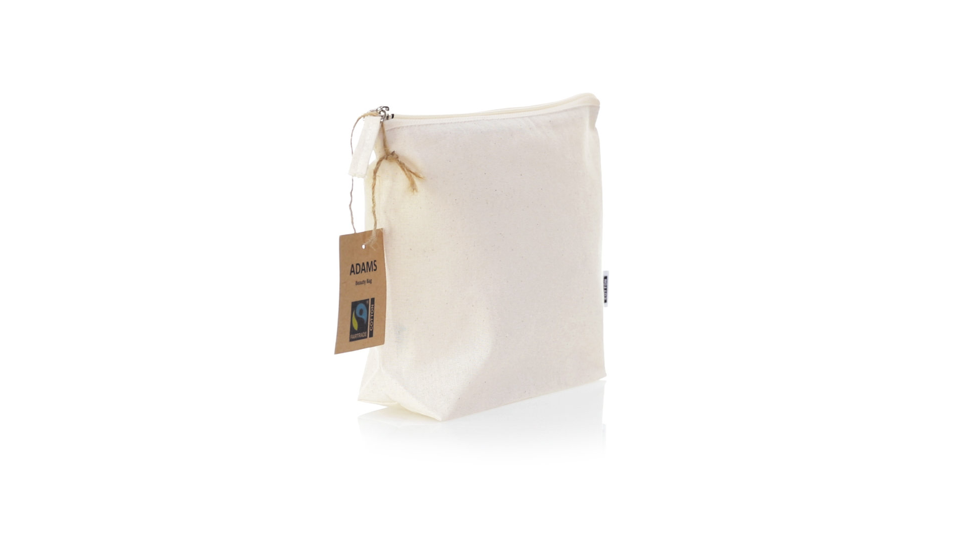 Linie "Natur" Kosmetiktasche hergestellt aus Baumwolle 180g/m2 in einem natürlichen Farbton. Mit Fairtrade-Zertifizierung, einer Alternative zum konventionellen Handelssystem, die die Entwicklung der Völker und den Kampf gegen die Armut verfolgt. Hauptfach mit Reissverschluss und passendem Abzieher, inklusive Fairtrade-Label und Anhänger aus recyceltem Karton.