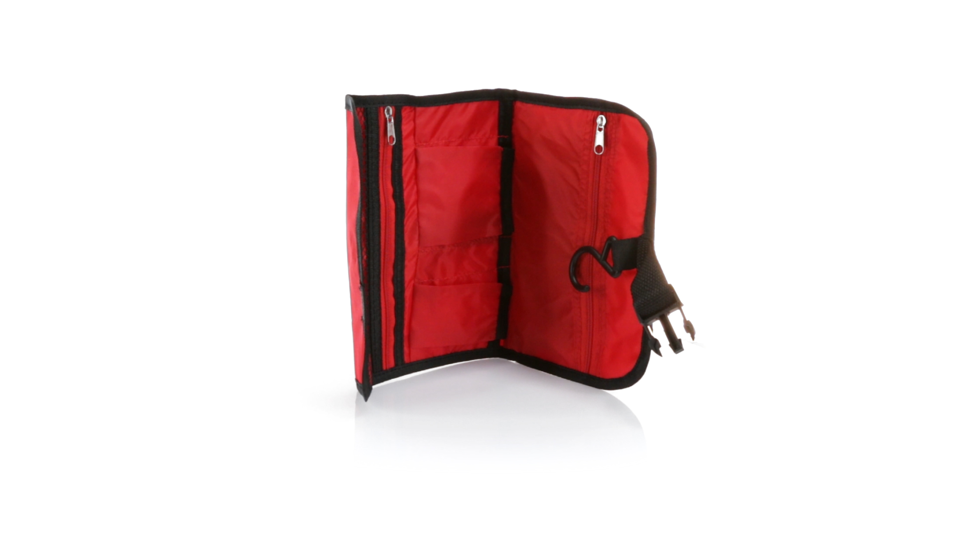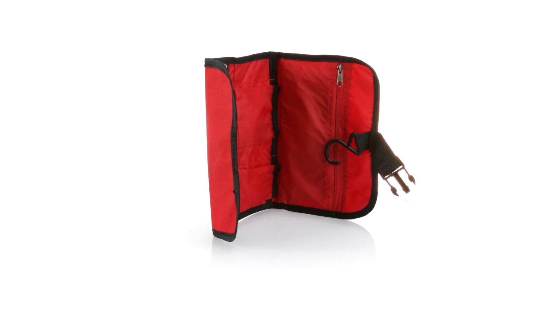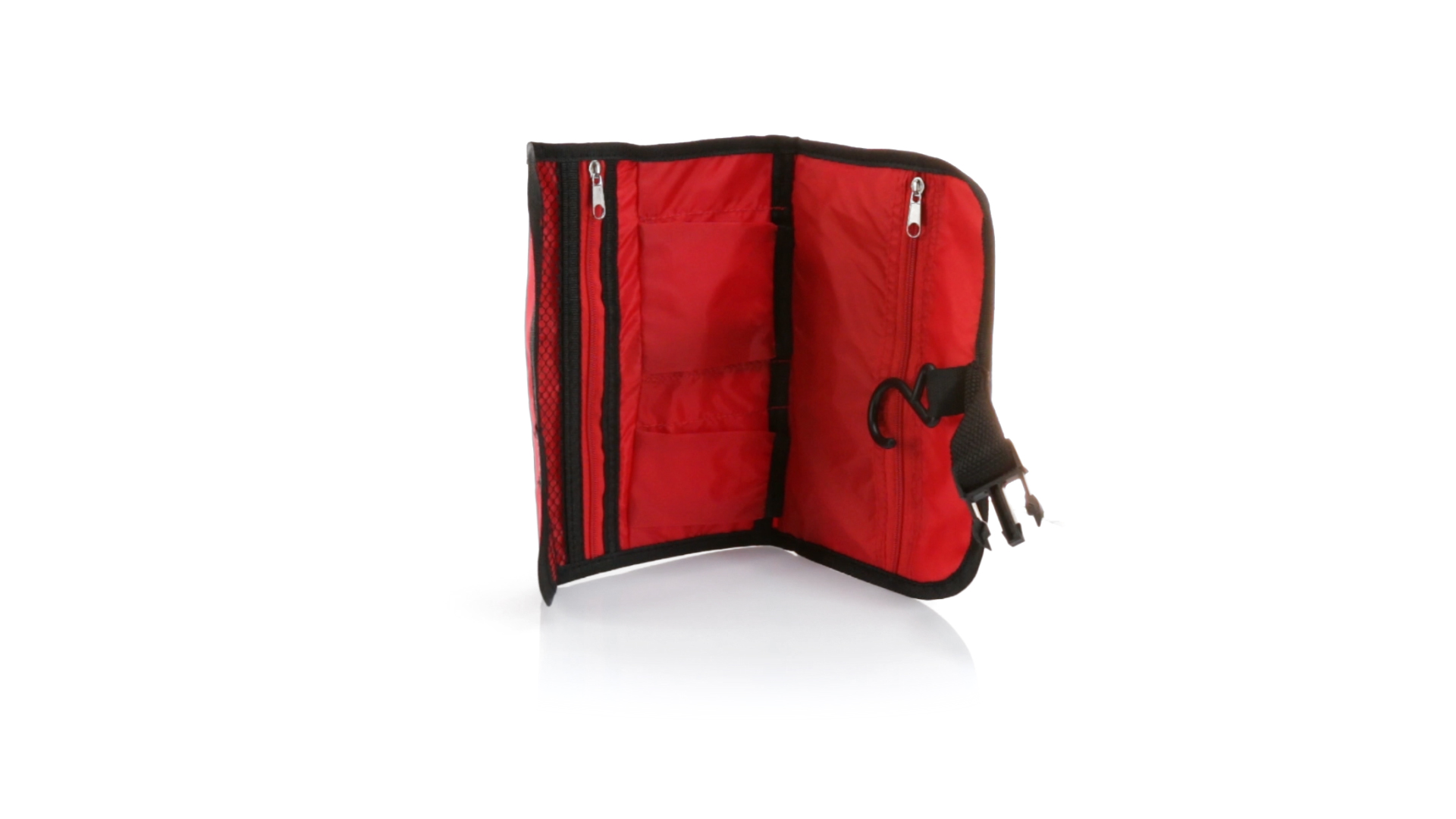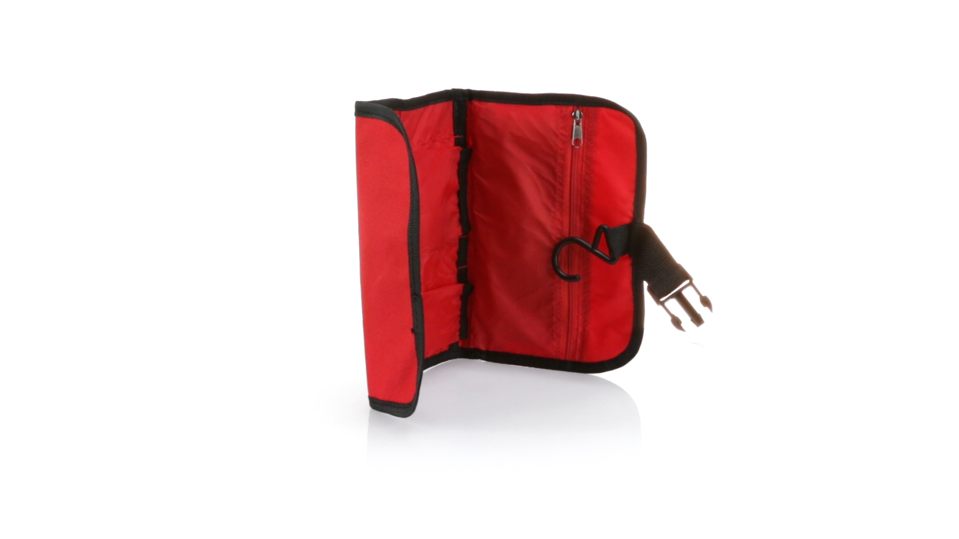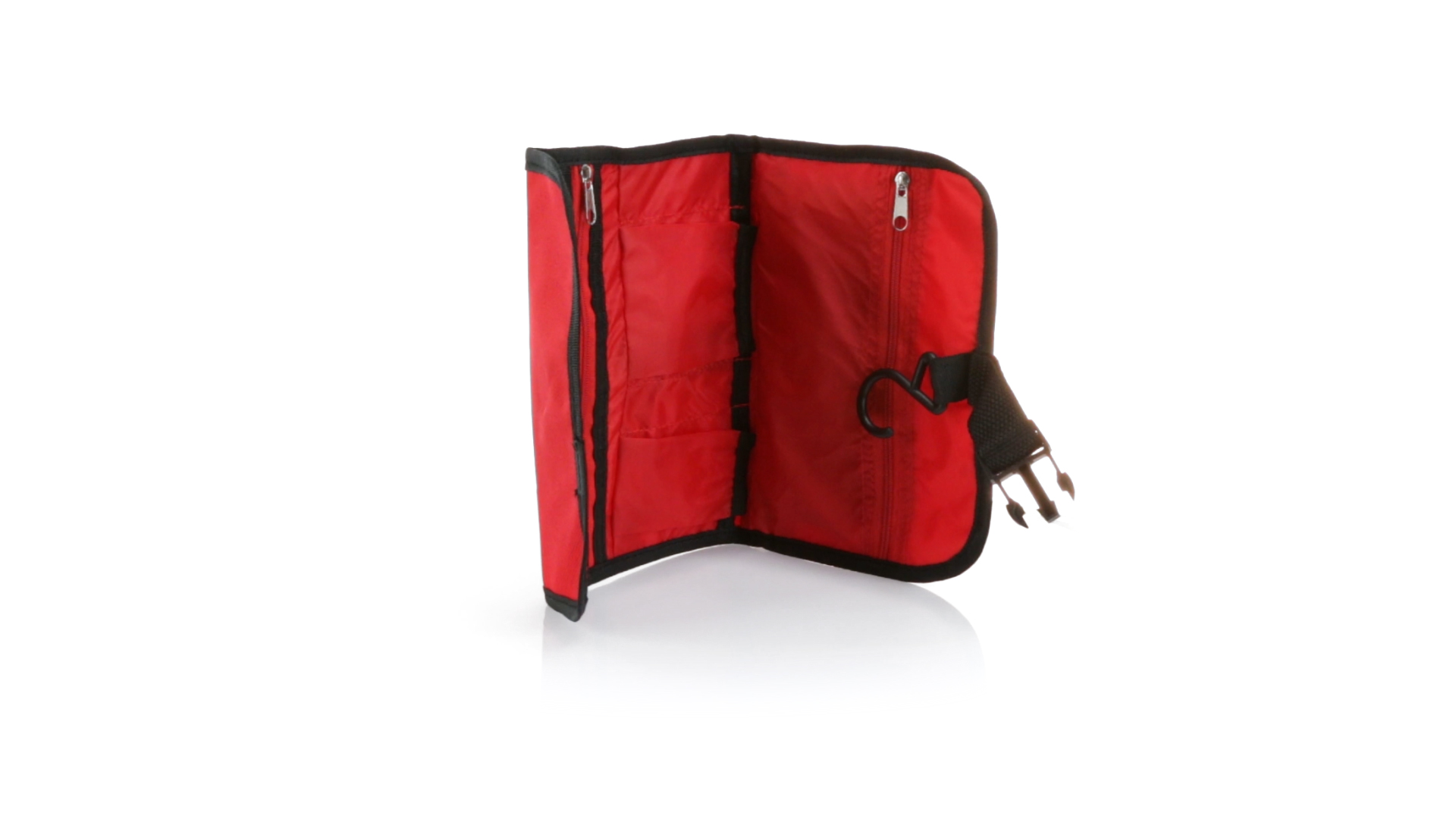 Praktischer Kulturbeutel mit Haken zum Aufhängen aus strapazierfähigem 600D Polyester in kräftigen Farben mit schwarzer Paspel. Aussentasche mit Reissverschluss und verstellbarem Riemen mit Klickverschluss. Weiches Polyester-Innenfutter mit verschiedenen Taschen und Netzfach.