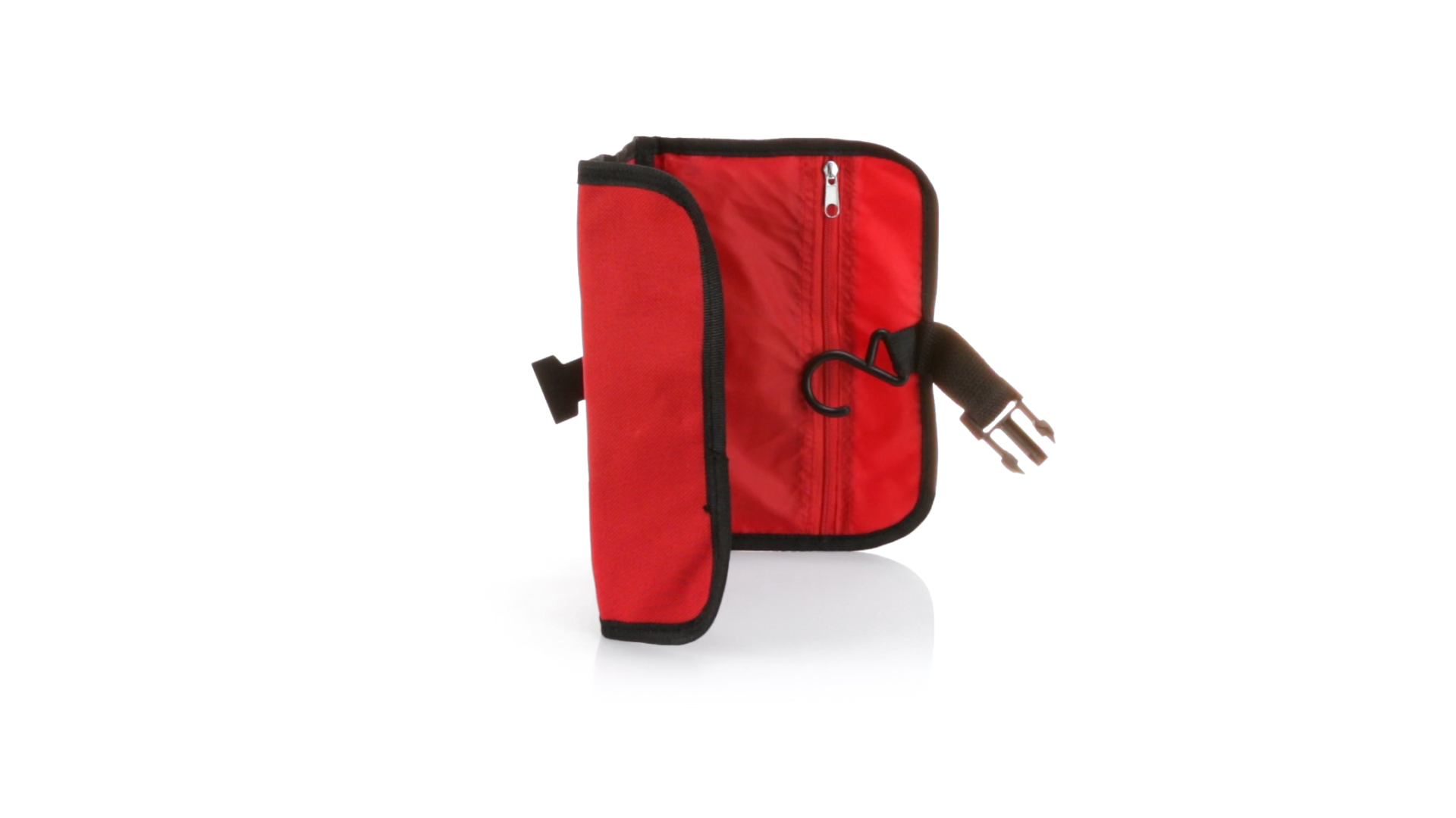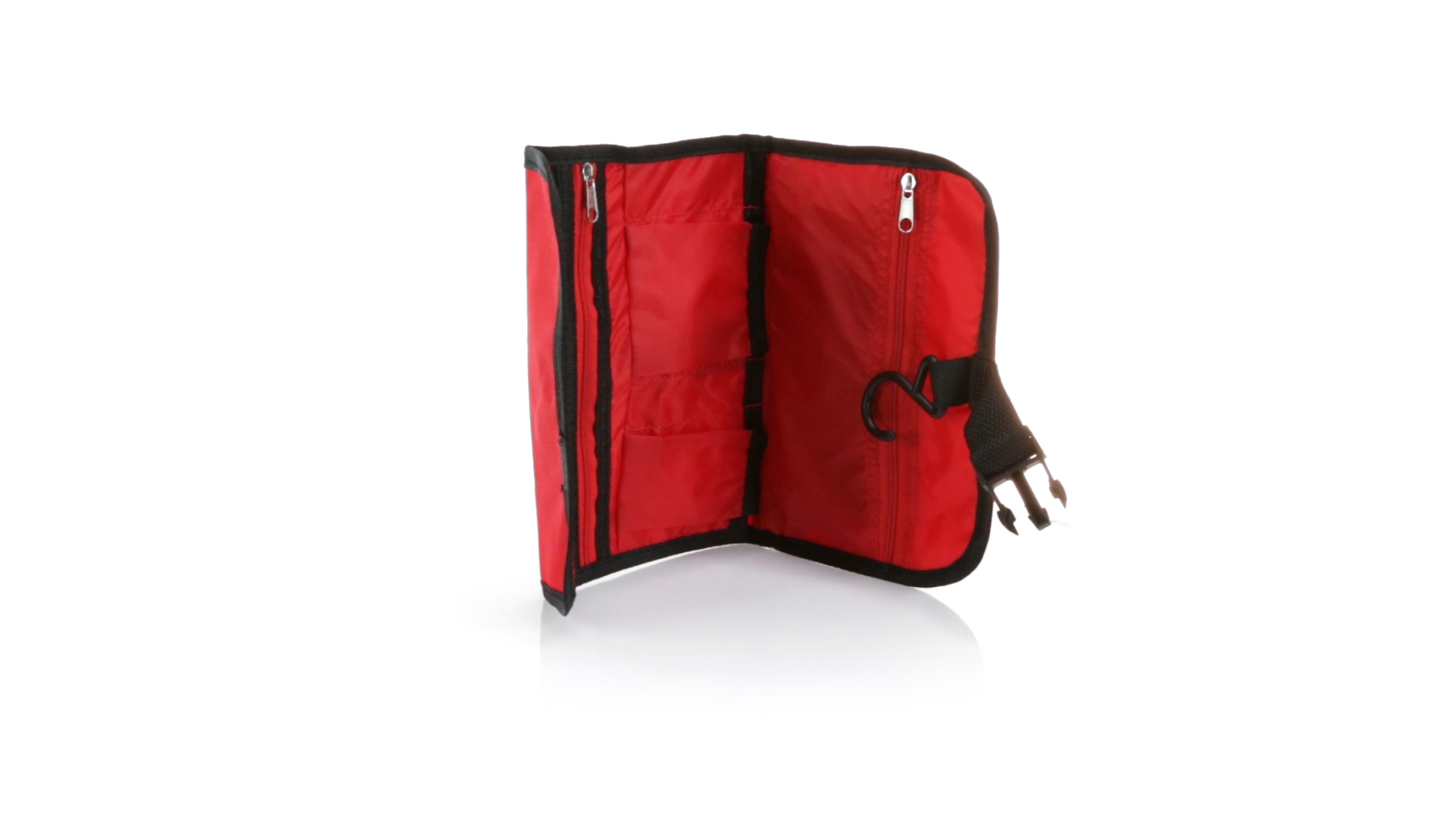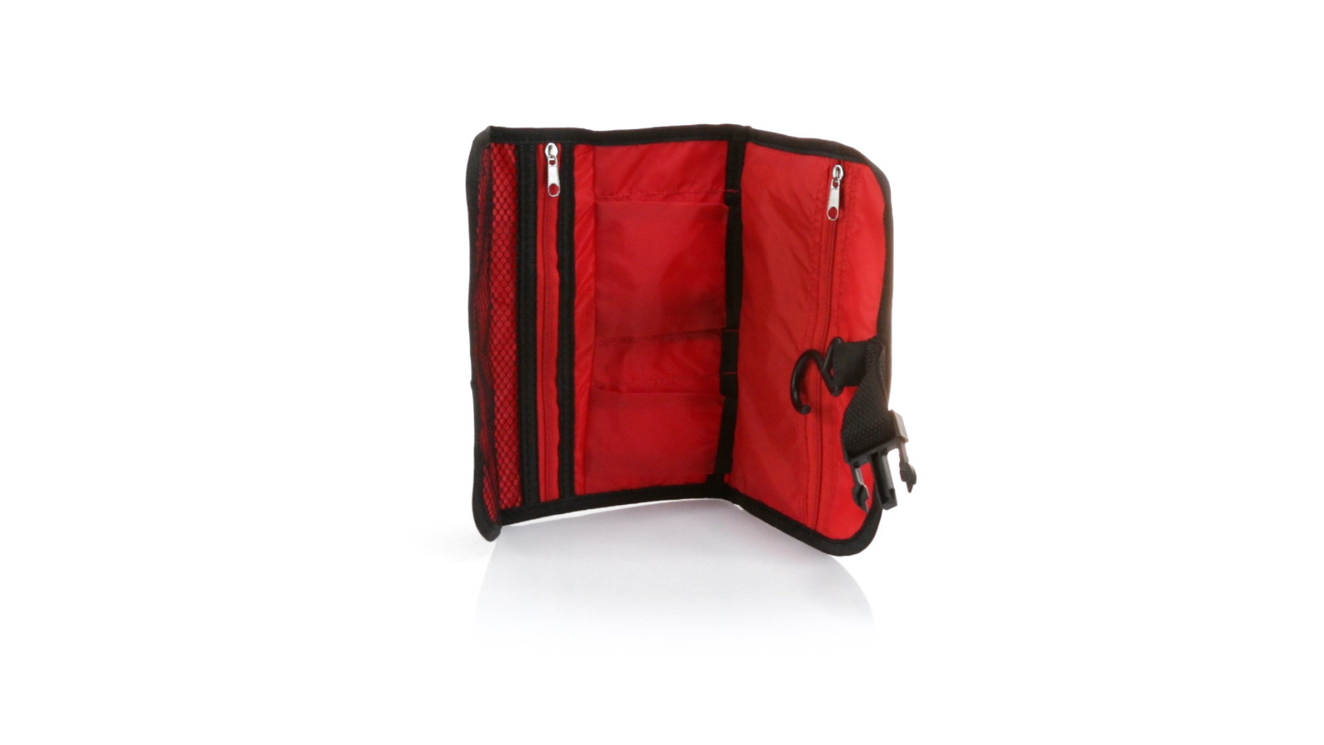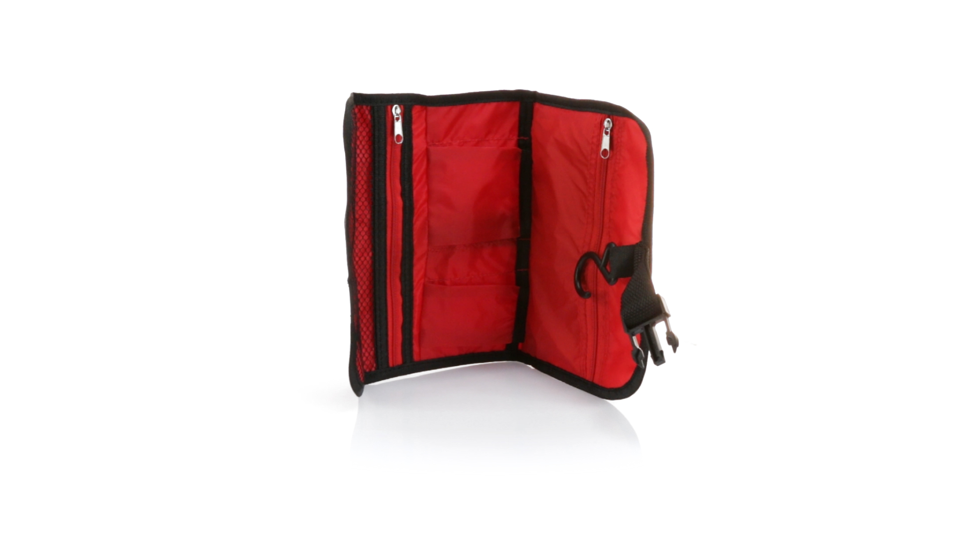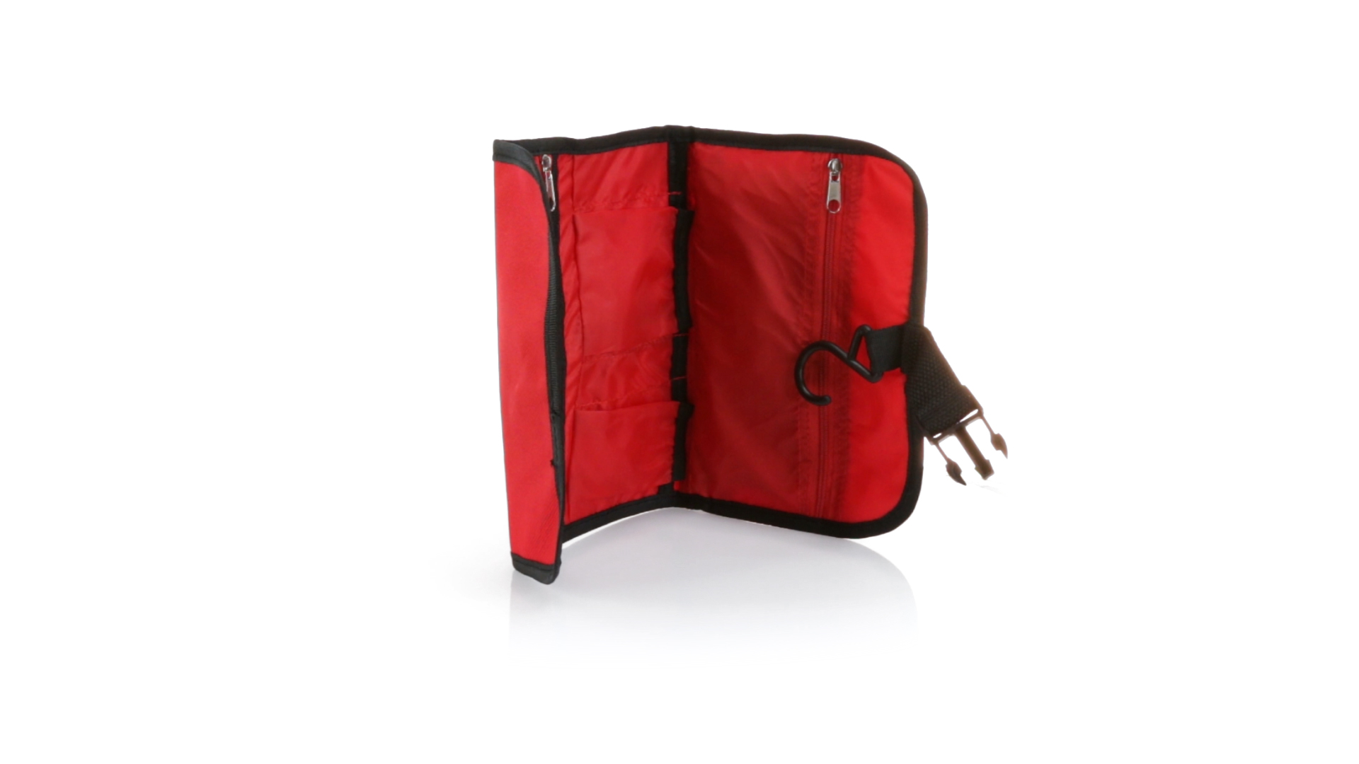 Praktischer Kulturbeutel mit Haken zum Aufhängen aus strapazierfähigem 600D Polyester in kräftigen Farben mit schwarzer Paspel. Aussentasche mit Reissverschluss und verstellbarem Riemen mit Klickverschluss. Weiches Polyester-Innenfutter mit verschiedenen Taschen und Netzfach.