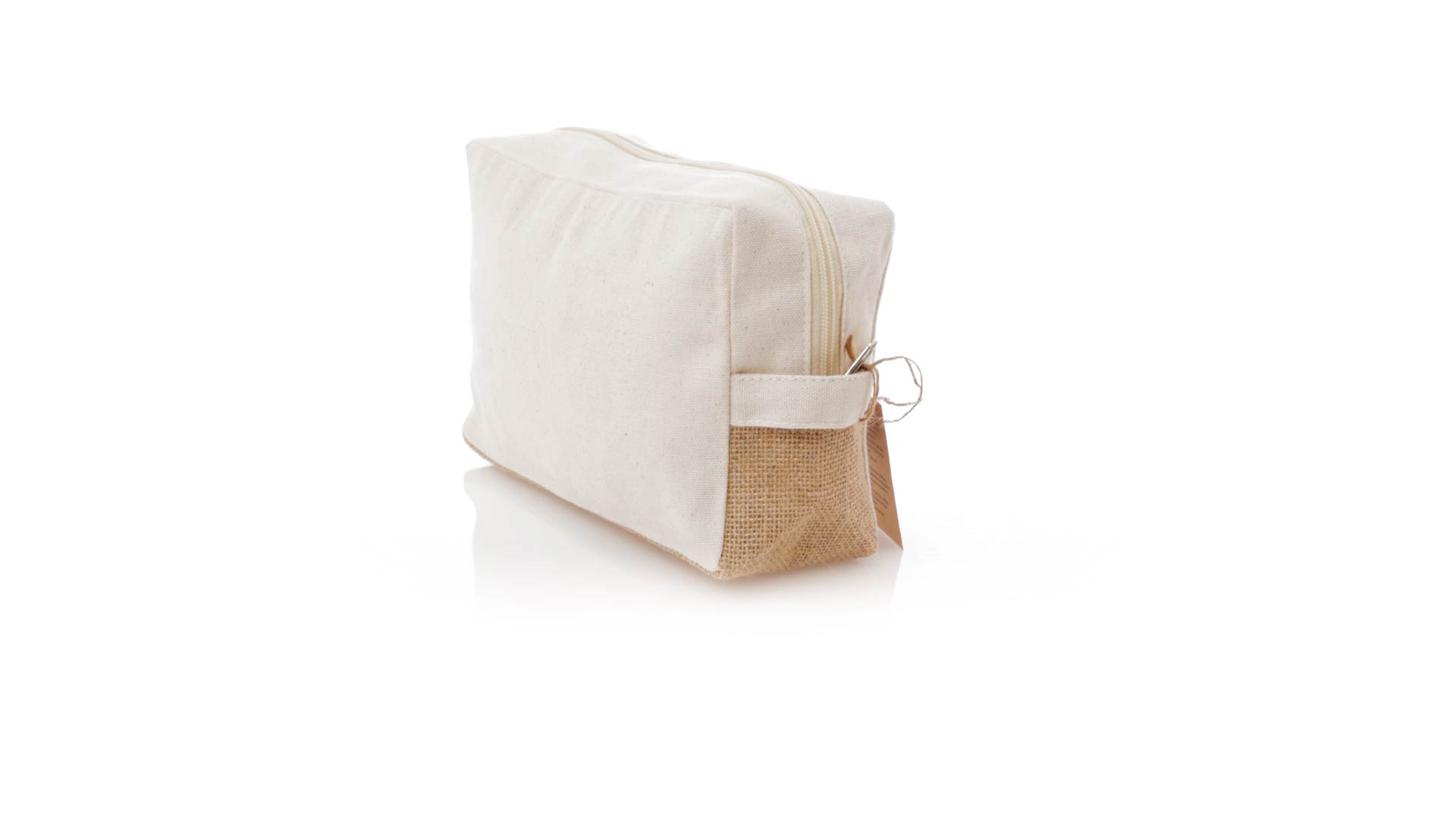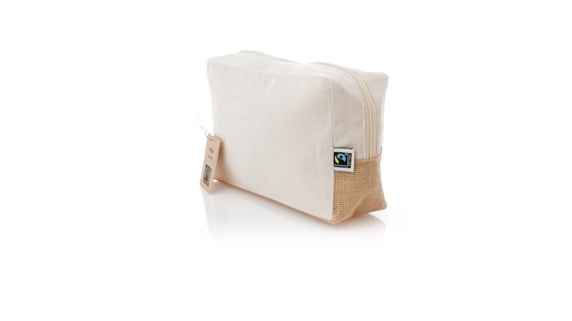 Natur Linie Fairtrade Kosmetiktasche, hergestellt aus Baumwolle. Hauptfach mit Reissverschluss und passendem Griff, Seiten und Boden mit Jute verstärkt. In elegantem Naturton. Inklusive Fairtrade-Etikett und Anhänger aus recyceltem Karton mit Fairtrade-Logo.Mit Fairtrade-Zertifizierung, einer Alternative zum konventionellen Handelssystem, die die Entwicklung der Völker und den Kampf gegen die Armut verfolgt.