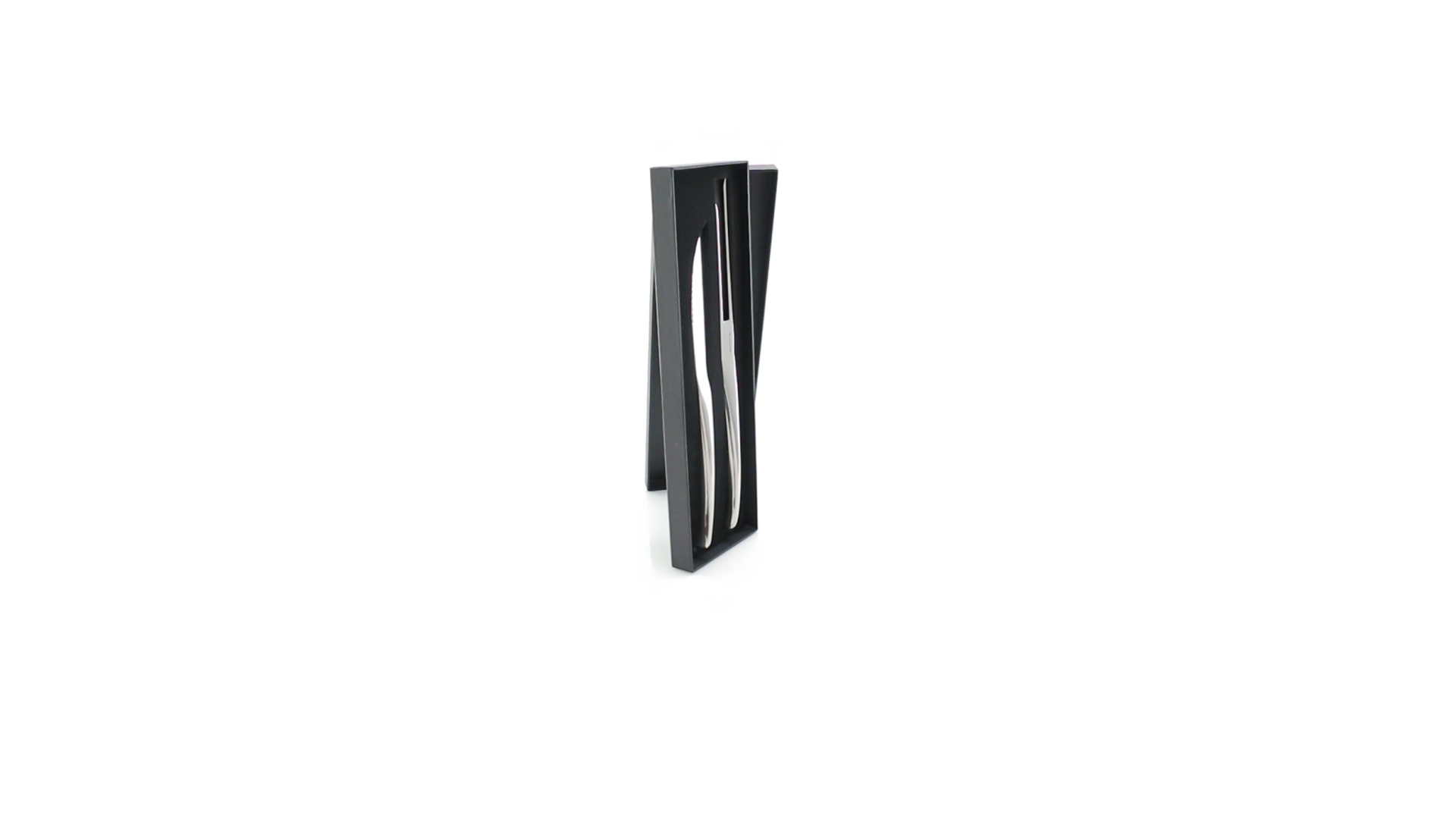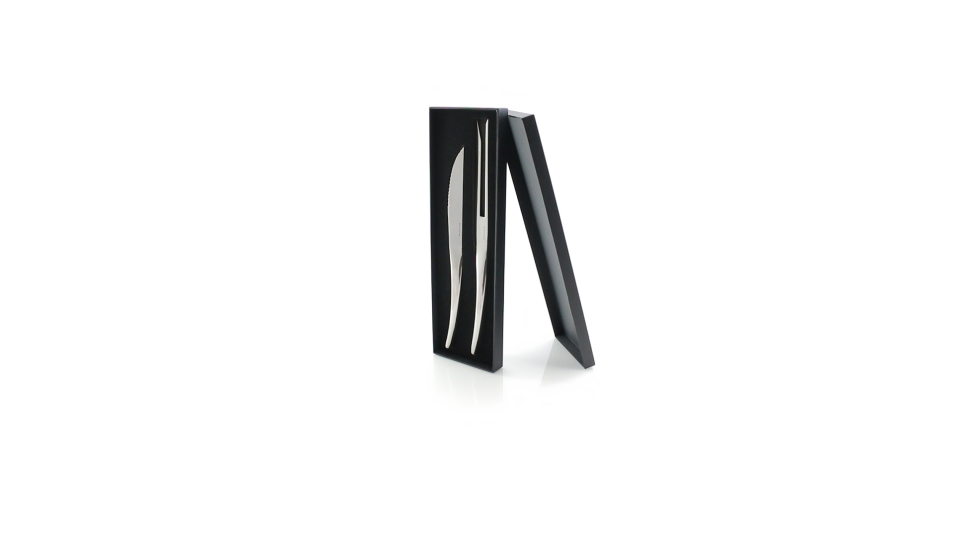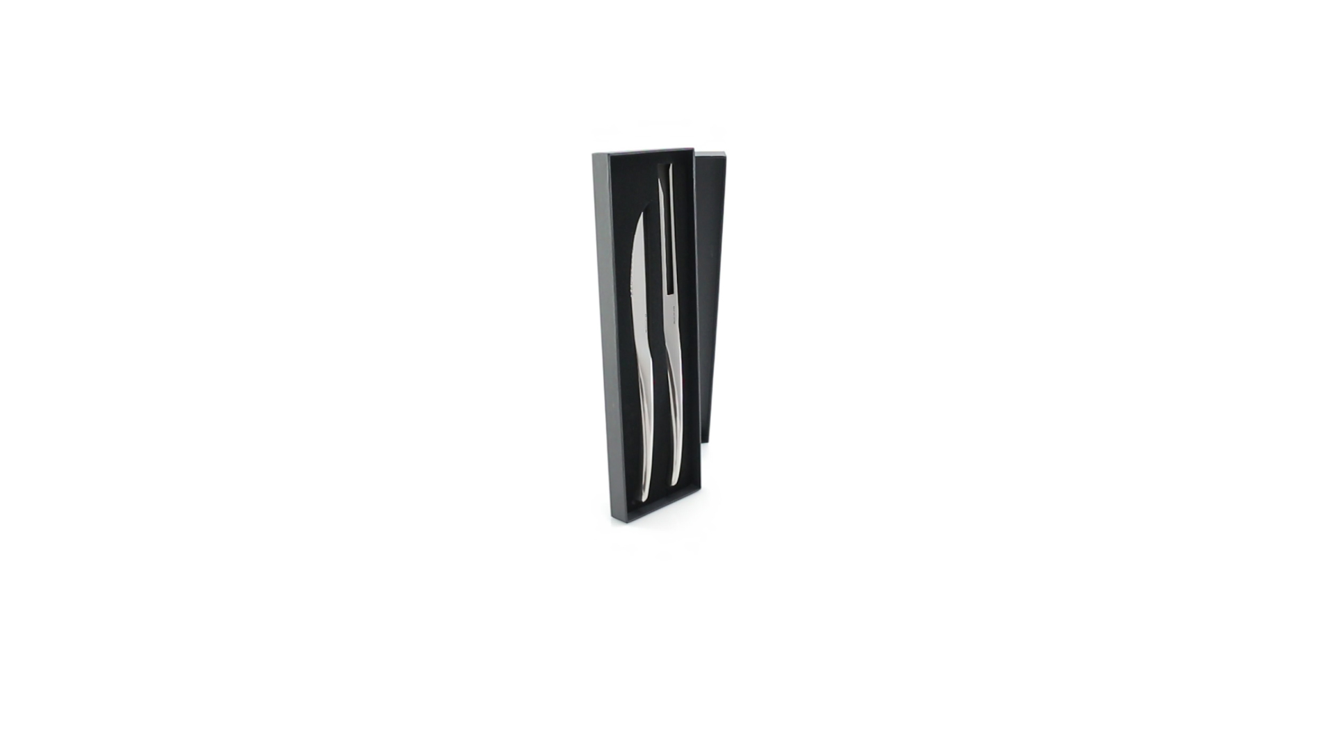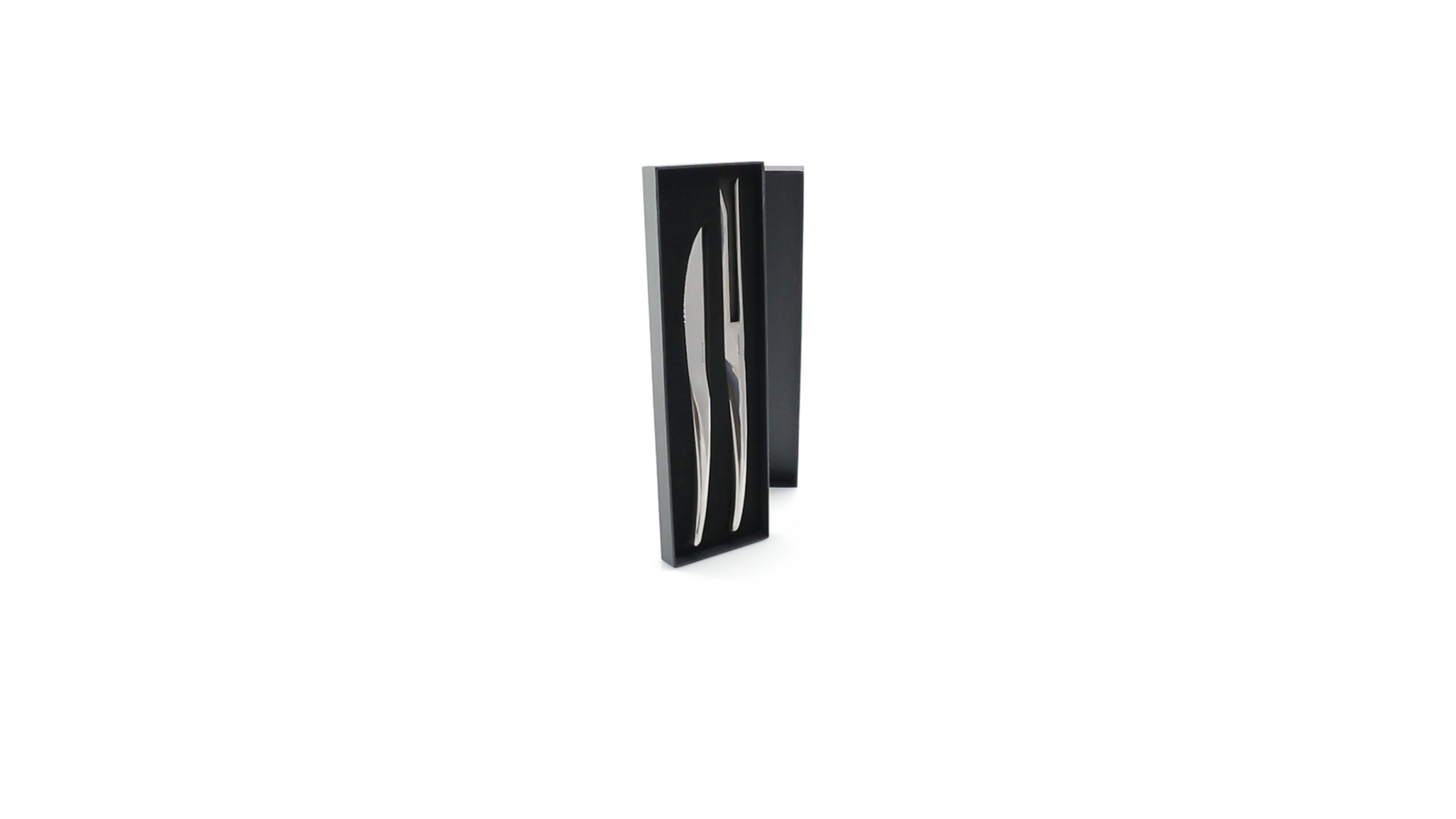 Küchenset von Antonio Miró aus Edelstahlmesser und -tranchiergabel. Präsentiert in einer individuellen Schachtel mit dem Markenlogo und weichem Schaumstoff mit Stanzung im Inneren.