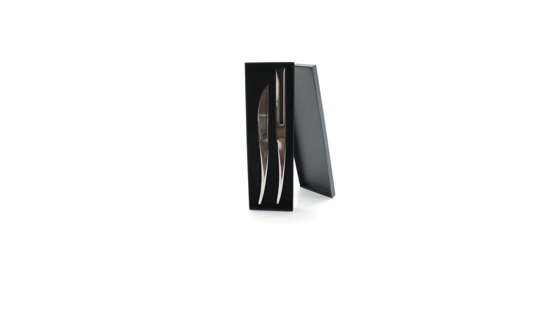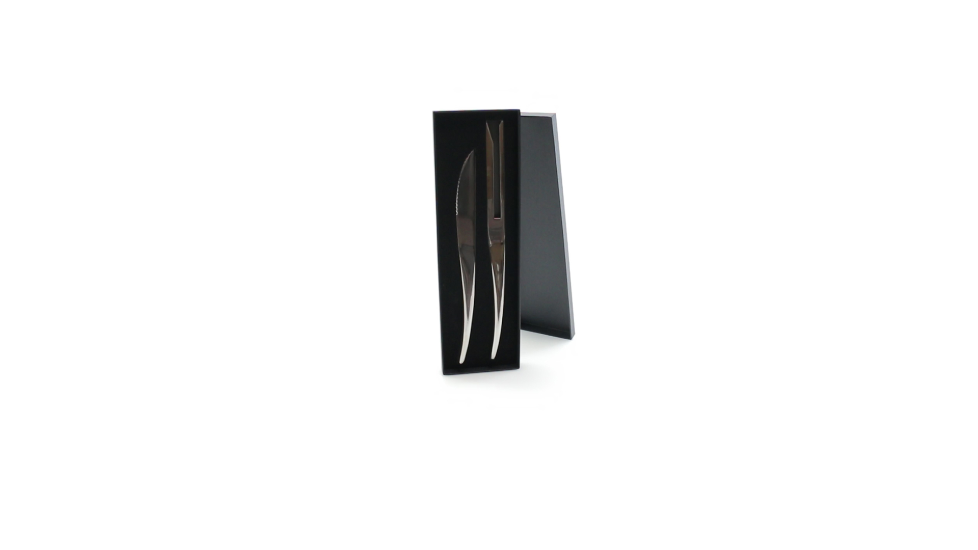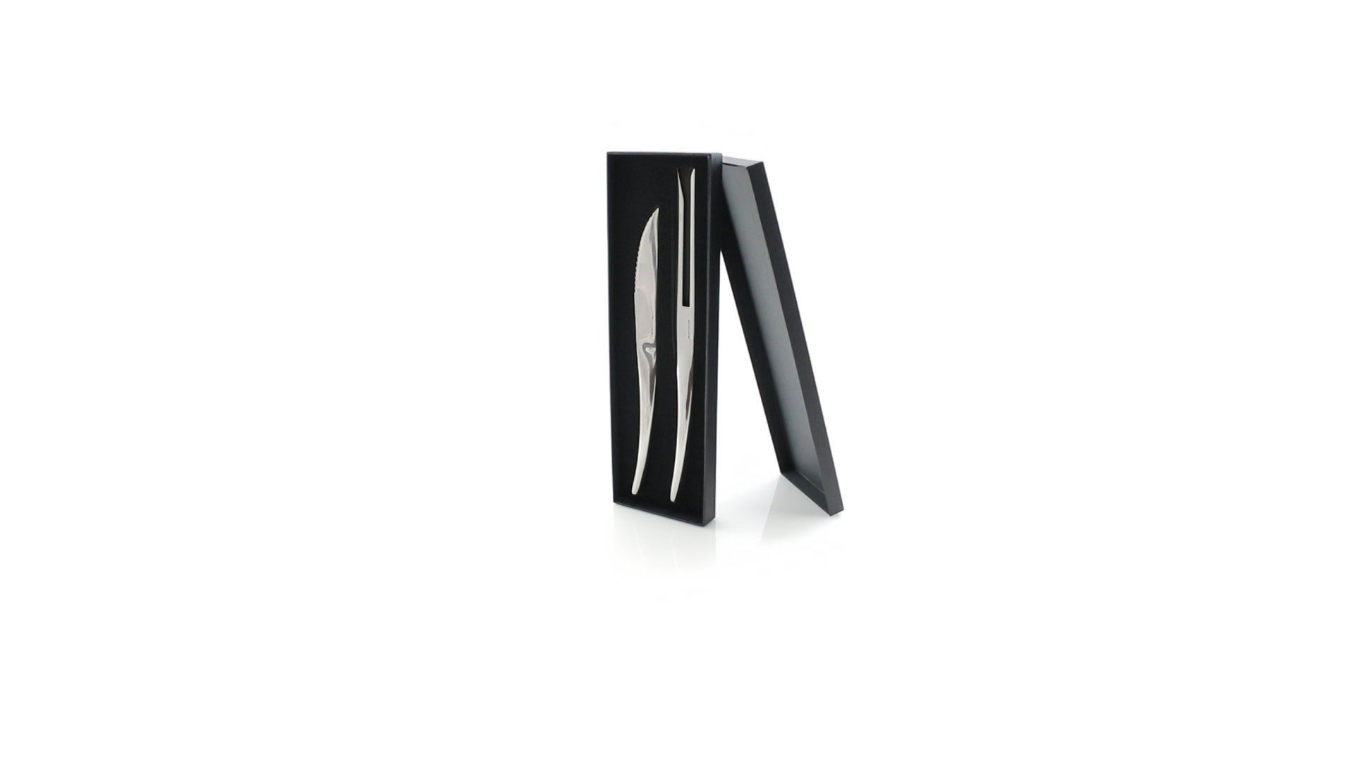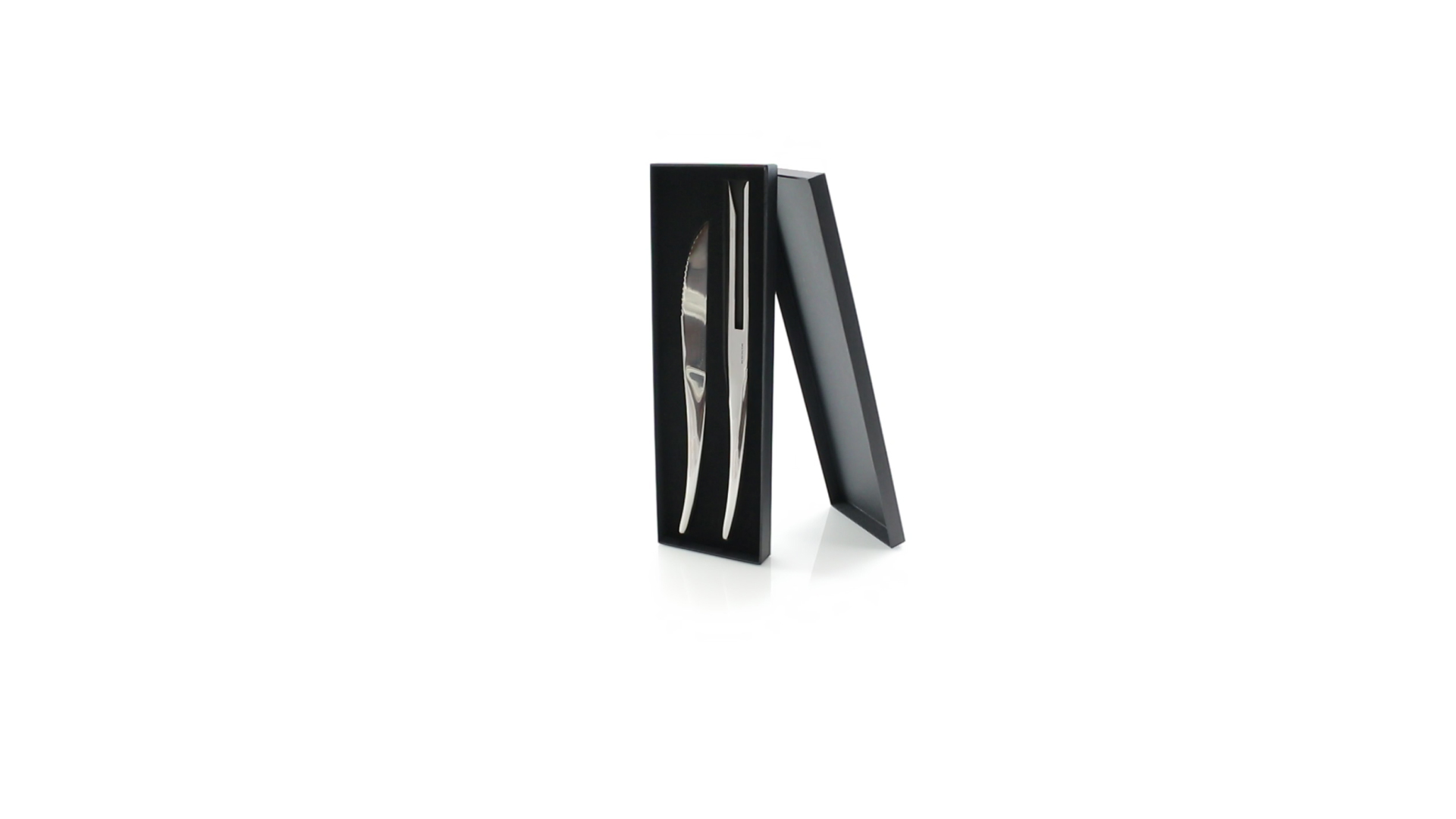 Küchenset von Antonio Miró aus Edelstahlmesser und -tranchiergabel. Präsentiert in einer individuellen Schachtel mit dem Markenlogo und weichem Schaumstoff mit Stanzung im Inneren.