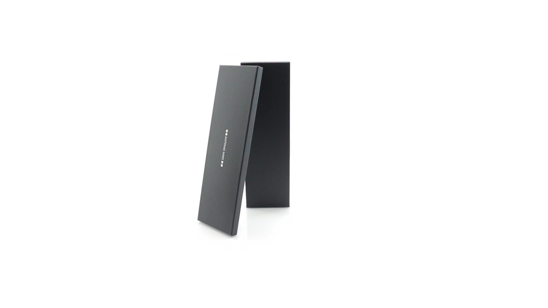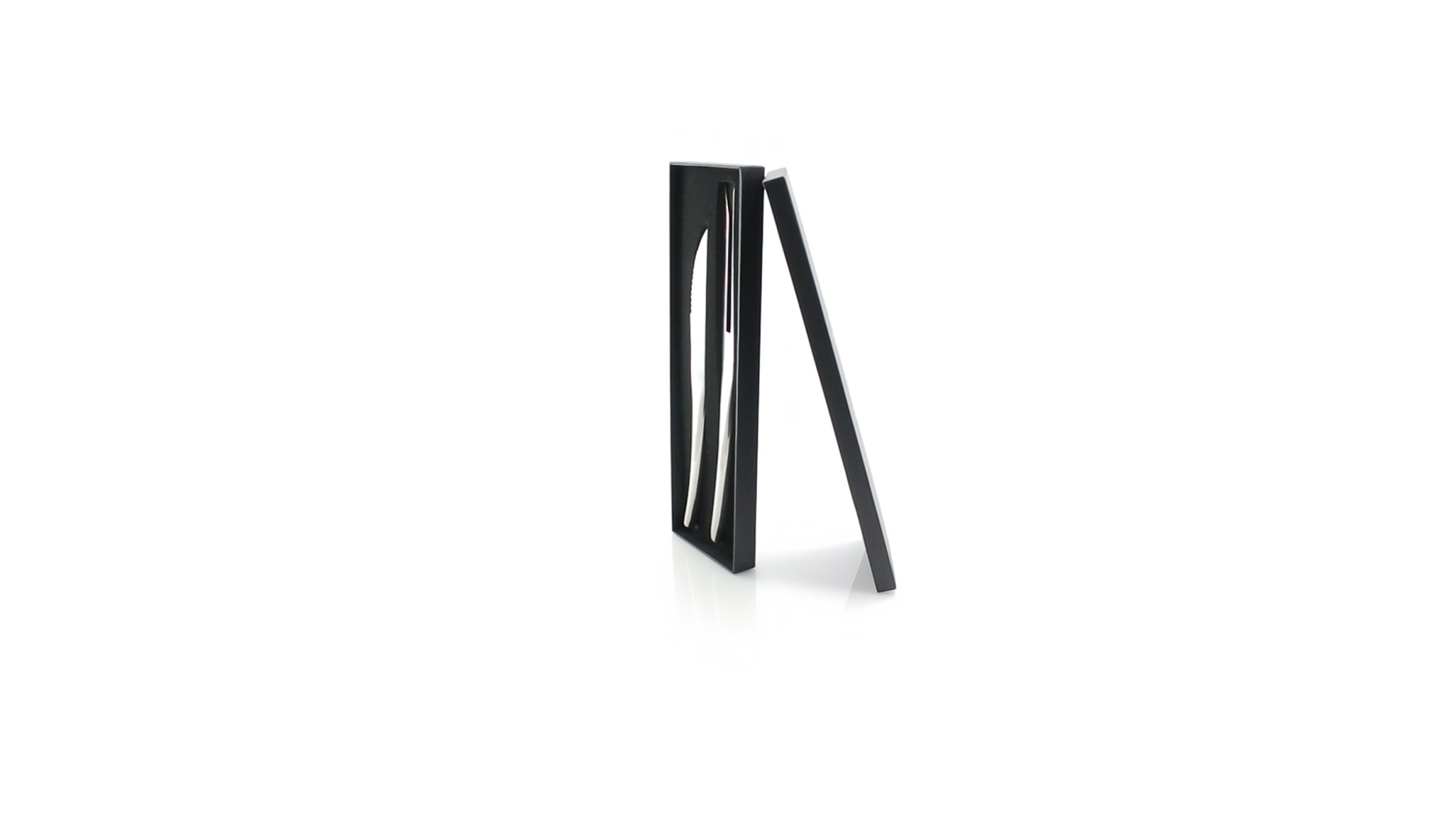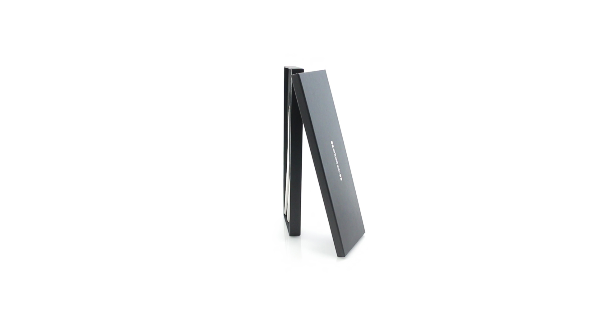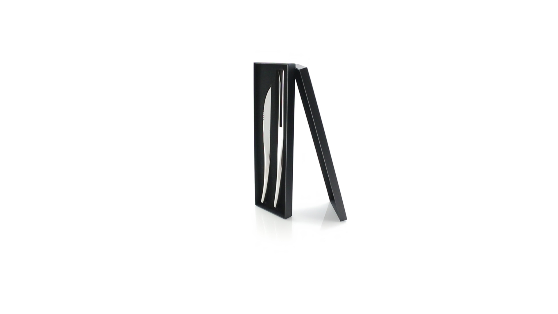 Küchenset von Antonio Miró aus Edelstahlmesser und -tranchiergabel. Präsentiert in einer individuellen Schachtel mit dem Markenlogo und weichem Schaumstoff mit Stanzung im Inneren.