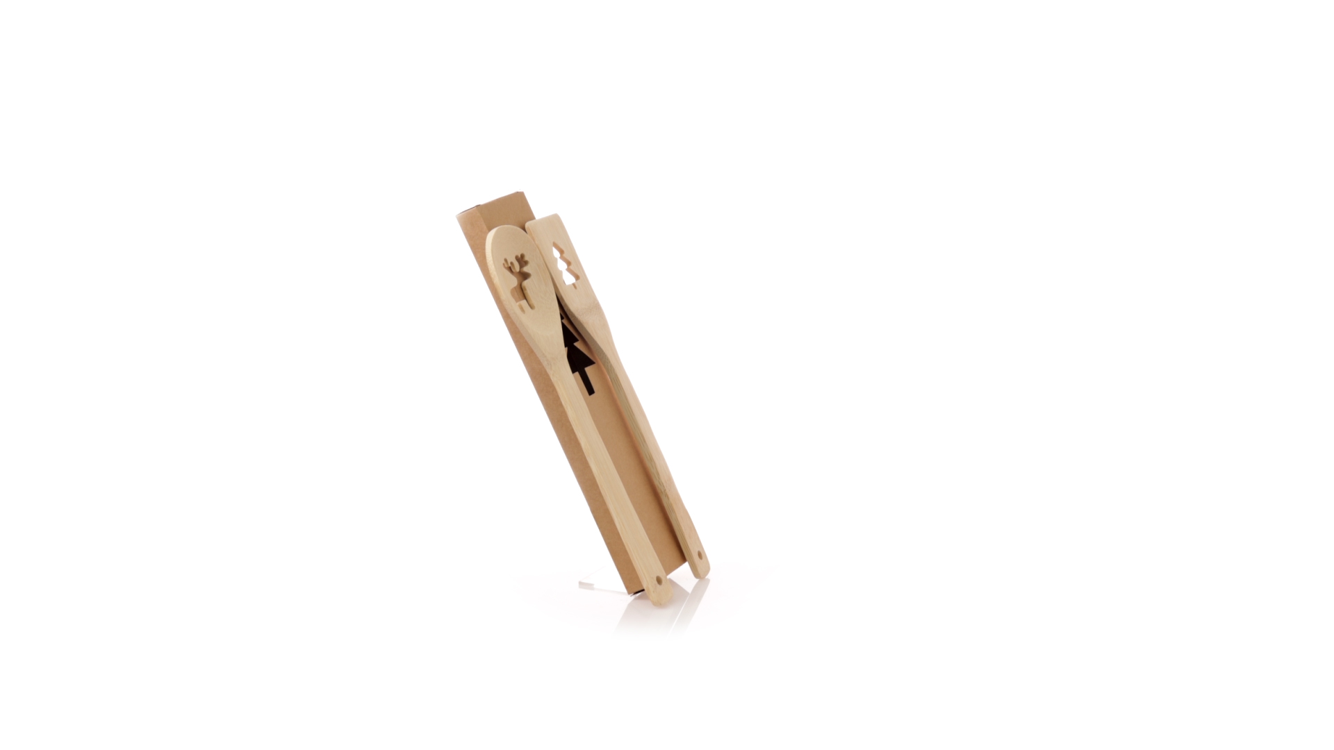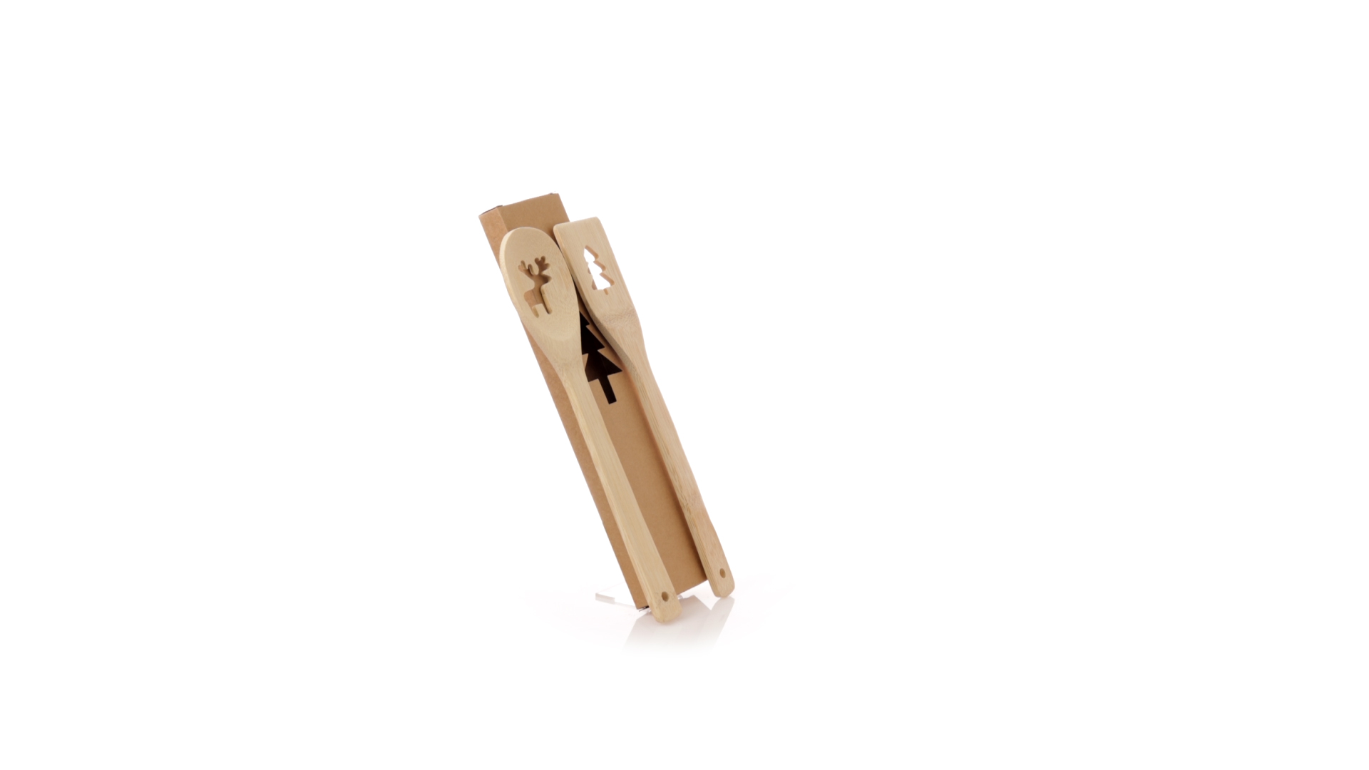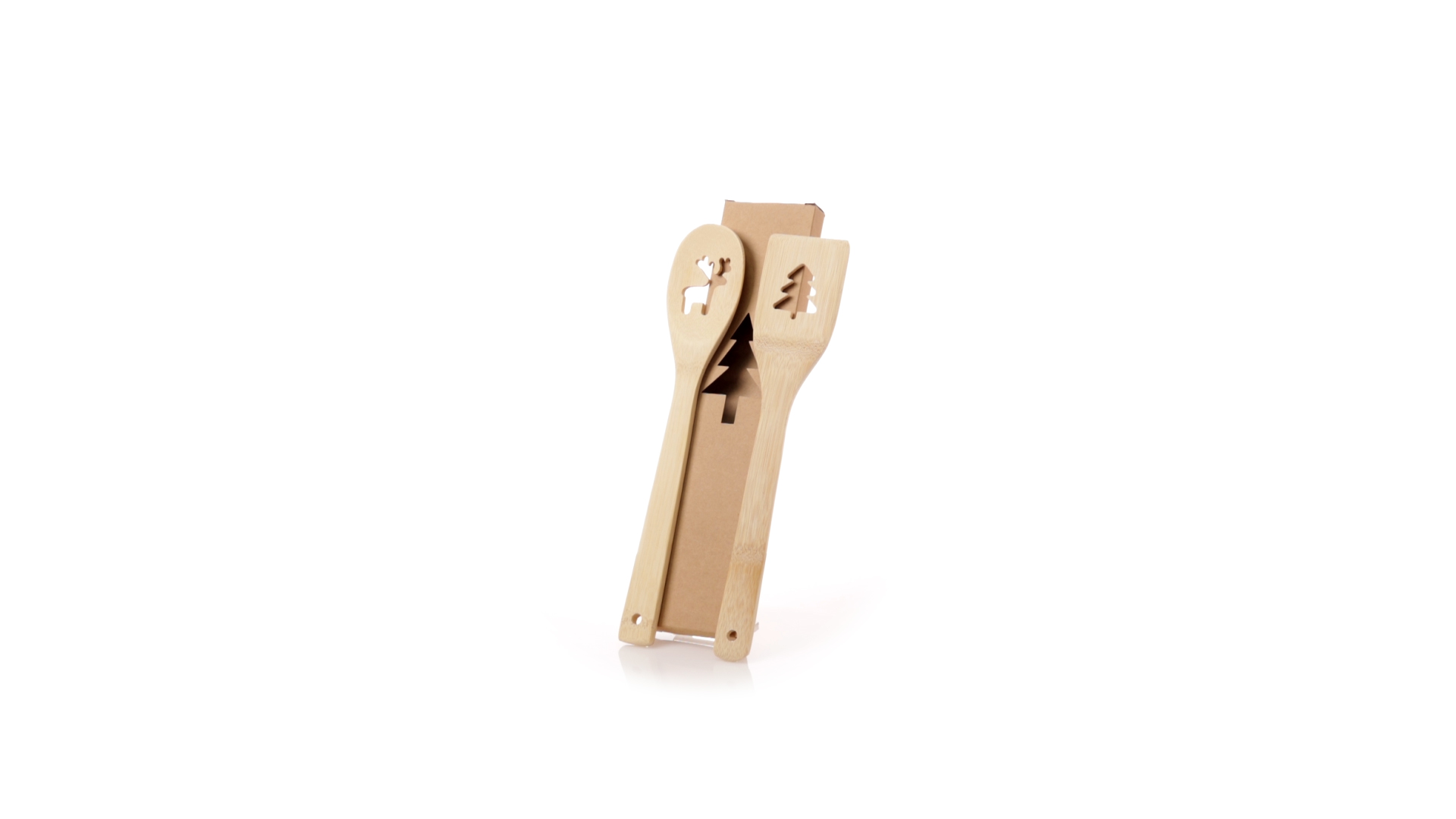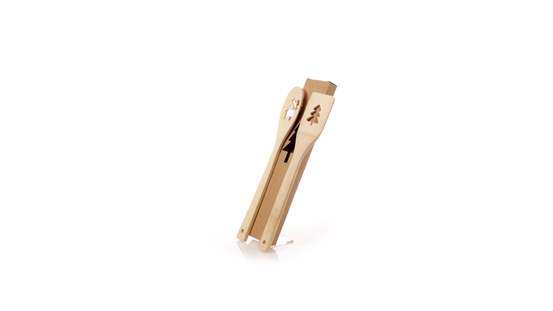 Originelles Küchenset mit ausgestanzten Weihnachtsmotiven. Inklusive Löffel und Paddel aus poliertem Bambus. Präsentiert in einer individuellen Kraft-Design-Box.