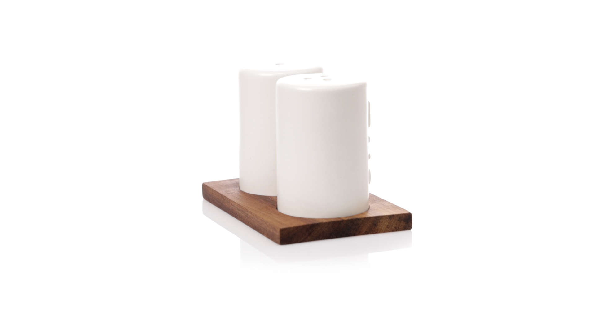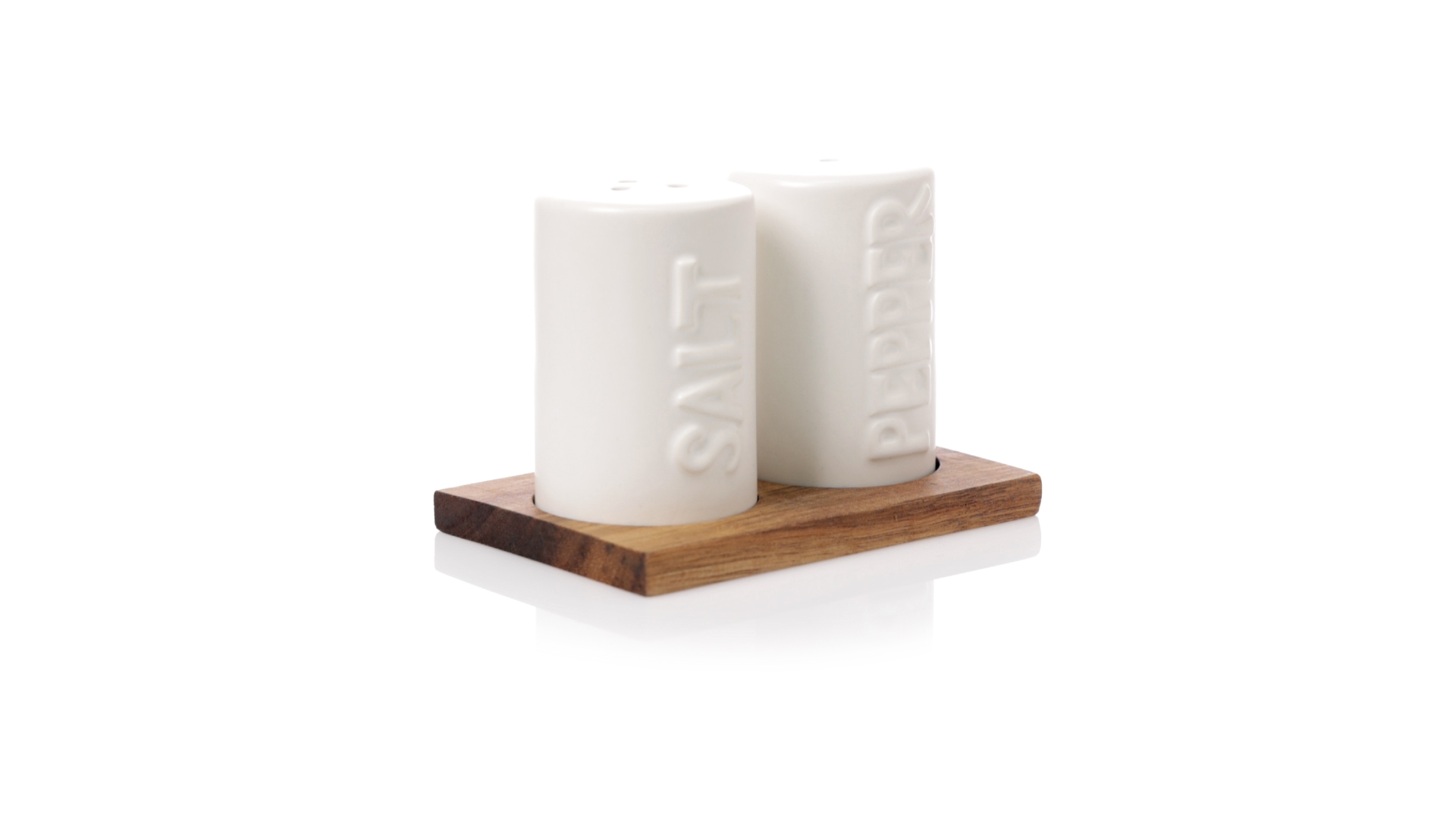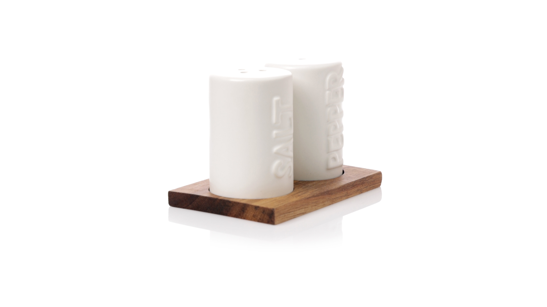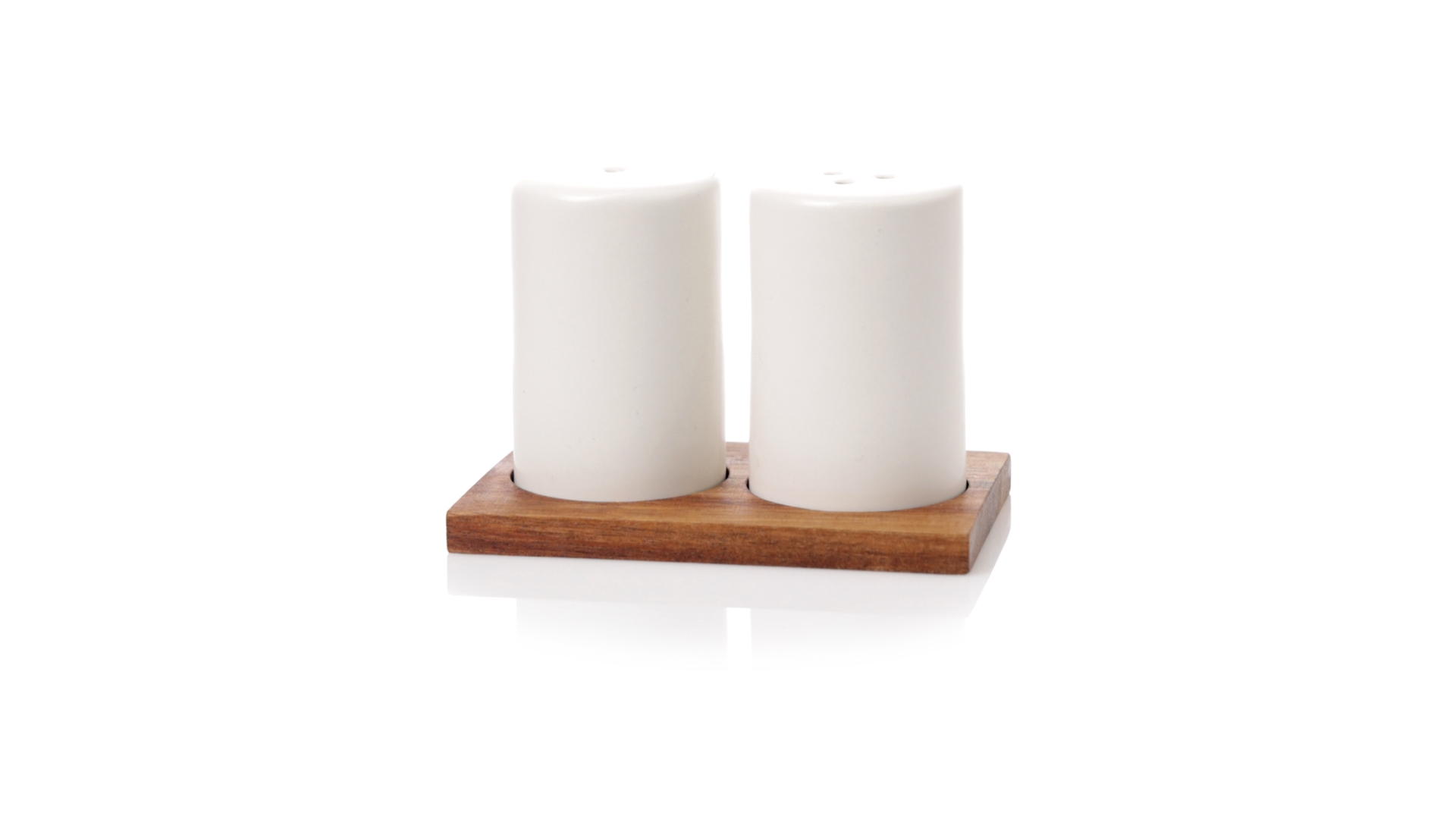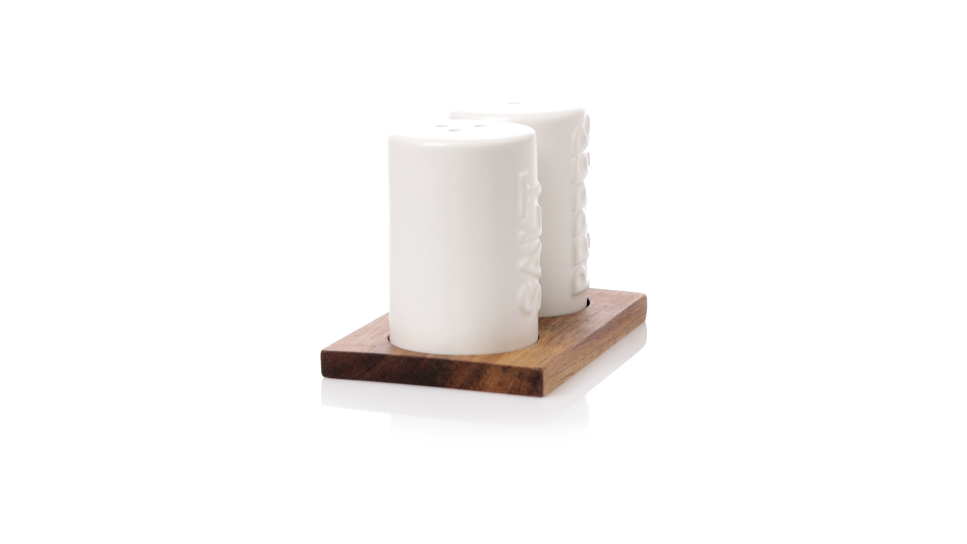 Set aus Salz- und Pfefferstreuern in Weiss und aus Keramik. Inklusive Sockel aus natürlichem Akazienholz, passend zu den Salz- und Pfefferstreuern gestanzt. Präsentiert in einer individuellen Kraft-Design-Box.