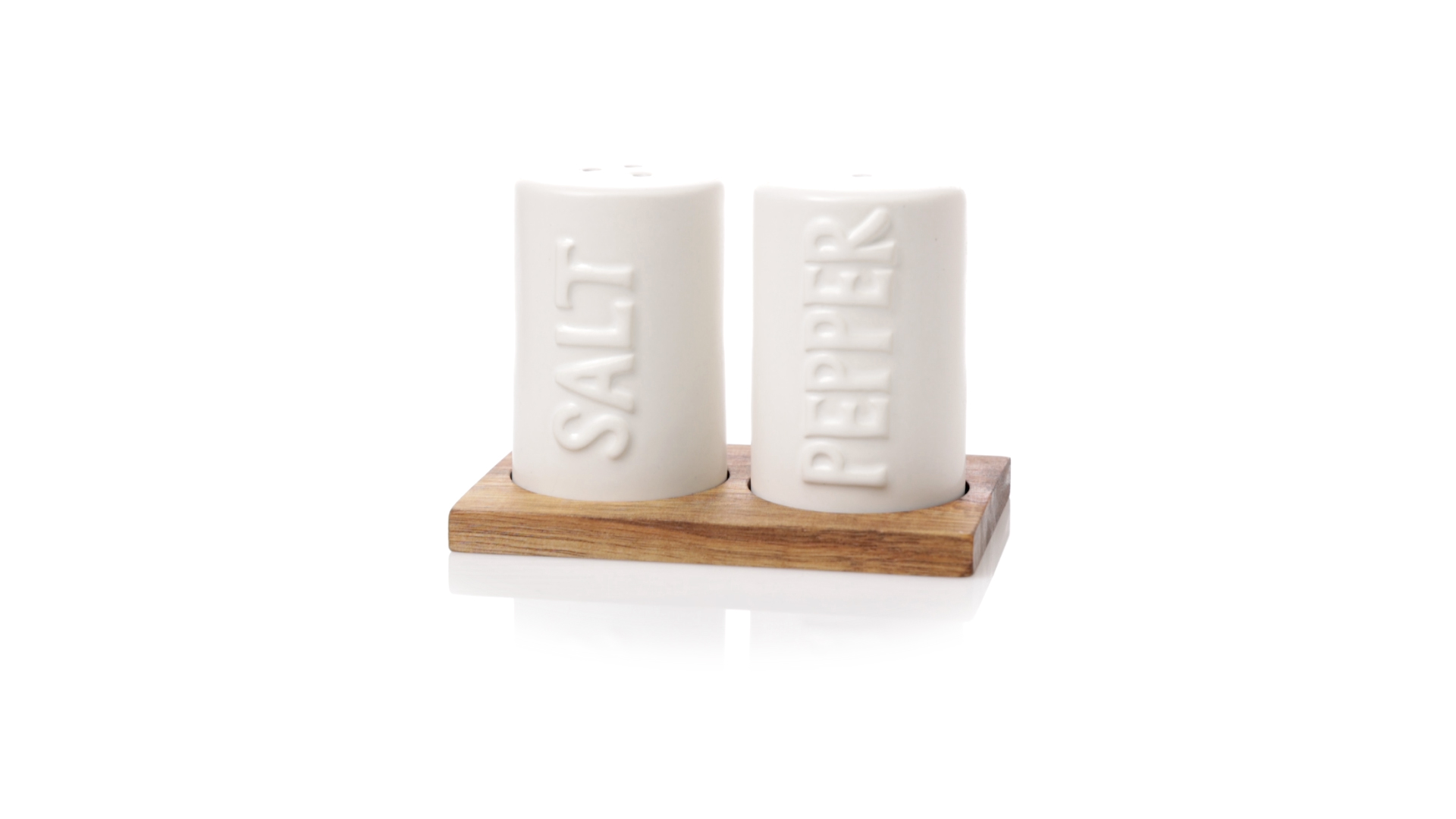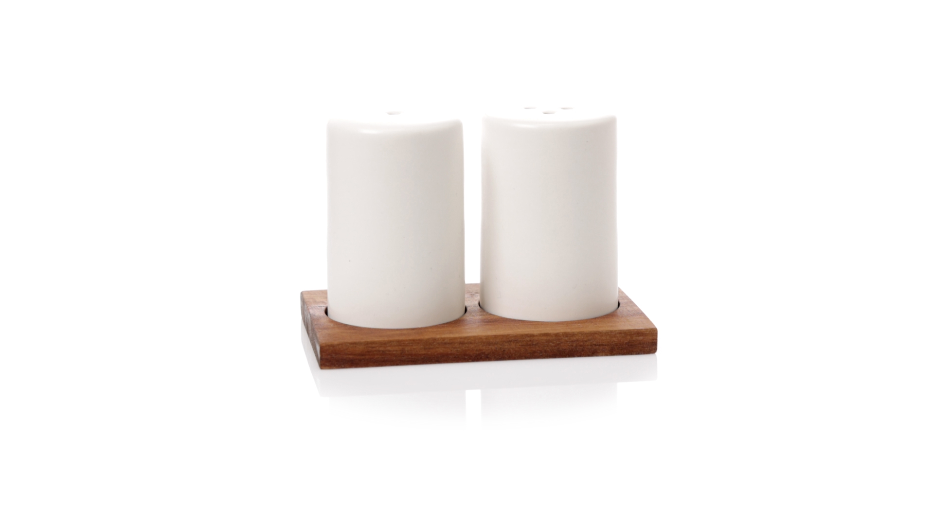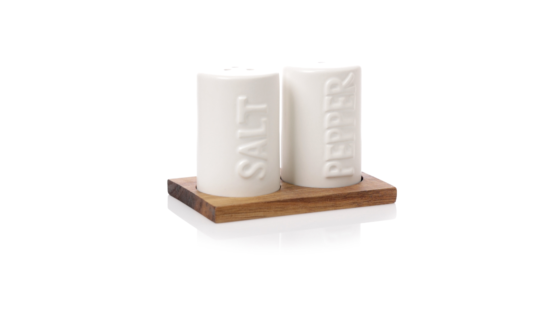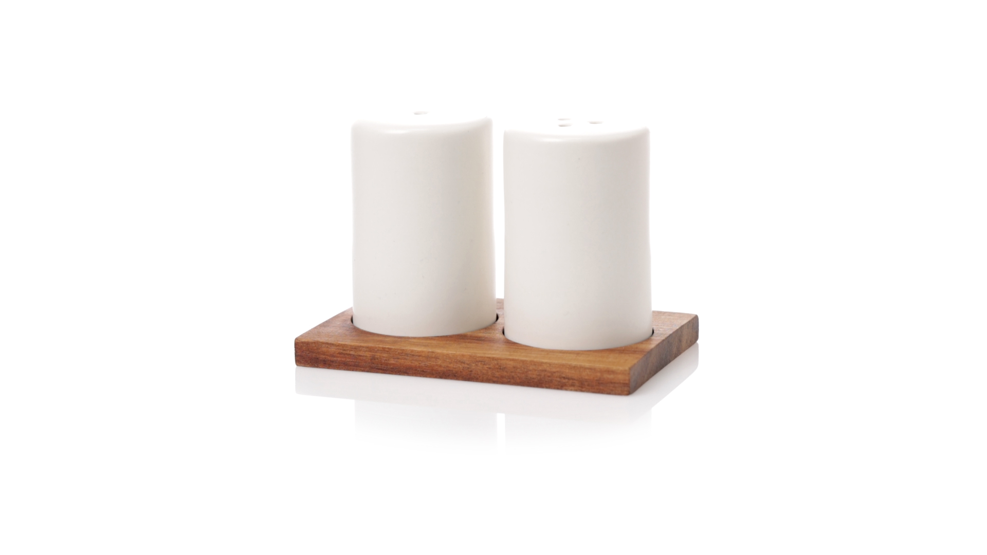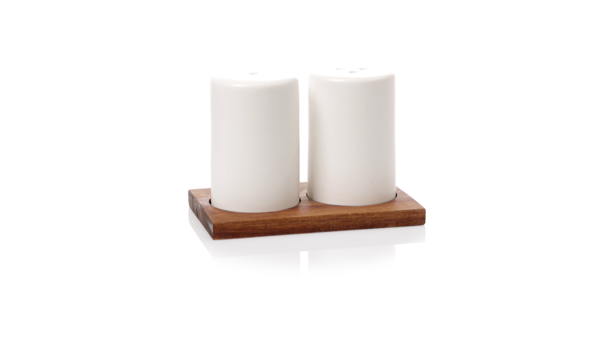 Set aus Salz- und Pfefferstreuern in Weiss und aus Keramik. Inklusive Sockel aus natürlichem Akazienholz, passend zu den Salz- und Pfefferstreuern gestanzt. Präsentiert in einer individuellen Kraft-Design-Box.