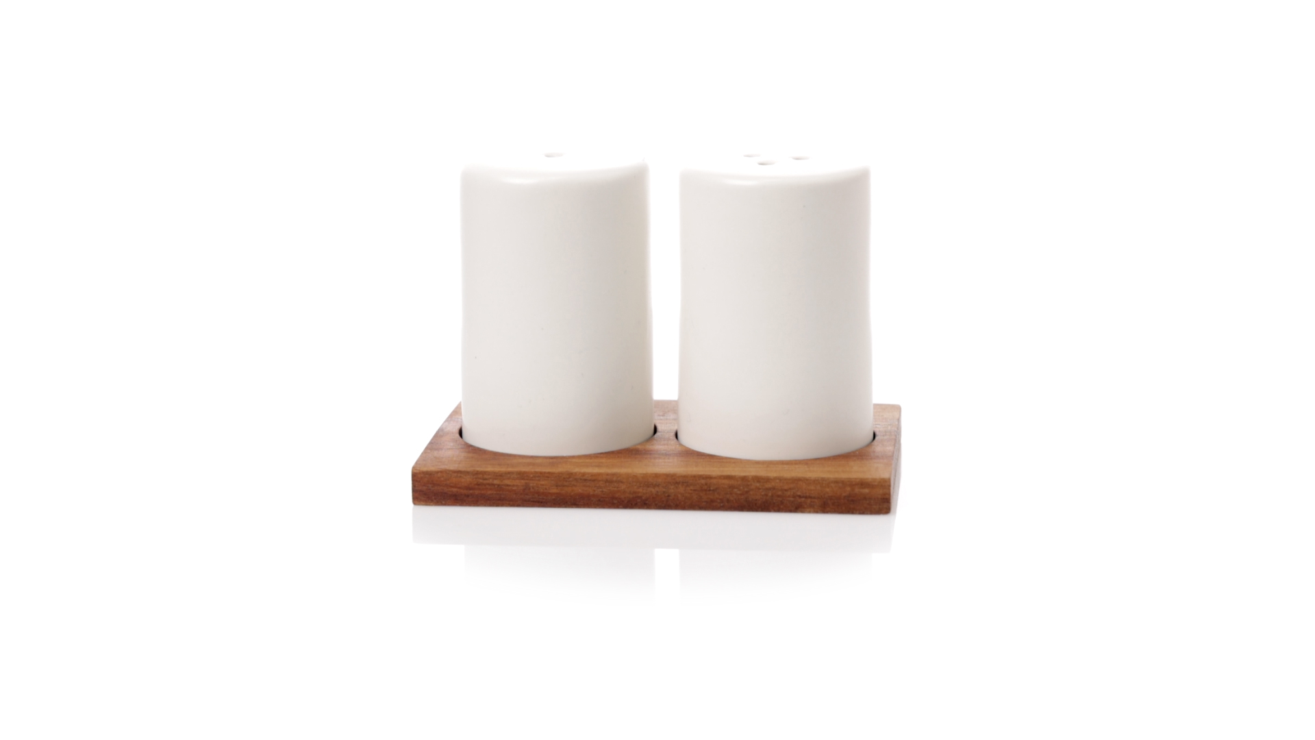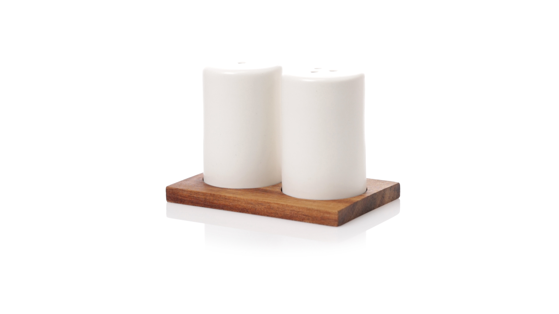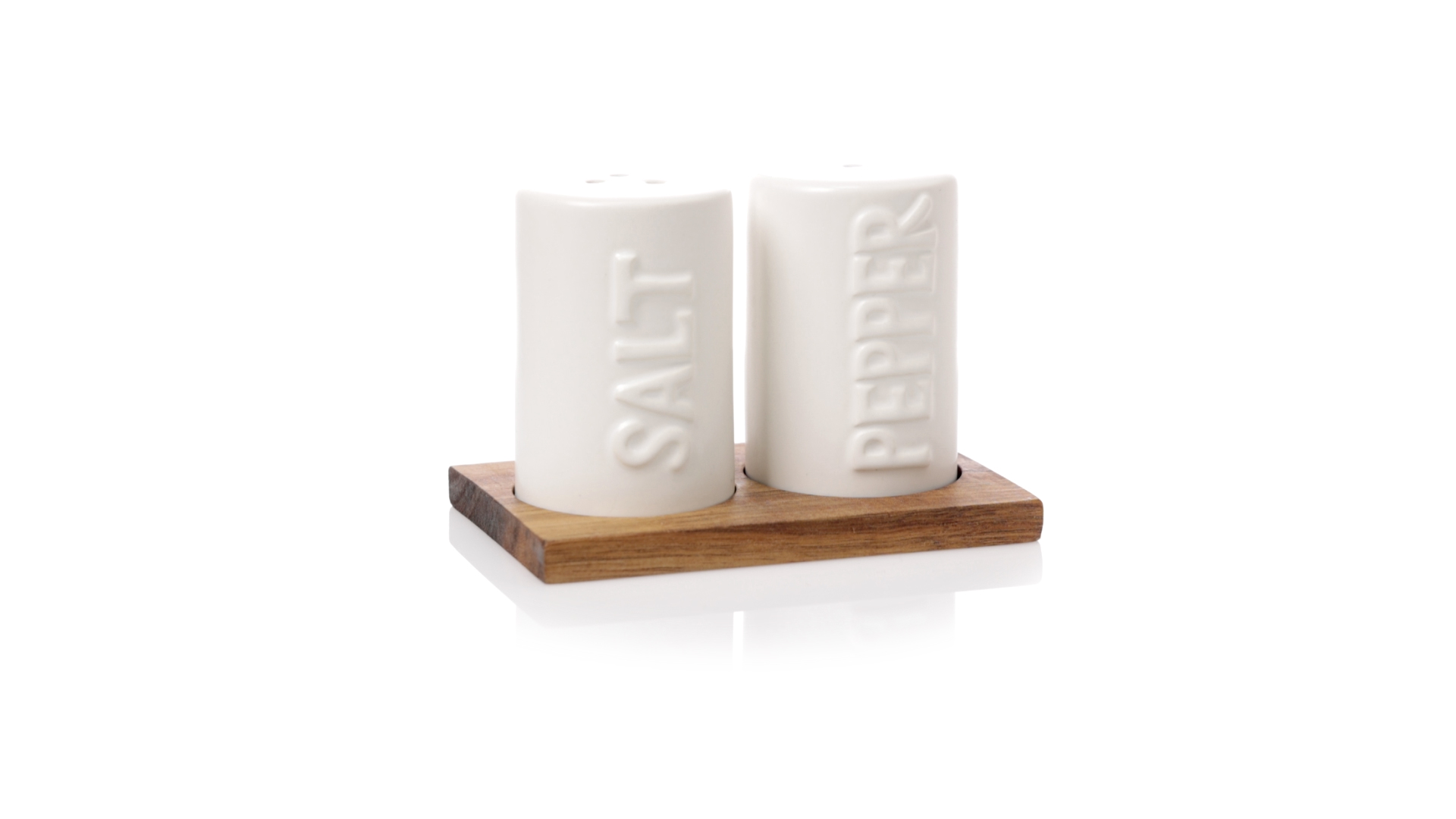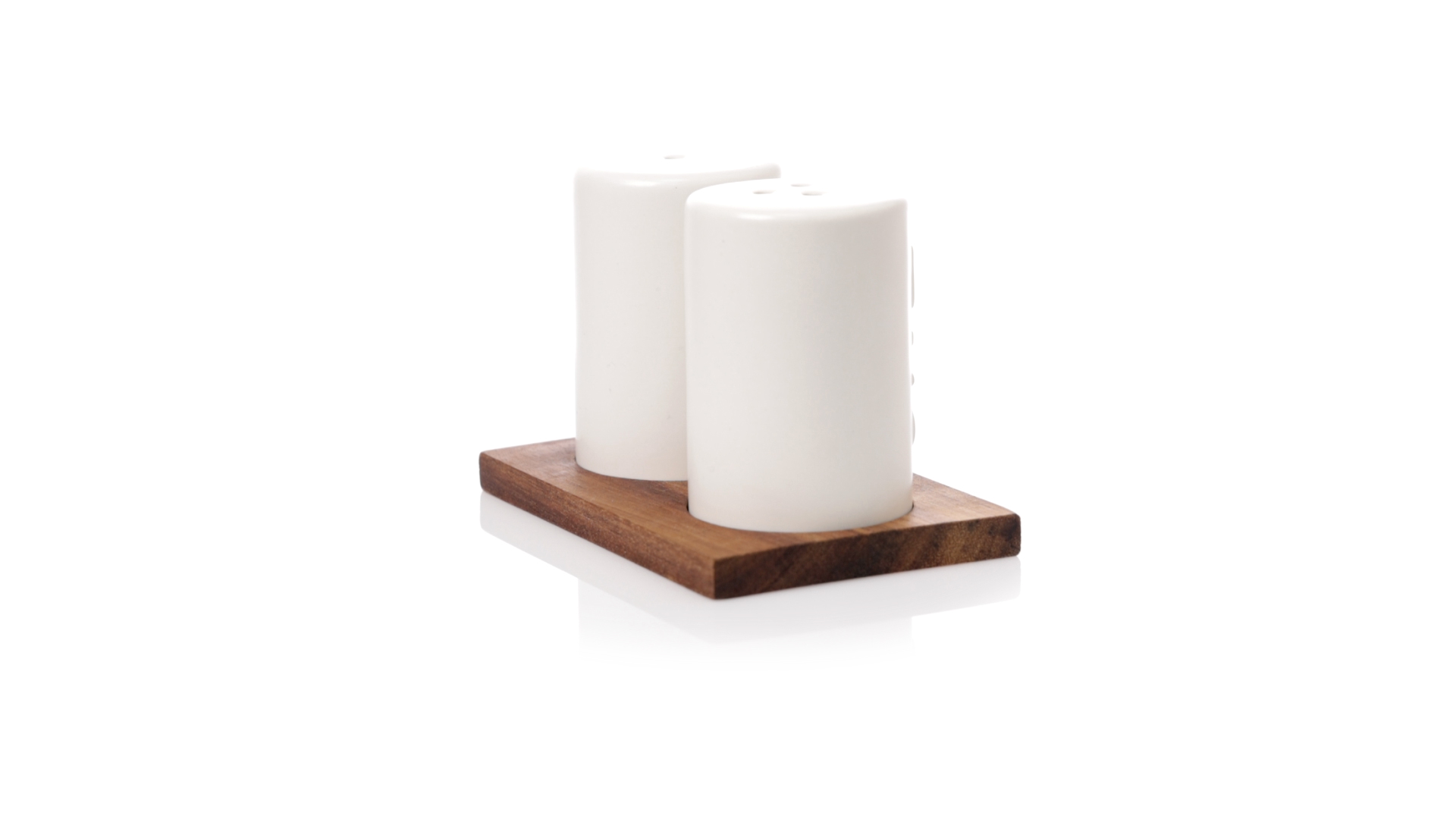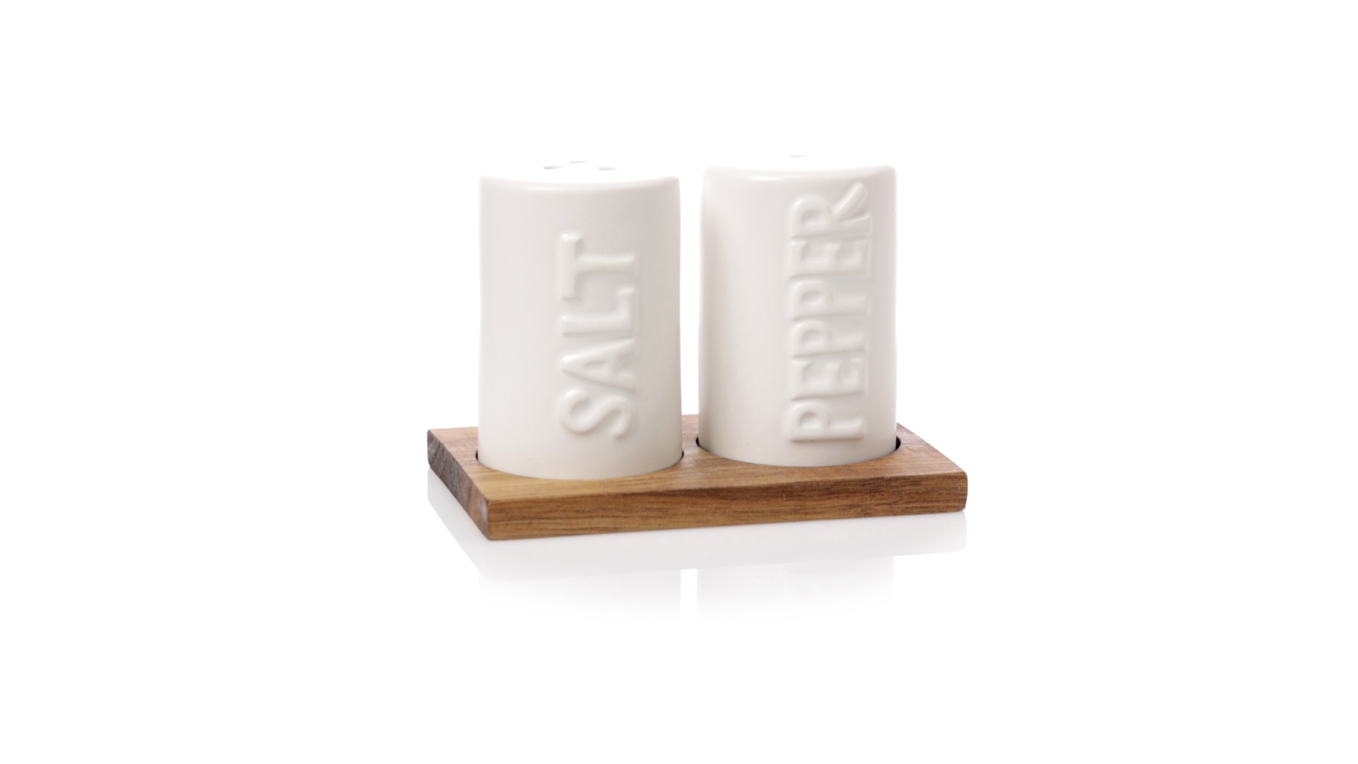 Set aus Salz- und Pfefferstreuern in Weiss und aus Keramik. Inklusive Sockel aus natürlichem Akazienholz, passend zu den Salz- und Pfefferstreuern gestanzt. Präsentiert in einer individuellen Kraft-Design-Box.