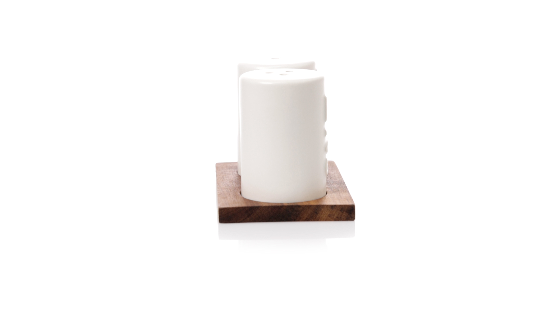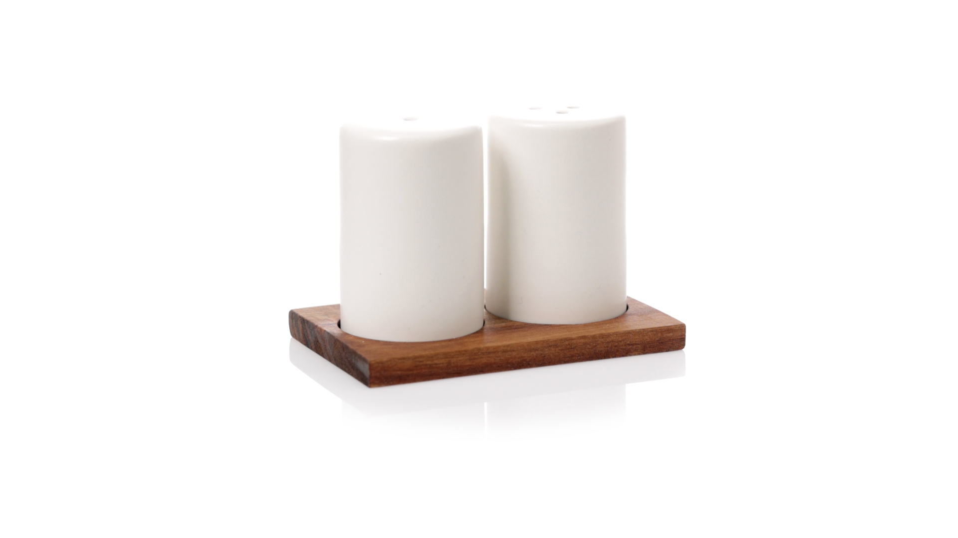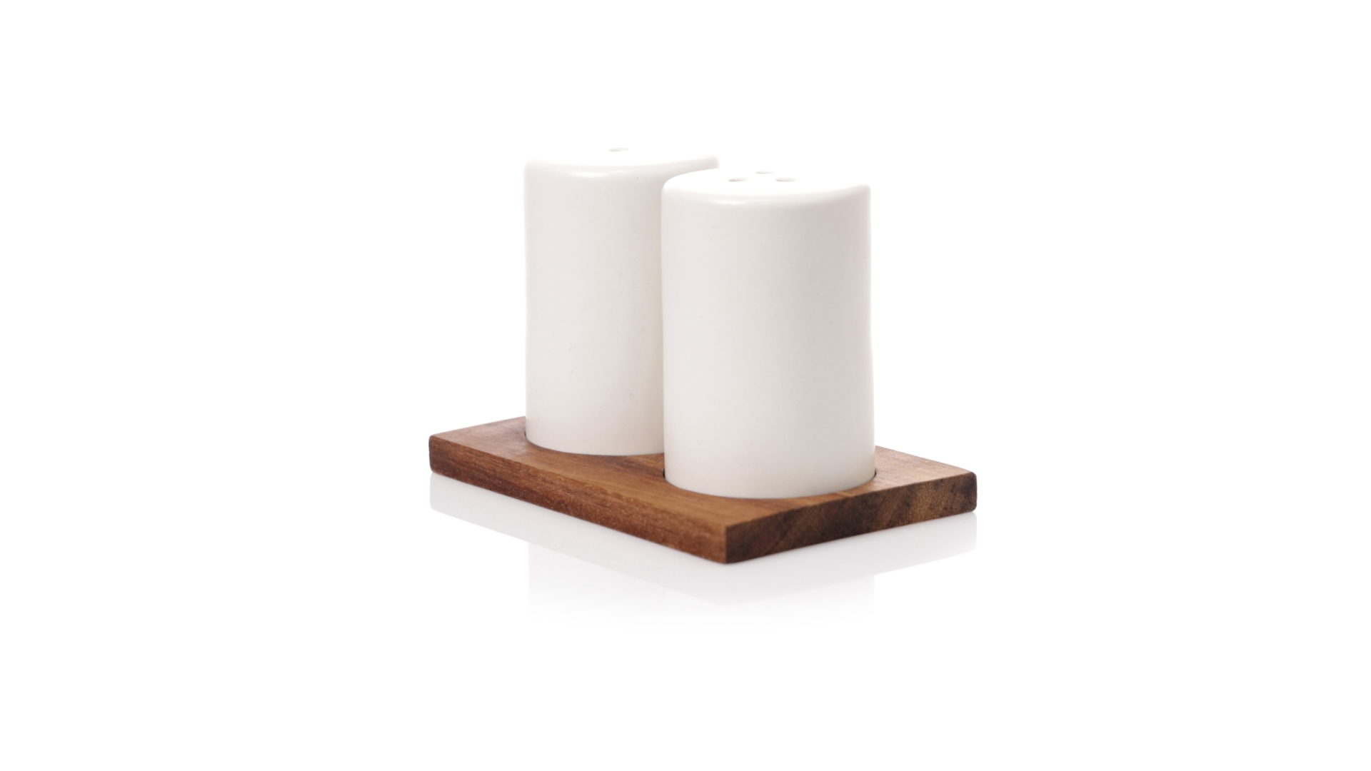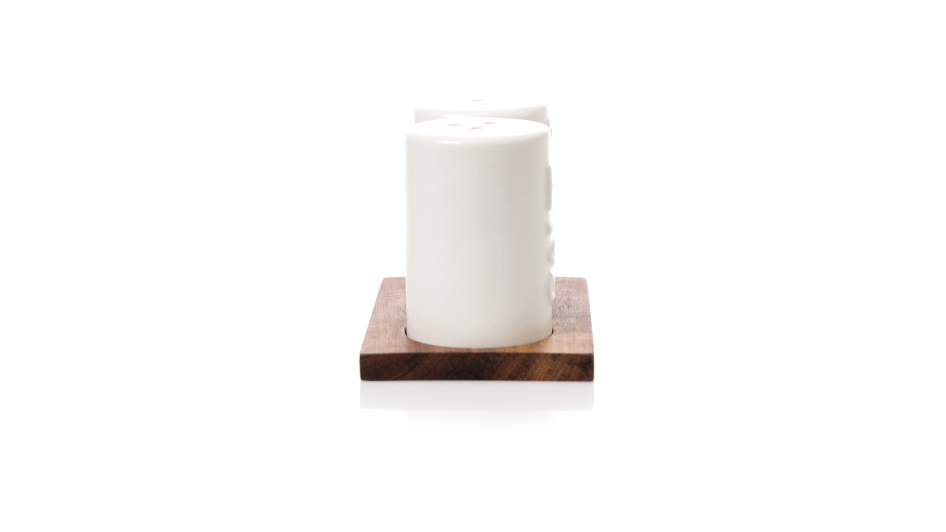 Set aus Salz- und Pfefferstreuern in Weiss und aus Keramik. Inklusive Sockel aus natürlichem Akazienholz, passend zu den Salz- und Pfefferstreuern gestanzt. Präsentiert in einer individuellen Kraft-Design-Box.