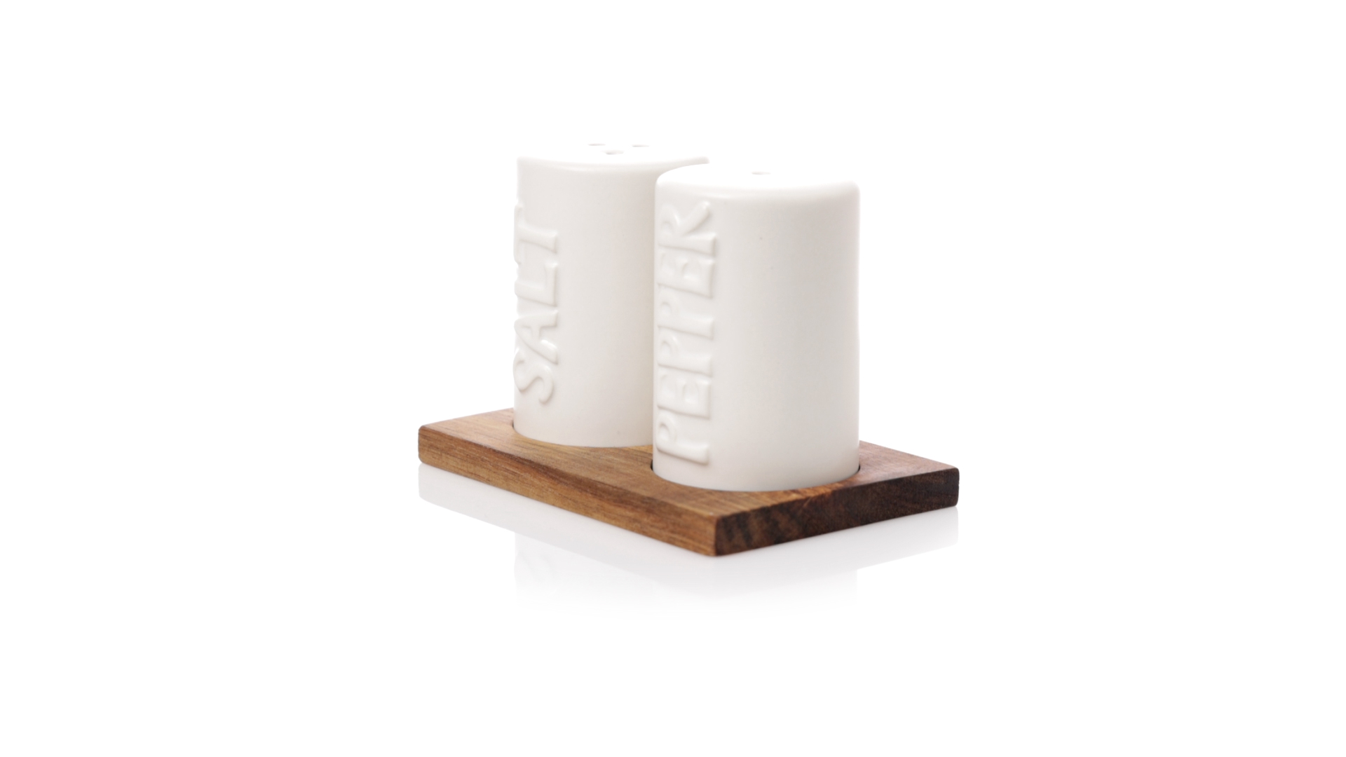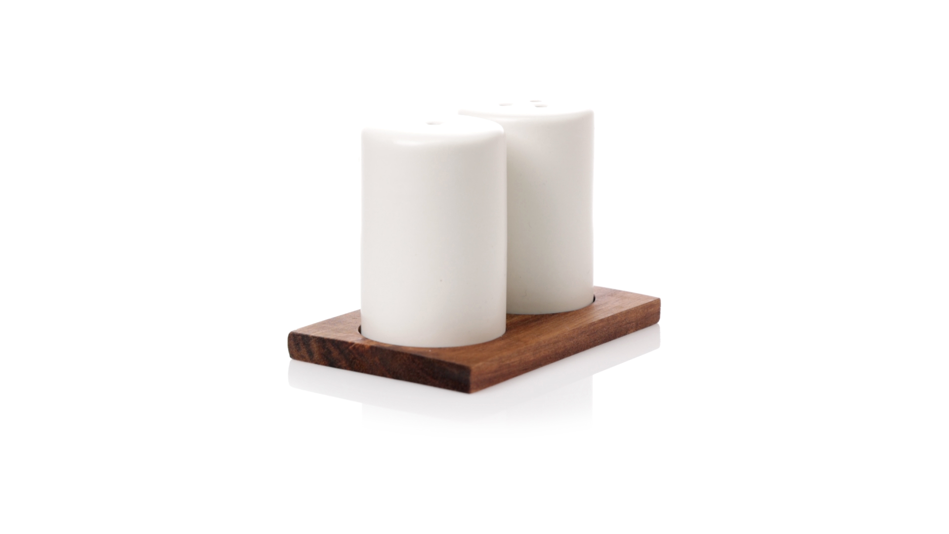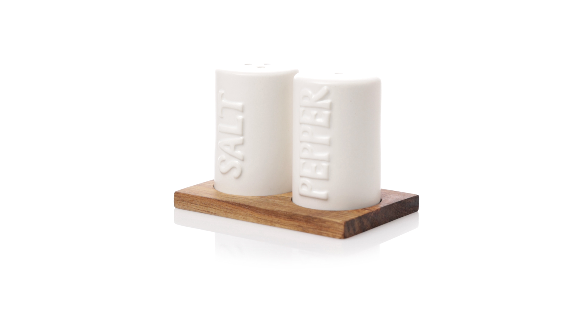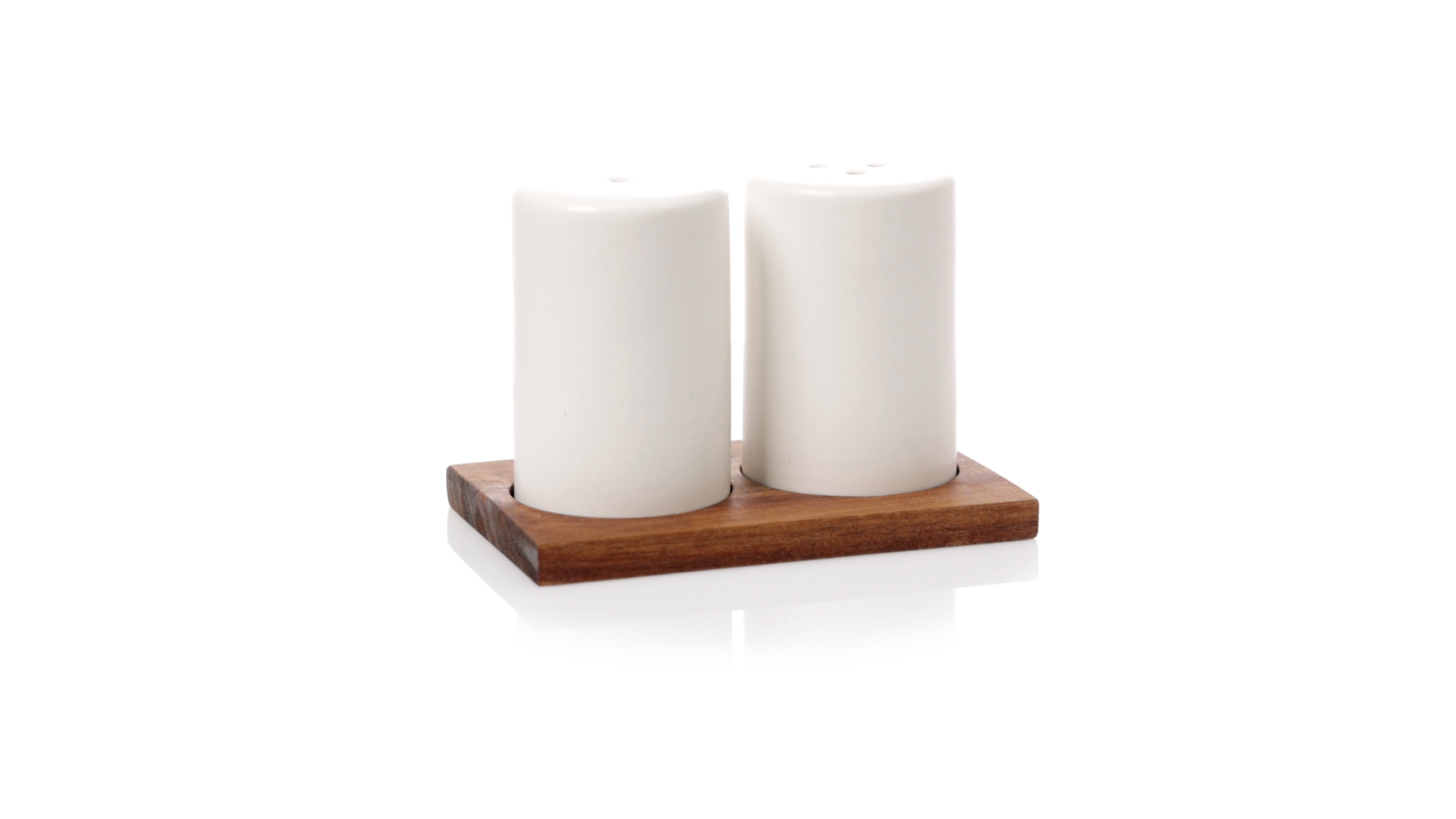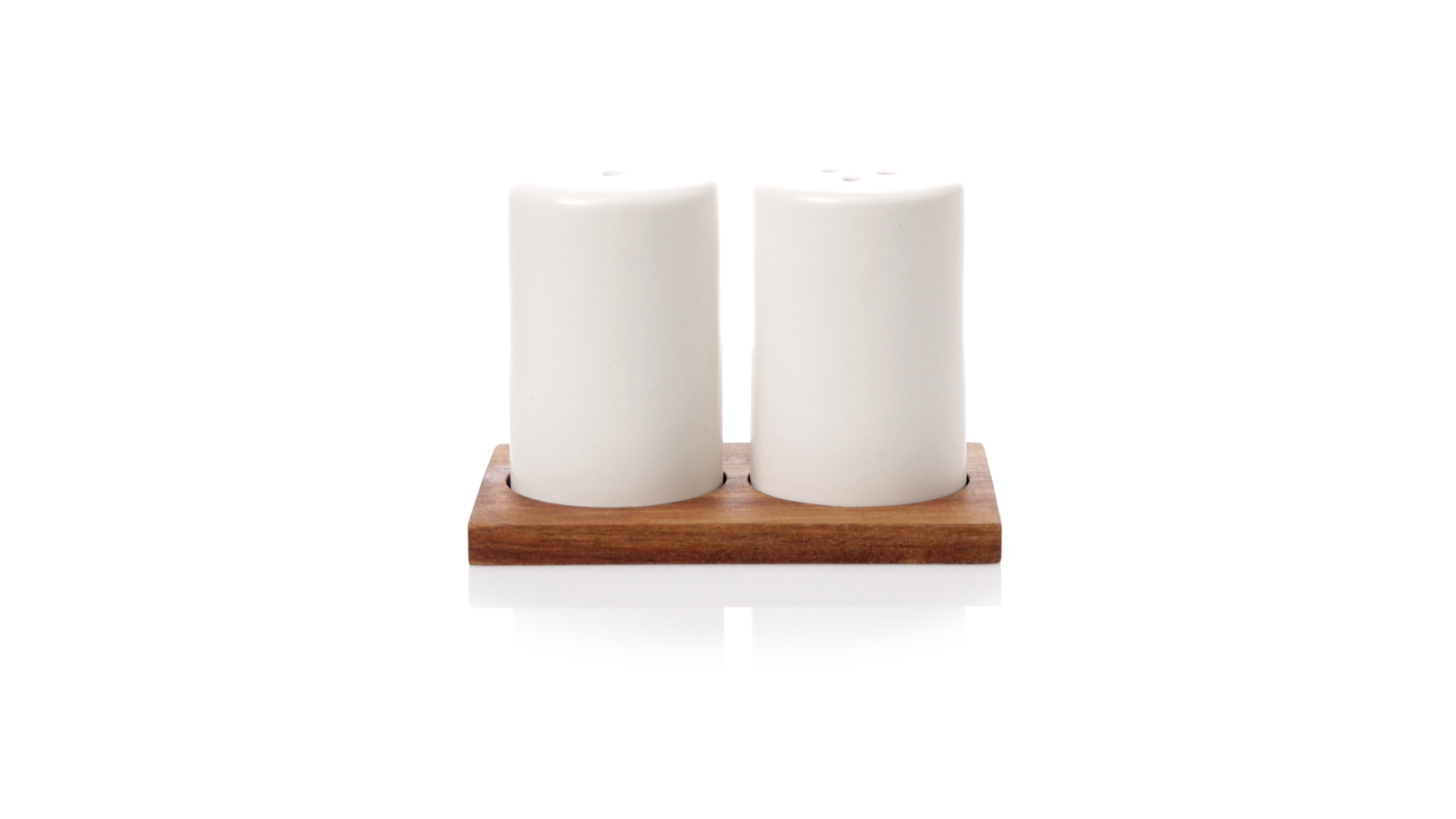 Set aus Salz- und Pfefferstreuern in Weiss und aus Keramik. Inklusive Sockel aus natürlichem Akazienholz, passend zu den Salz- und Pfefferstreuern gestanzt. Präsentiert in einer individuellen Kraft-Design-Box.