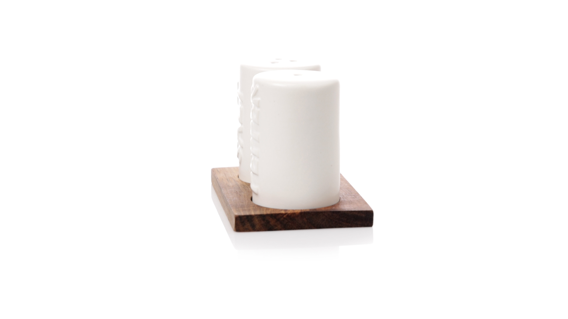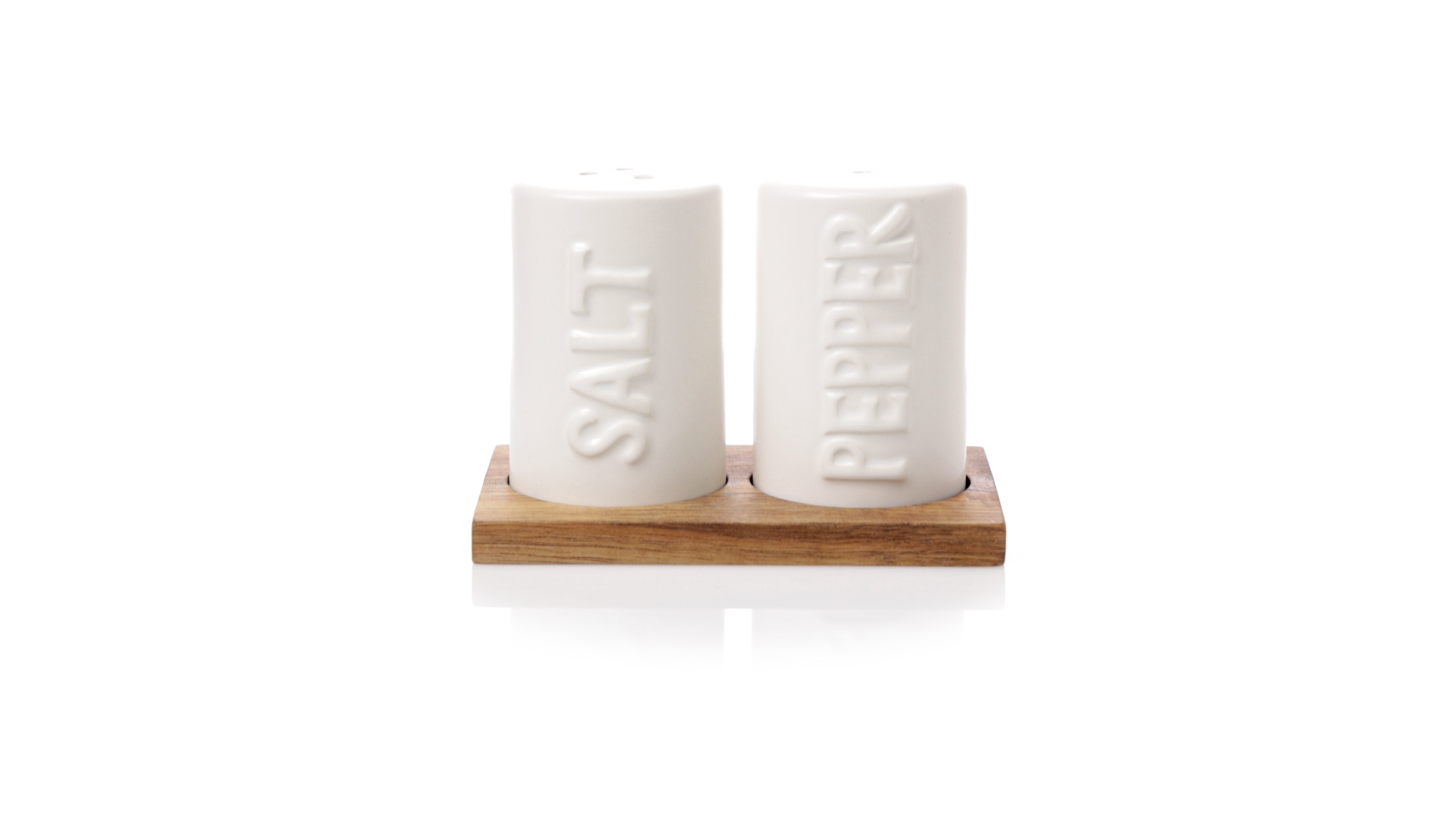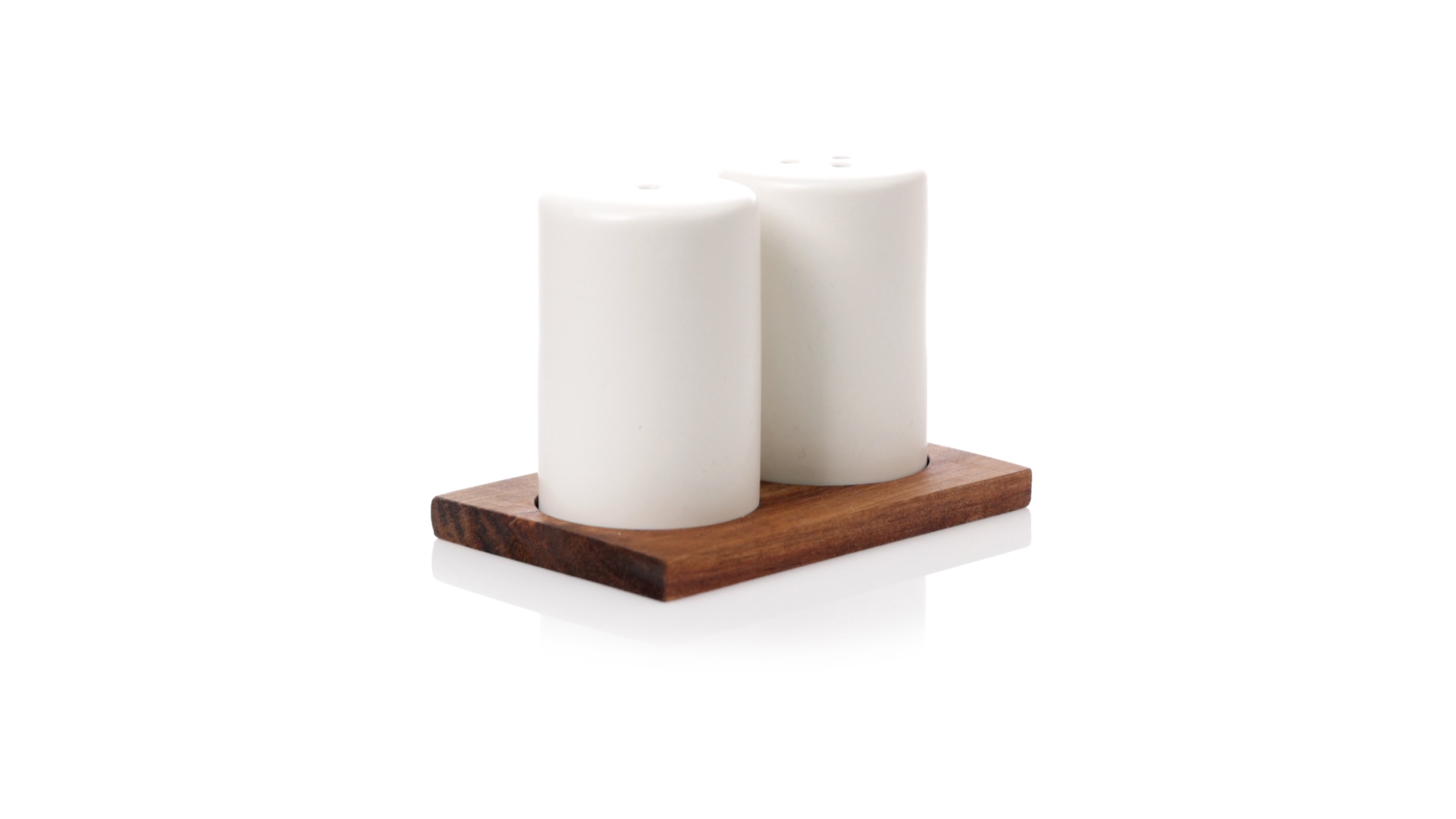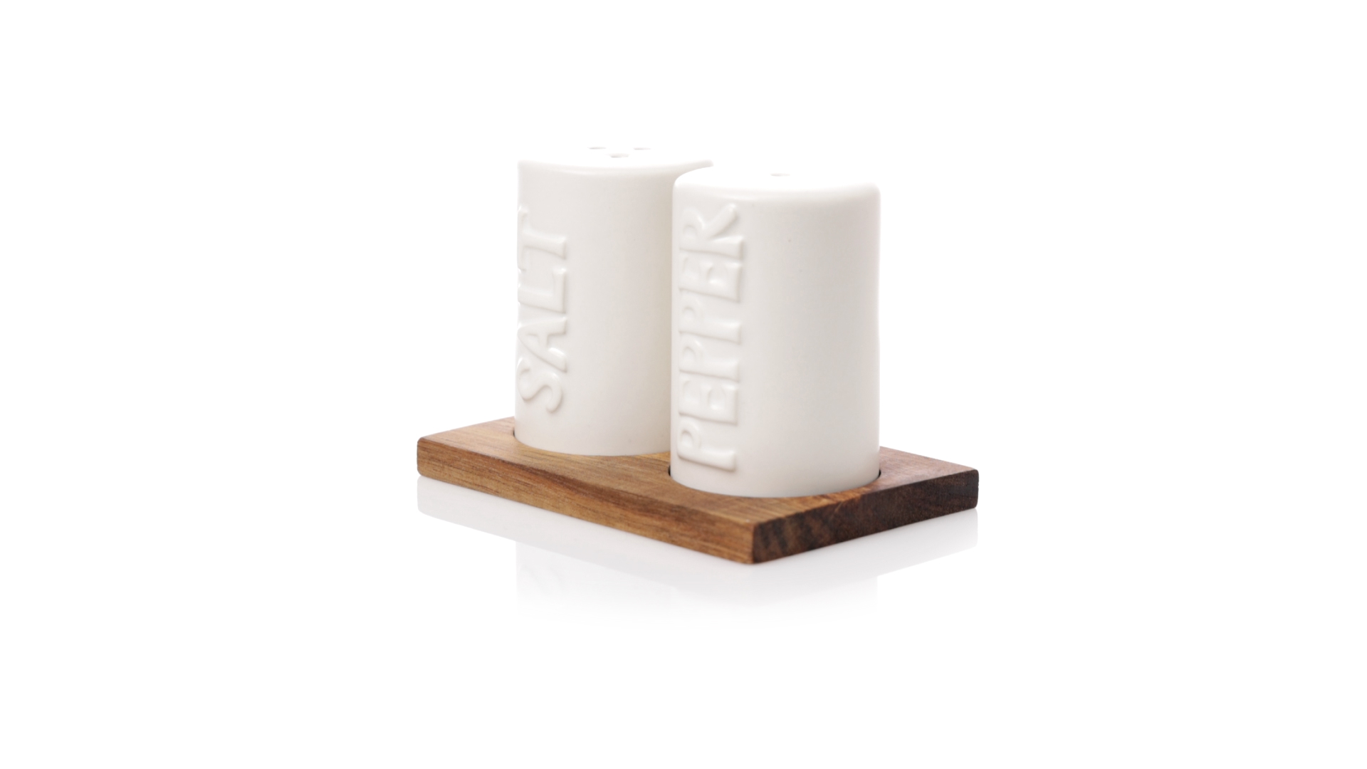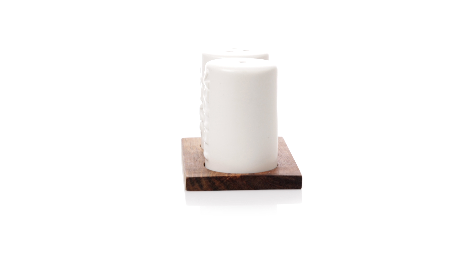 Set aus Salz- und Pfefferstreuern in Weiss und aus Keramik. Inklusive Sockel aus natürlichem Akazienholz, passend zu den Salz- und Pfefferstreuern gestanzt. Präsentiert in einer individuellen Kraft-Design-Box.