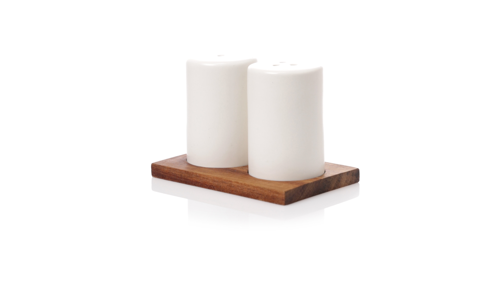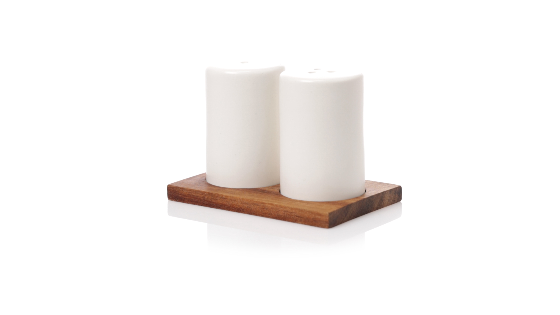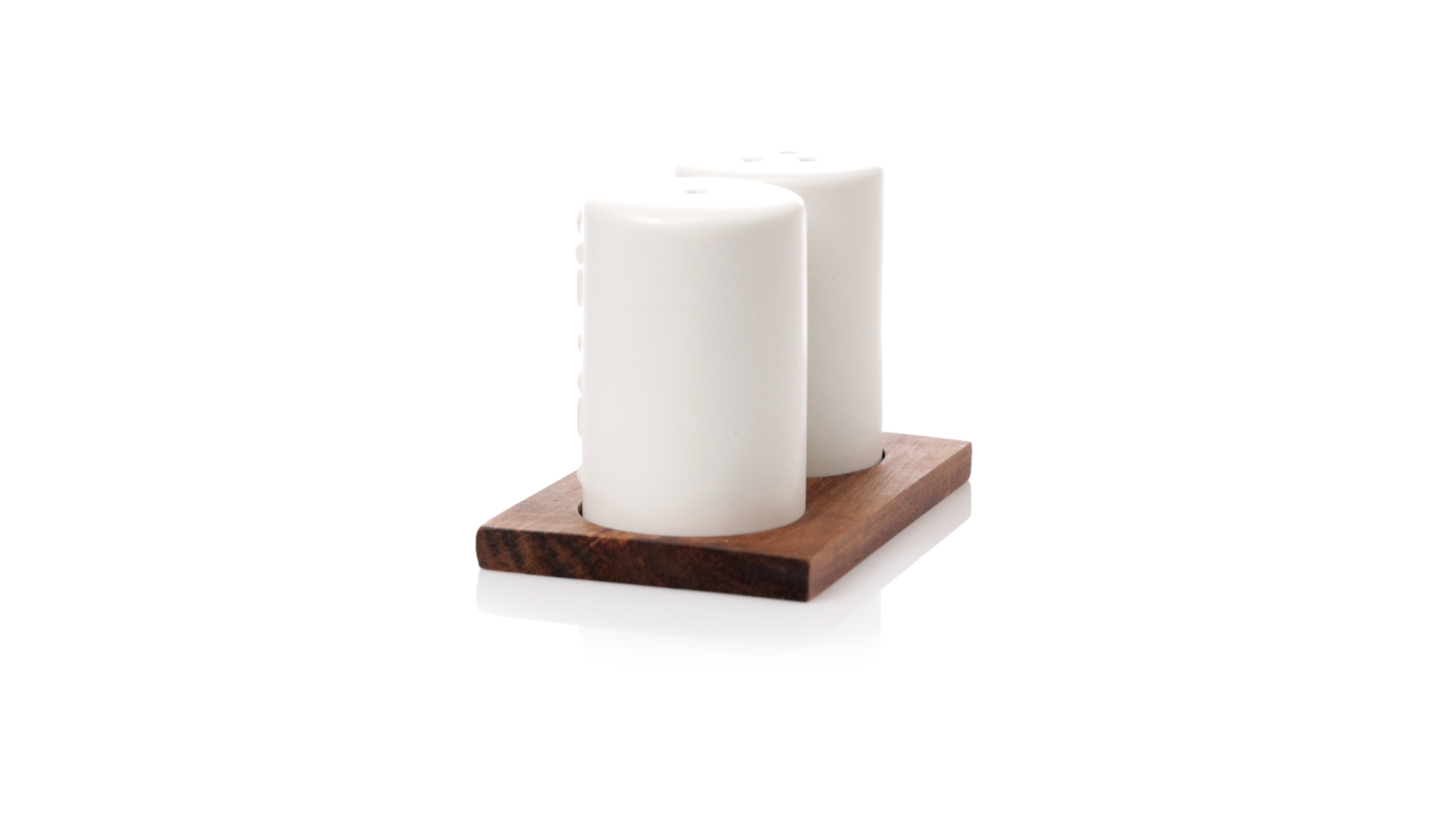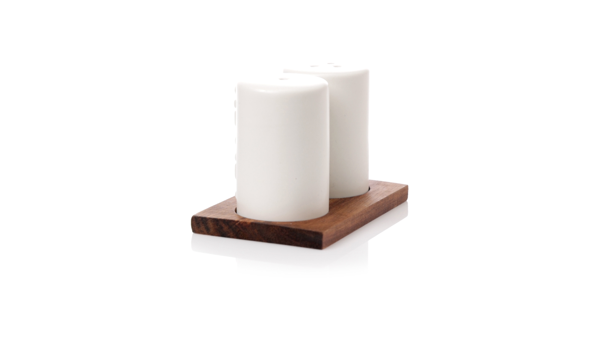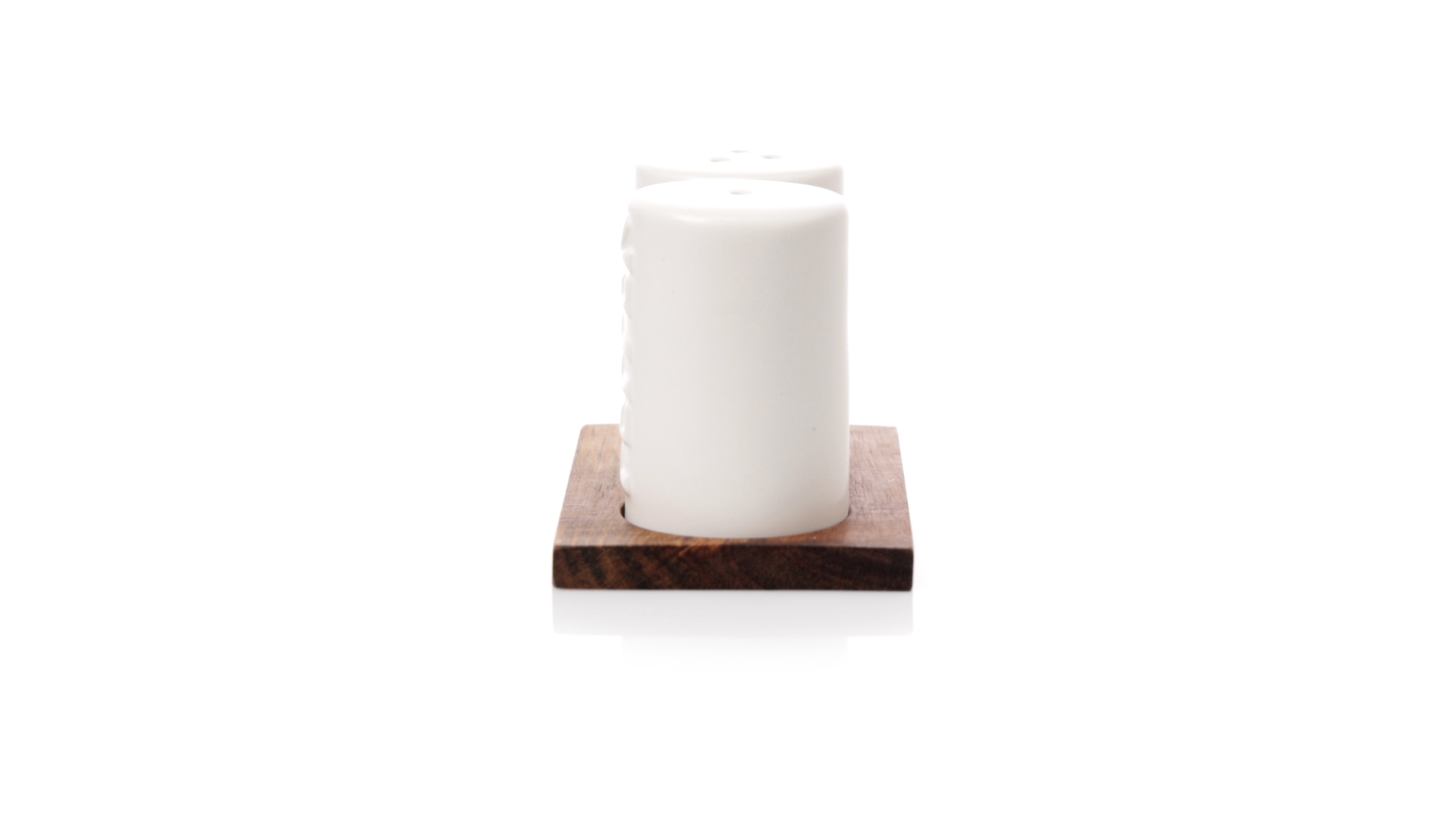 Set aus Salz- und Pfefferstreuern in Weiss und aus Keramik. Inklusive Sockel aus natürlichem Akazienholz, passend zu den Salz- und Pfefferstreuern gestanzt. Präsentiert in einer individuellen Kraft-Design-Box.
