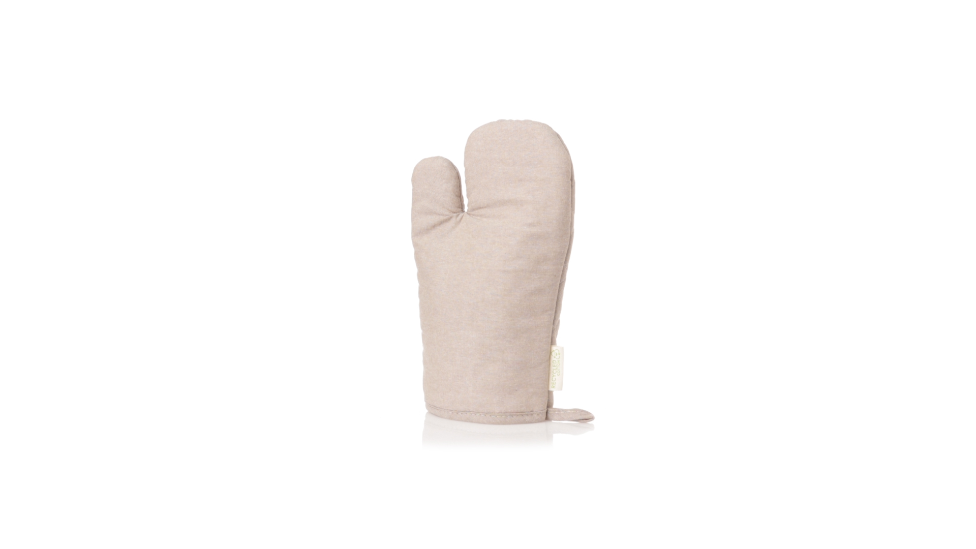 Linie Natur Küchenhandschuh. Hergestellt aus hochwertigem Material aus recycelter Baumwolle. Mit einer glatten Seite zum Bedrucken und einem Band zum Aufhängen. Unverwechselbares Etikett für recycelte Baumwolle.