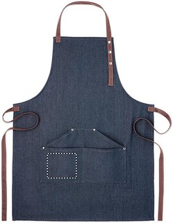 Küchenschürze mit verstellbarem Nackengurt und 3 Fronttaschen aus 240 g/m² Denim mit Bindegurt aus Baumwolle. Lieferung in individuellem Karton.