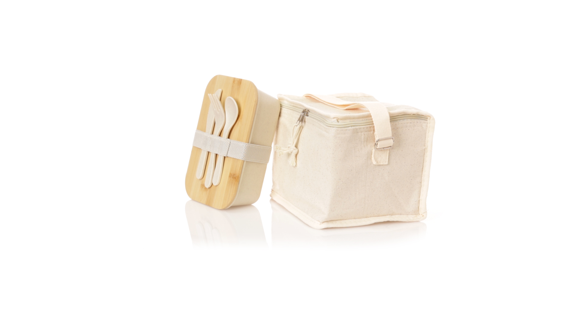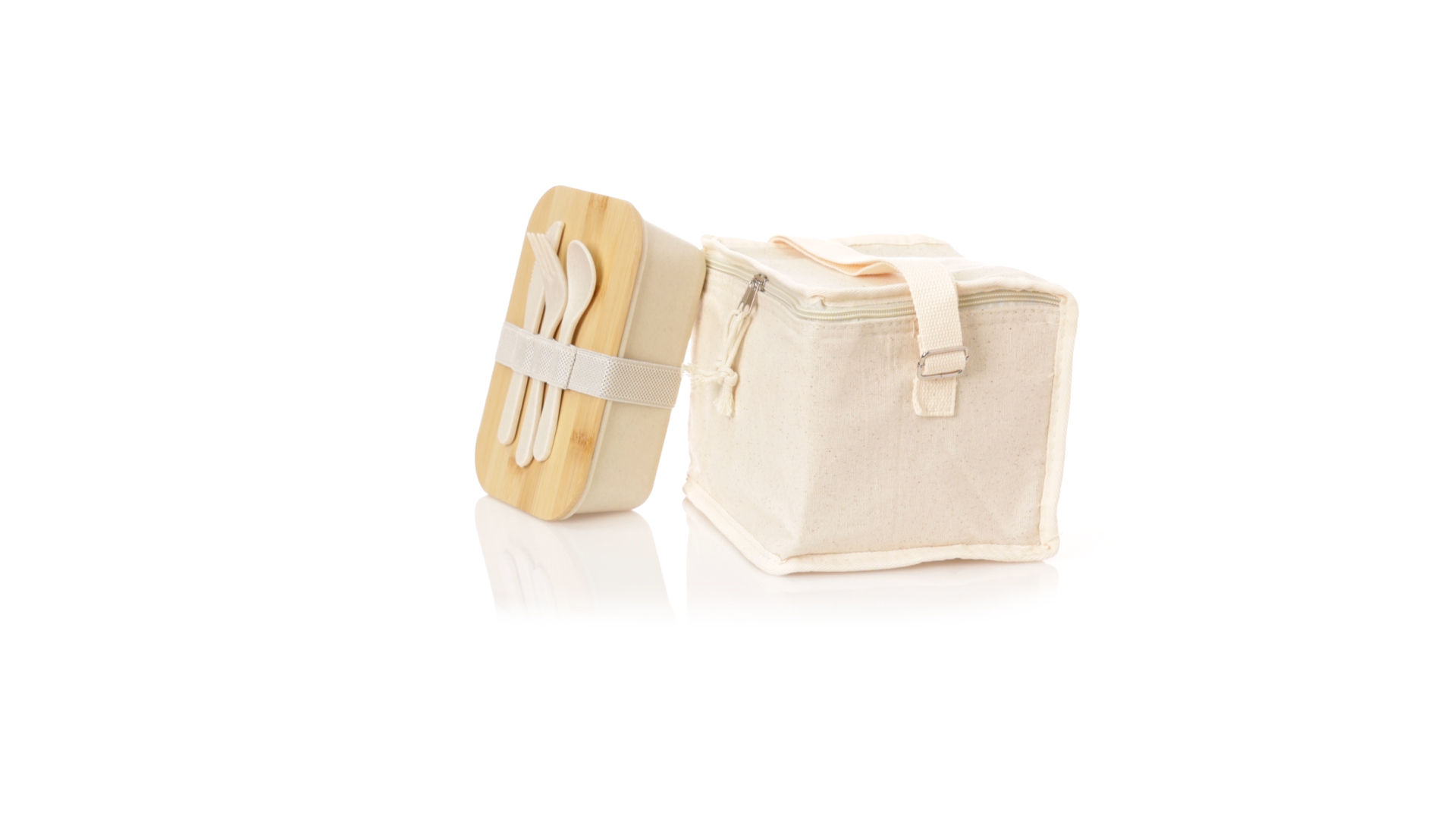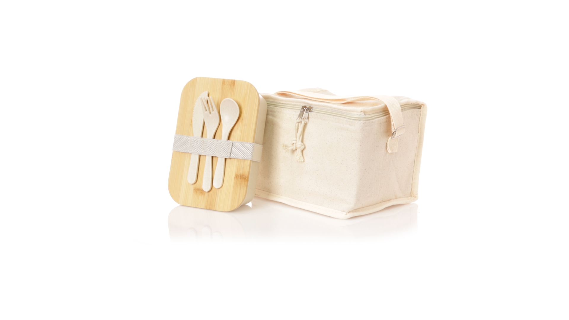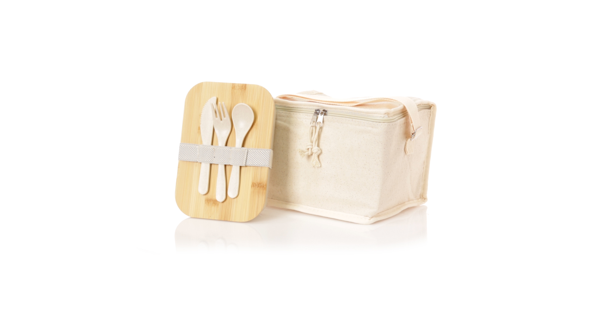 Set aus Lunchbox und Kühler der Linie Natur mit Lebensmittelzertifizierung, die die Sicherheit gewährleistet, wenn Lebensmittel mit dem zur Herstellung des Produkts verwendeten Material in Kontakt kommen. Einschliesslich:Kühlbox aus Baumwolle, mit isothermischer Innenseite aus Aluminium. Reissverschluss mit doppeltem Kordelzug und passendem Tragegriff.Lunchbox aus BPA-freiem, geädertem PP, mit Bambusdeckel und 1 l Fassungsvermögen. Gummiband-Sicherheitsverschluss, mit Fächern für Gabel, Löffel und Messer (im Lieferumfang enthalten).