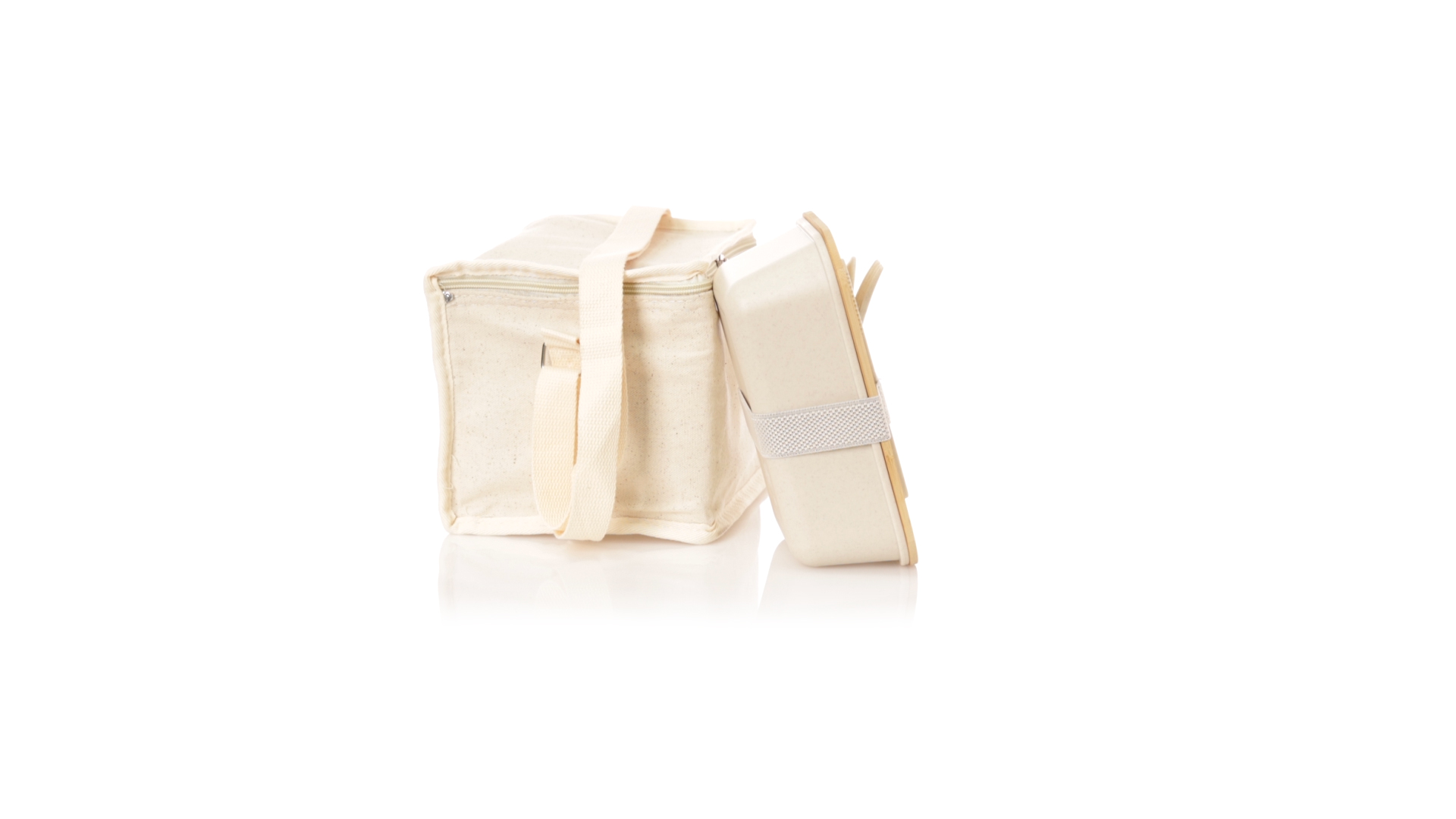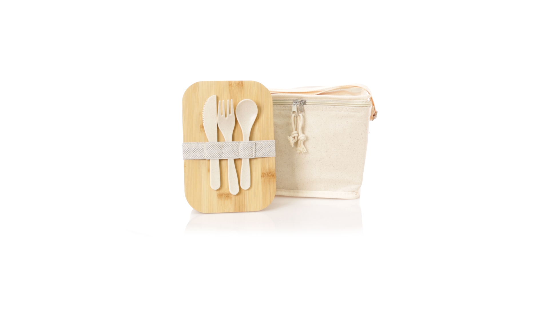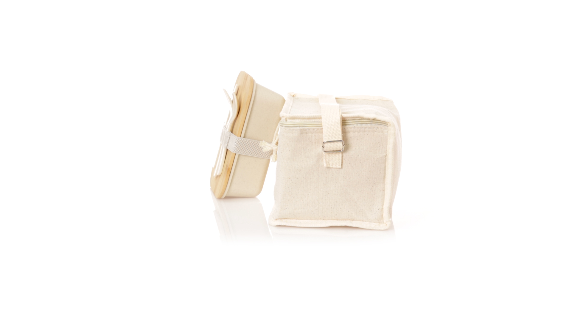 Set aus Lunchbox und Kühler der Linie Natur mit Lebensmittelzertifizierung, die die Sicherheit gewährleistet, wenn Lebensmittel mit dem zur Herstellung des Produkts verwendeten Material in Kontakt kommen. Einschliesslich:Kühlbox aus Baumwolle, mit isothermischer Innenseite aus Aluminium. Reissverschluss mit doppeltem Kordelzug und passendem Tragegriff.Lunchbox aus BPA-freiem, geädertem PP, mit Bambusdeckel und 1 l Fassungsvermögen. Gummiband-Sicherheitsverschluss, mit Fächern für Gabel, Löffel und Messer (im Lieferumfang enthalten).