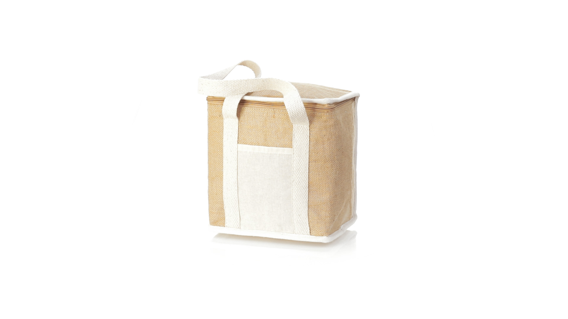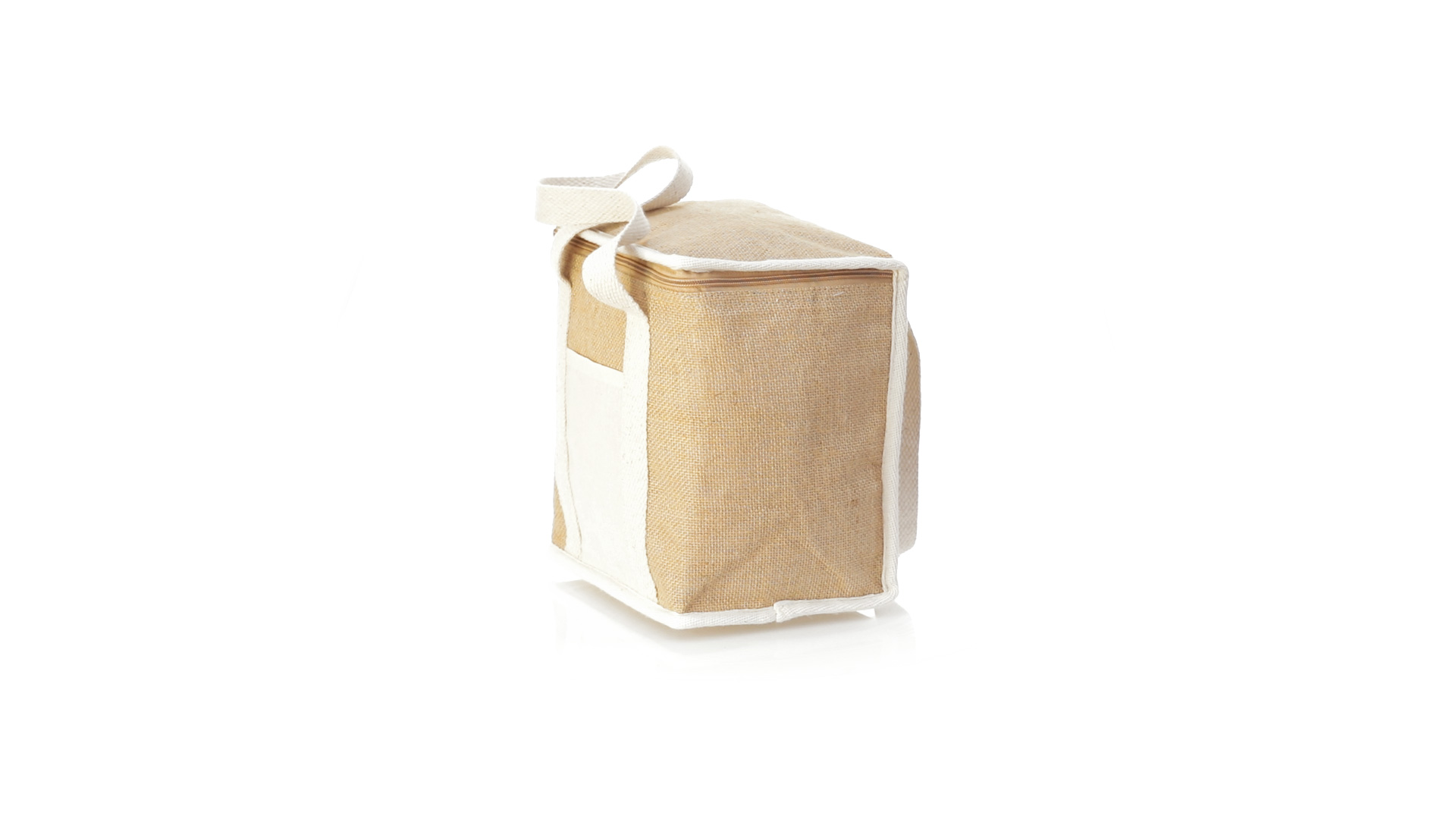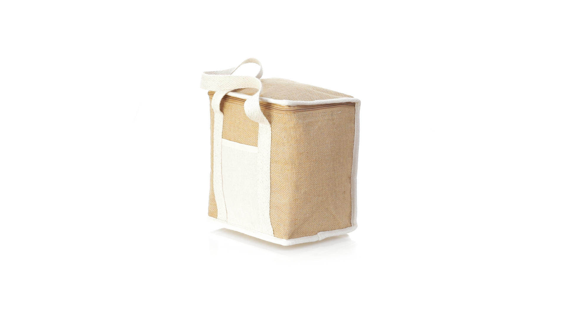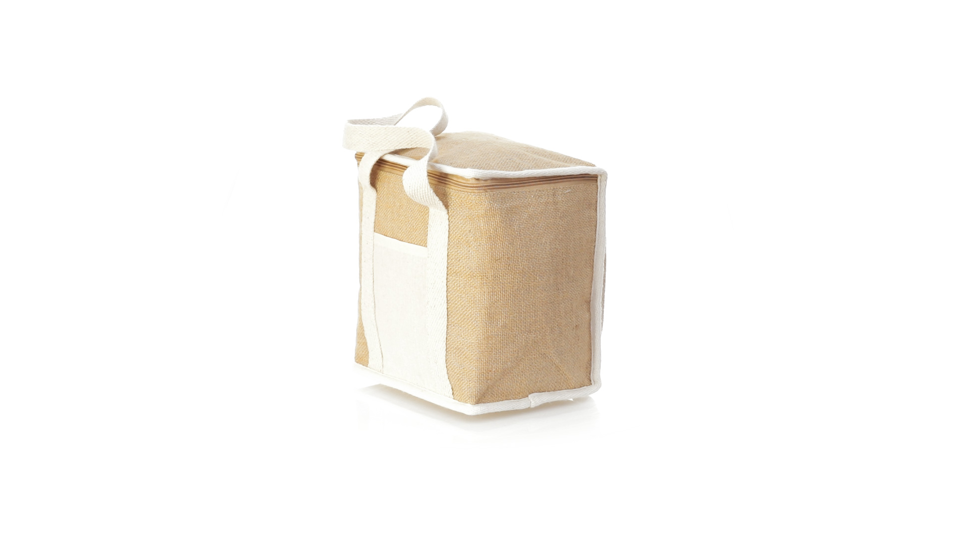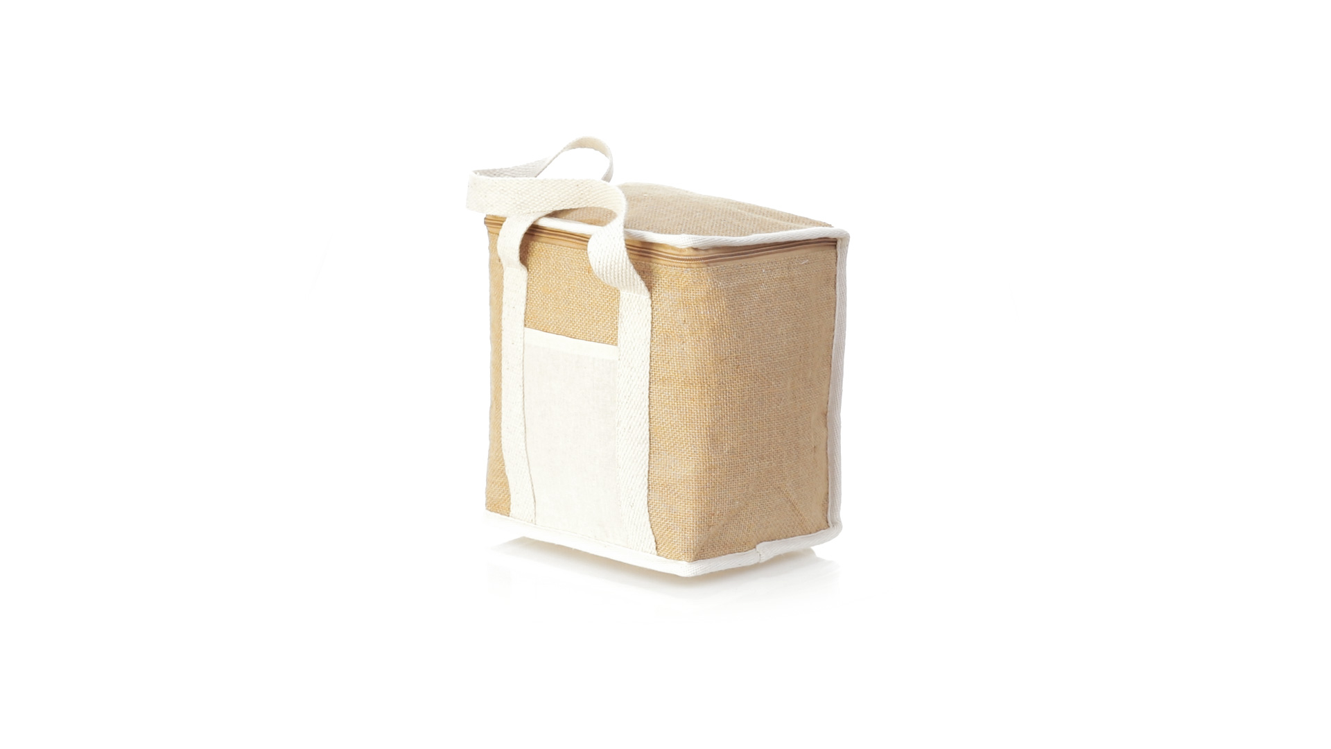 Nature Line Kühltasche mit extra Höhe. Hergestellt aus laminierter, feuchtigkeitsbeständiger Jute, mit isothermischer Innenausstattung aus Aluminium und passendem Reissverschluss. Griffe und Aussentasche für Baumwollmarkierung.