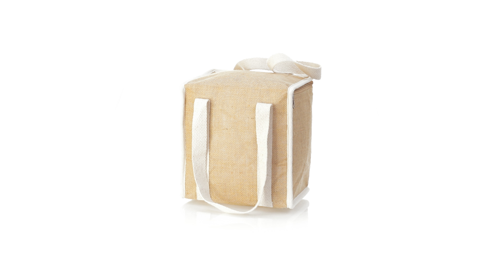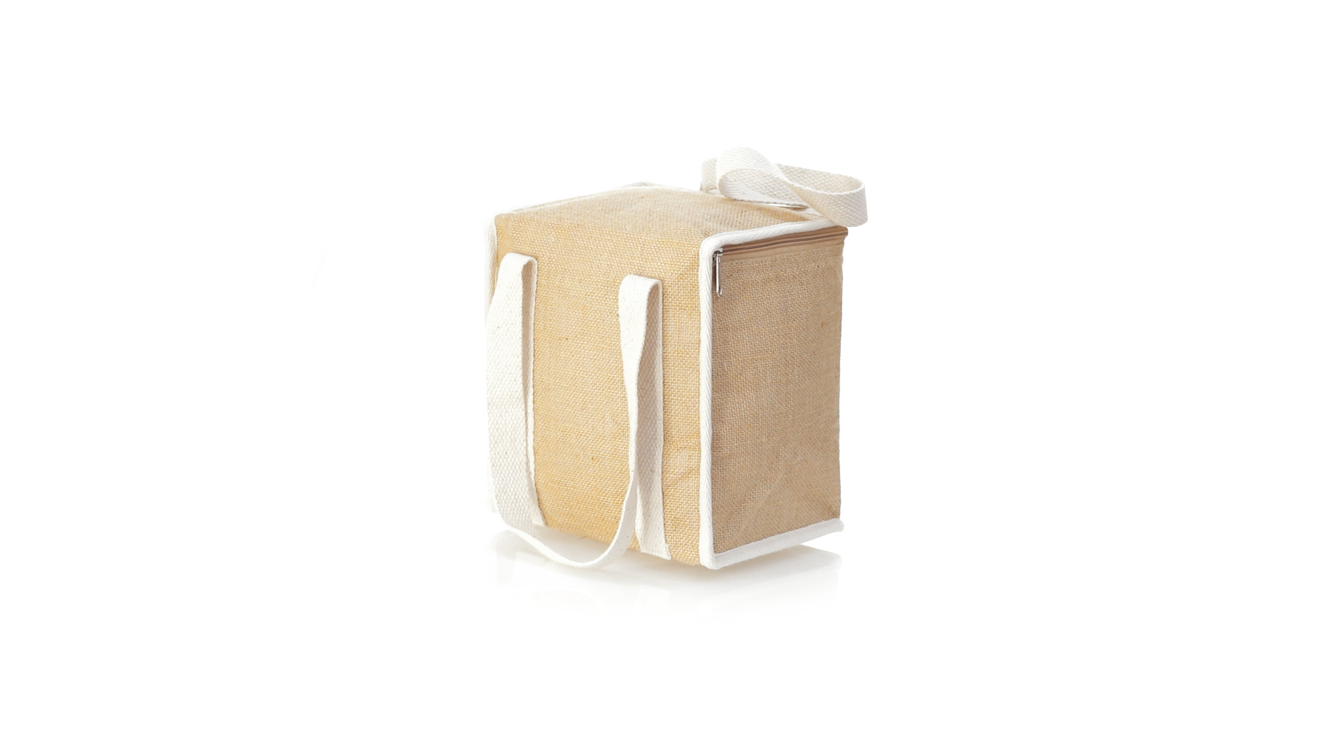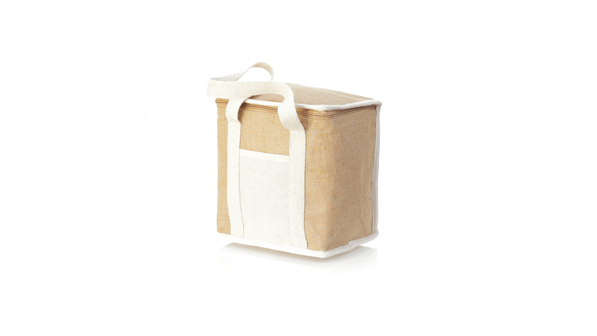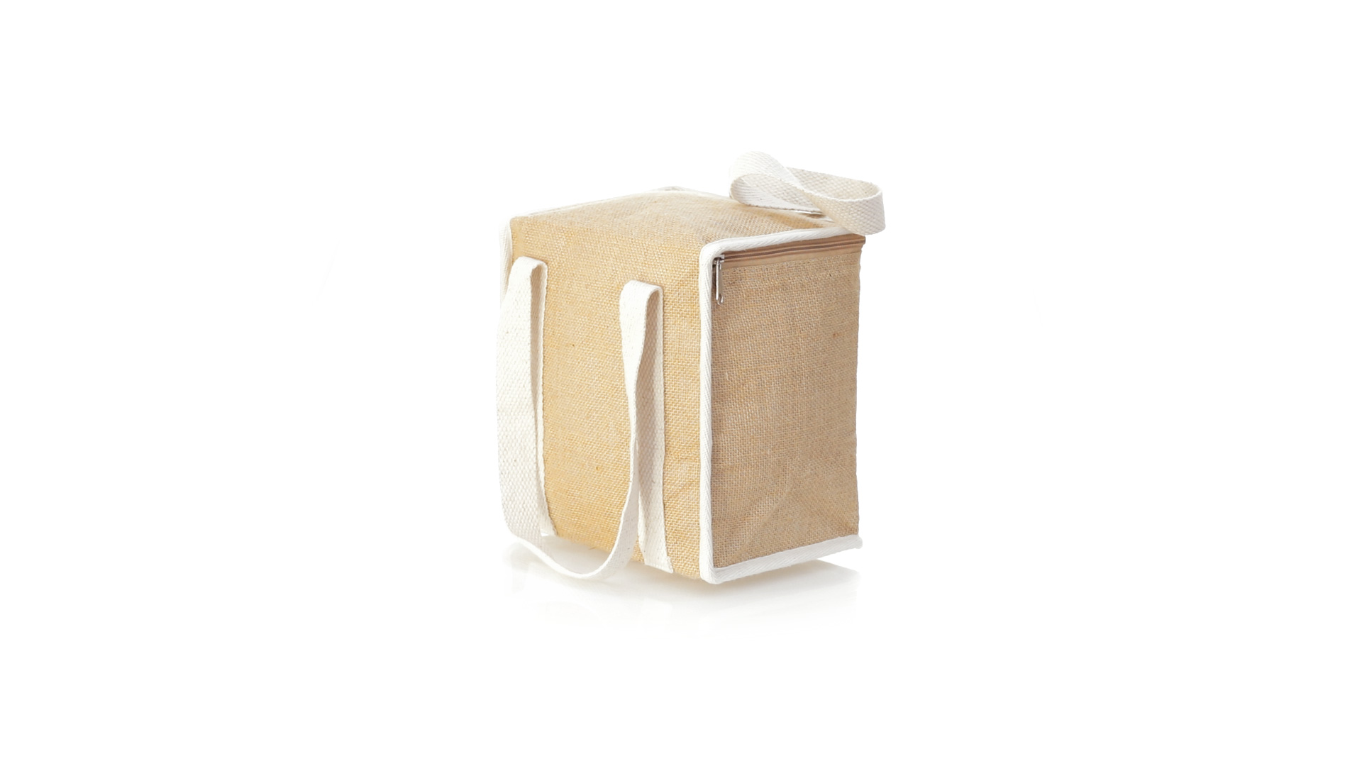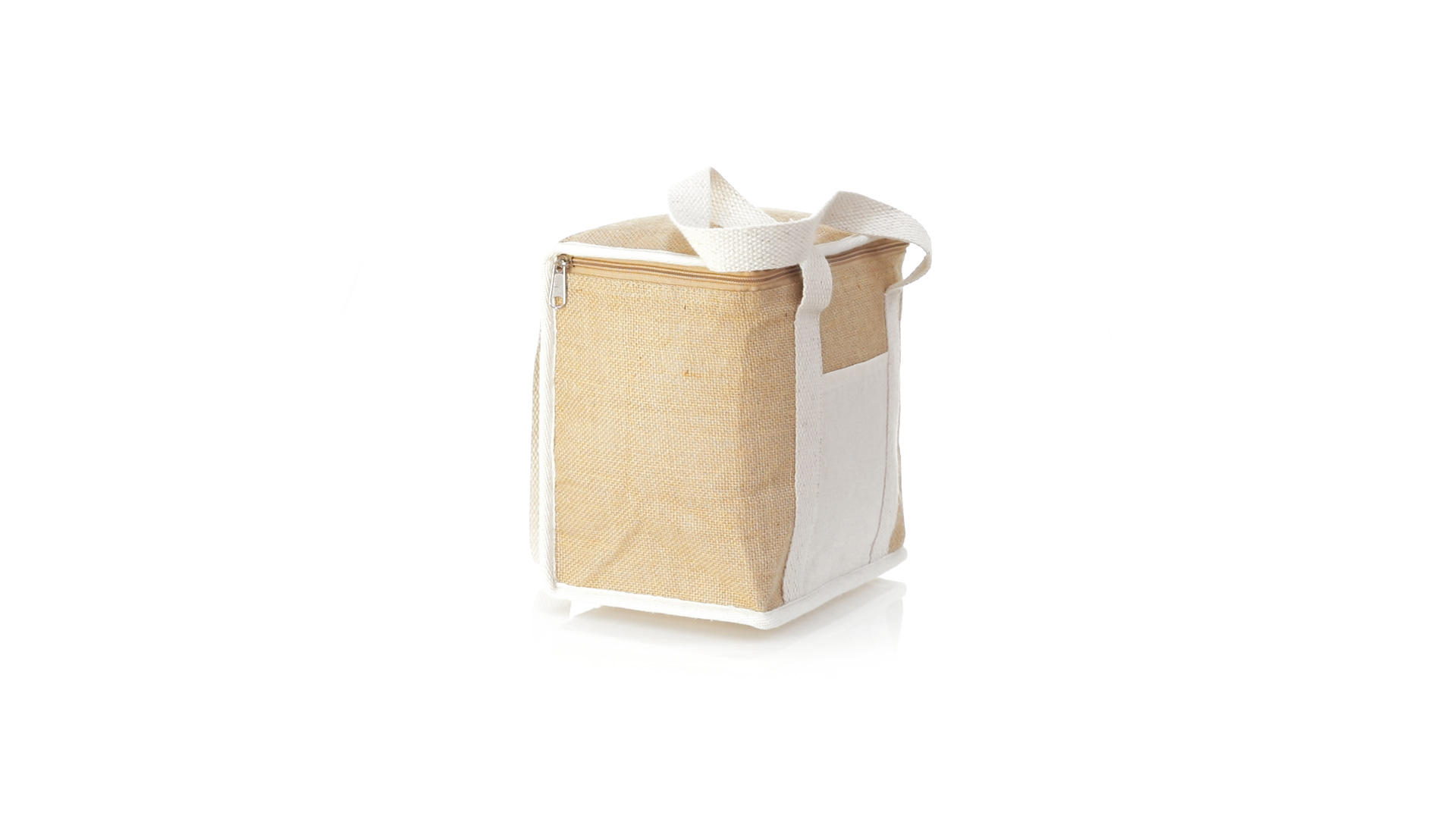 Nature Line Kühltasche mit extra Höhe. Hergestellt aus laminierter, feuchtigkeitsbeständiger Jute, mit isothermischer Innenausstattung aus Aluminium und passendem Reissverschluss. Griffe und Aussentasche für Baumwollmarkierung.