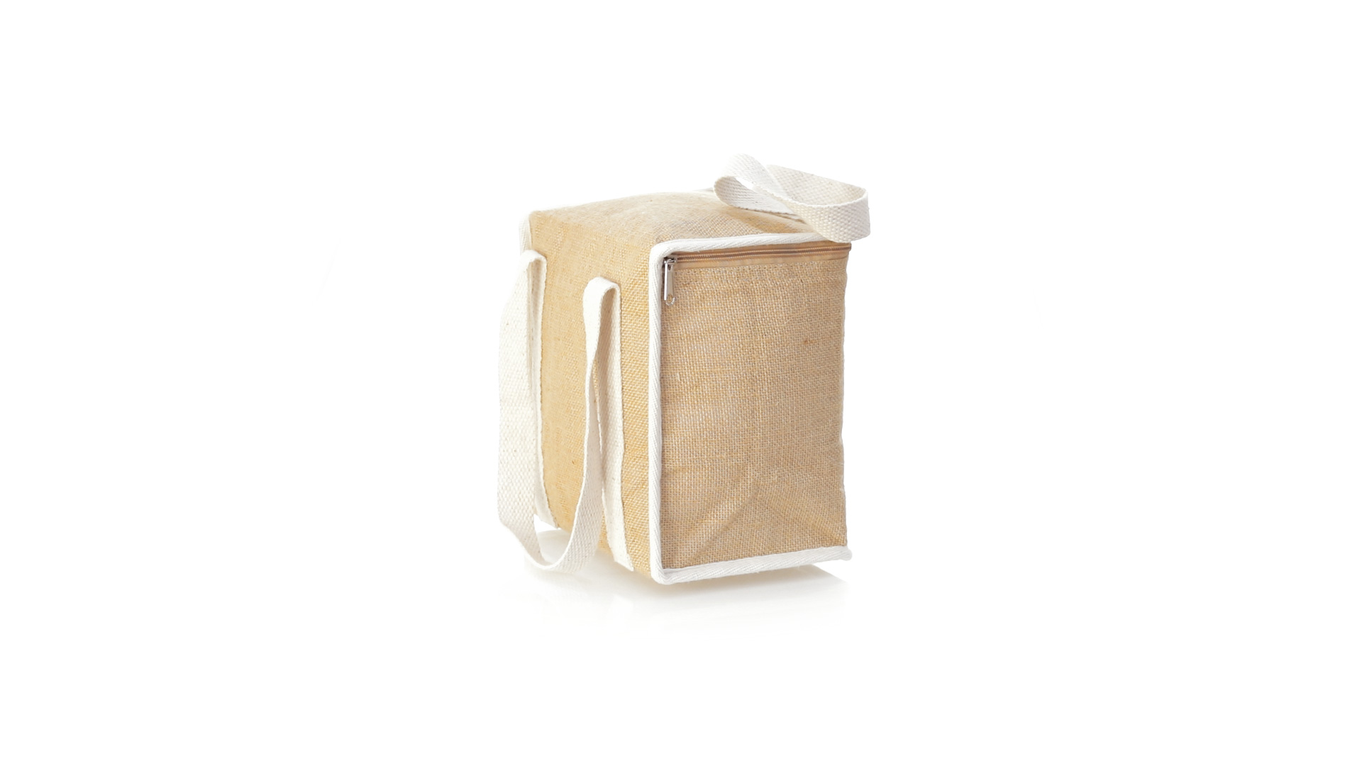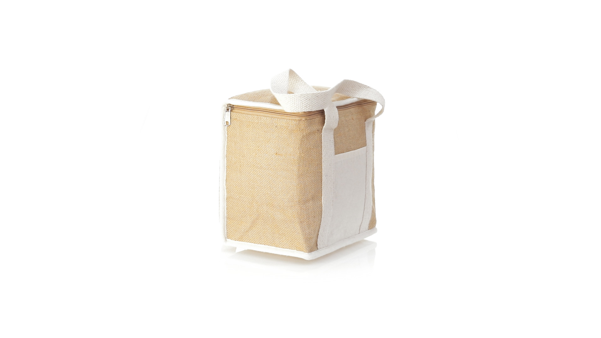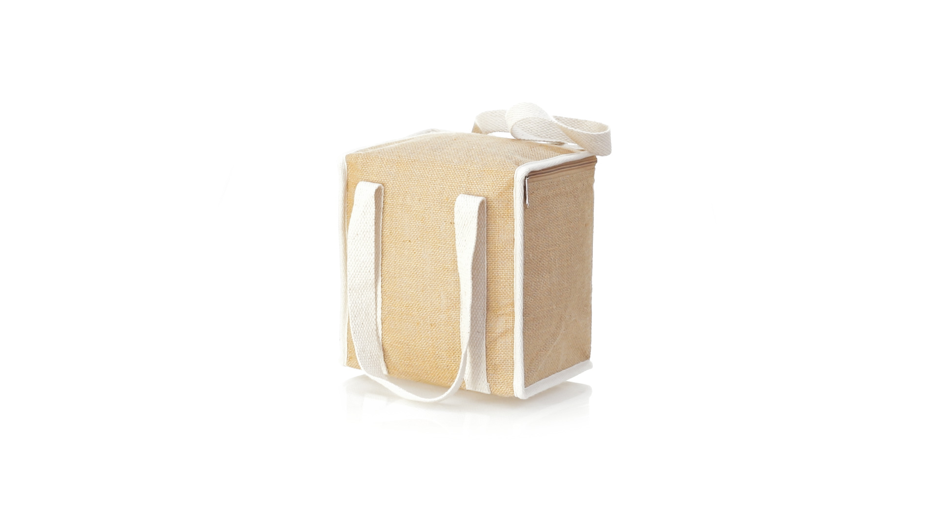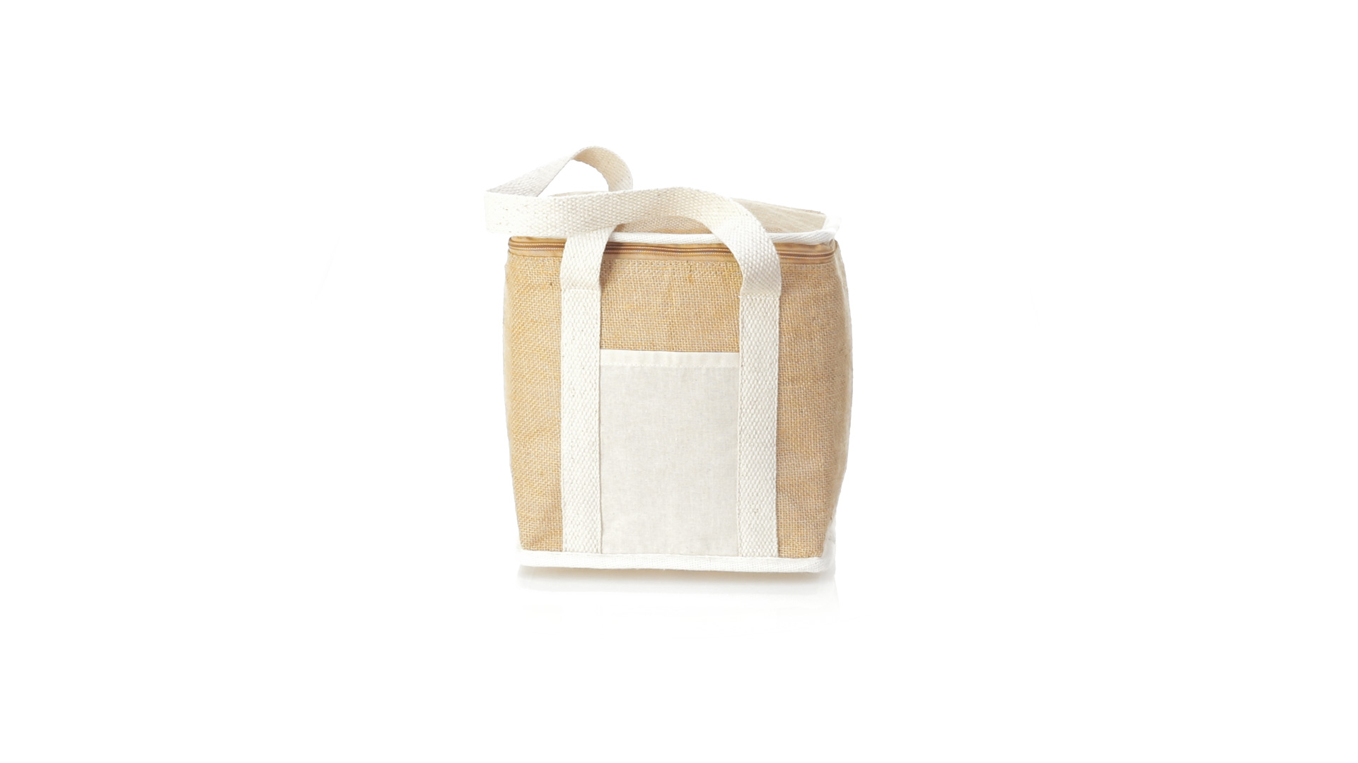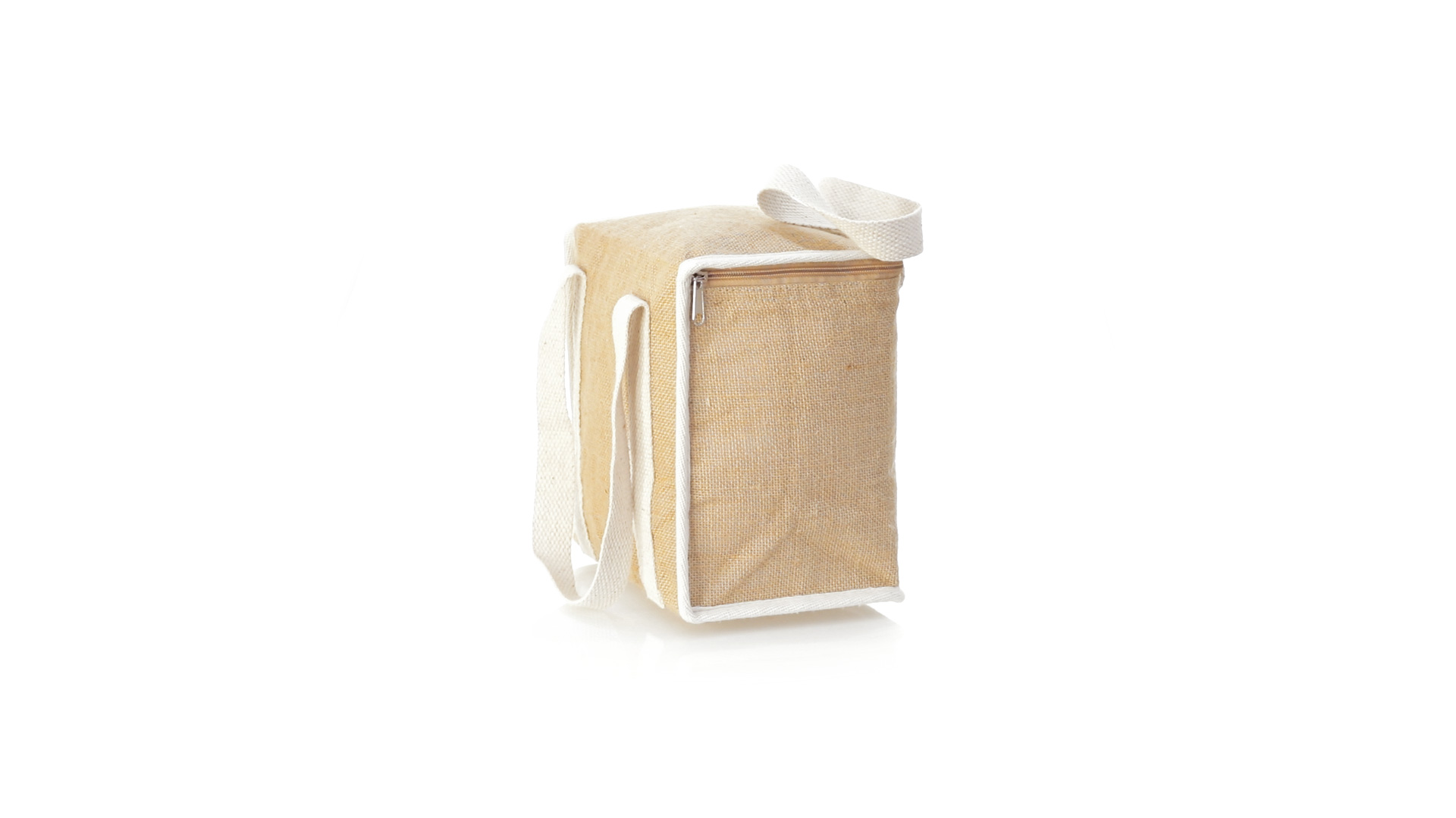 Nature Line Kühltasche mit extra Höhe. Hergestellt aus laminierter, feuchtigkeitsbeständiger Jute, mit isothermischer Innenausstattung aus Aluminium und passendem Reissverschluss. Griffe und Aussentasche für Baumwollmarkierung.