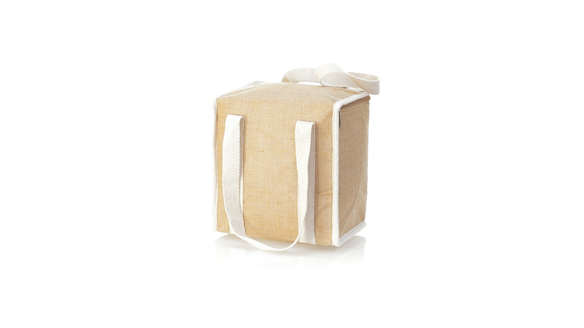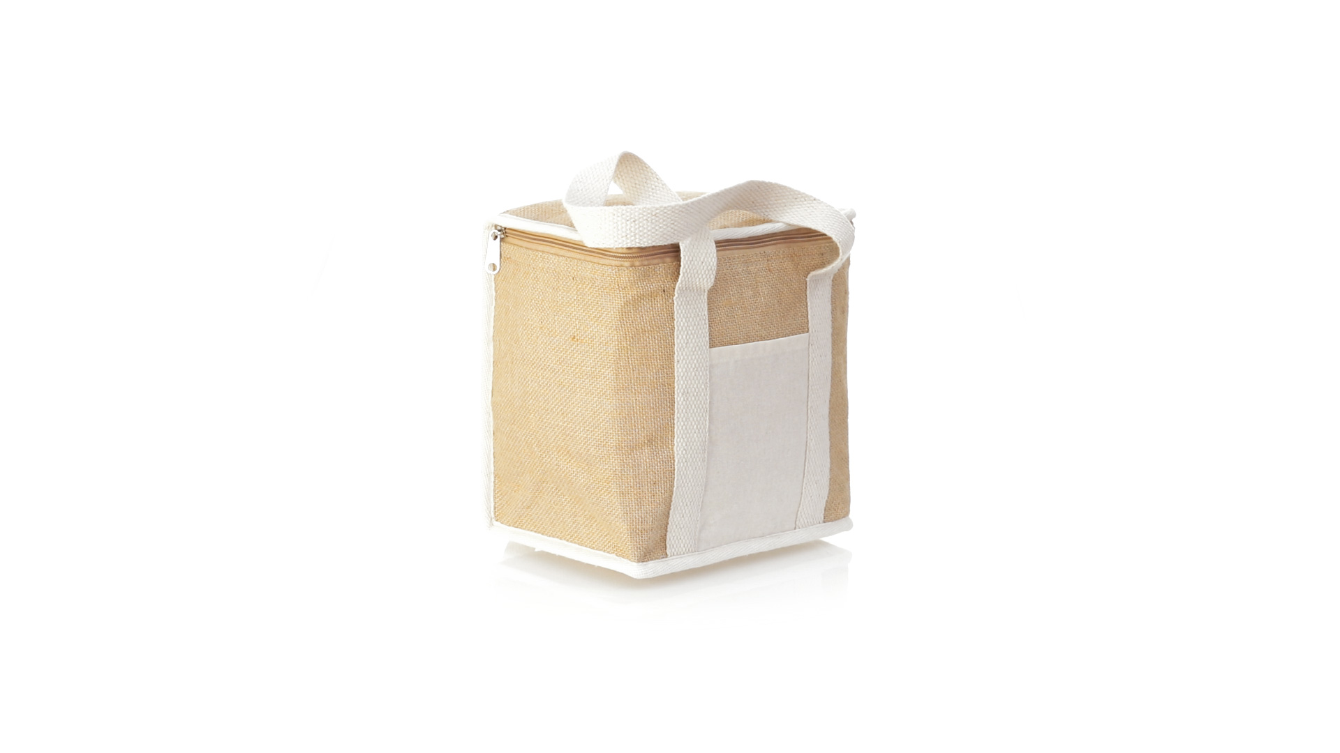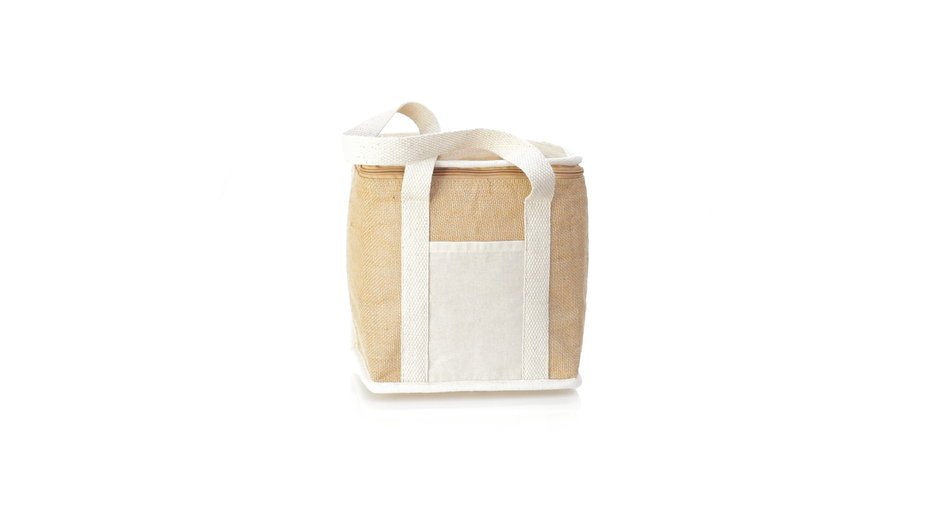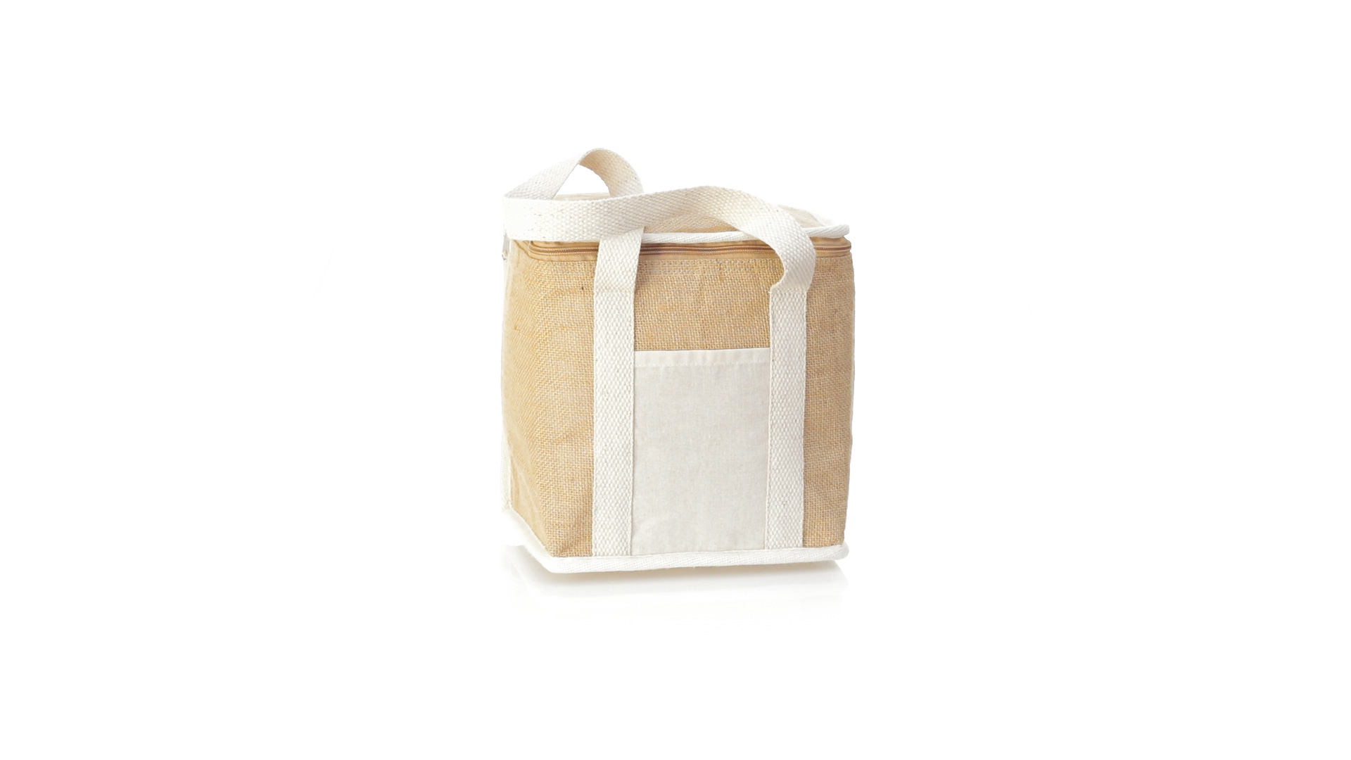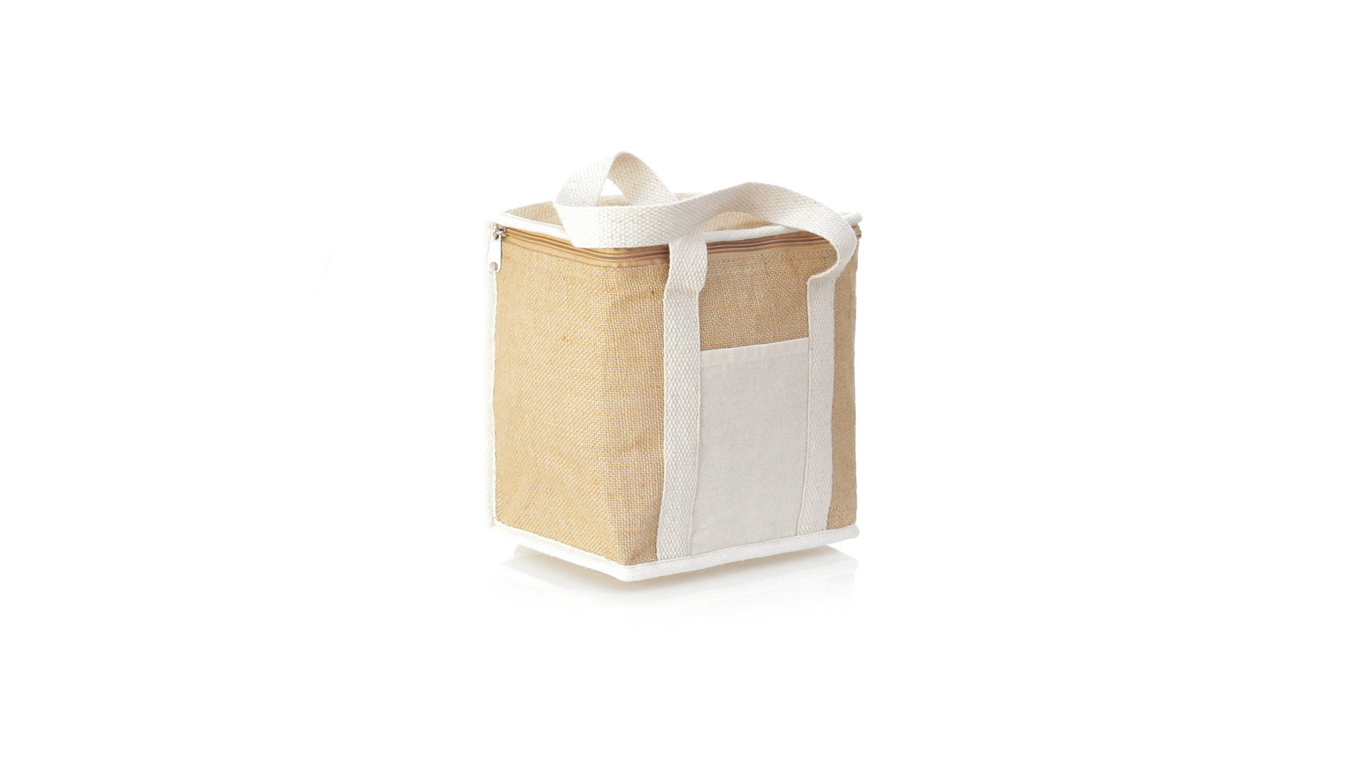 Nature Line Kühltasche mit extra Höhe. Hergestellt aus laminierter, feuchtigkeitsbeständiger Jute, mit isothermischer Innenausstattung aus Aluminium und passendem Reissverschluss. Griffe und Aussentasche für Baumwollmarkierung.