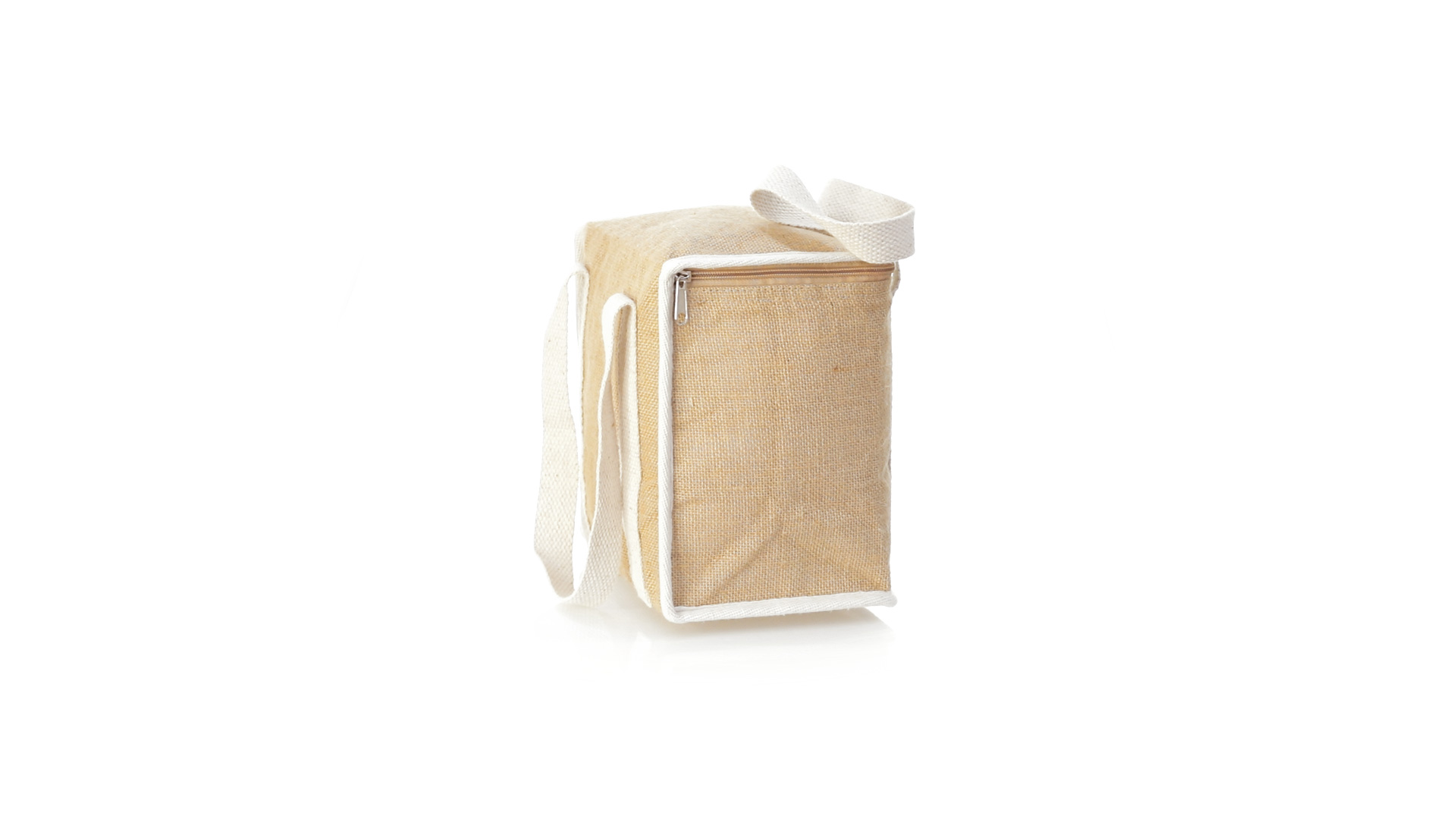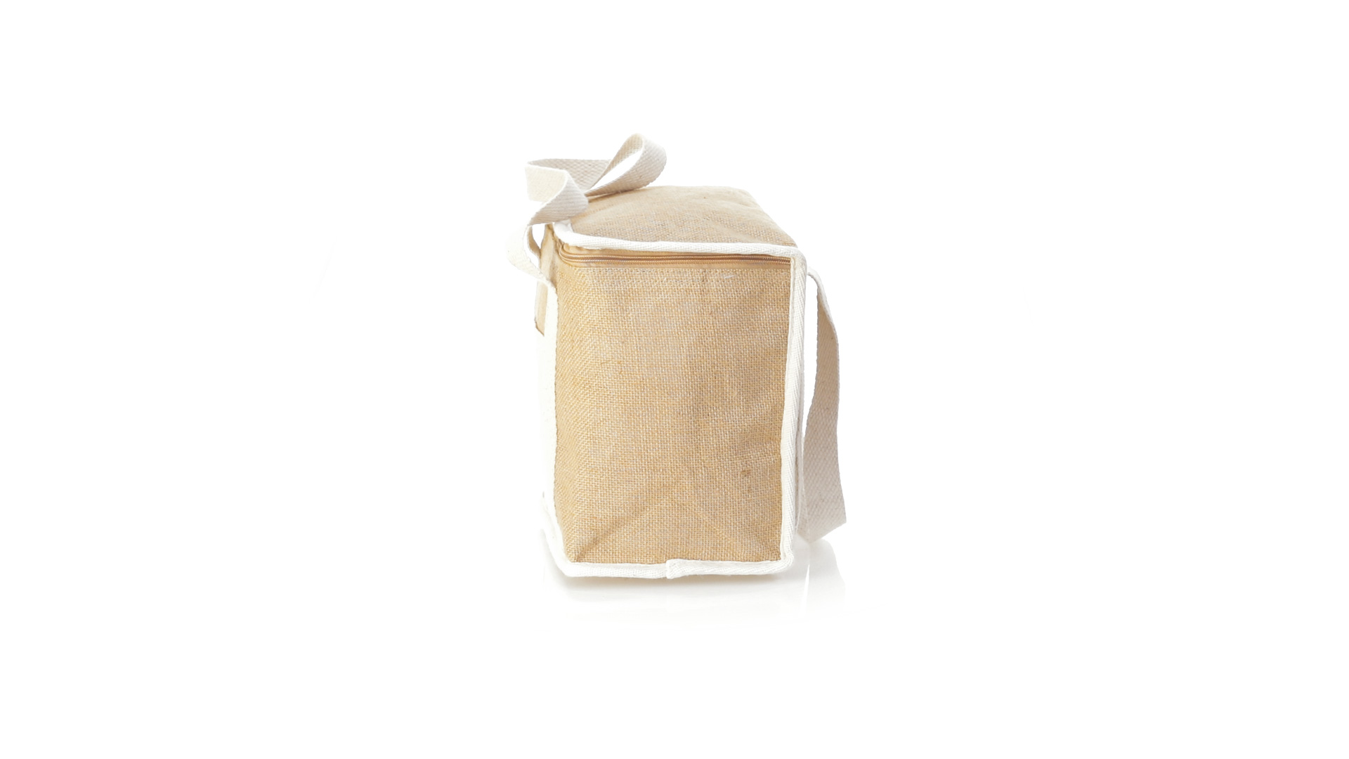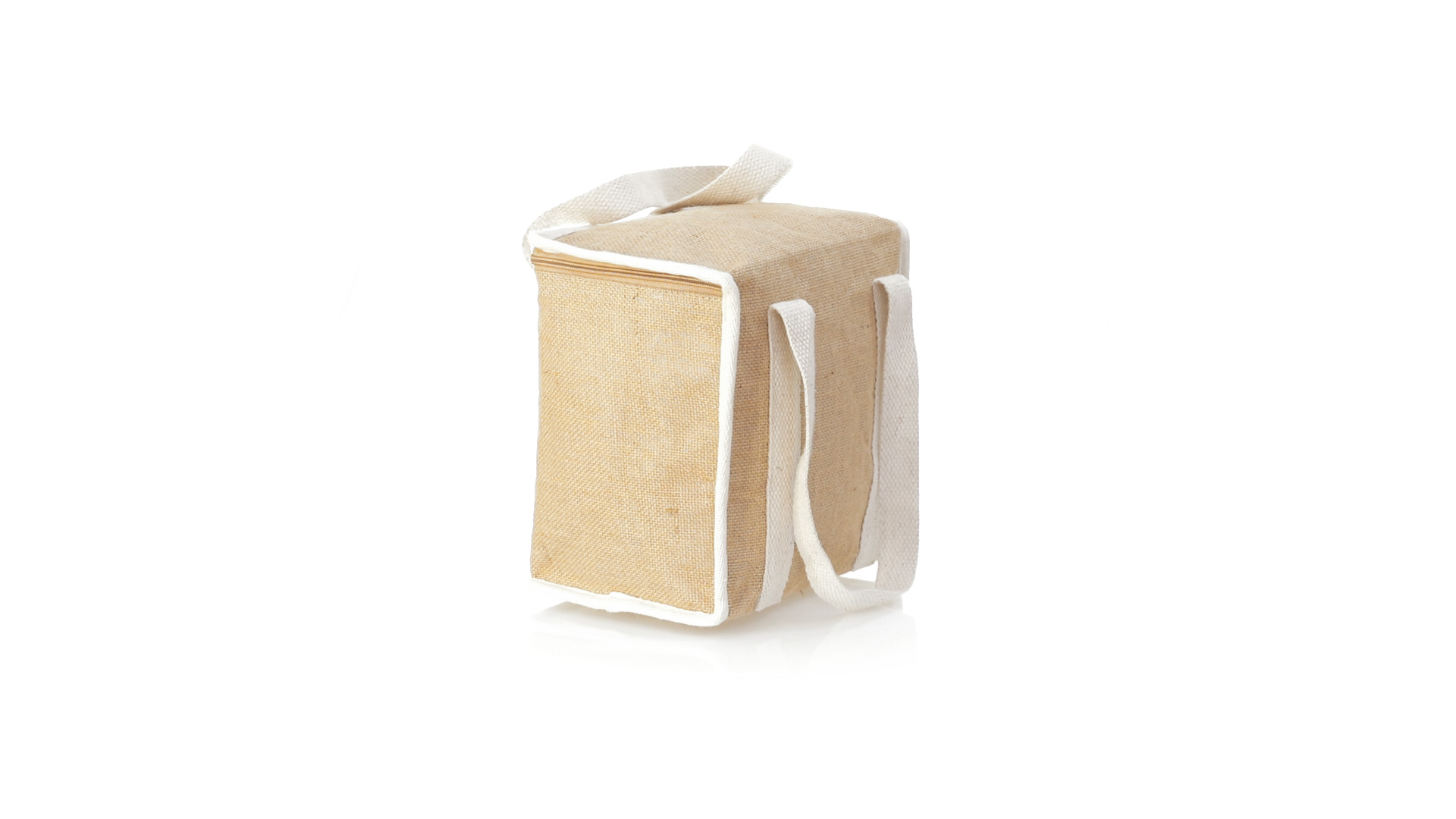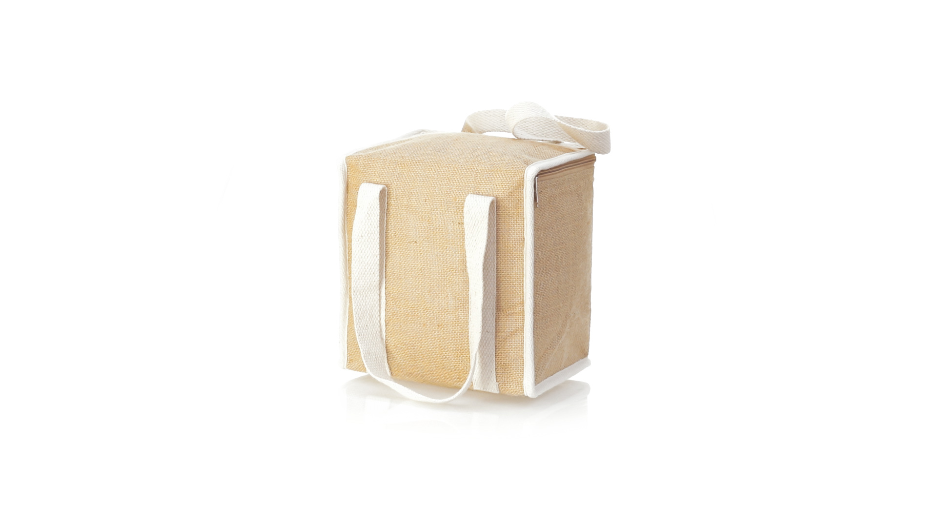 Nature Line Kühltasche mit extra Höhe. Hergestellt aus laminierter, feuchtigkeitsbeständiger Jute, mit isothermischer Innenausstattung aus Aluminium und passendem Reissverschluss. Griffe und Aussentasche für Baumwollmarkierung.