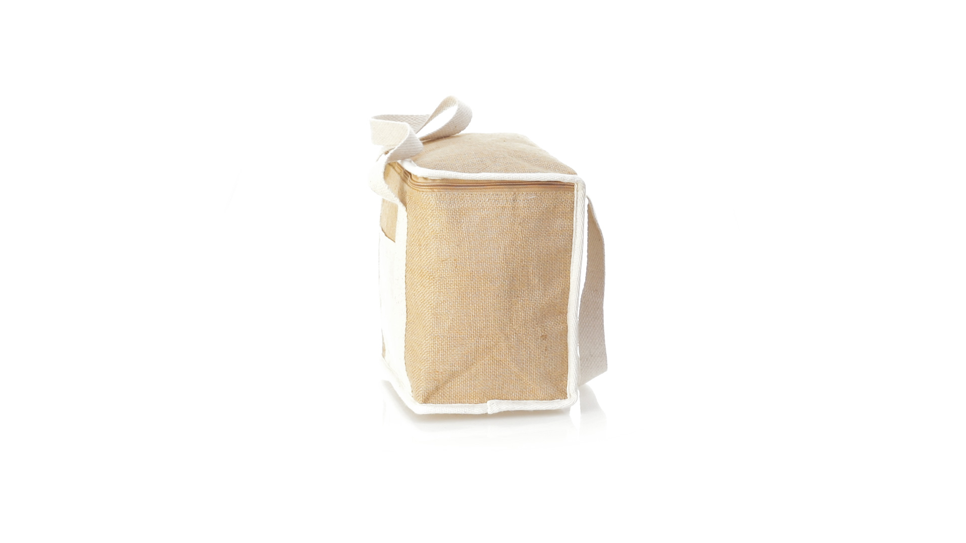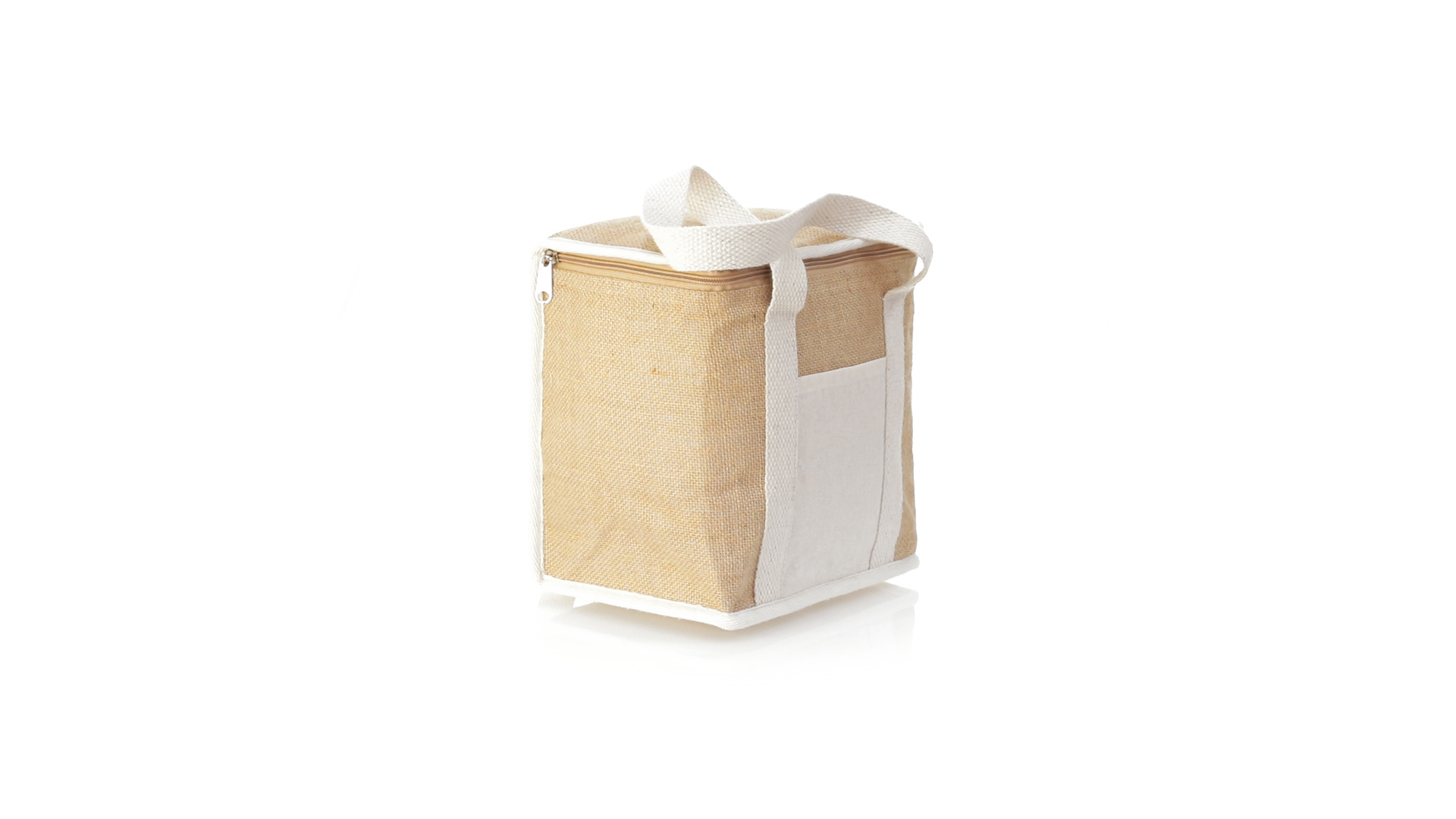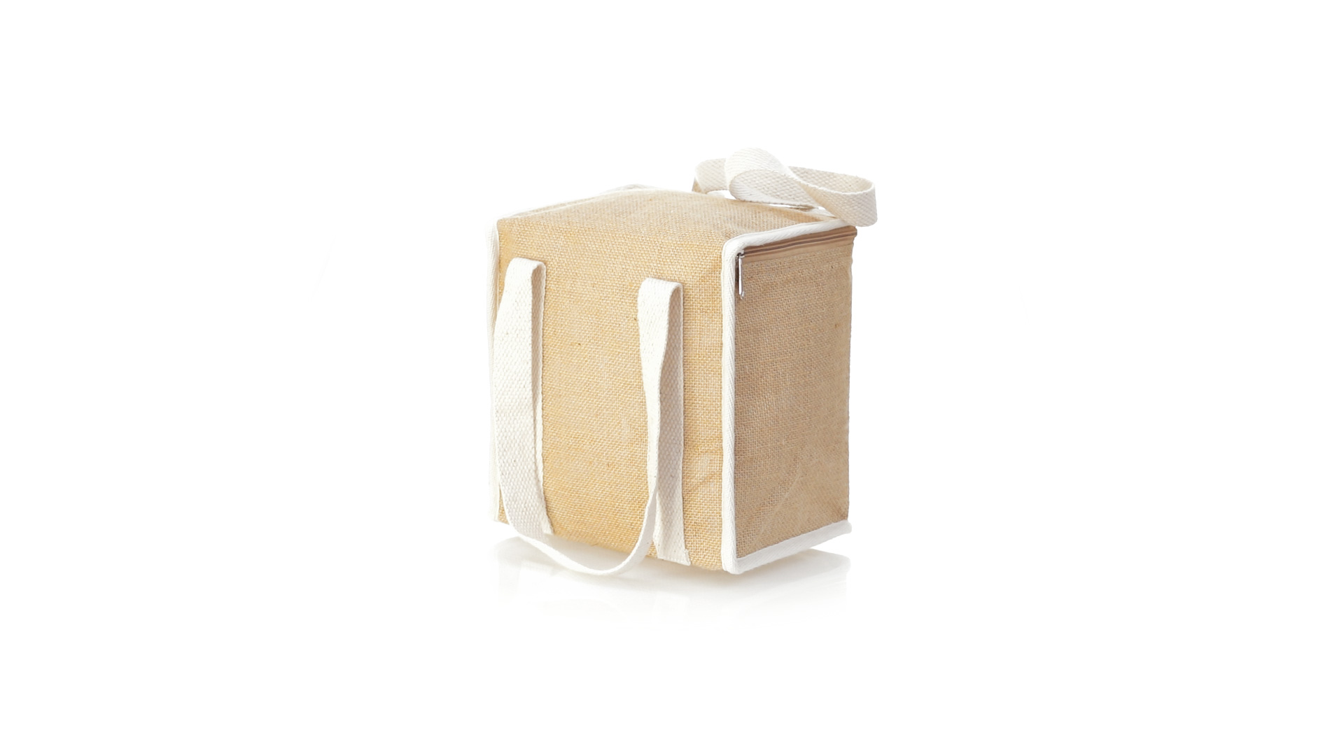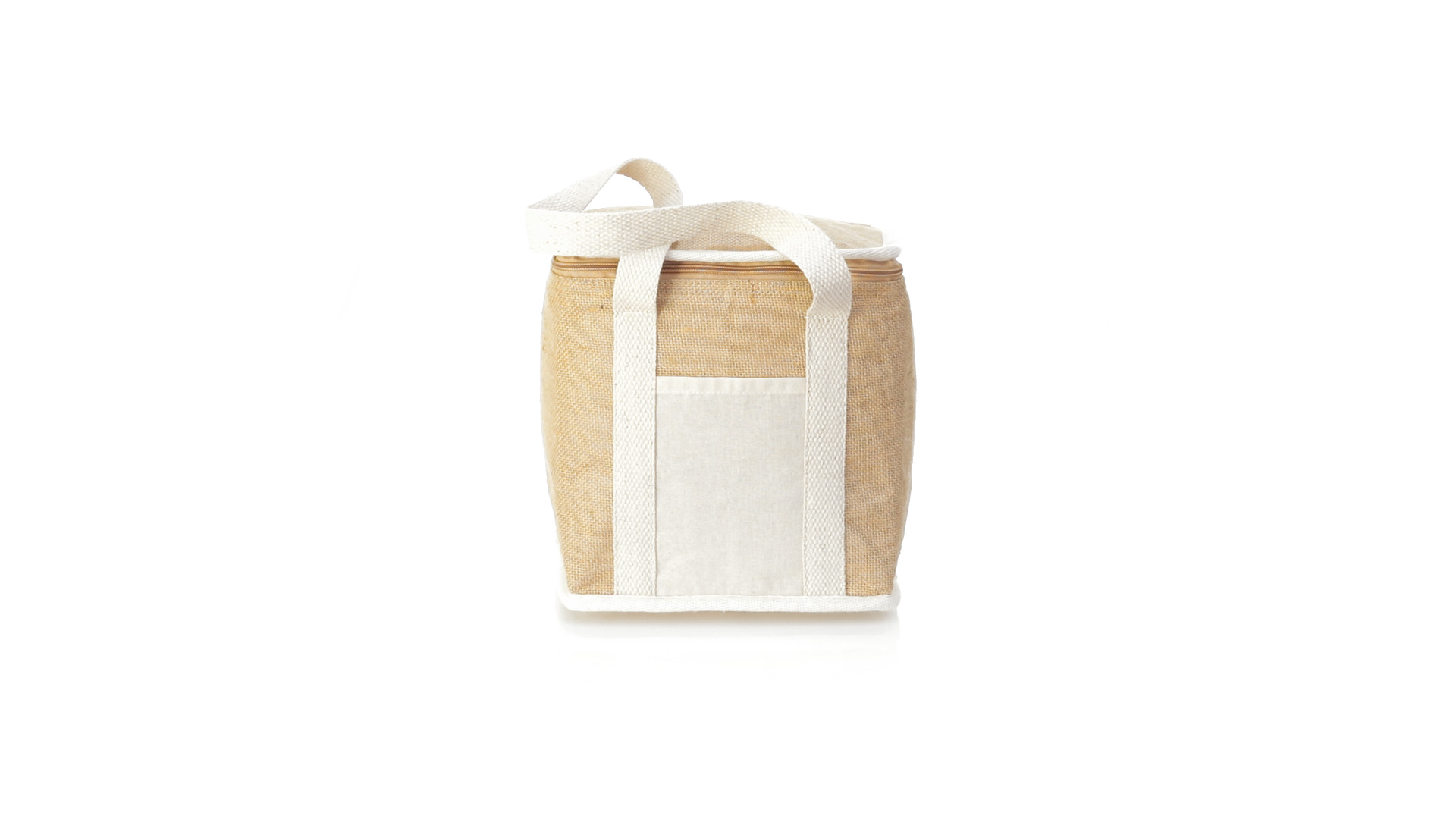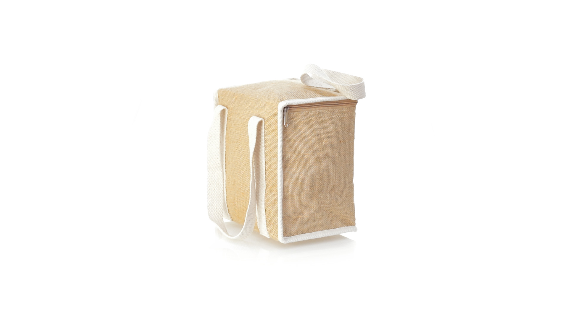 Nature Line Kühltasche mit extra Höhe. Hergestellt aus laminierter, feuchtigkeitsbeständiger Jute, mit isothermischer Innenausstattung aus Aluminium und passendem Reissverschluss. Griffe und Aussentasche für Baumwollmarkierung.