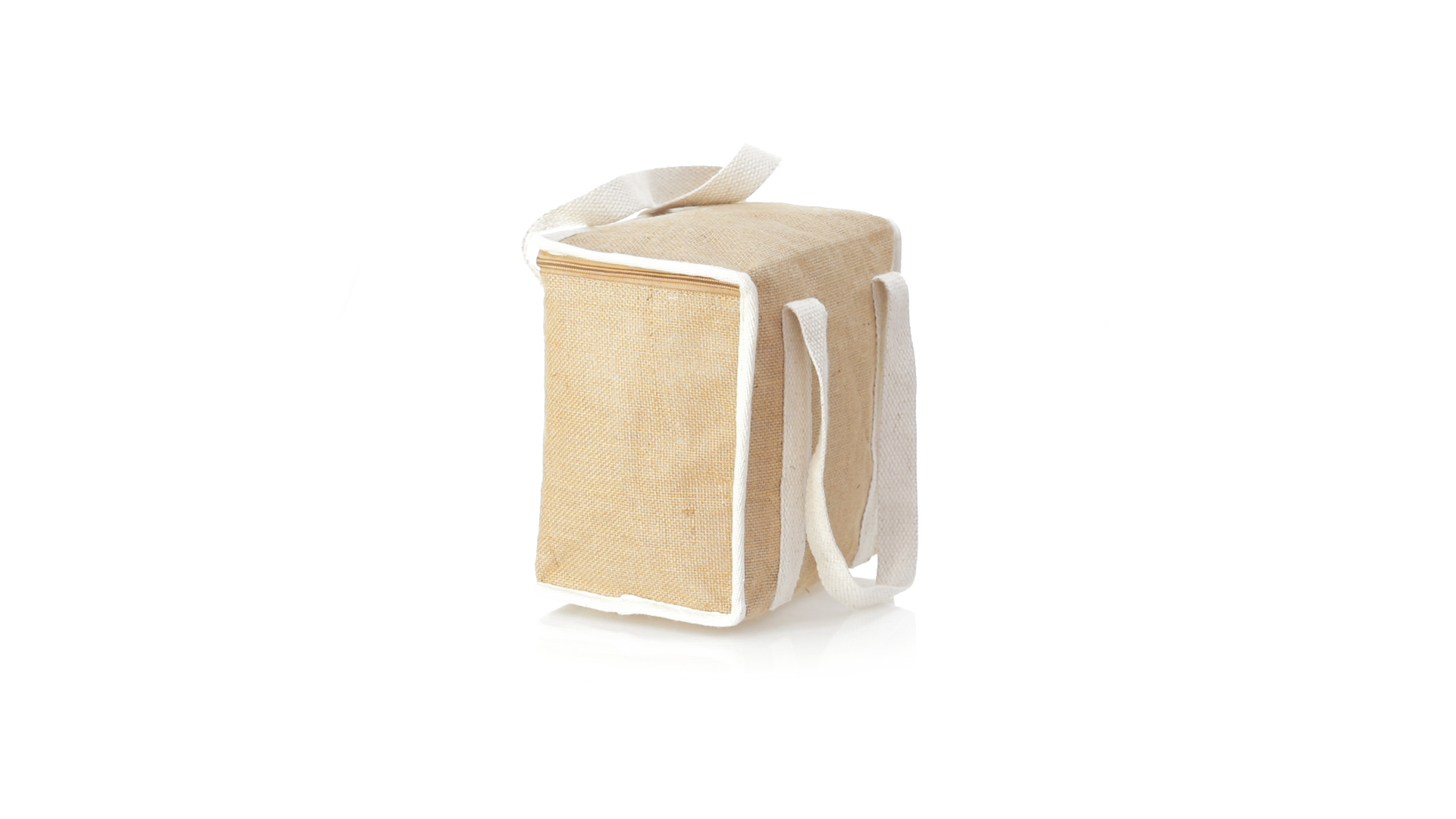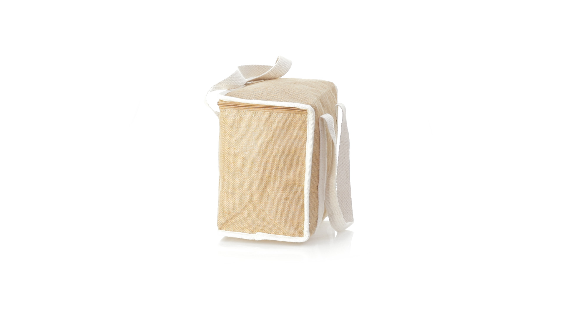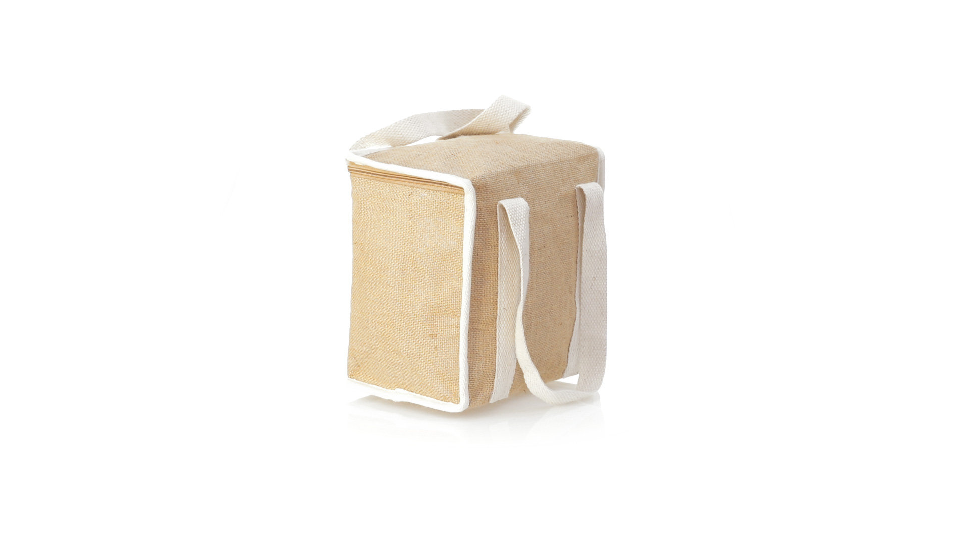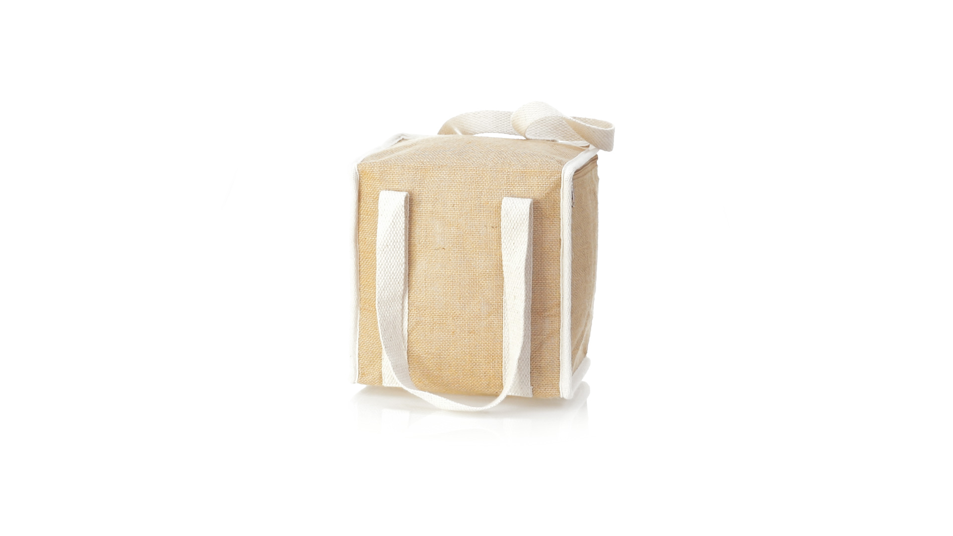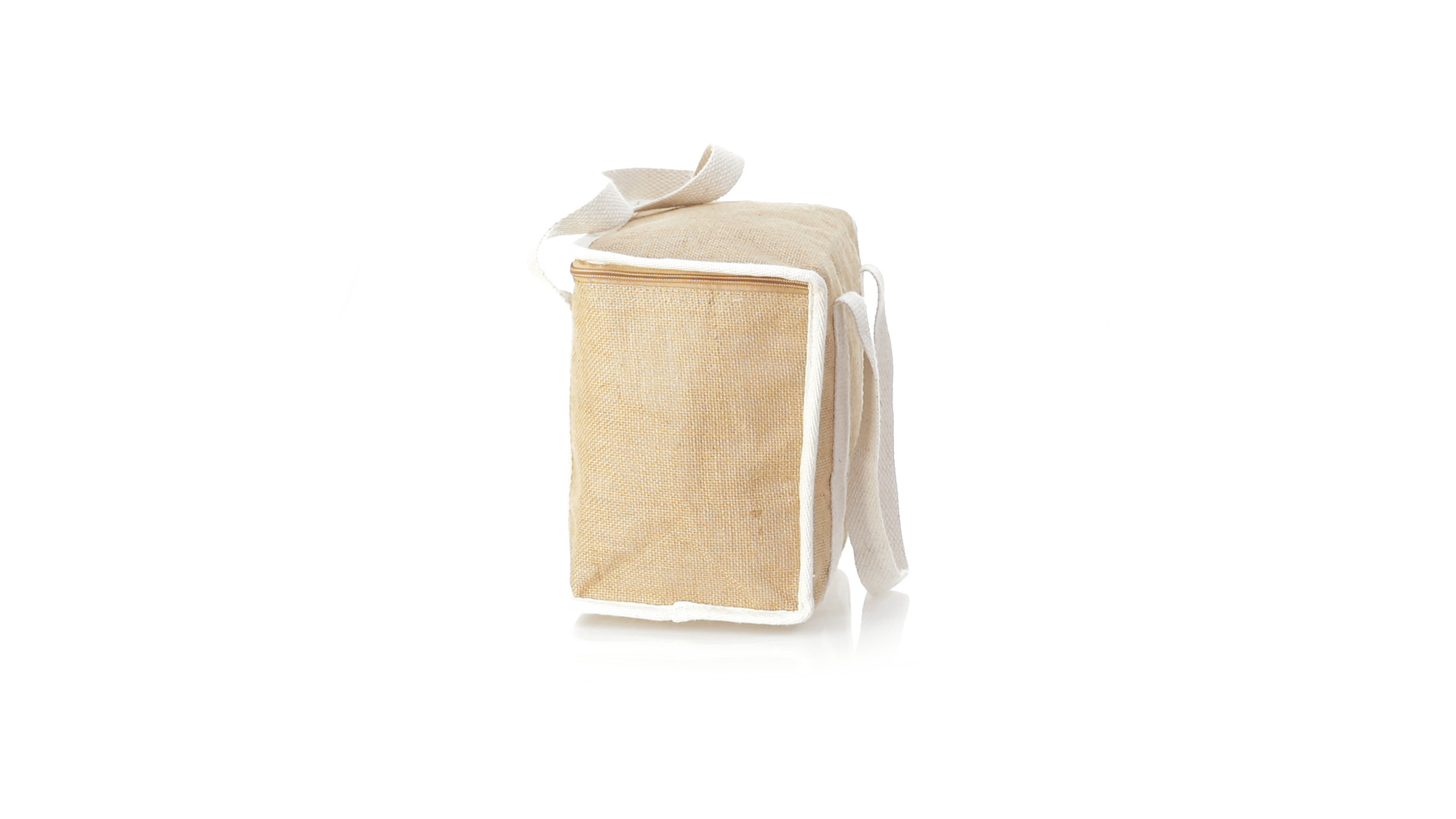Nature Line Kühltasche mit extra Höhe. Hergestellt aus laminierter, feuchtigkeitsbeständiger Jute, mit isothermischer Innenausstattung aus Aluminium und passendem Reissverschluss. Griffe und Aussentasche für Baumwollmarkierung.