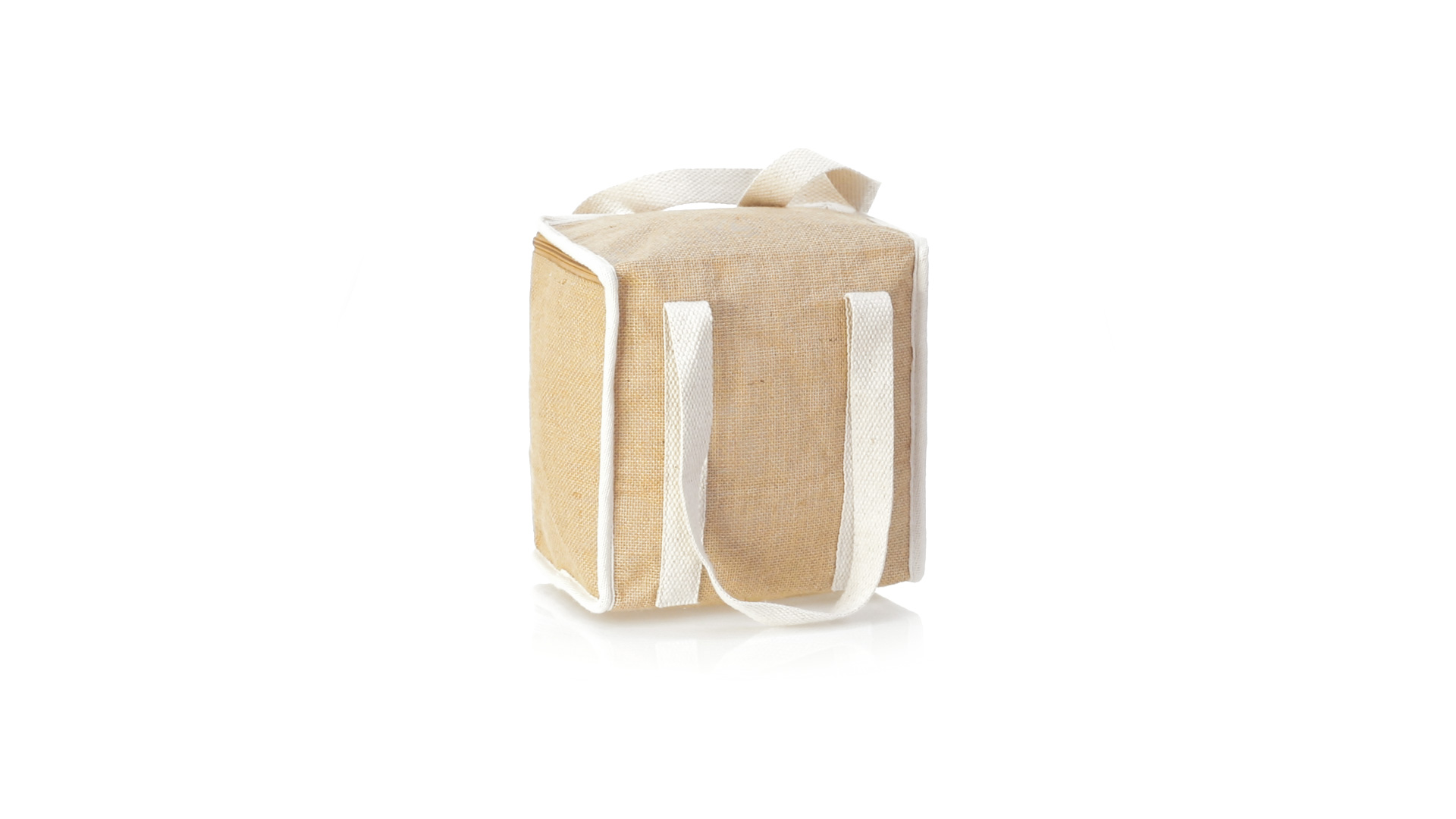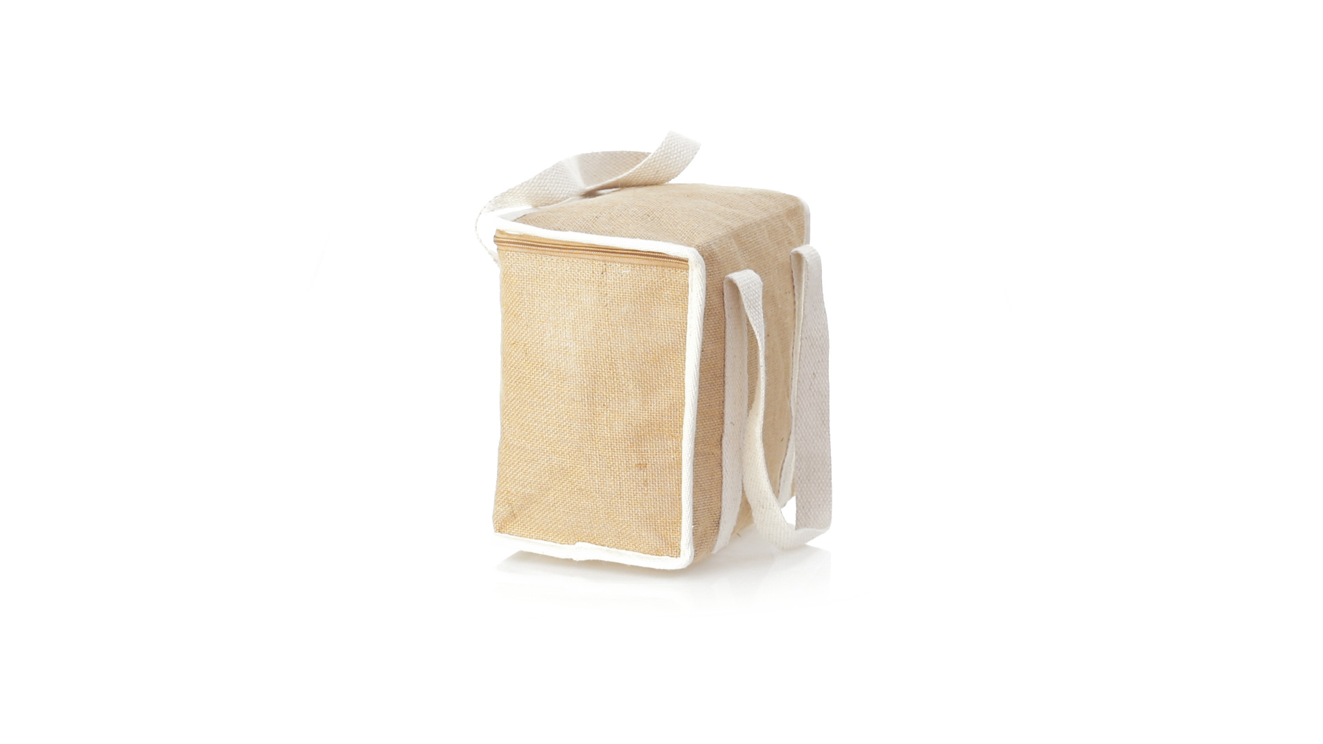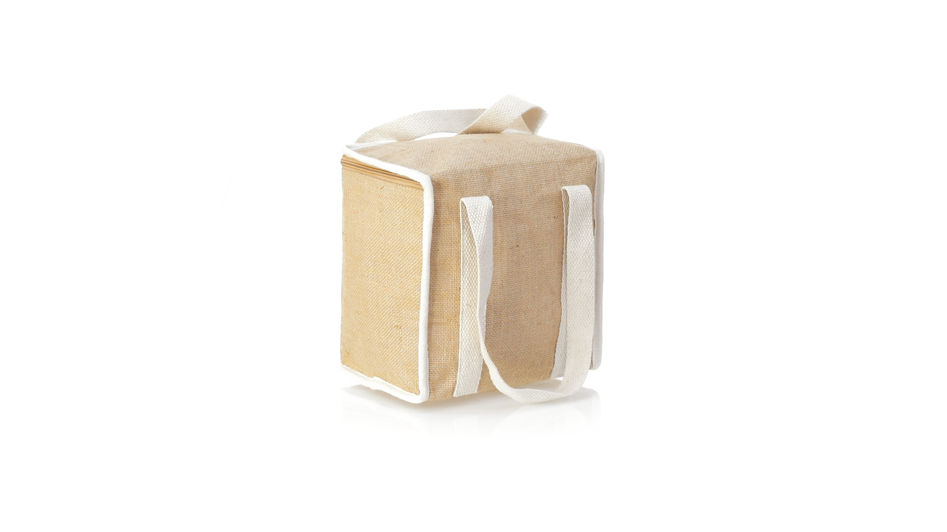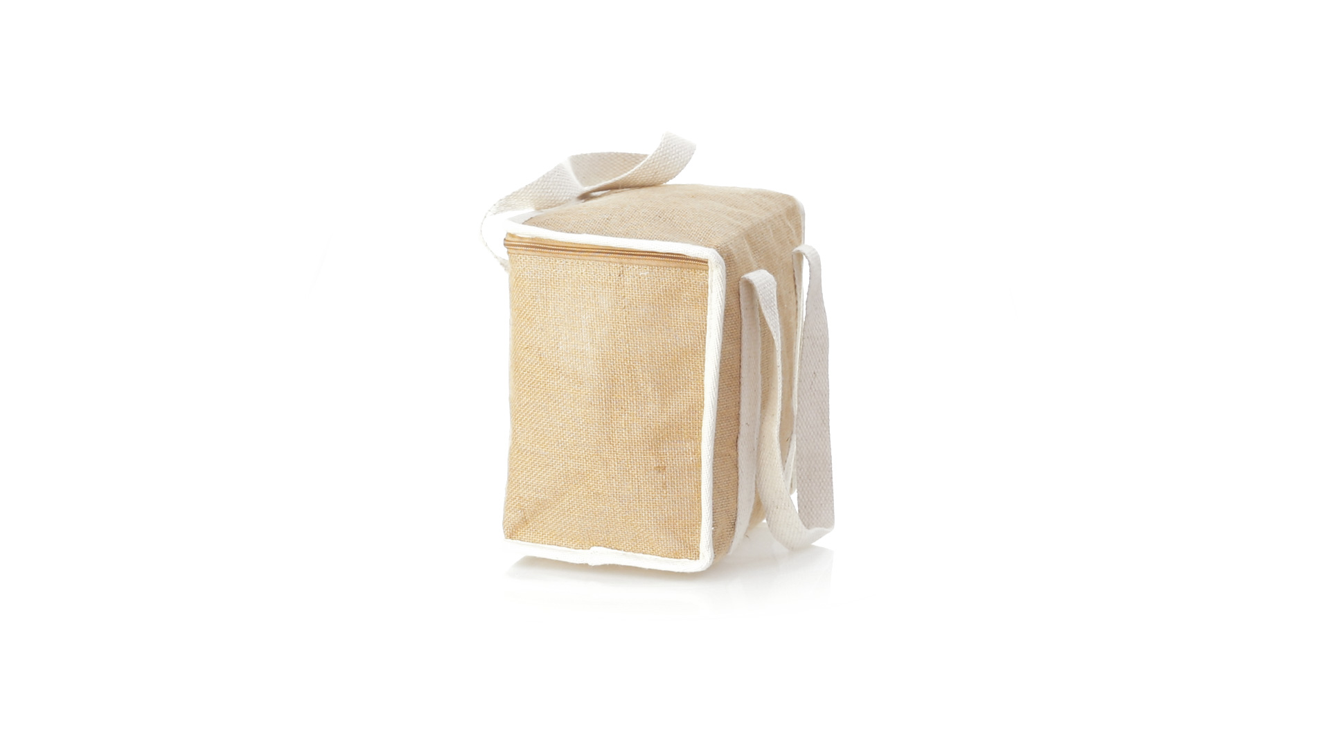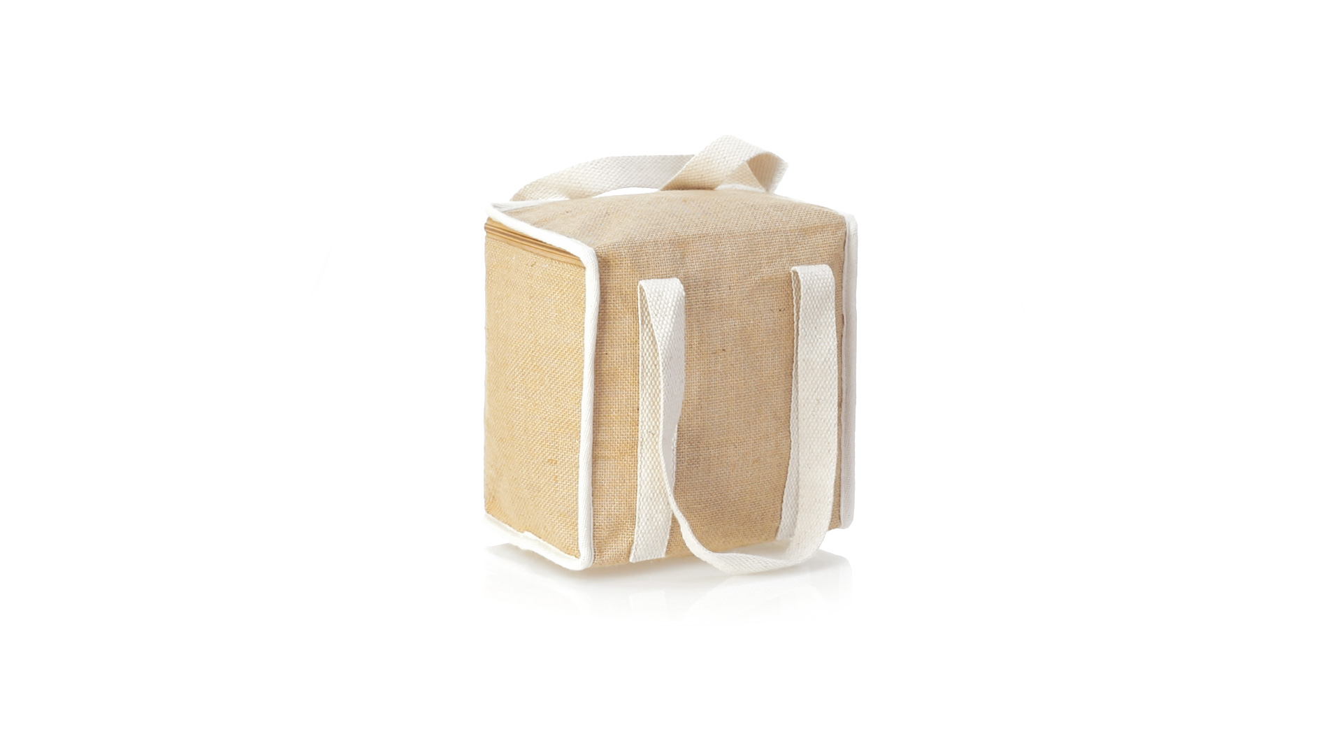 Nature Line Kühltasche mit extra Höhe. Hergestellt aus laminierter, feuchtigkeitsbeständiger Jute, mit isothermischer Innenausstattung aus Aluminium und passendem Reissverschluss. Griffe und Aussentasche für Baumwollmarkierung.