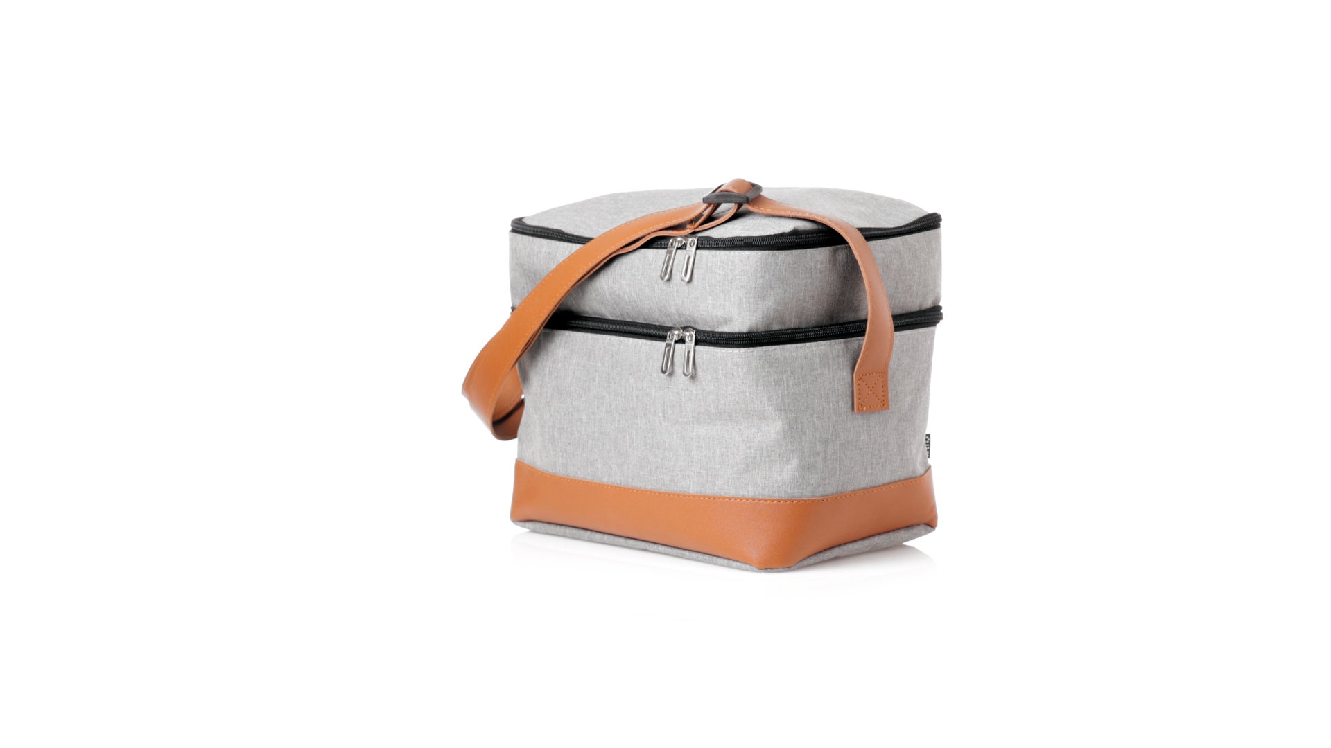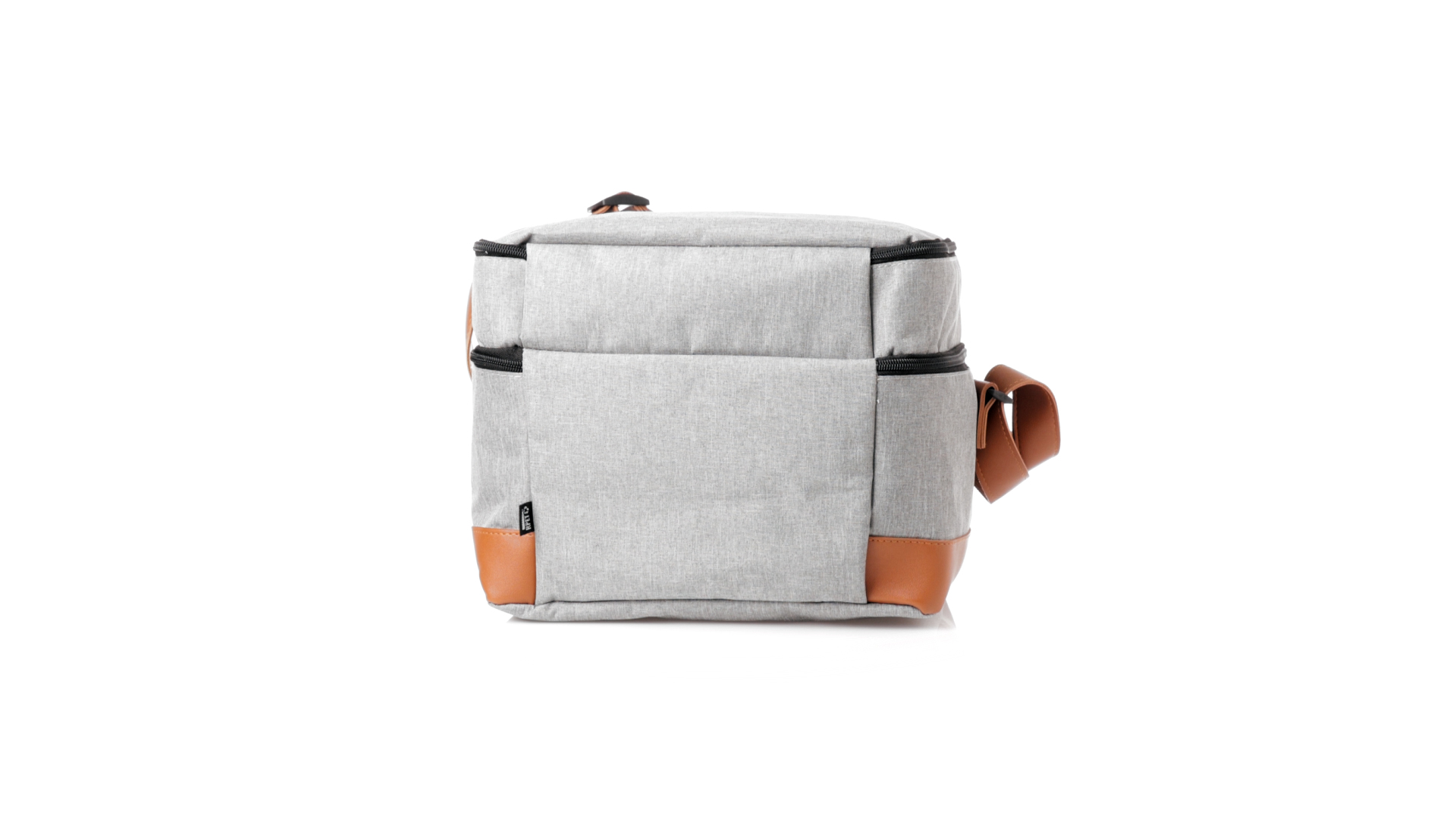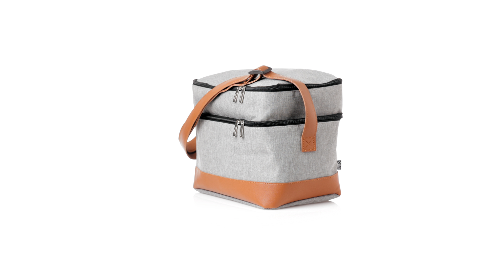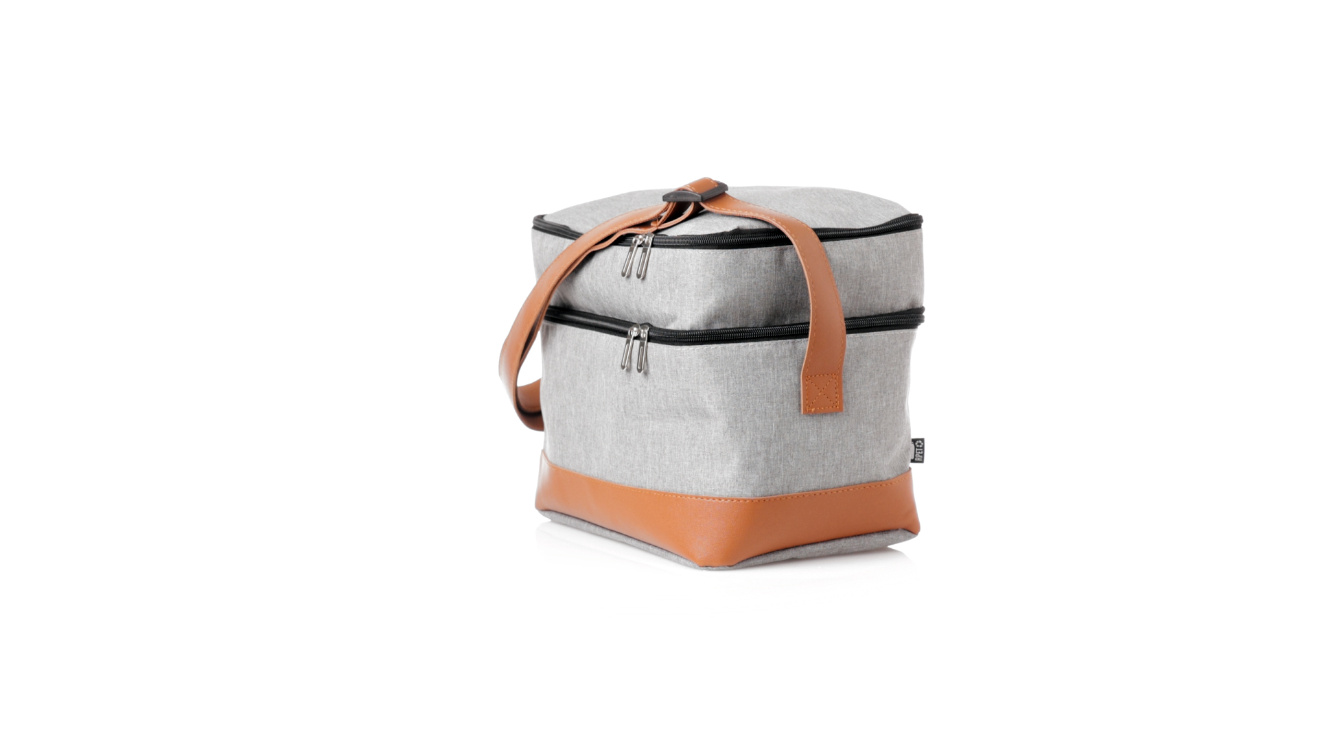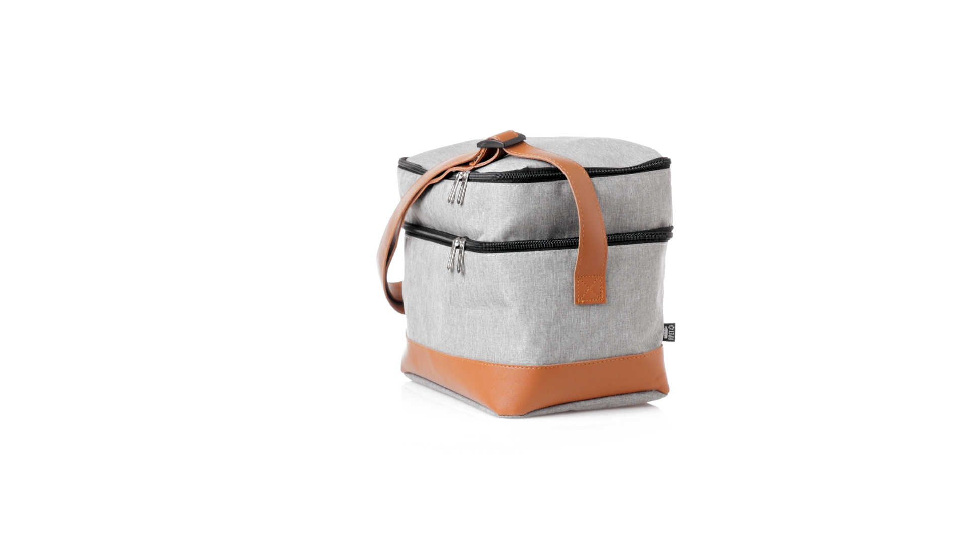 Kühltasche aus widerstandsfähigem 600D RPET. Graue Ausführung, mit braunem PU-Lederboden und Schulterriemen. Mit 2 unabhängigen Fächern, mit Reissverschluss und Metallziehern. Isothermisches PEVA-Innen- und Aussenetikett mit dem RPET-Emblem.Das RPET-Material wird aus recyceltem Kunststoff hergestellt, um die Wiederverwendung von Kunststoffabfällen zu fördern und einen Beitrag zur Nachhaltigkeit unseres Planeten zu leisten.