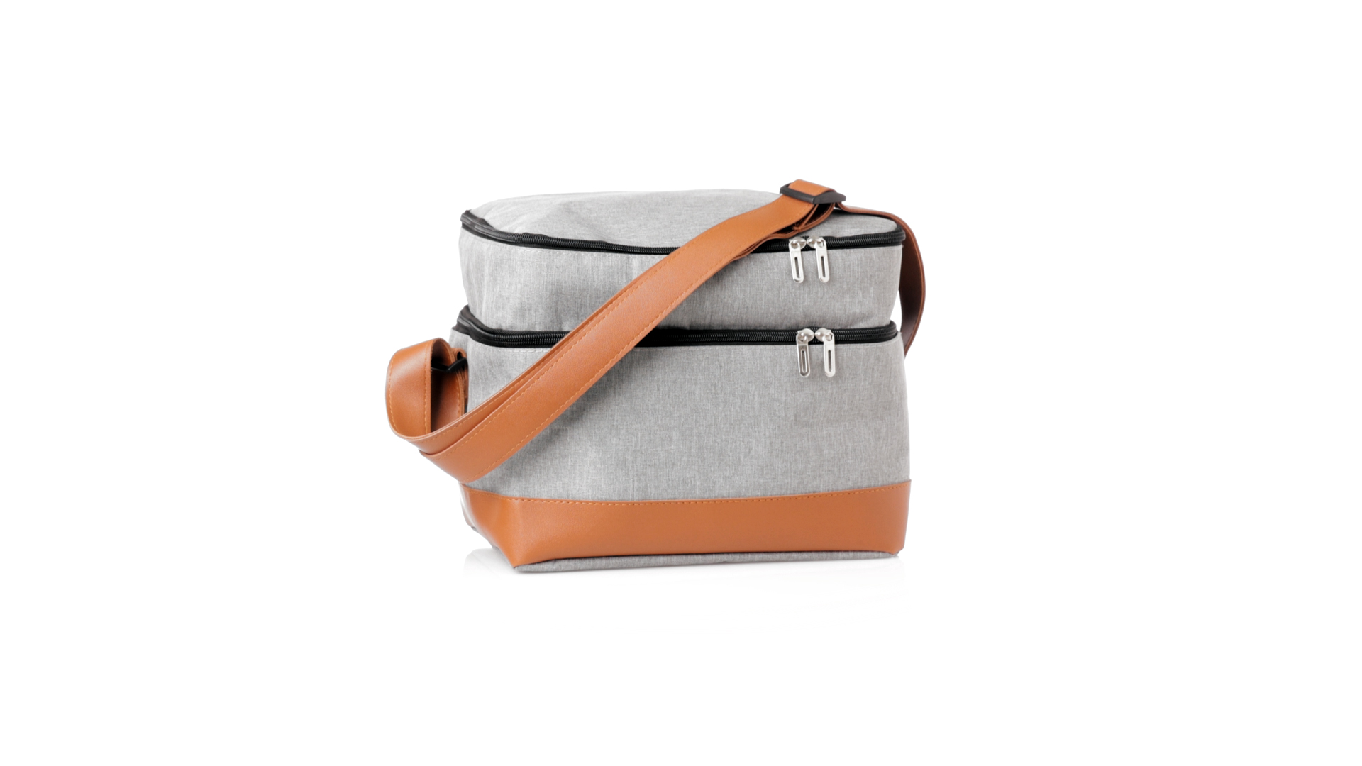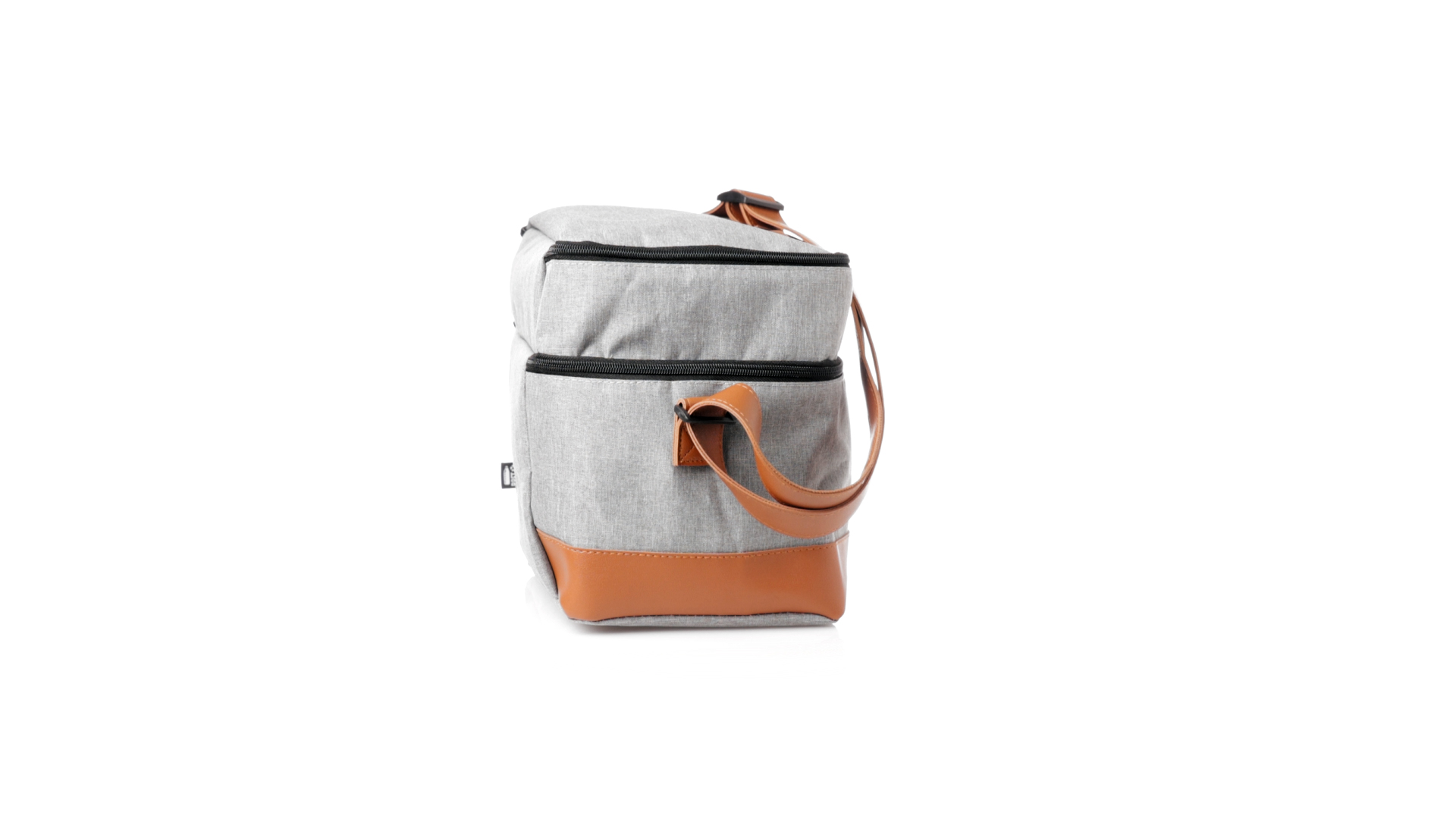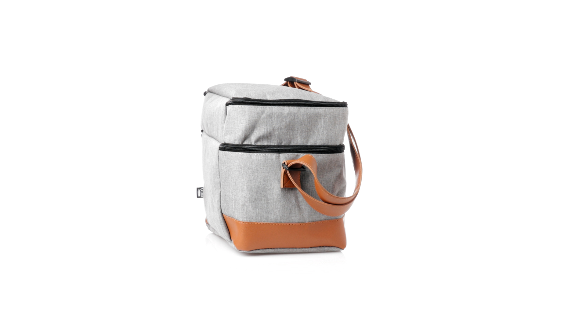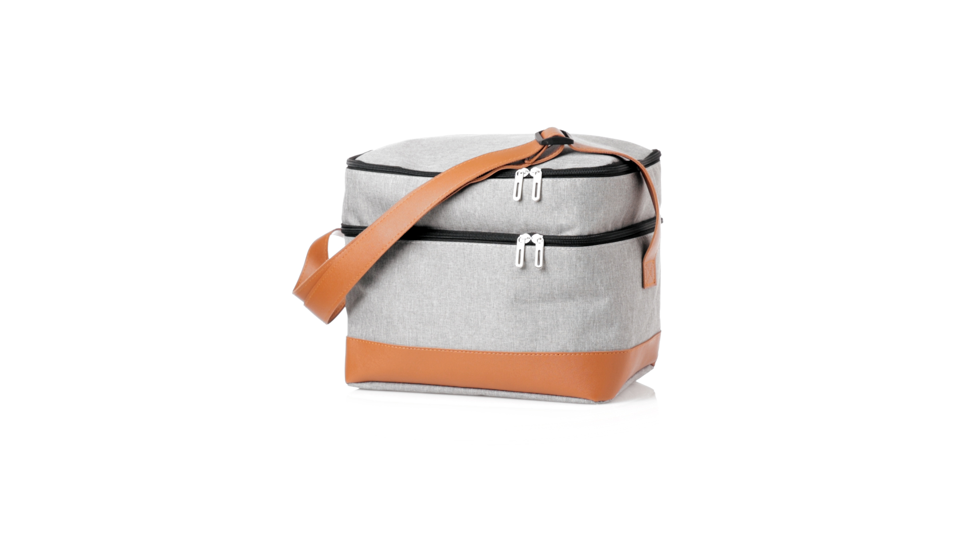Kühltasche aus widerstandsfähigem 600D RPET. Graue Ausführung, mit braunem PU-Lederboden und Schulterriemen. Mit 2 unabhängigen Fächern, mit Reissverschluss und Metallziehern. Isothermisches PEVA-Innen- und Aussenetikett mit dem RPET-Emblem.Das RPET-Material wird aus recyceltem Kunststoff hergestellt, um die Wiederverwendung von Kunststoffabfällen zu fördern und einen Beitrag zur Nachhaltigkeit unseres Planeten zu leisten.
